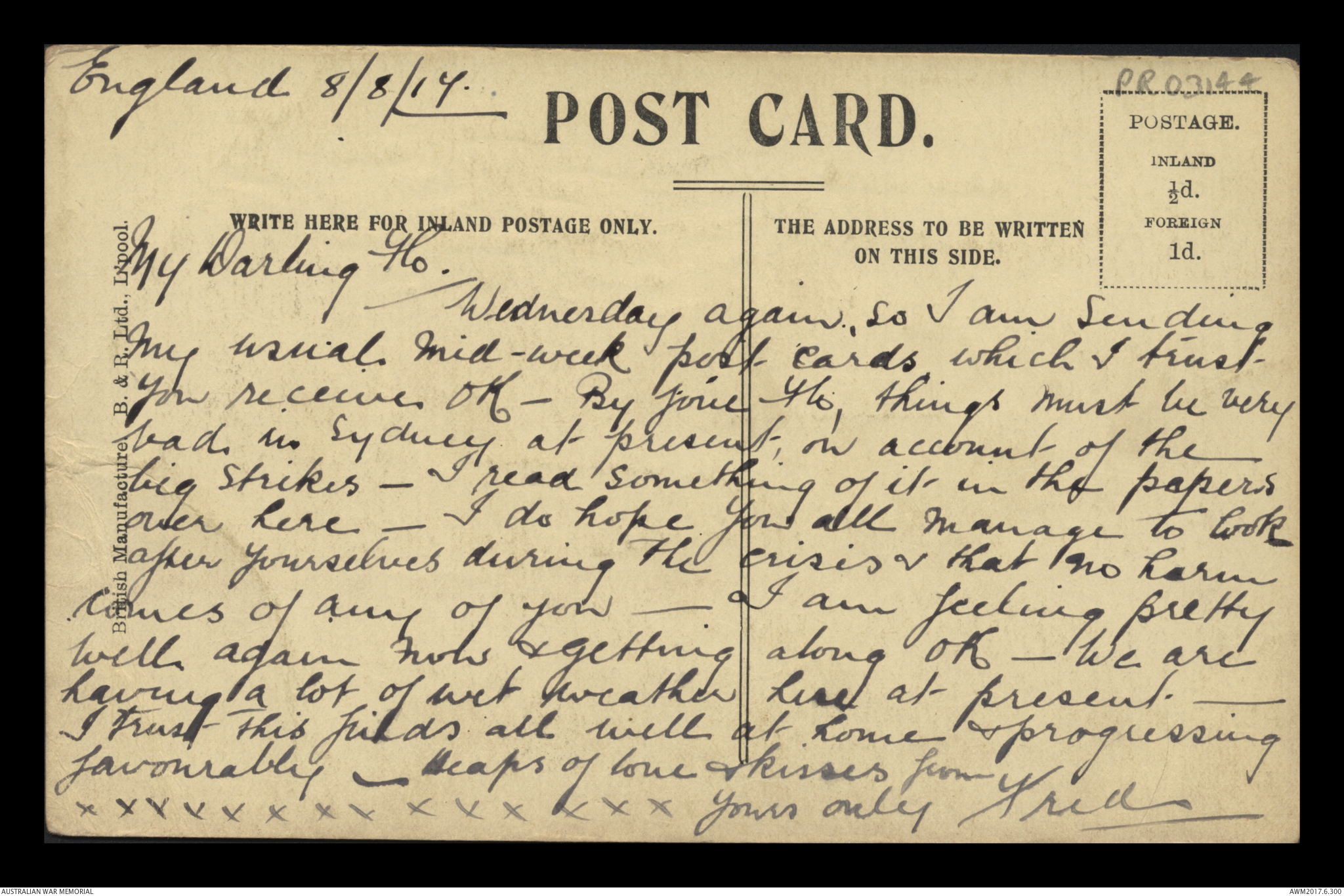 Postcard from Frederick Ewart Ryder to Florence Laurel Jane Ryder, England, 8 August 1917;