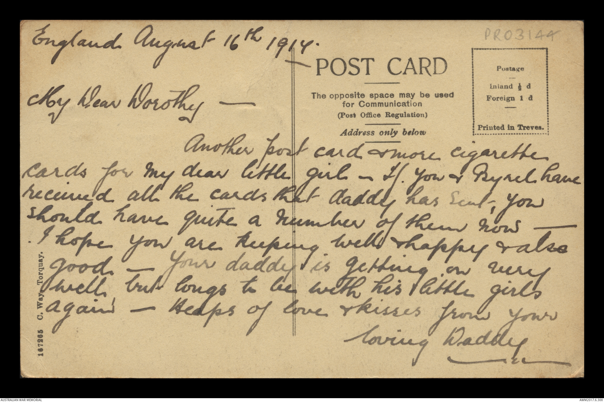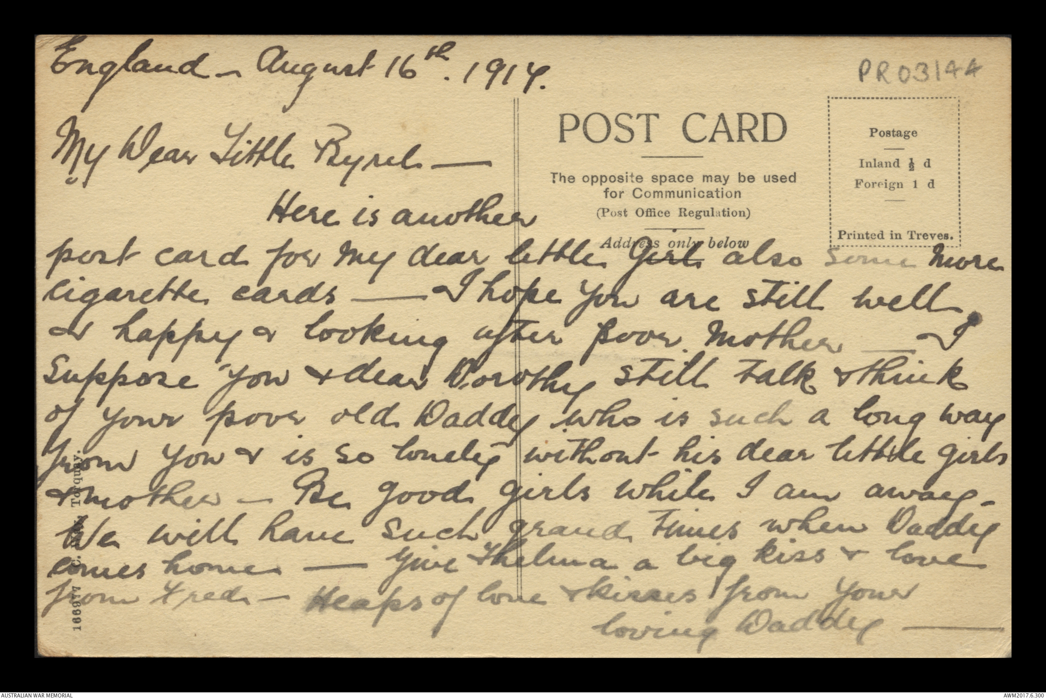 Postcard from Frederick Ewart Ryder to Dorothy Ryder, 16 August 1917;