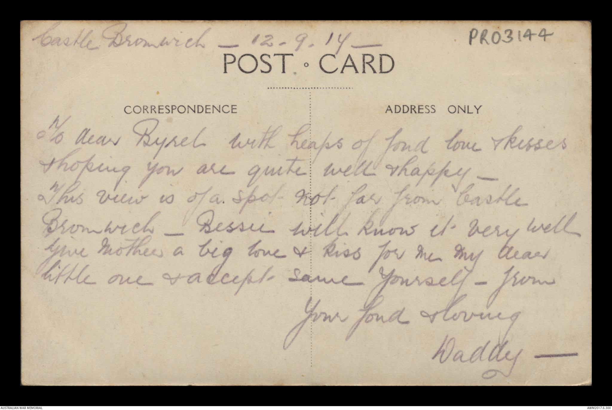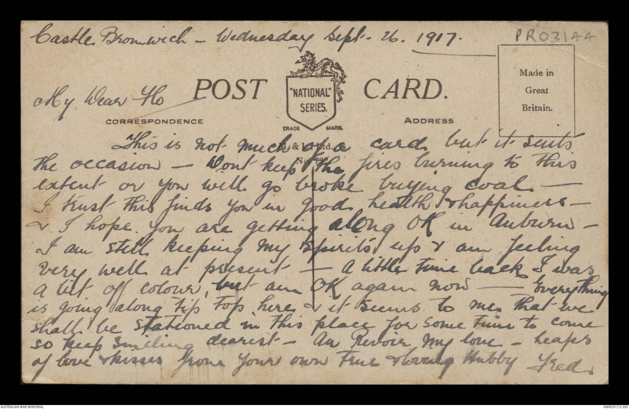 Postcard from Frederick Ewart Ryder to Florence Laurel Jane Ryder, Castle Bromwich, 26 September 1917;