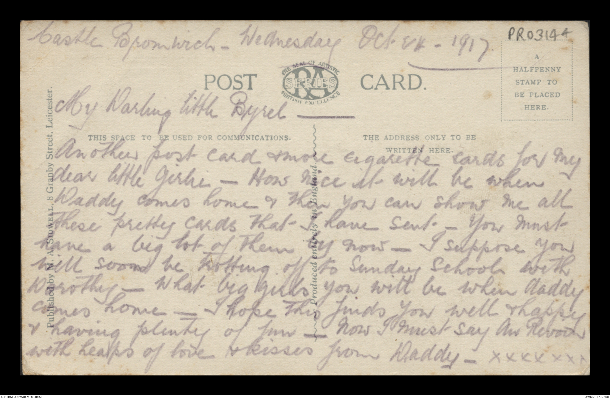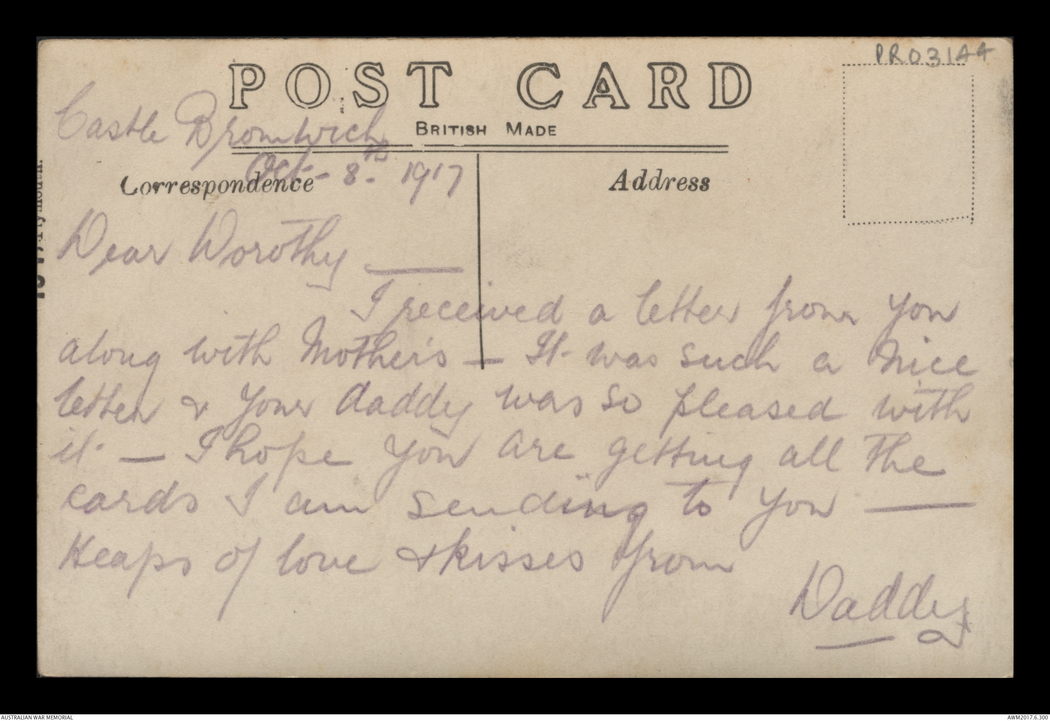 Postcard from Frederick Ewart Ryder to Dorothy Ryder, Castle Bromwich, 8 October 1917;
