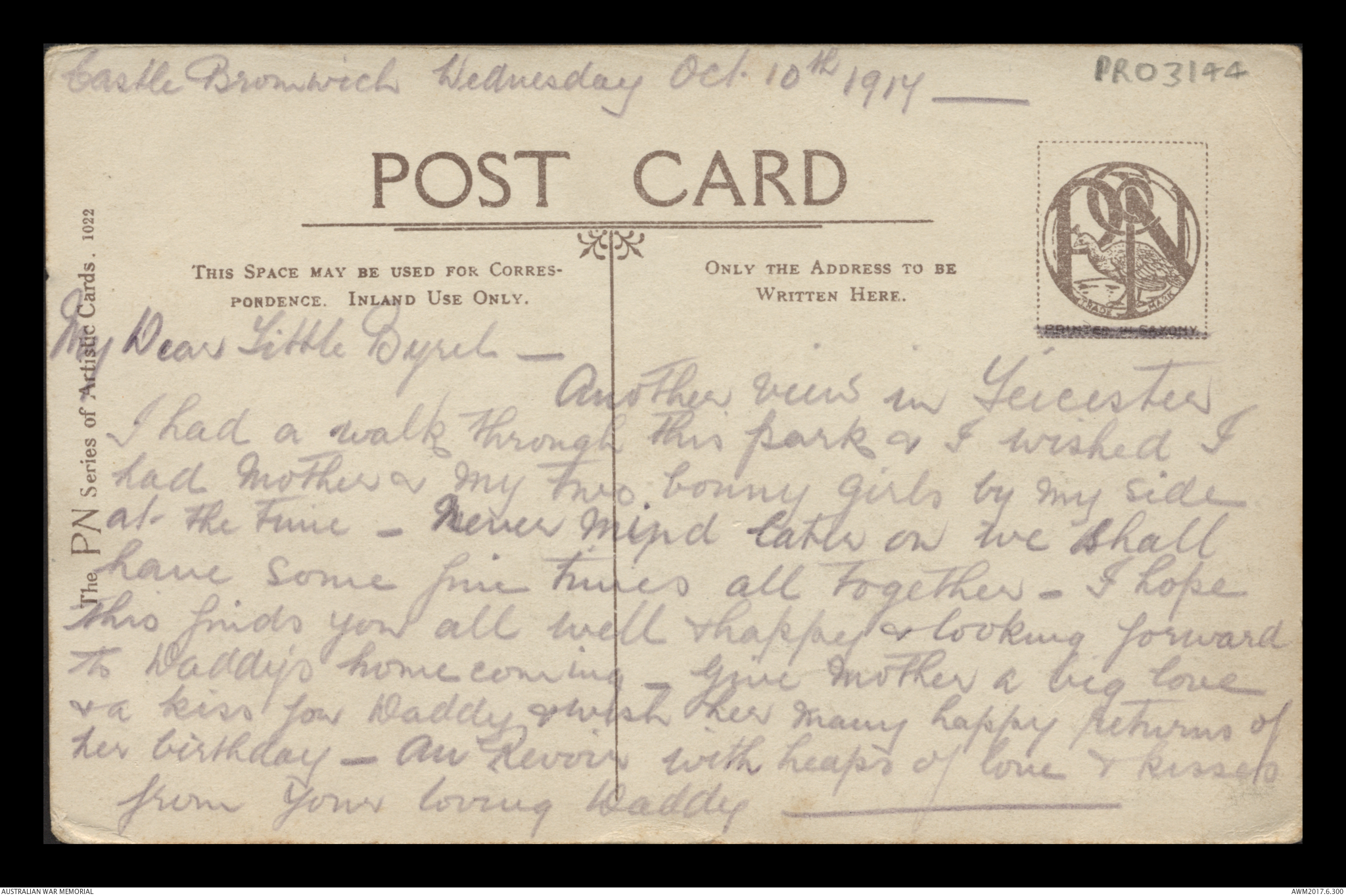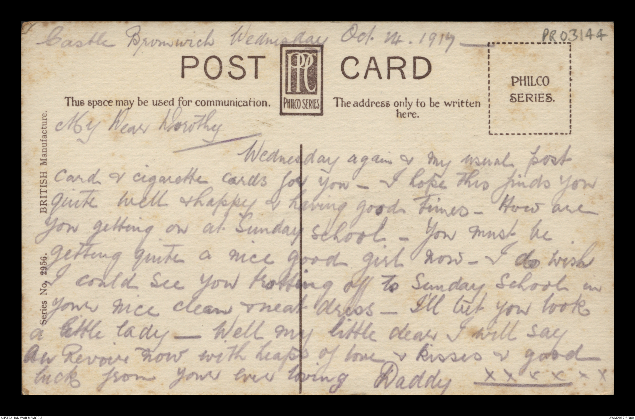 Postcard from Frederick Ewart Ryder to Dorothy Ryder, Castle Bromwich, 14 October 1917;