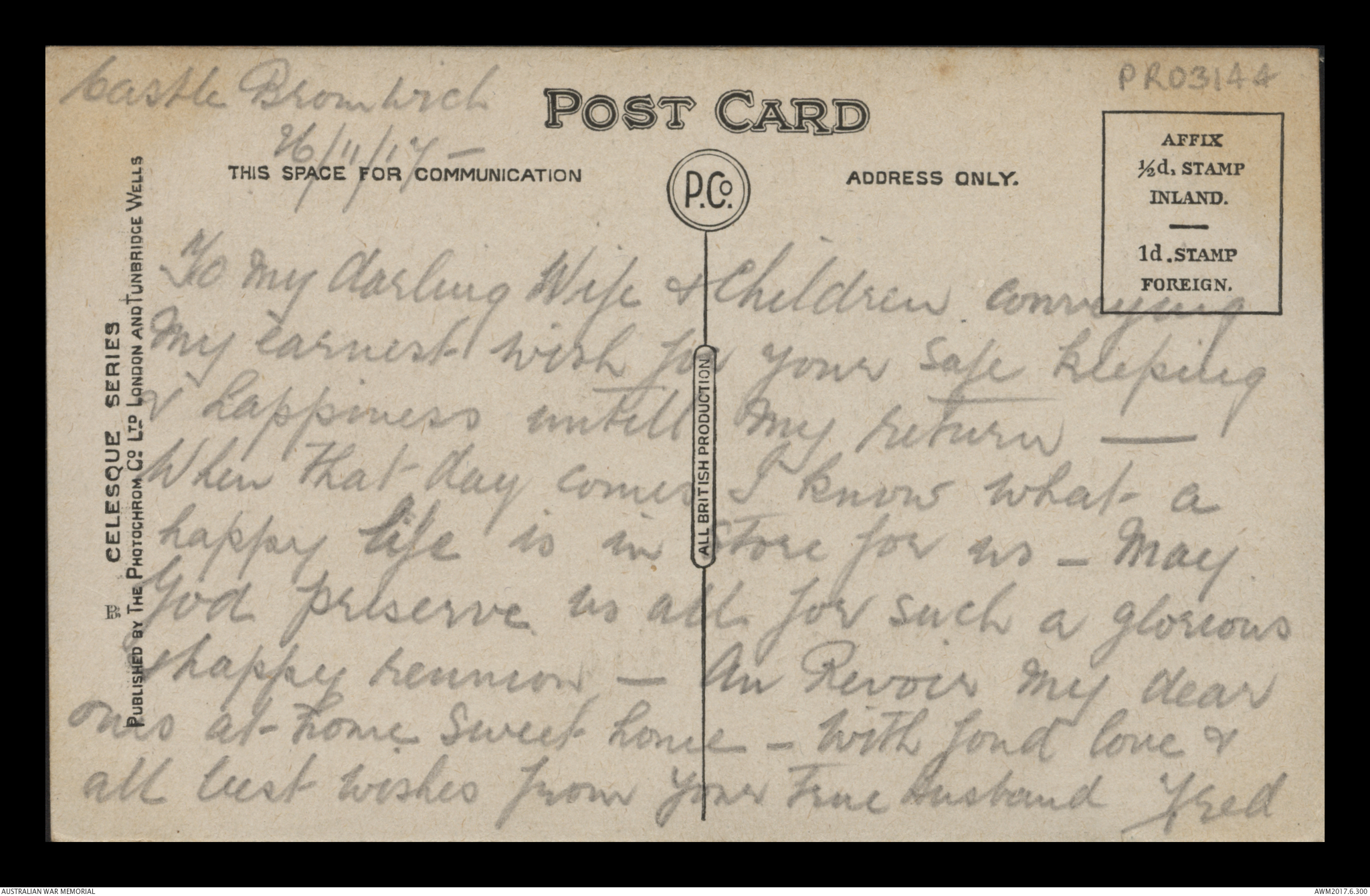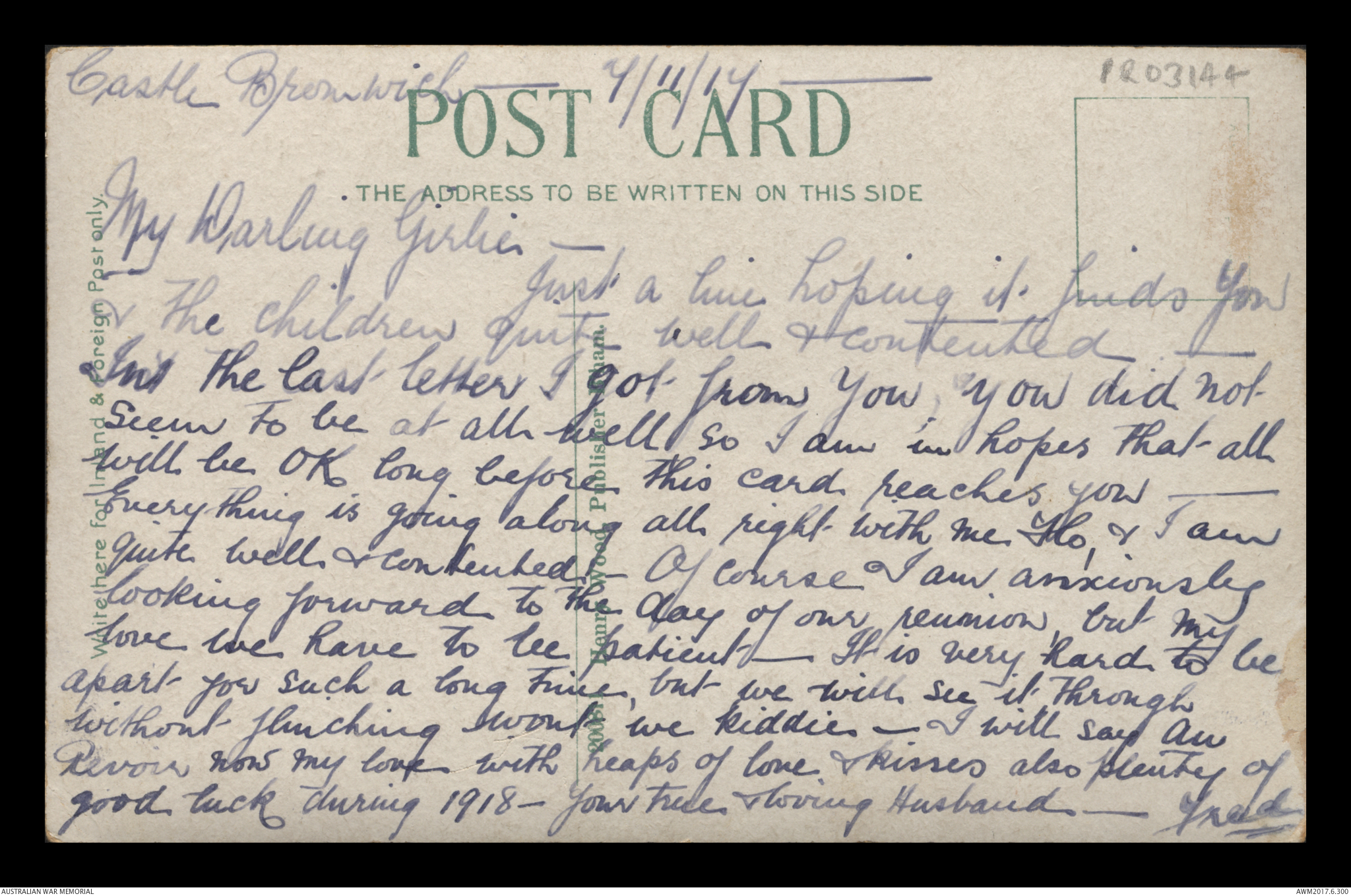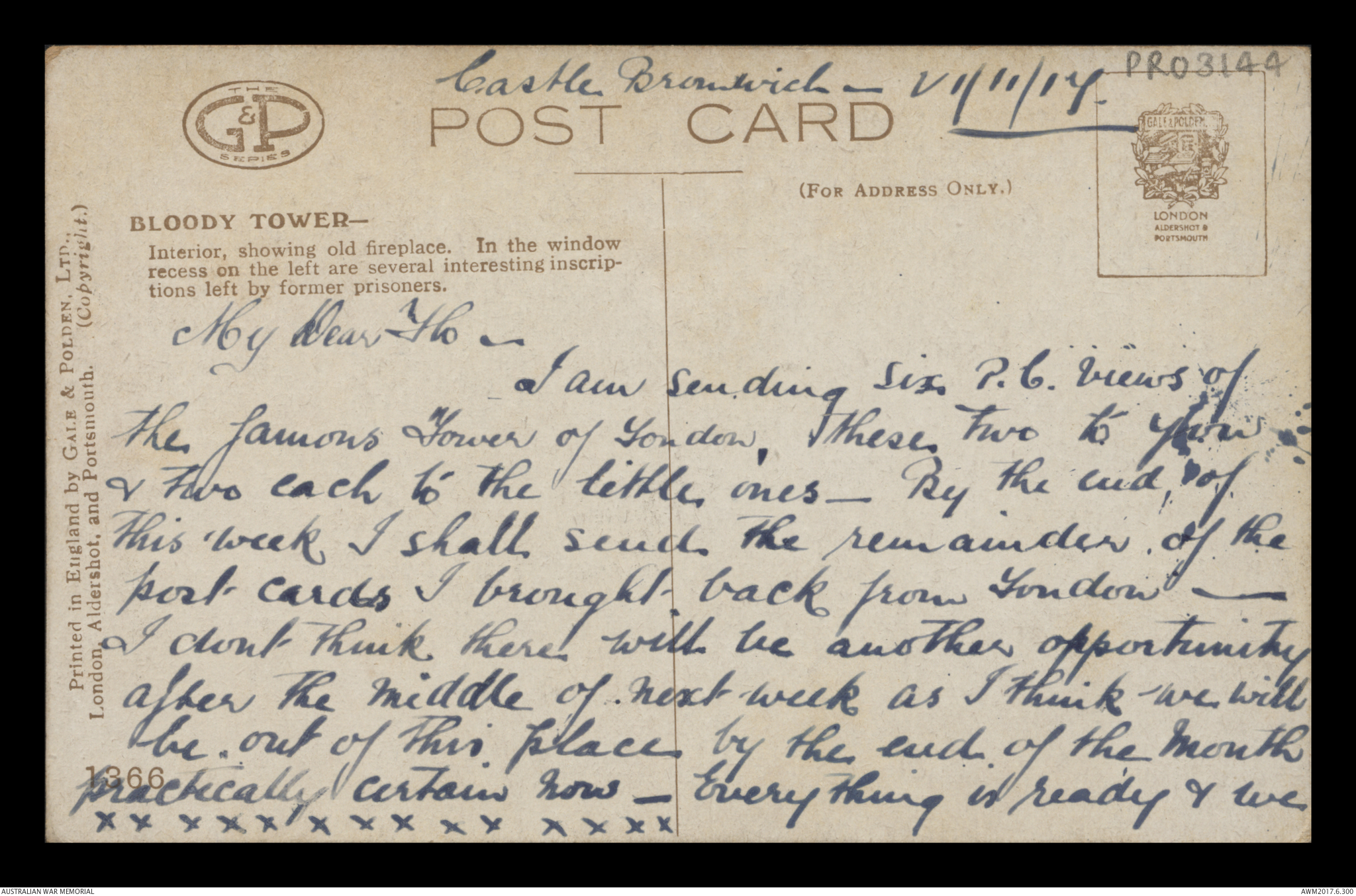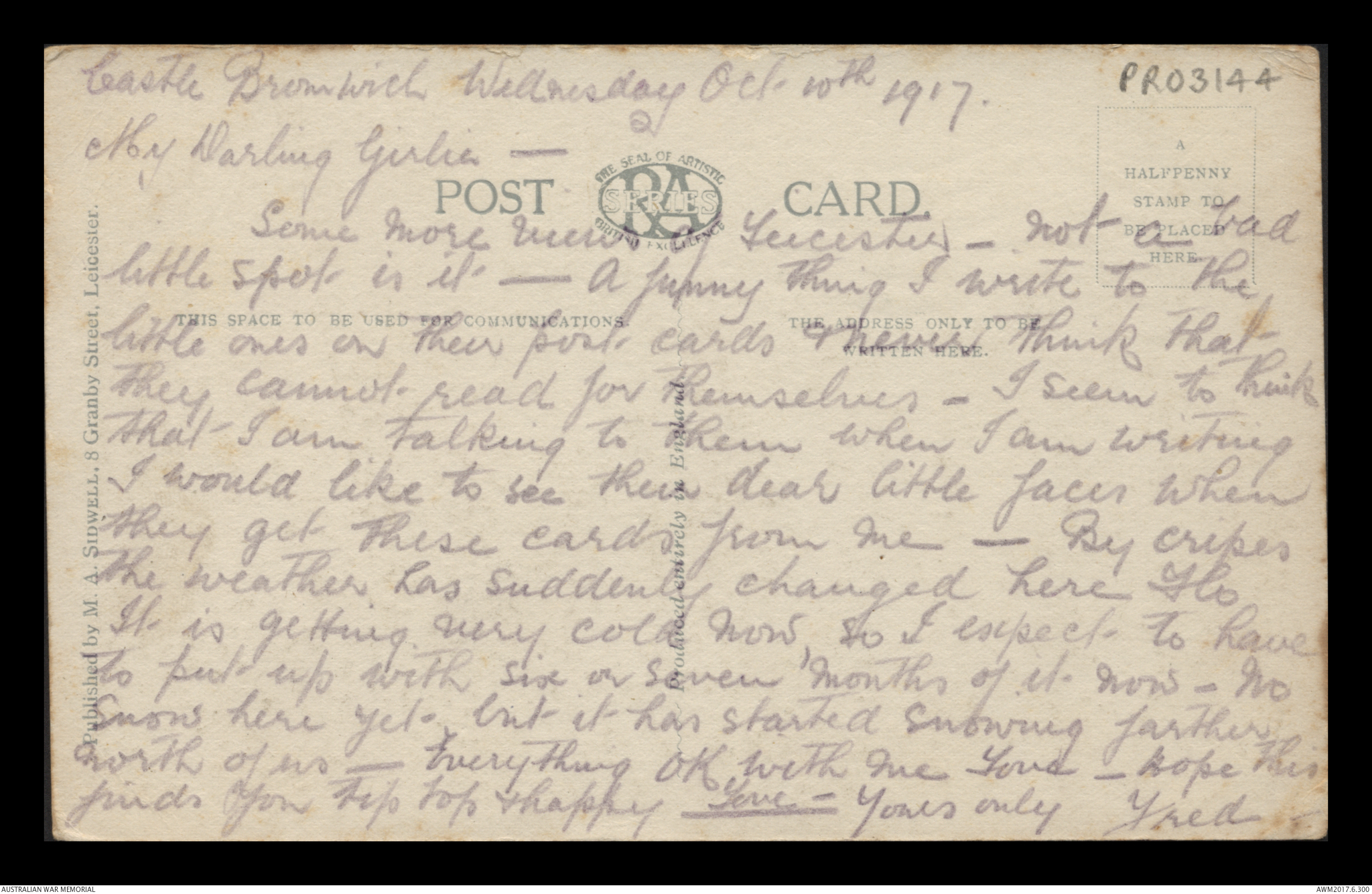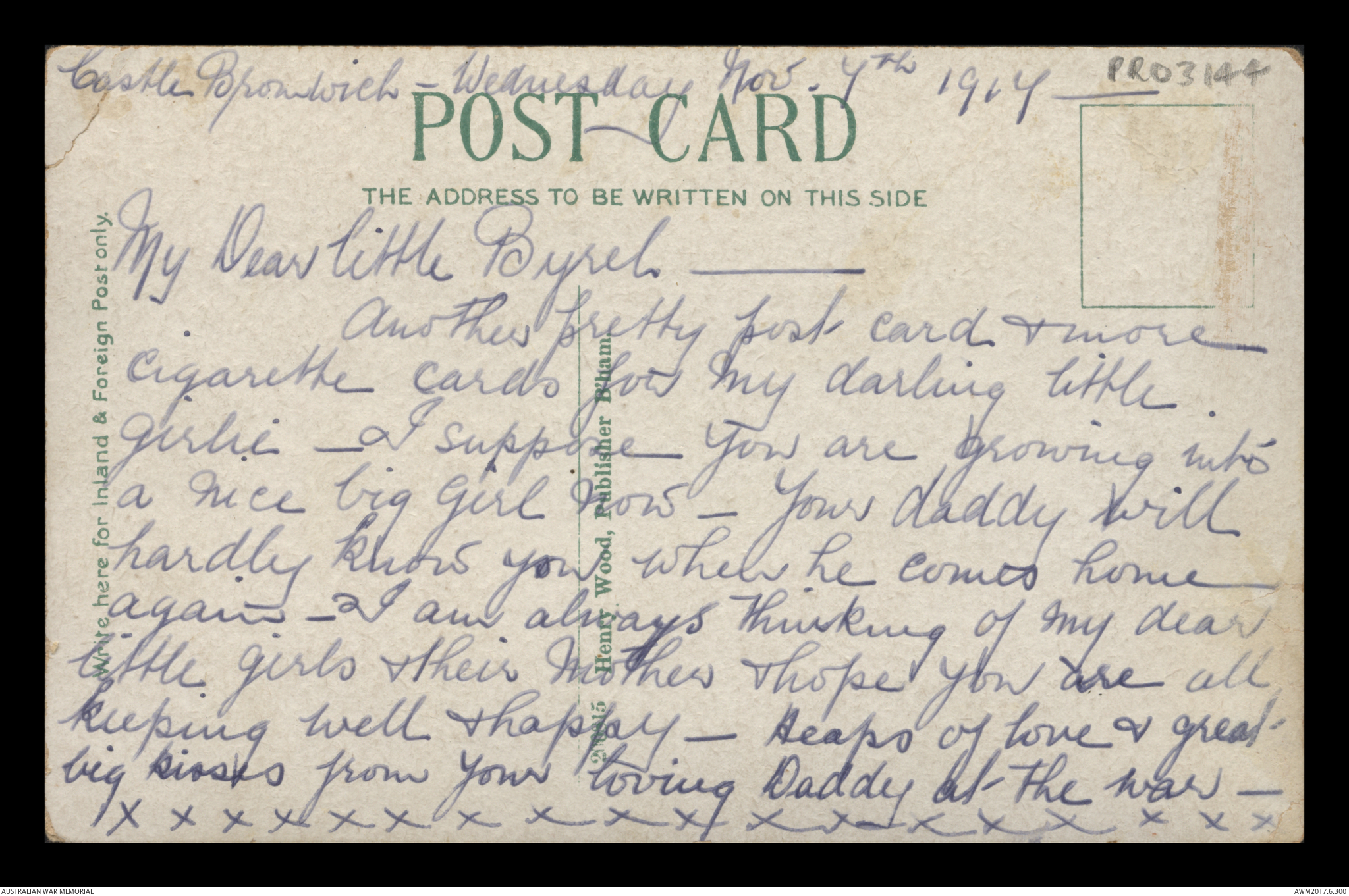 Postcard from Frederick Ewart Ryder to his wife & children, Castle Bromwich, 26 November 1917;