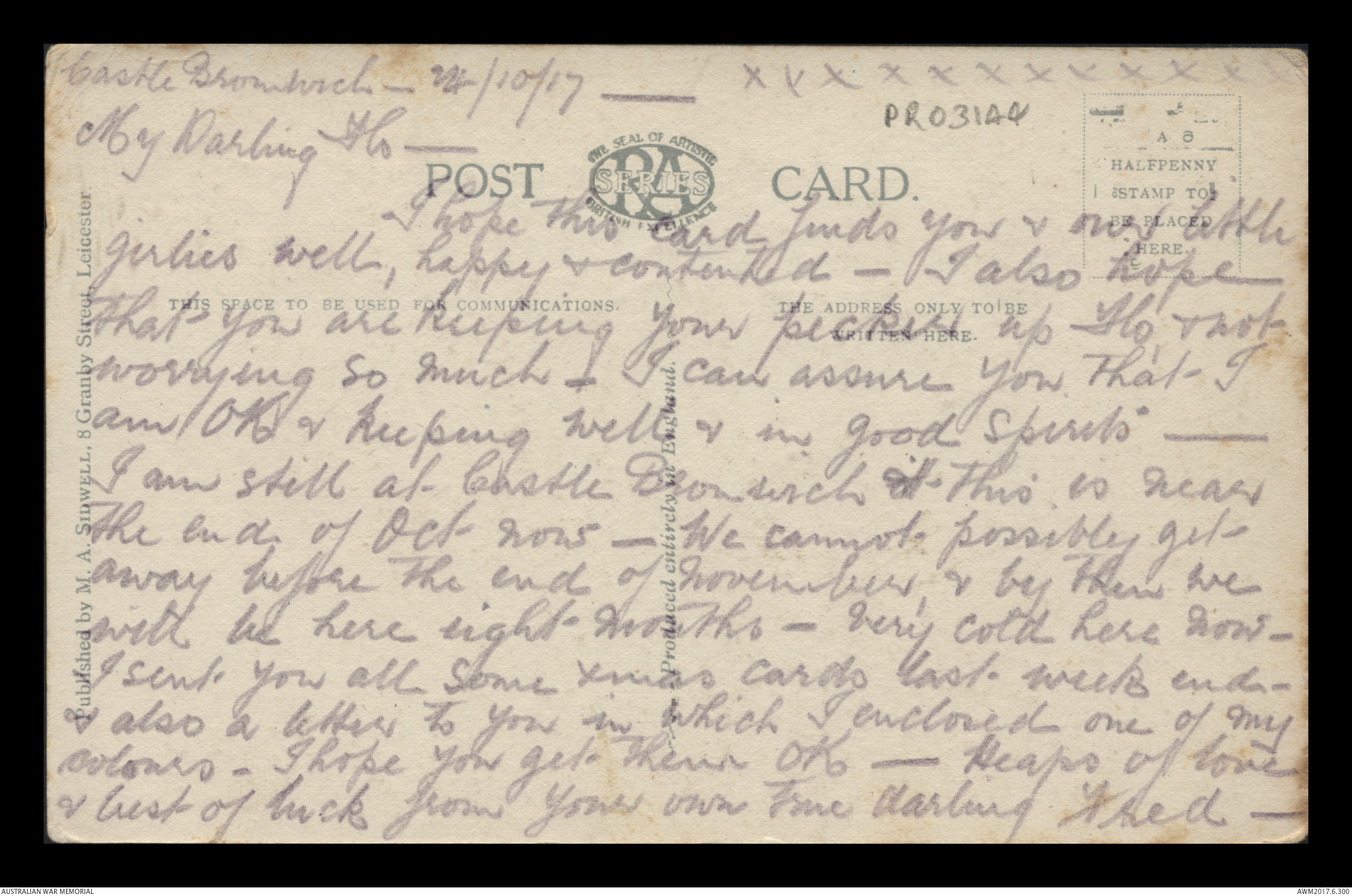 Postcard from Frederick Ewart Ryder to Florence Laurel Jane Ryder, Castle Bromwich, 24 October 1917;