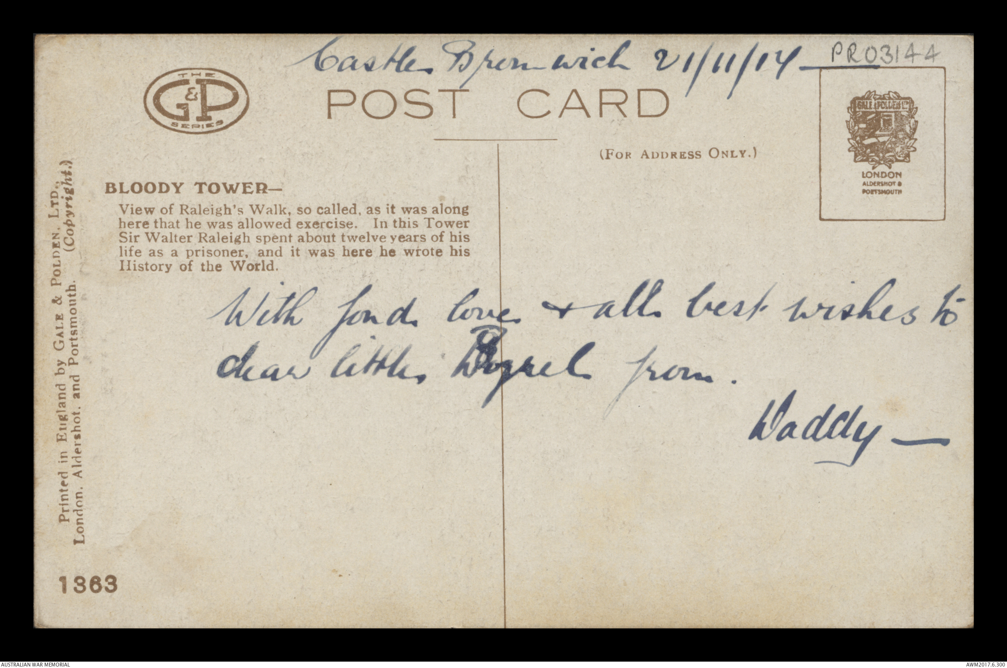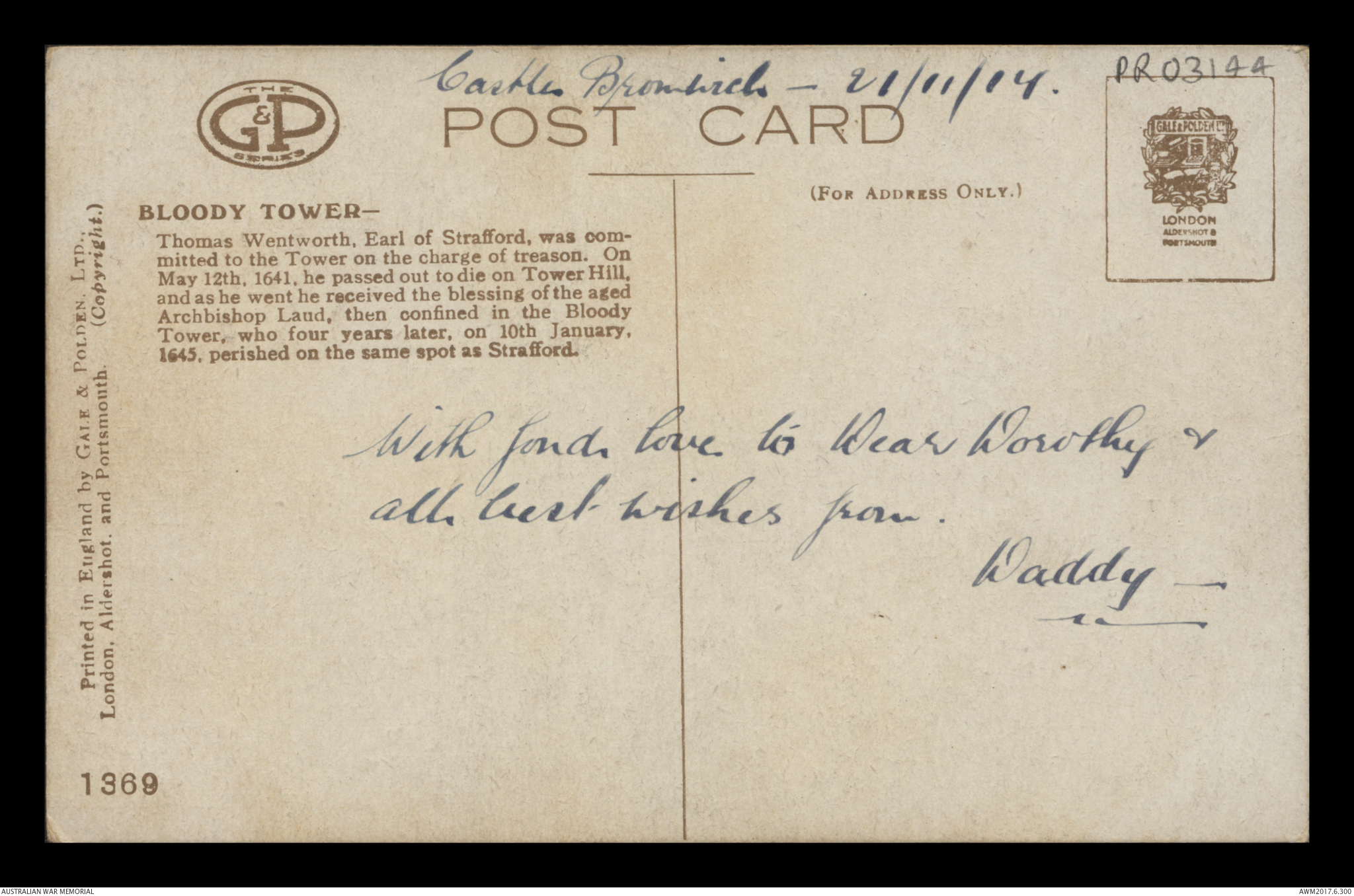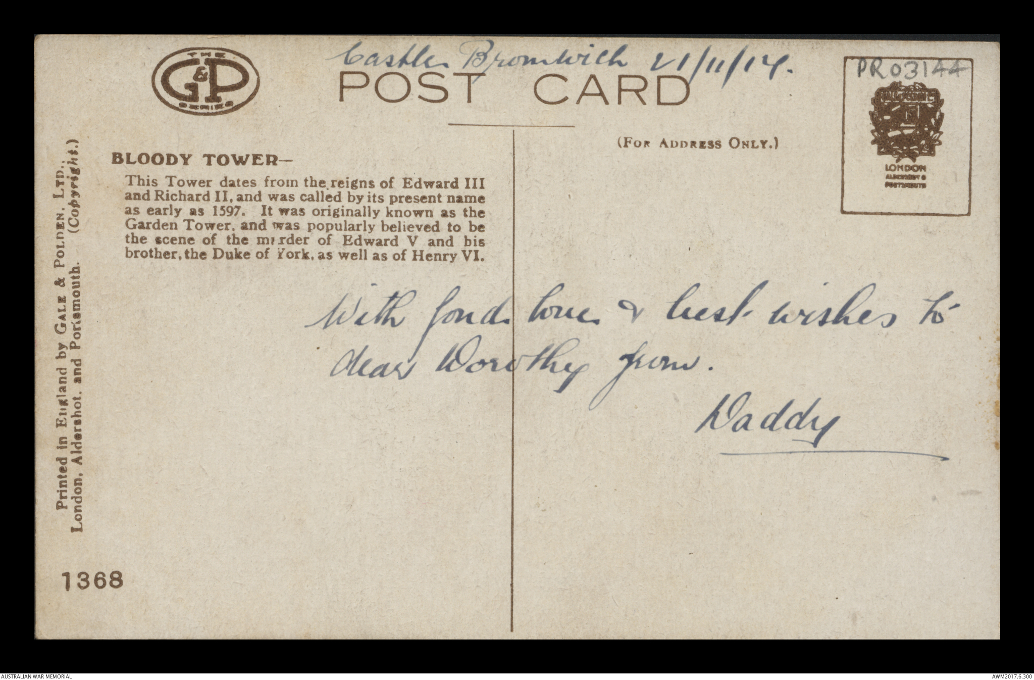 Postcard from Frederick Ewart Ryder to Dorothy Ryder, Castle Bromwich, 21 November 1917;
