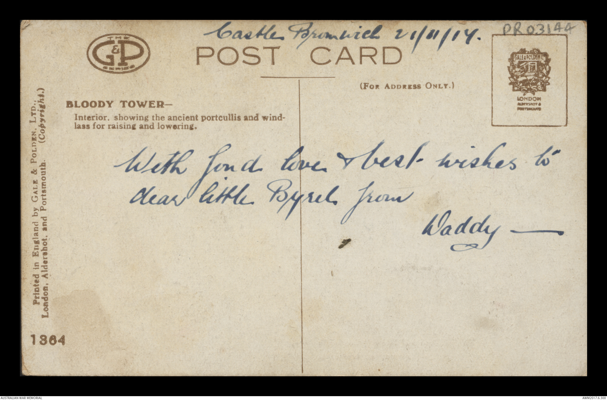 Postcard from Frederick Ewart Ryder to Beryl Ryder, Castle Bromwich, 24 October 1917;