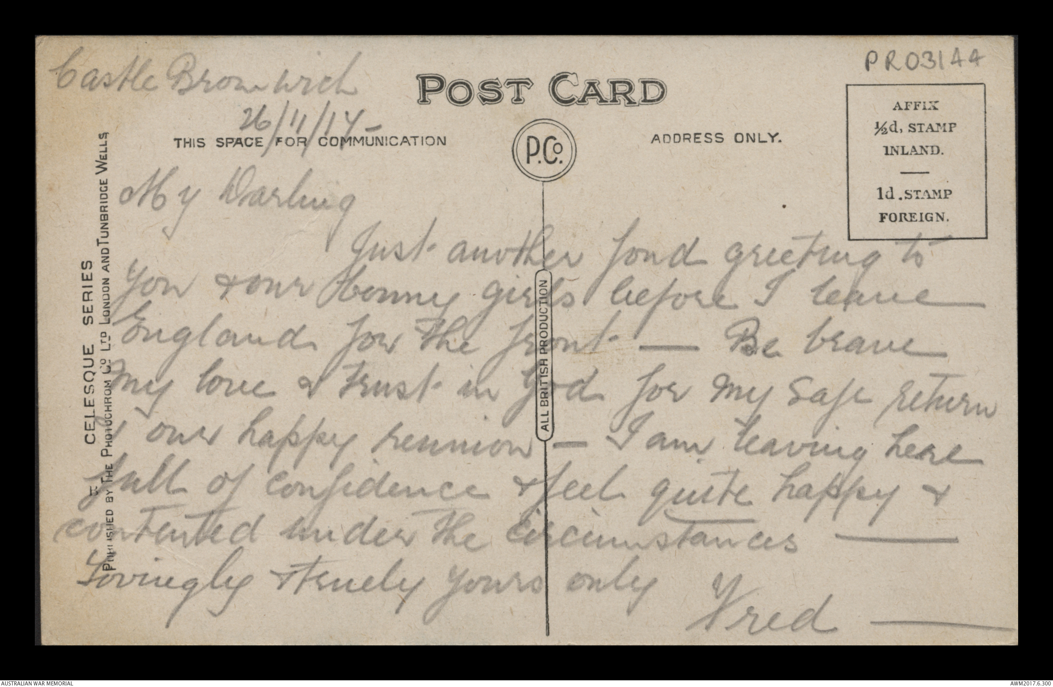 Postcard from Frederick Ewart Ryder to Florence Laurel Jane Ryder, Castle Bromwich, 26 November 1917;
