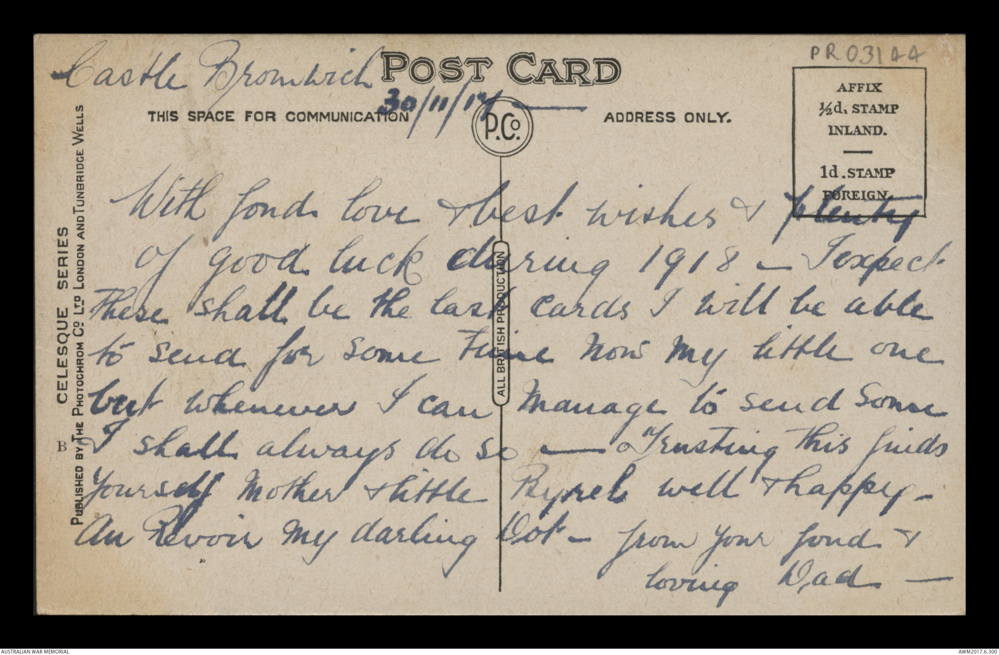 Postcard from Frederick Ewart Ryder to Dorothy Ryder, Castle Bromwich, 30 November 1917;