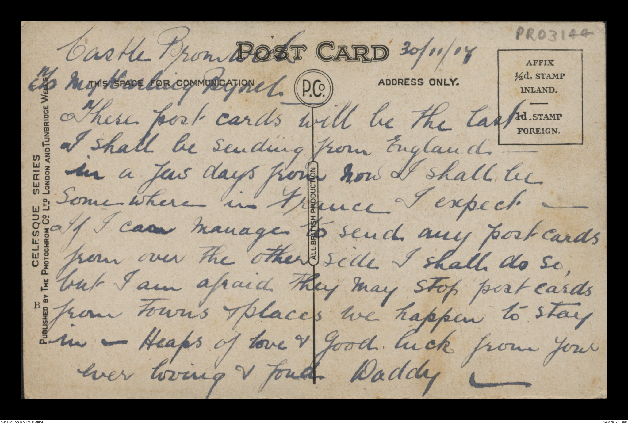 Postcard from Frederick Ewart Ryder to Dorothy Ryder, Castle Bromwich, 30 October 1917;