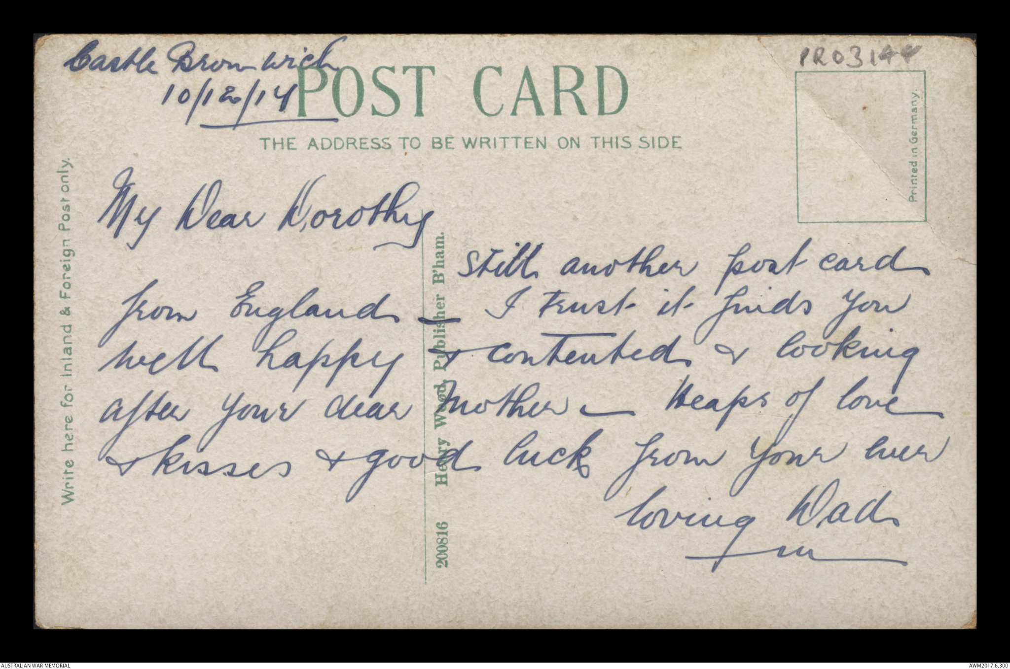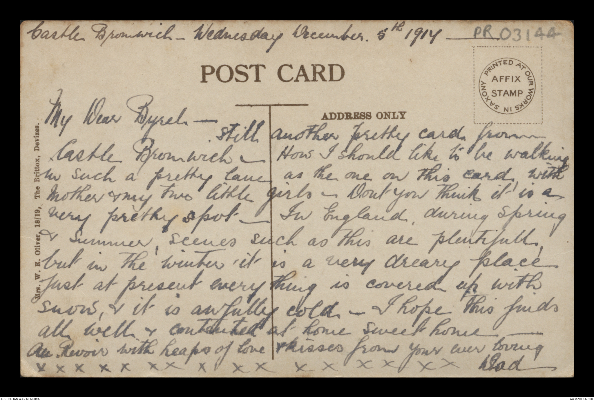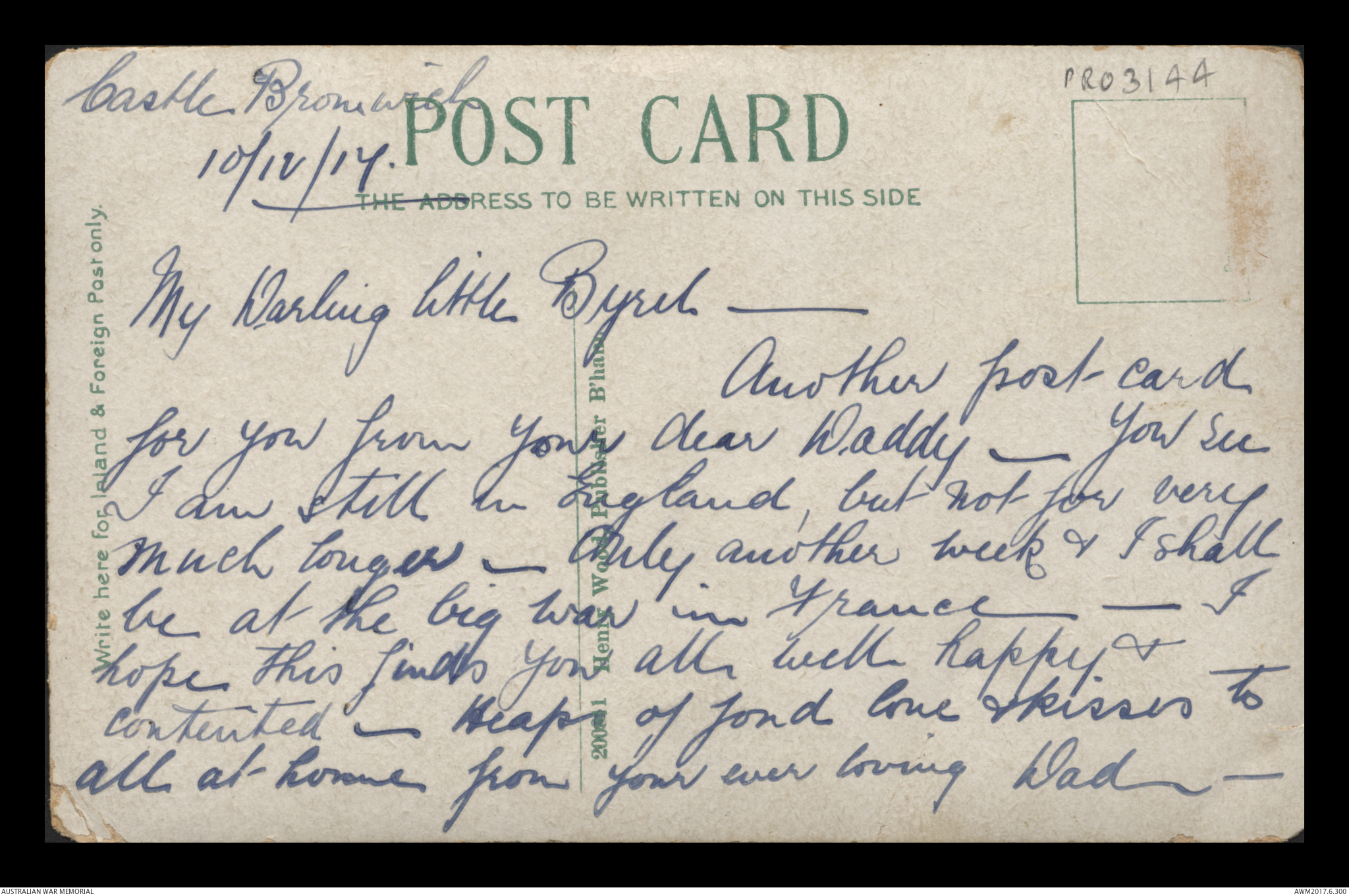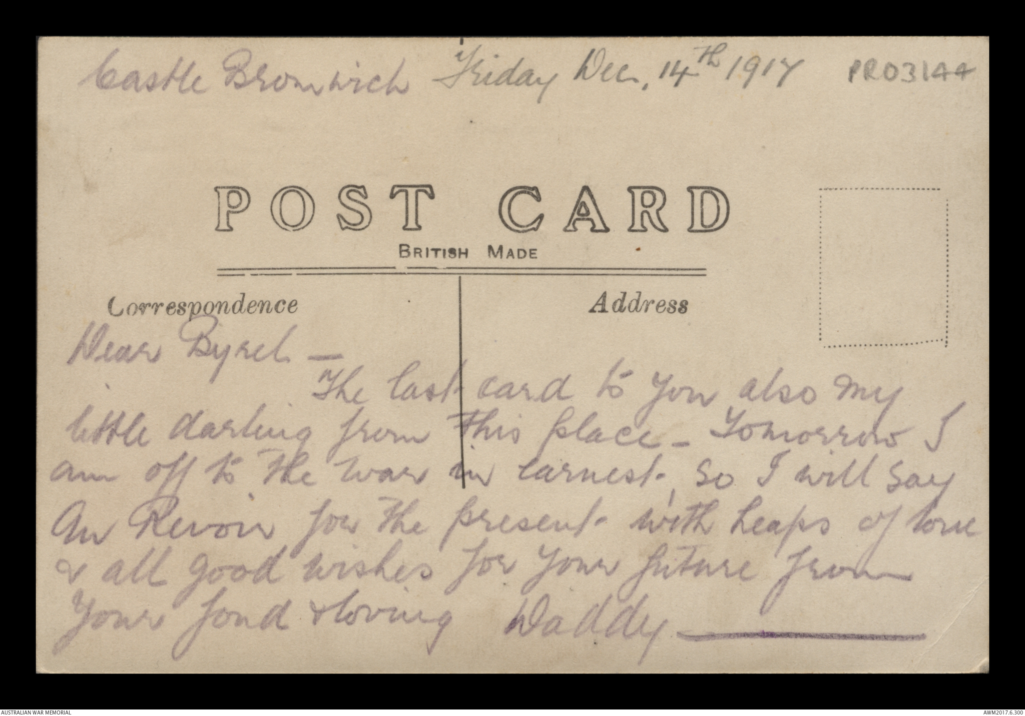Postcard from Frederick Ewart Ryder to Dorothy Ryder, Castle Bromwich, 10 December 1917;