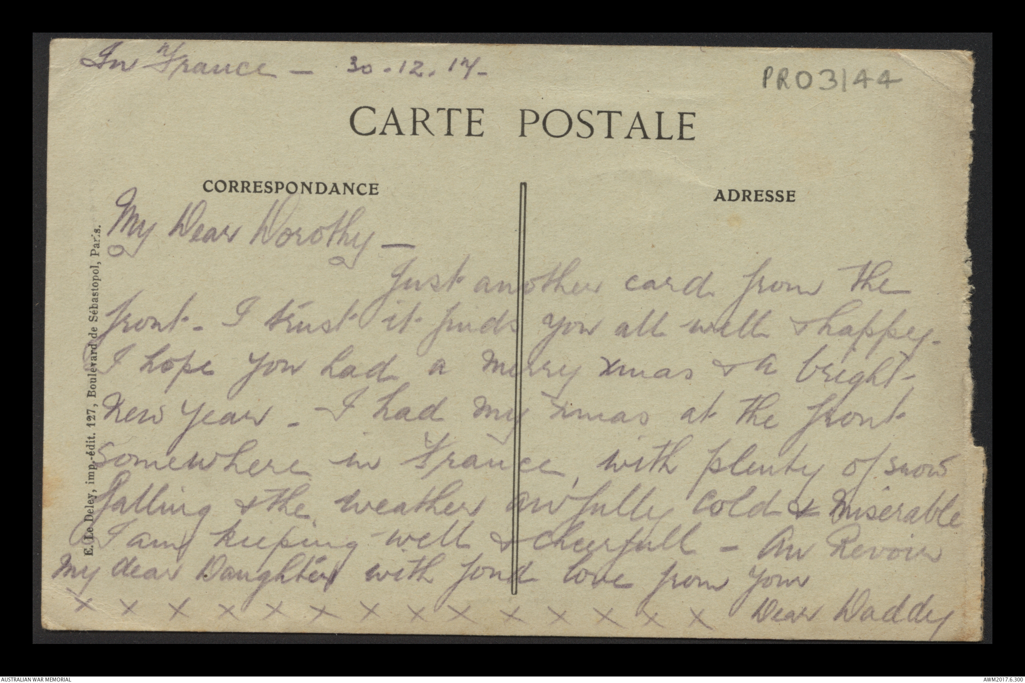 Postcard from Frederick Ewart Ryder to Dorothy Ryder, France, 30 December 1917;