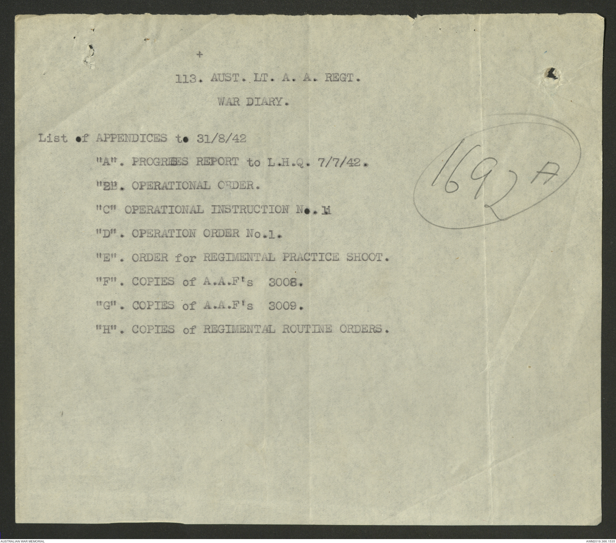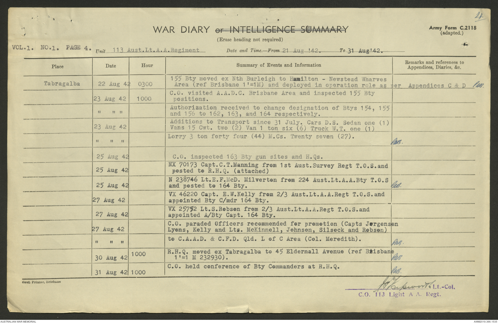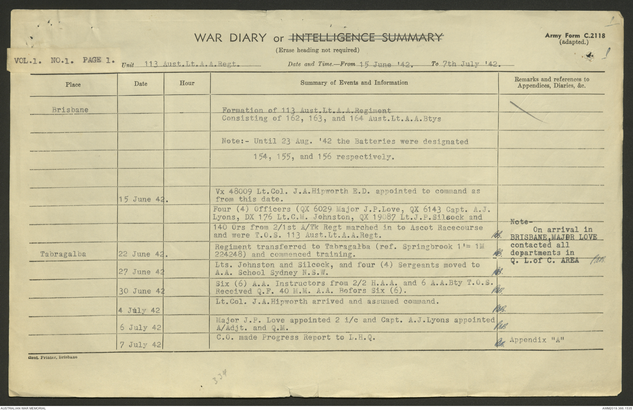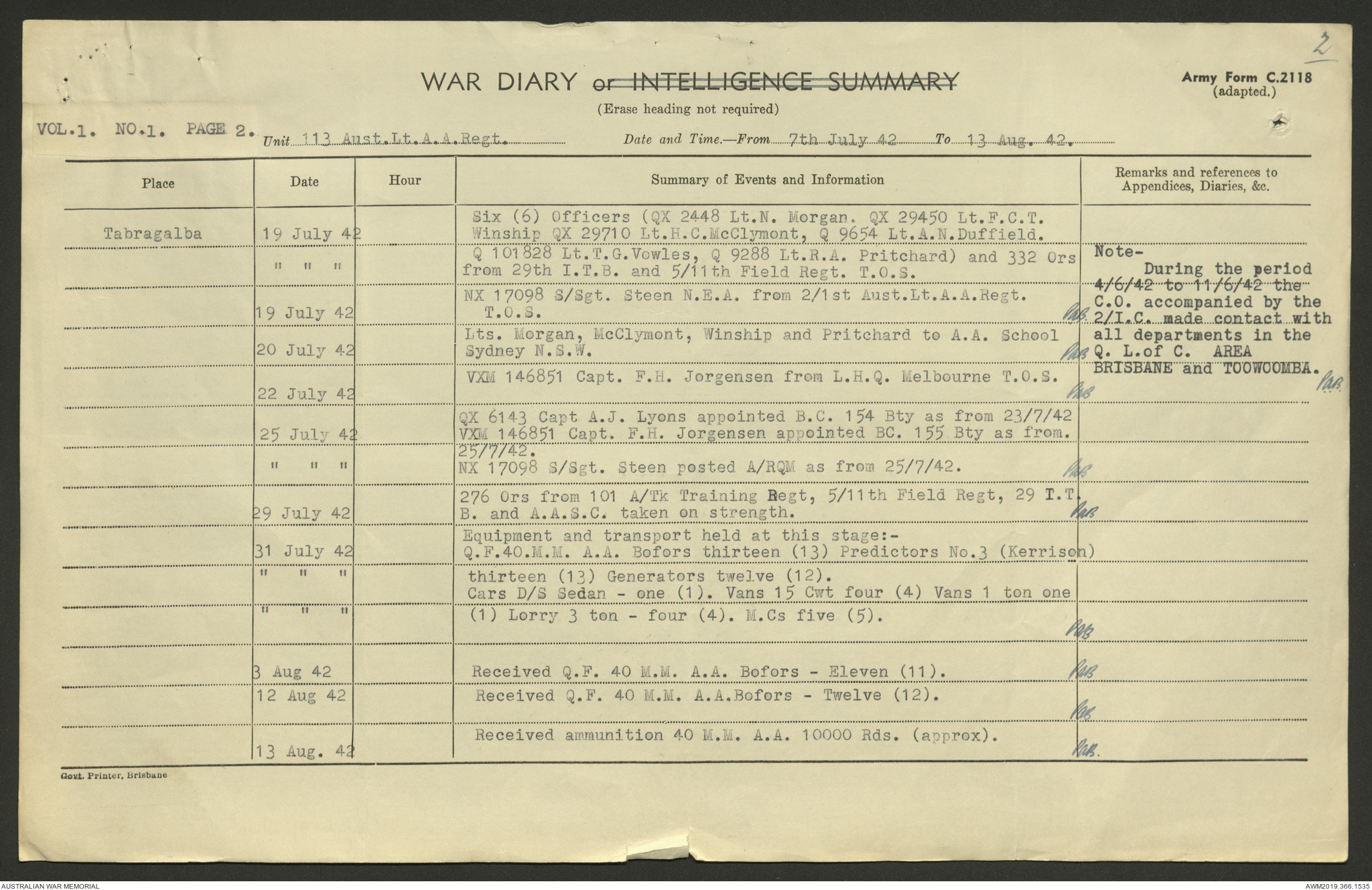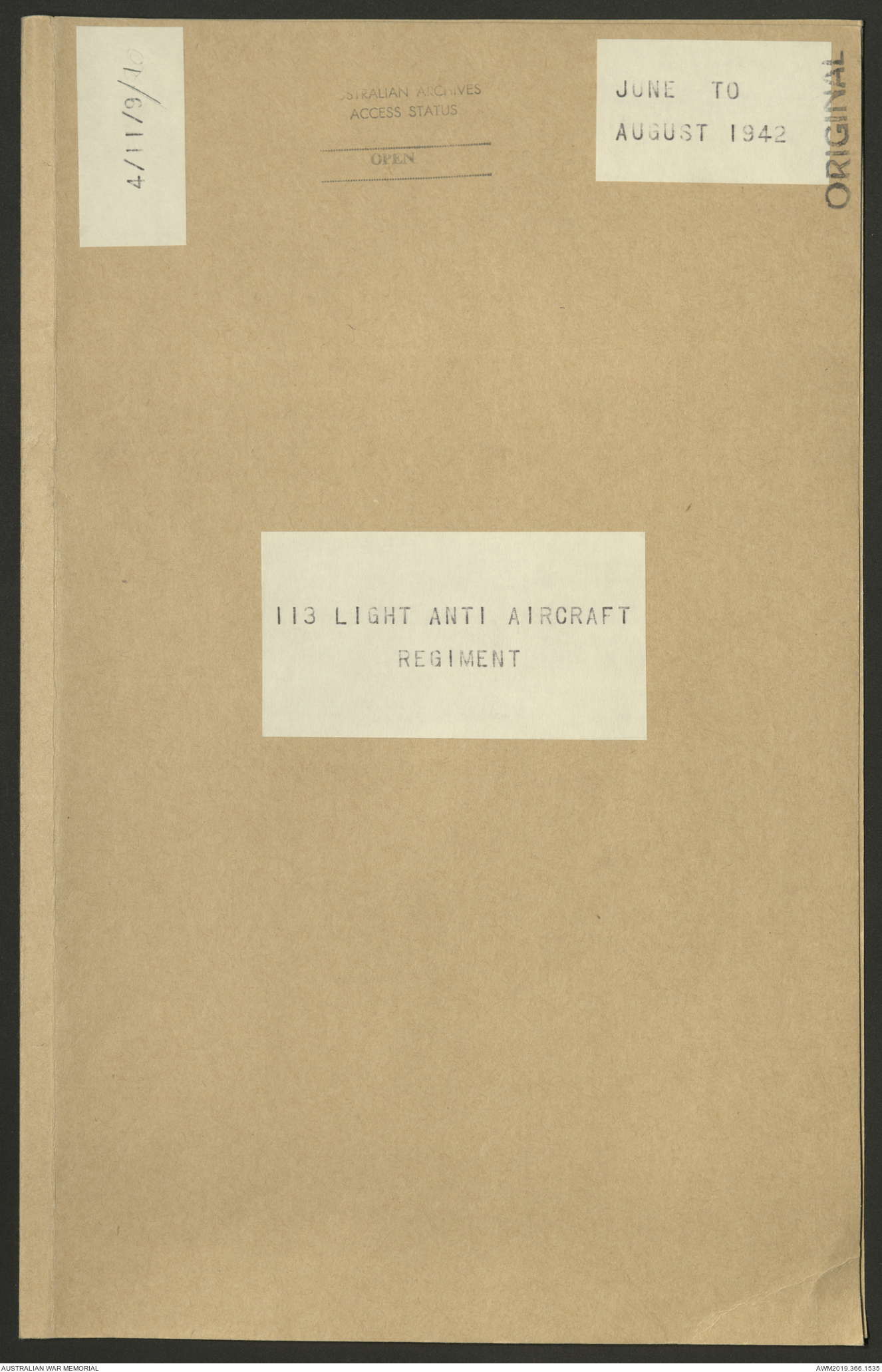 AWM52 4/11/9/1 - [Unit War Diaries, 1939-45 War] 113 Australian Light Anti-Aircraft Regiment, June - August 1942