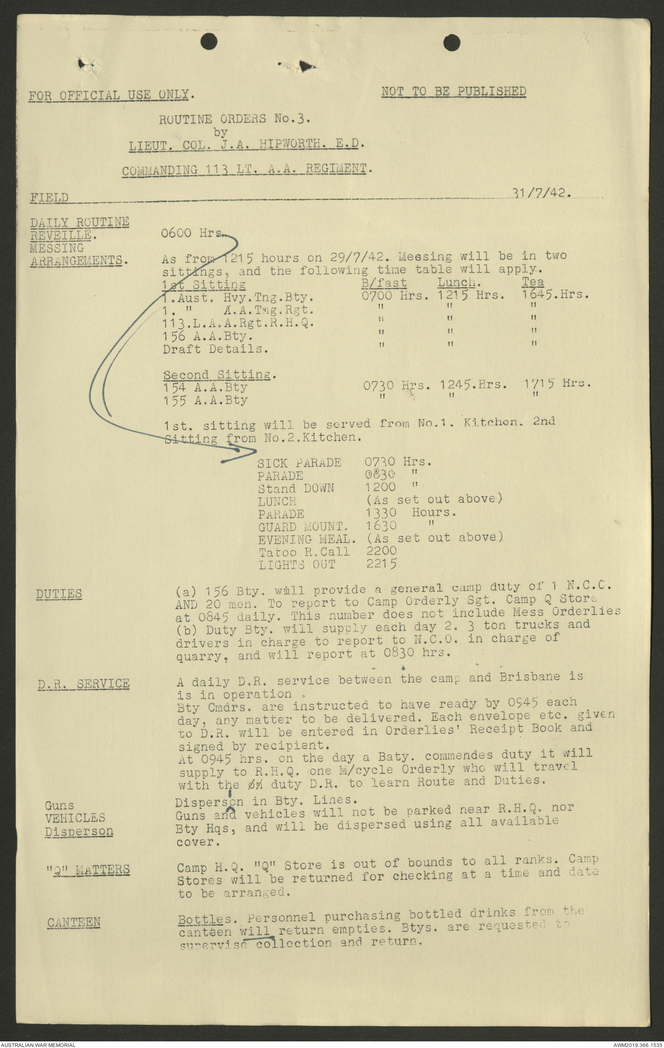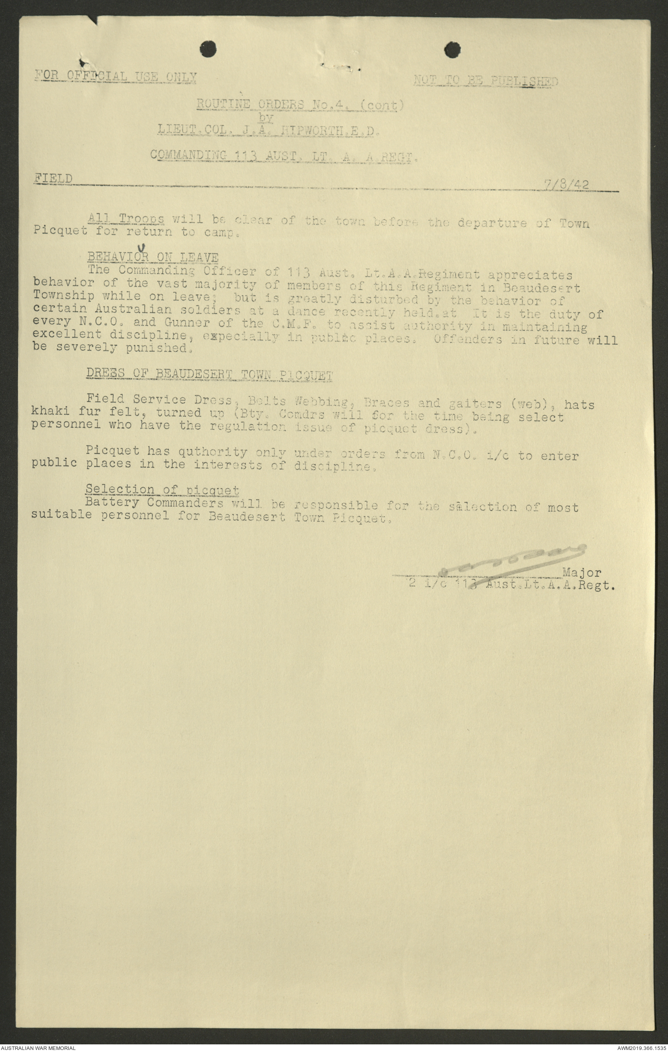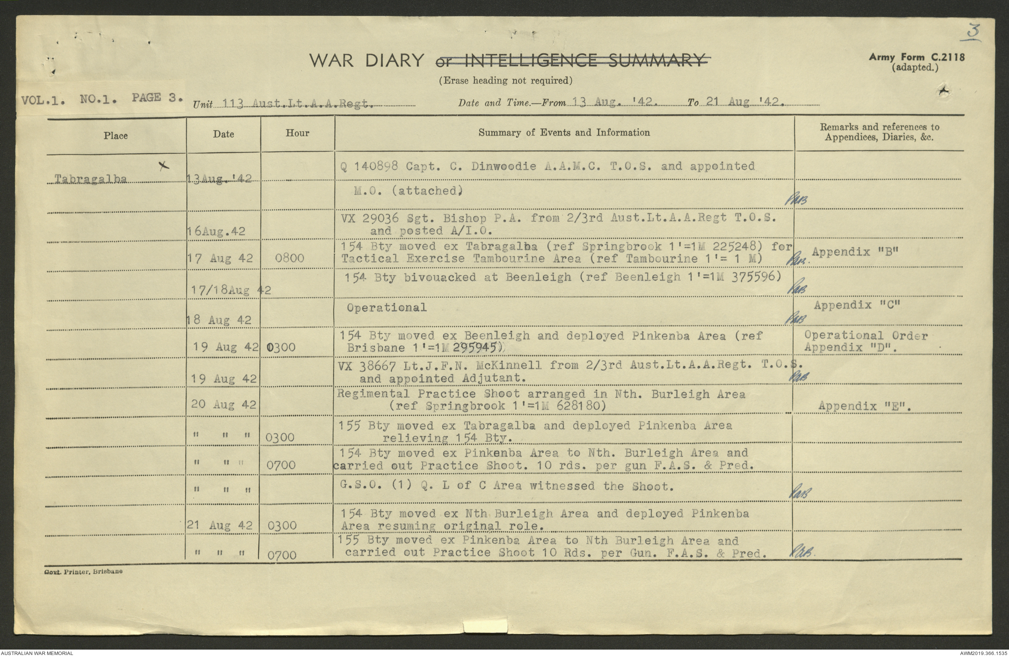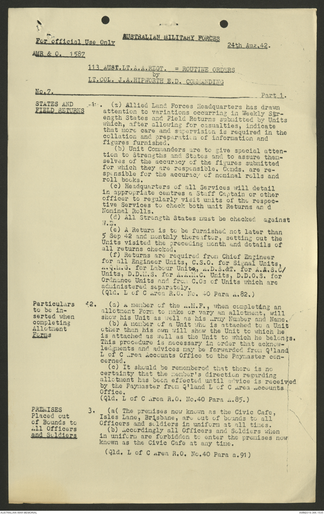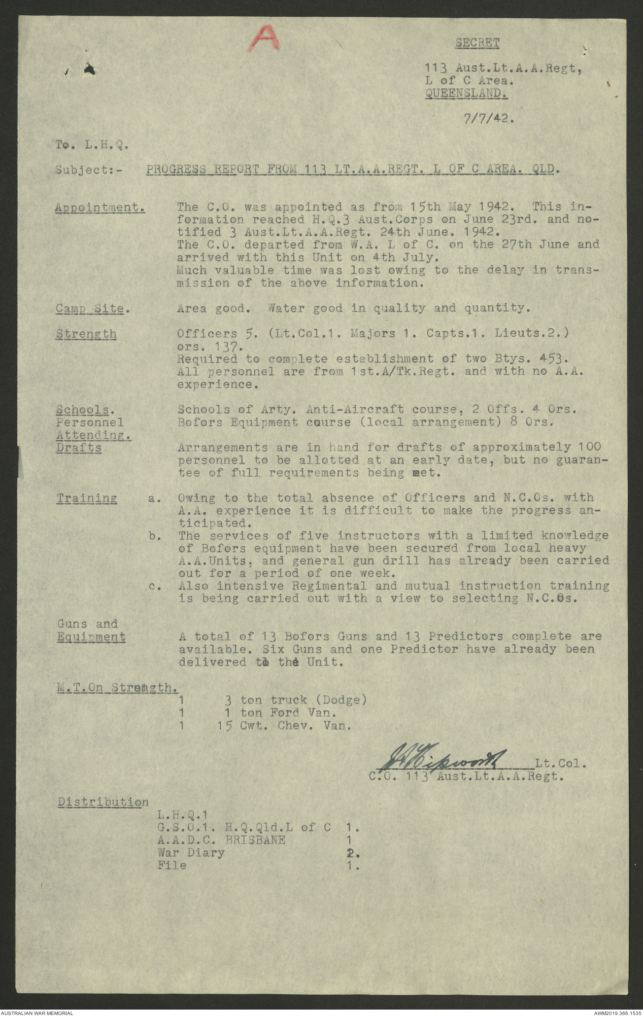 AWM52 4/11/9/1 - [Unit War Diaries, 1939-45 War] 113 Australian Light Anti-Aircraft Regiment, June - August 1942