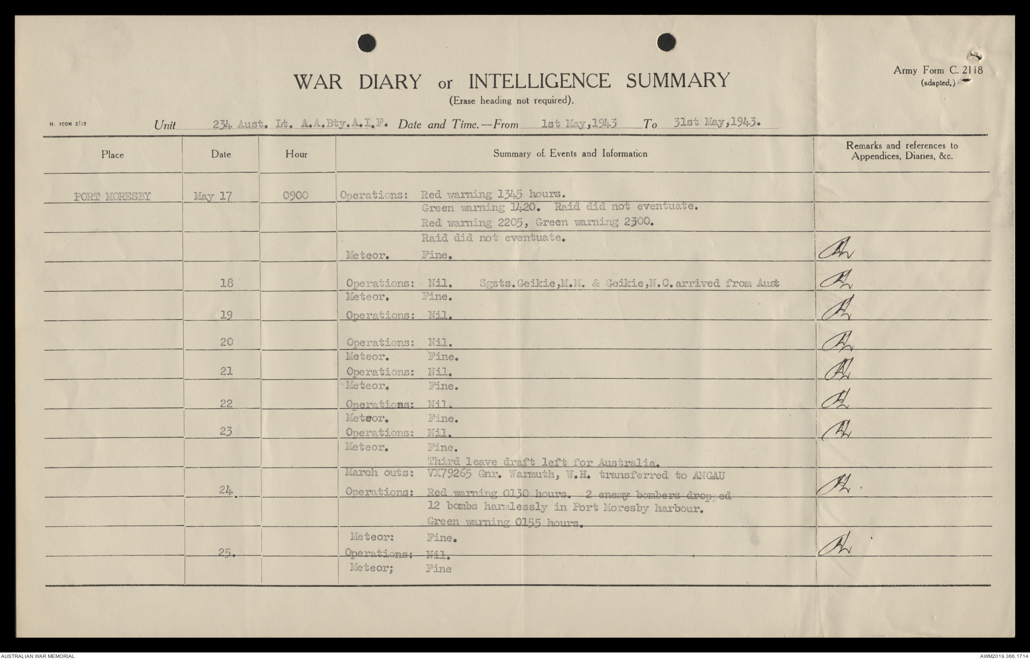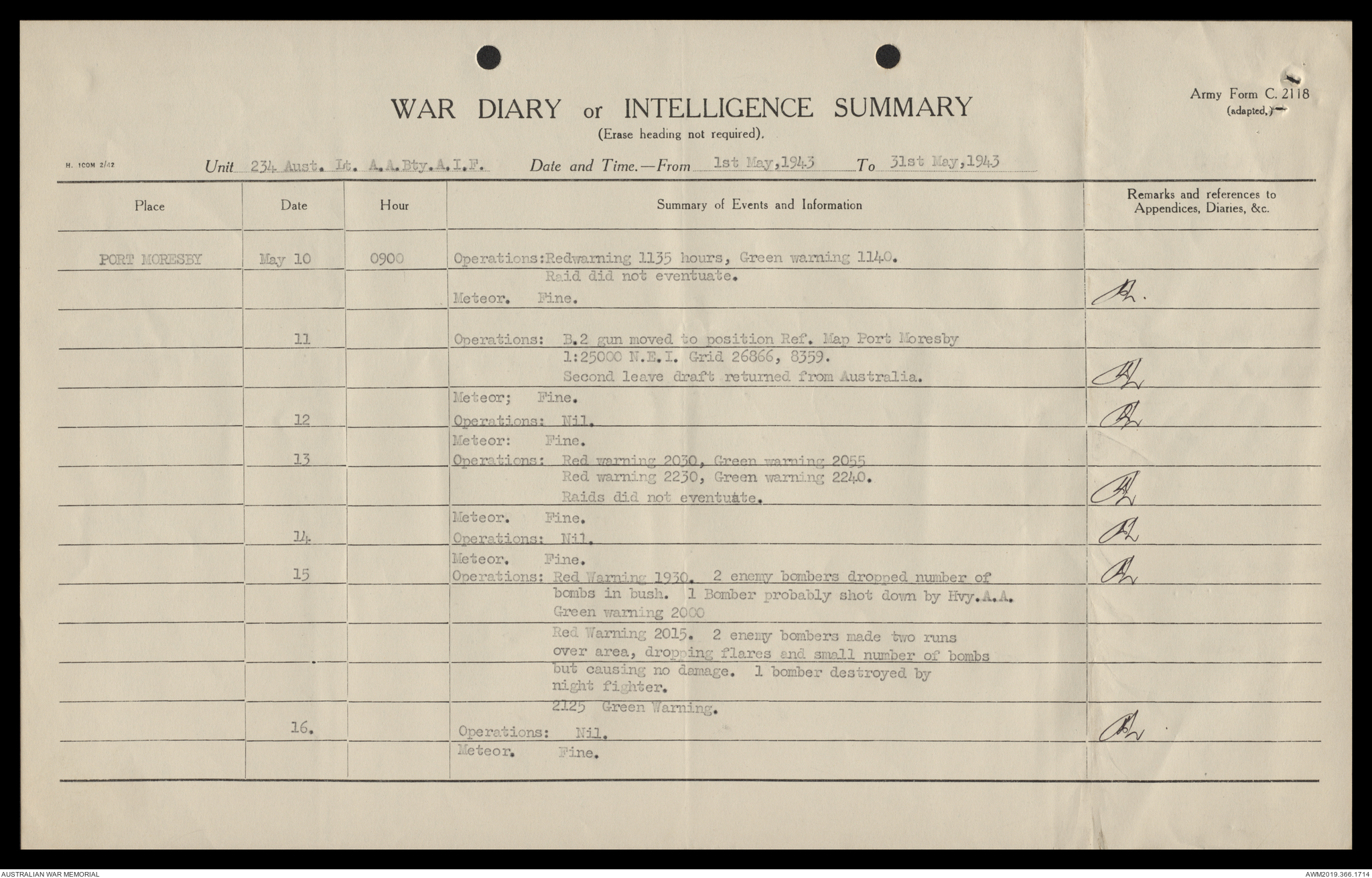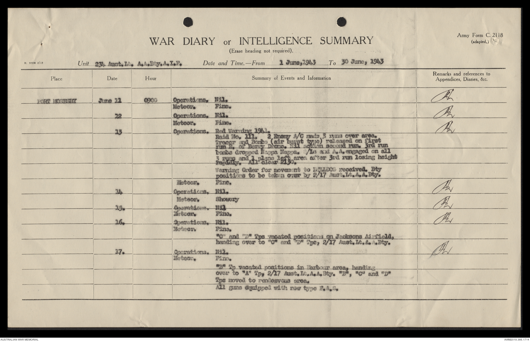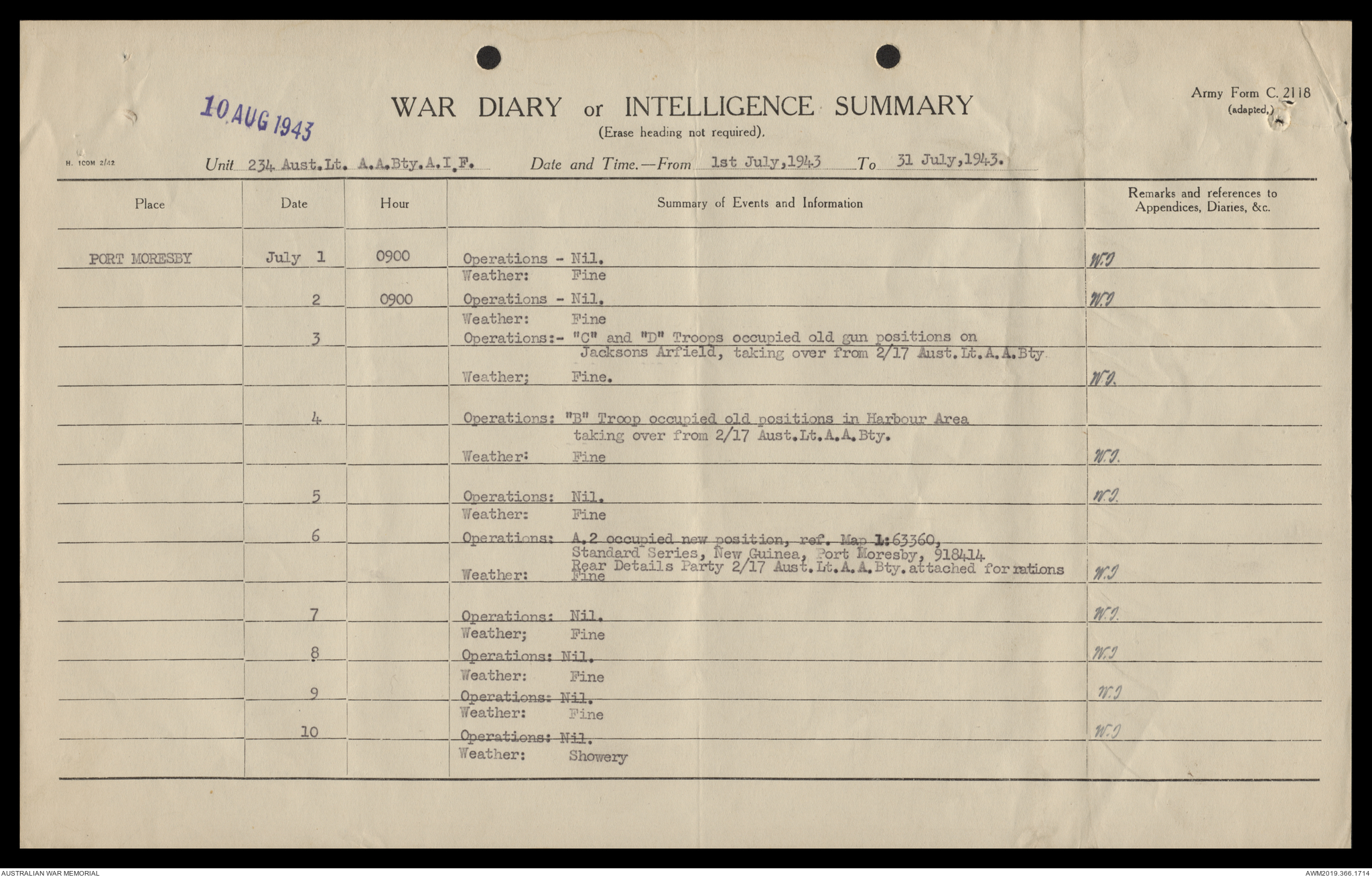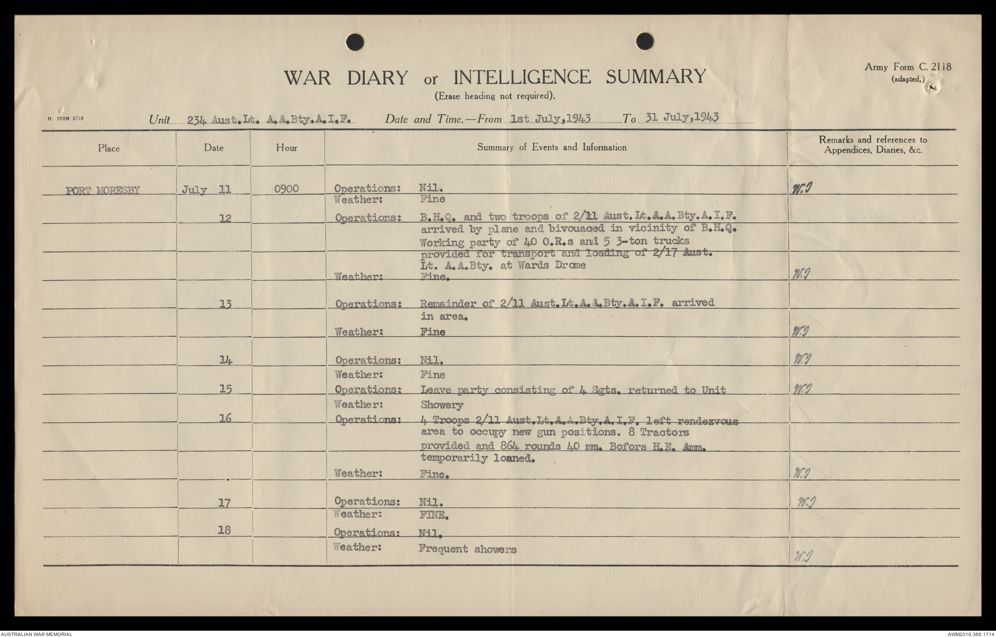 AWM52 4/12/38/2 - [Unit War Diaries, 1939-45 War] 234 Australian Light Anti-Aircraft Battery AIF, May - August 1943