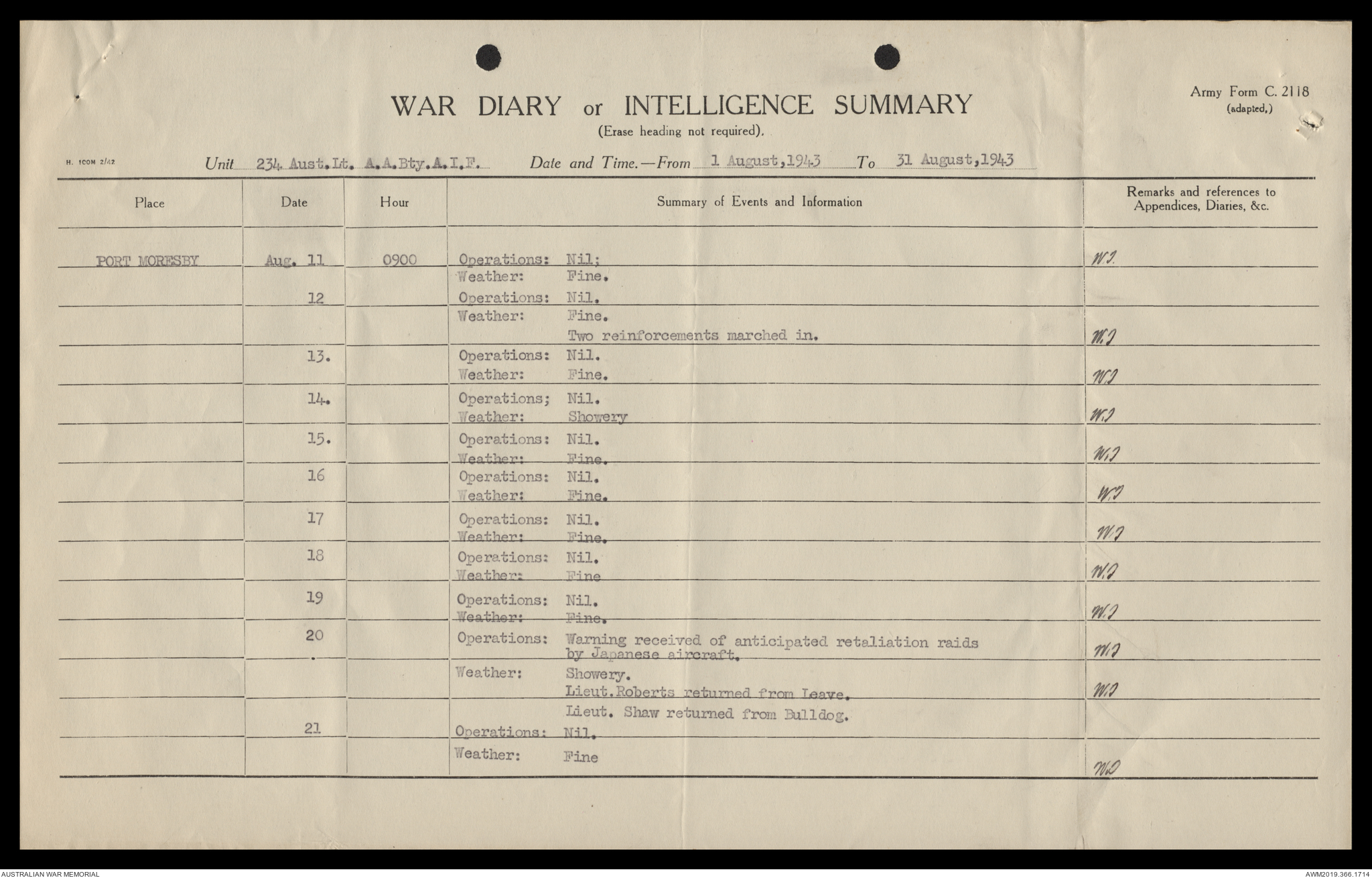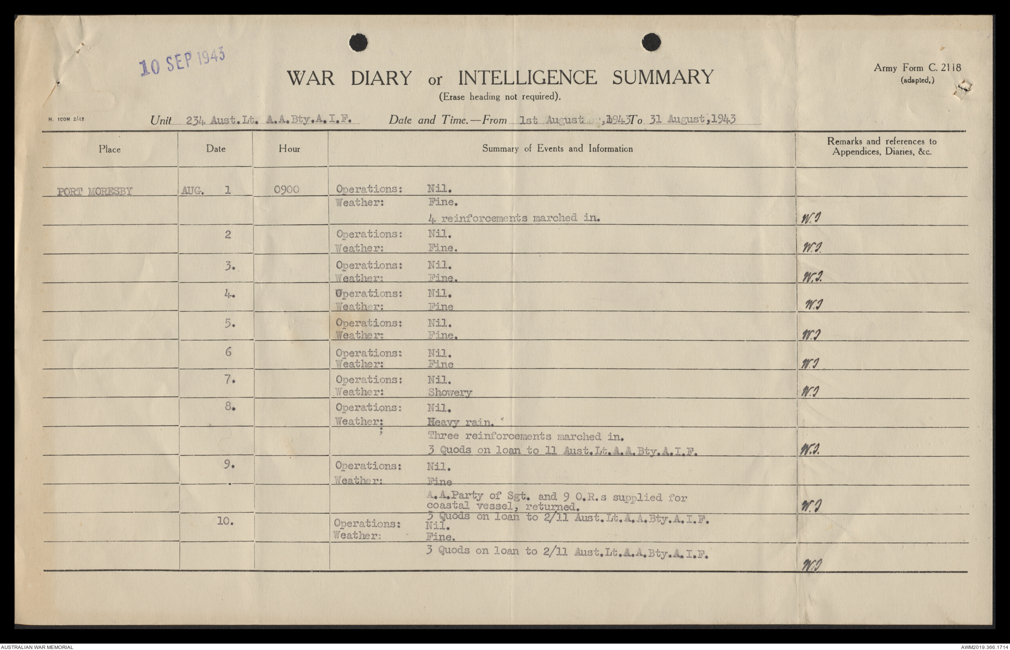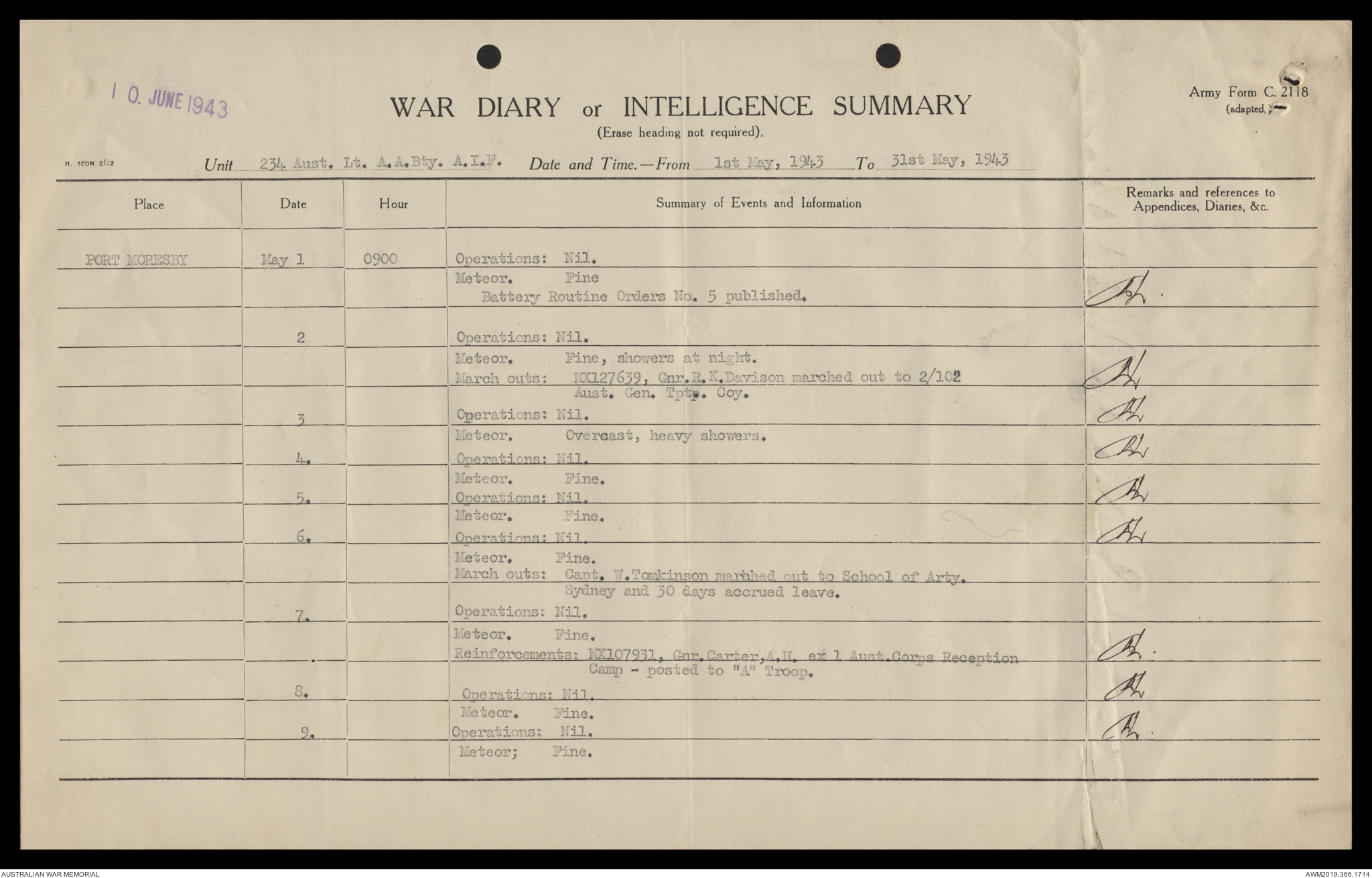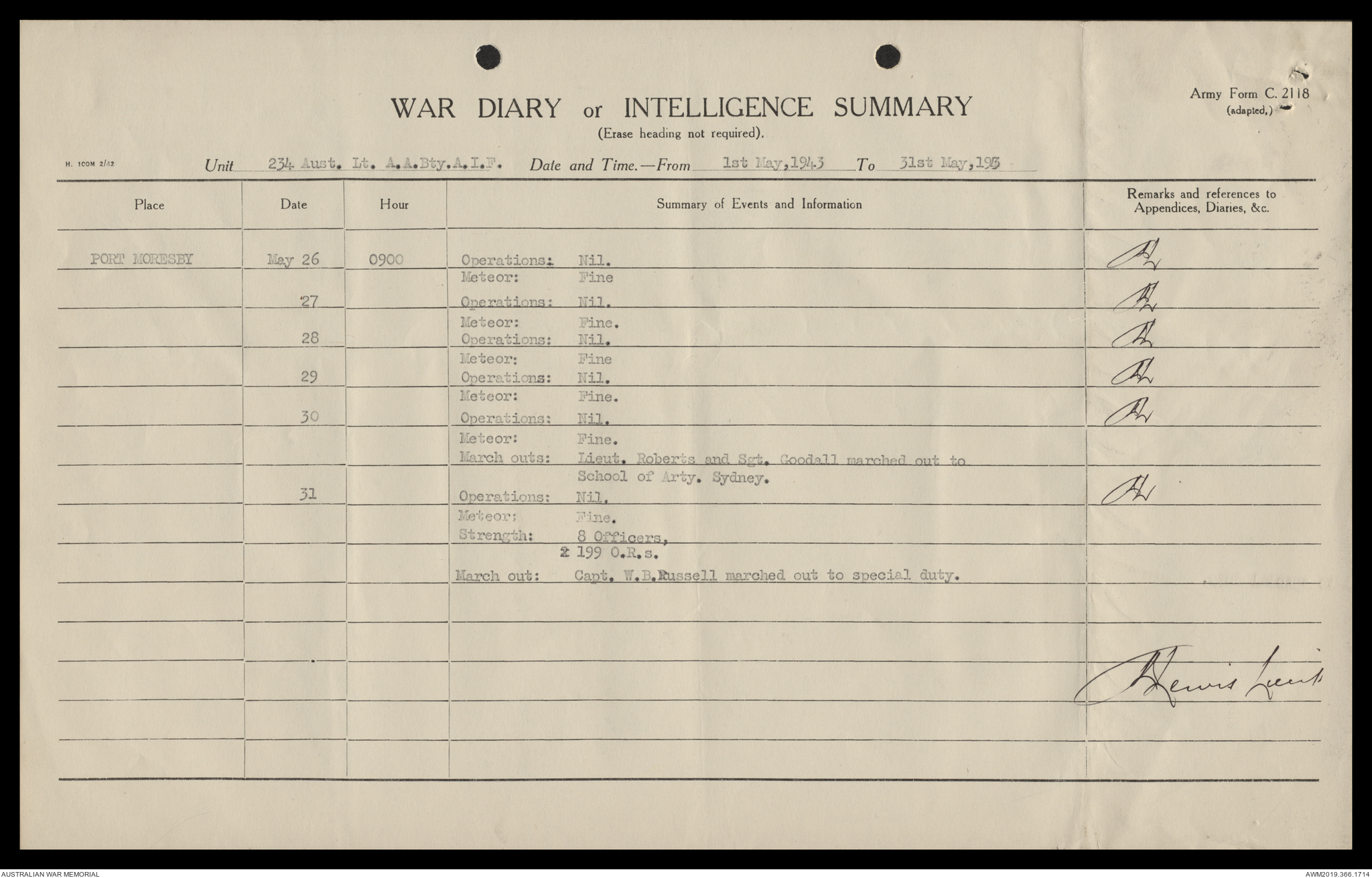 AWM52 4/12/38/2 - [Unit War Diaries, 1939-45 War] 234 Australian Light Anti-Aircraft Battery AIF, May - August 1943