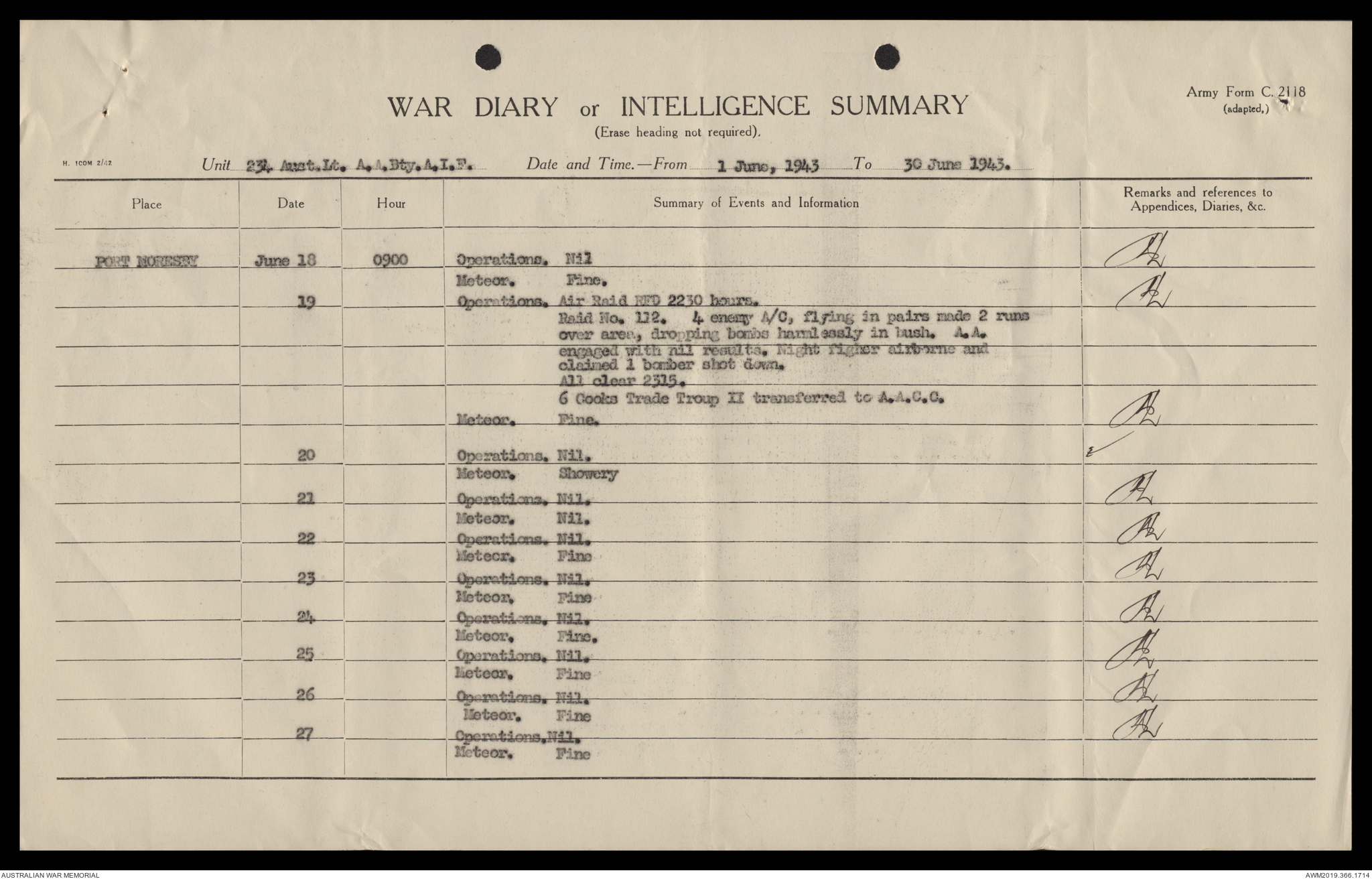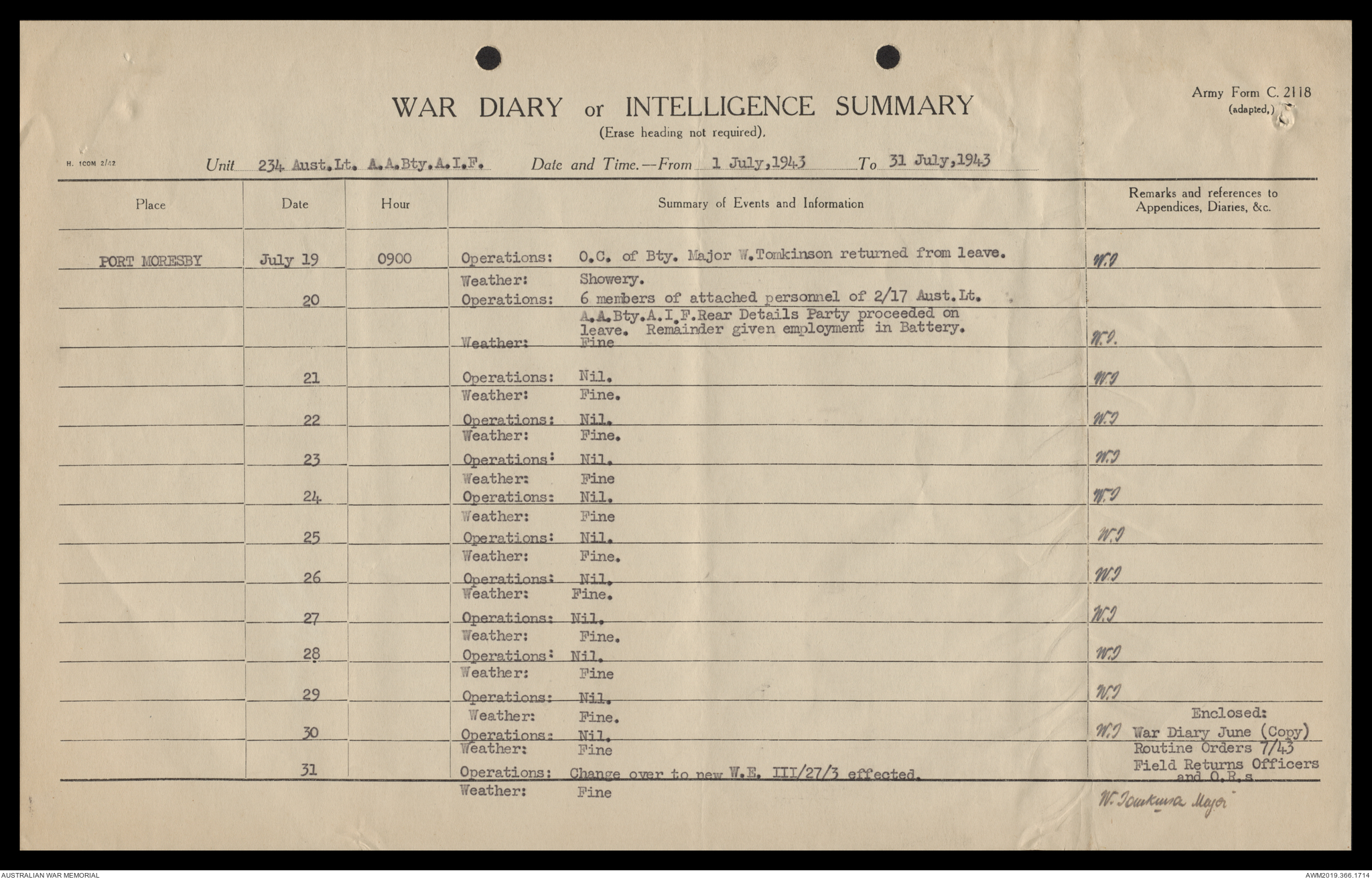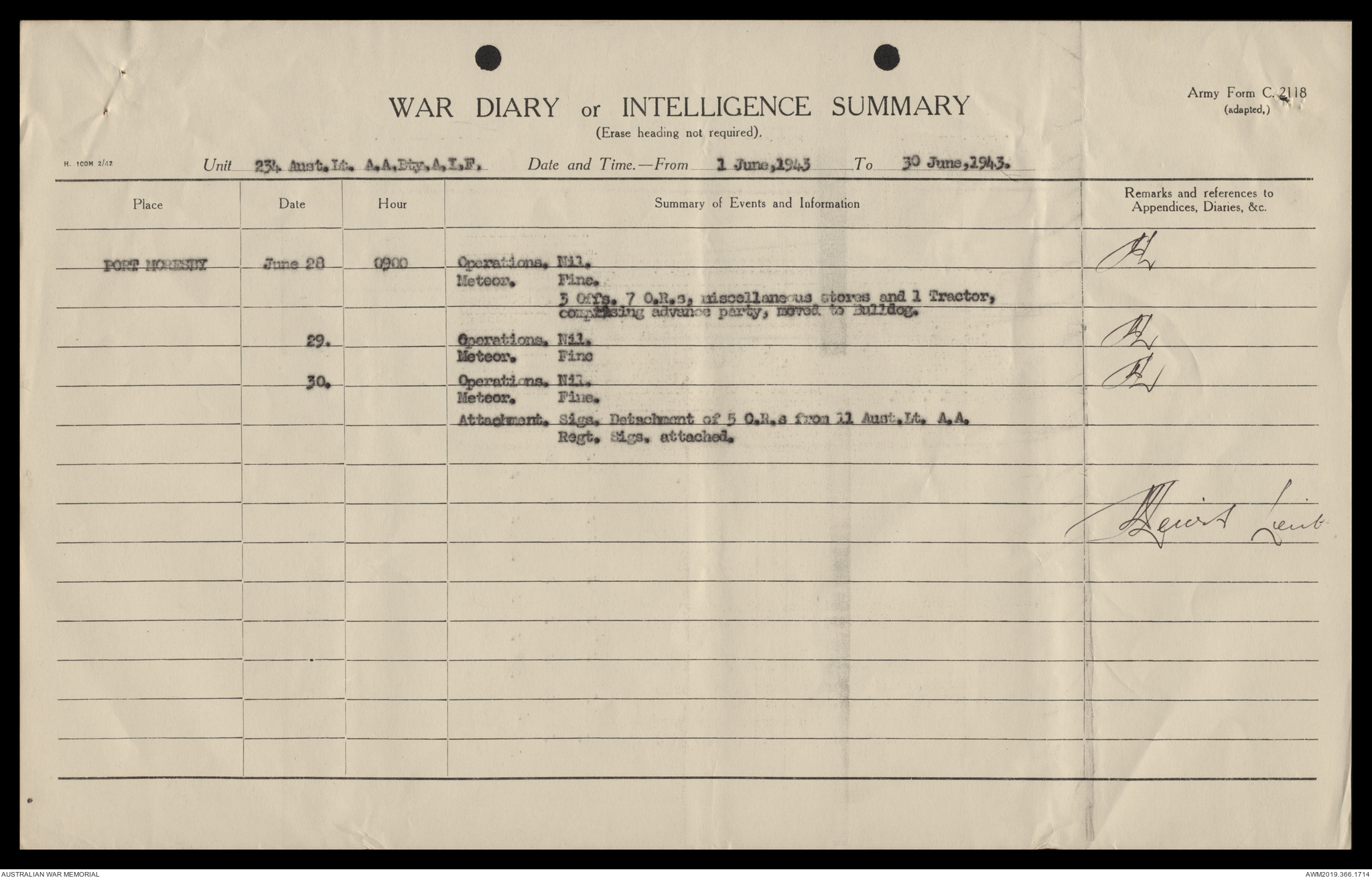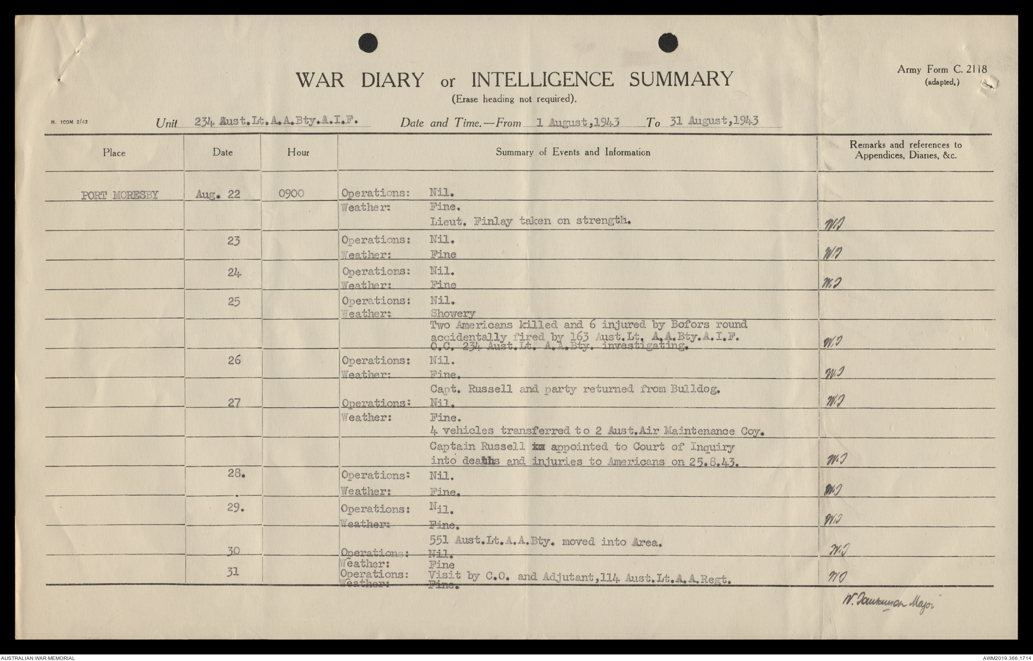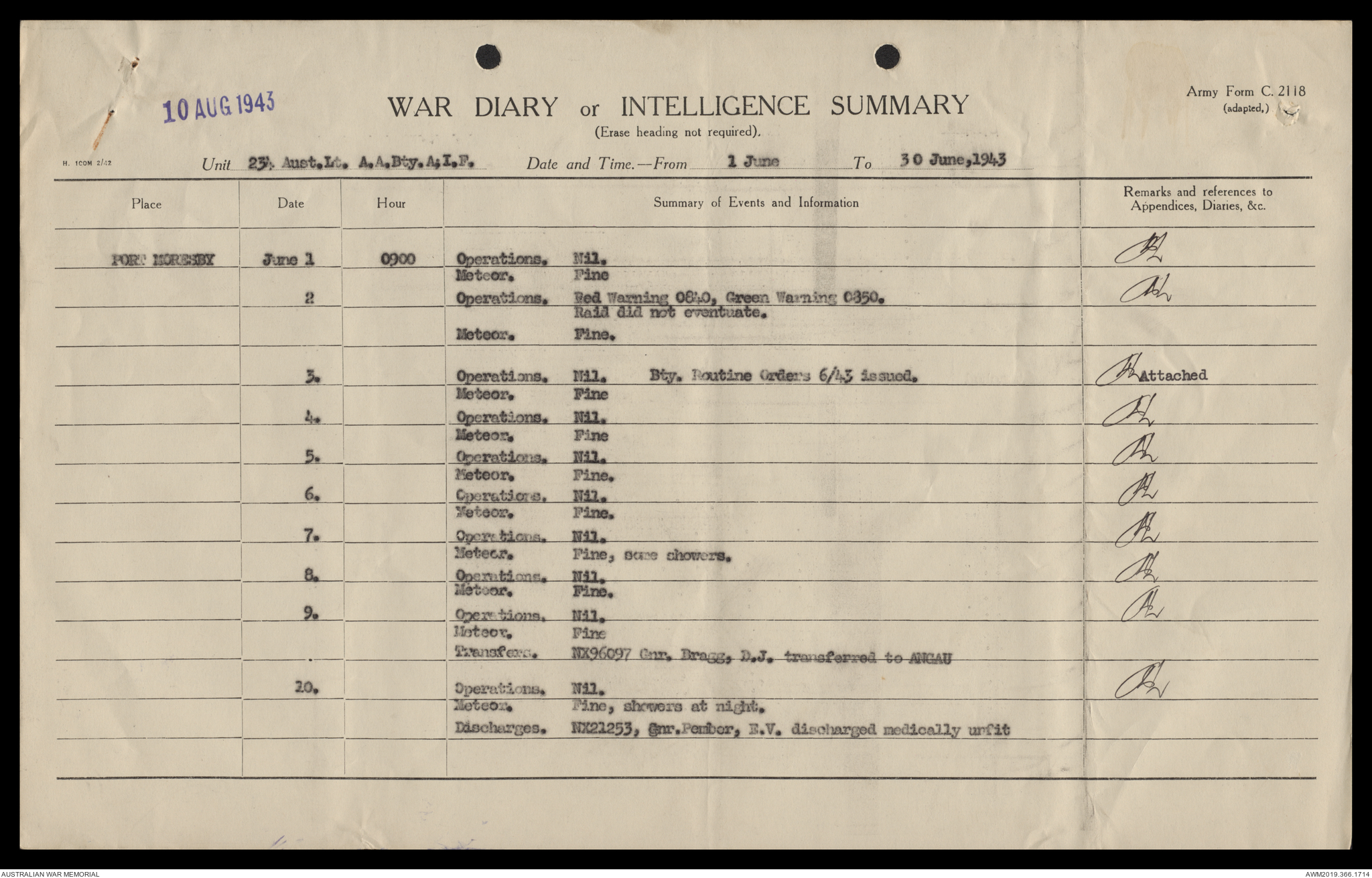 AWM52 4/12/38/2 - [Unit War Diaries, 1939-45 War] 234 Australian Light Anti-Aircraft Battery AIF, May - August 1943