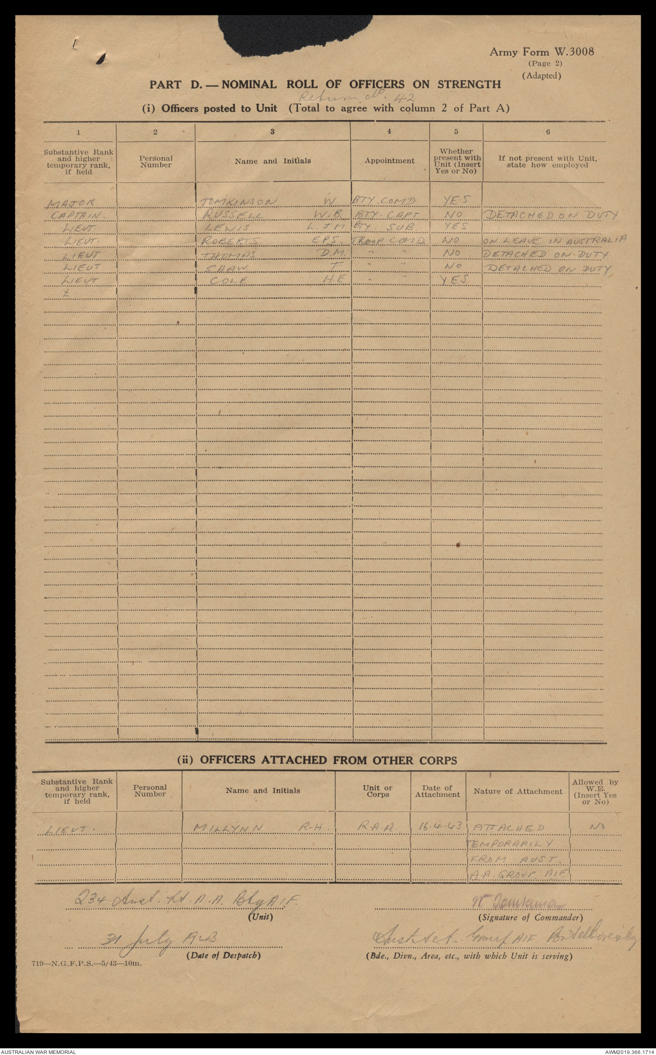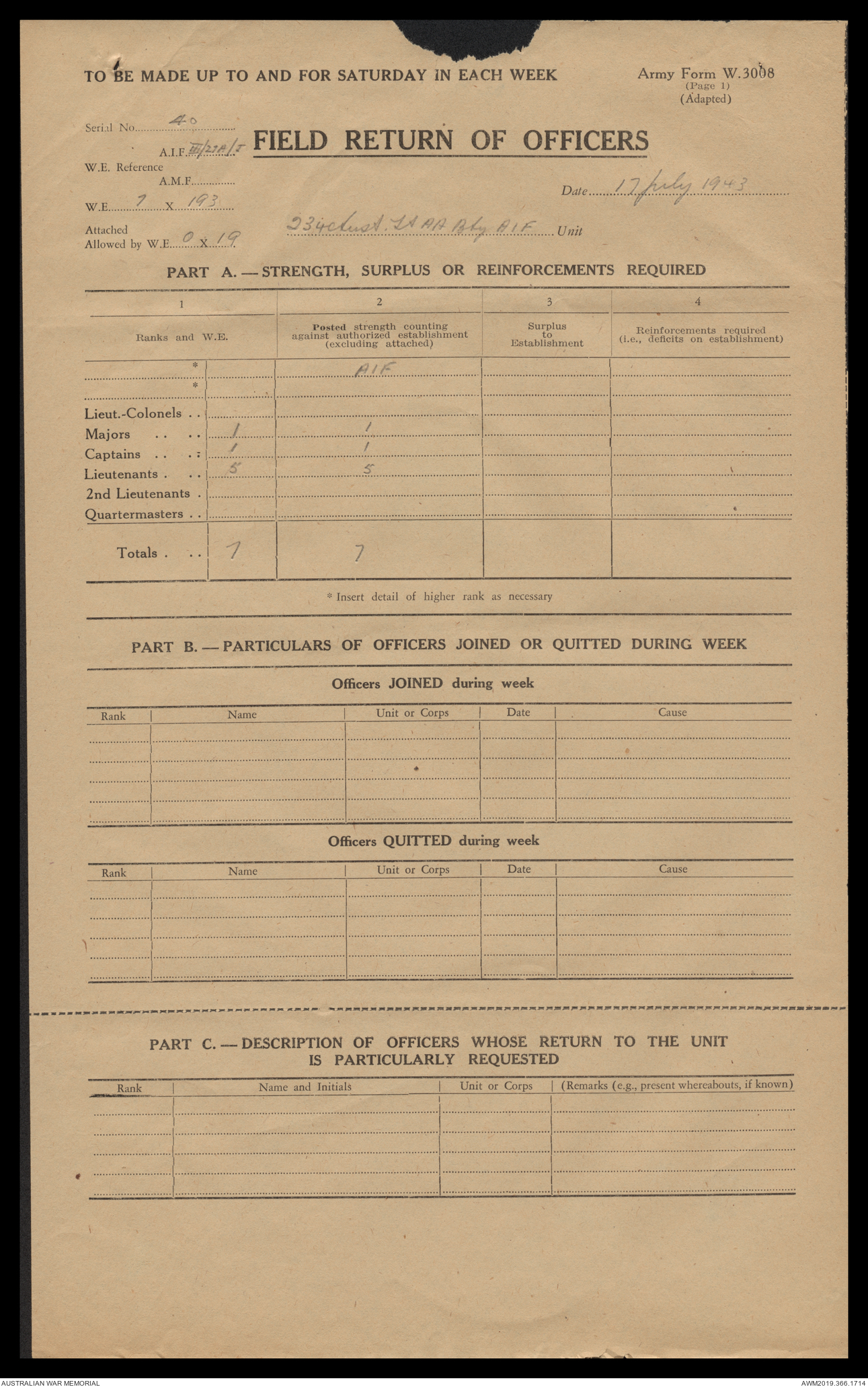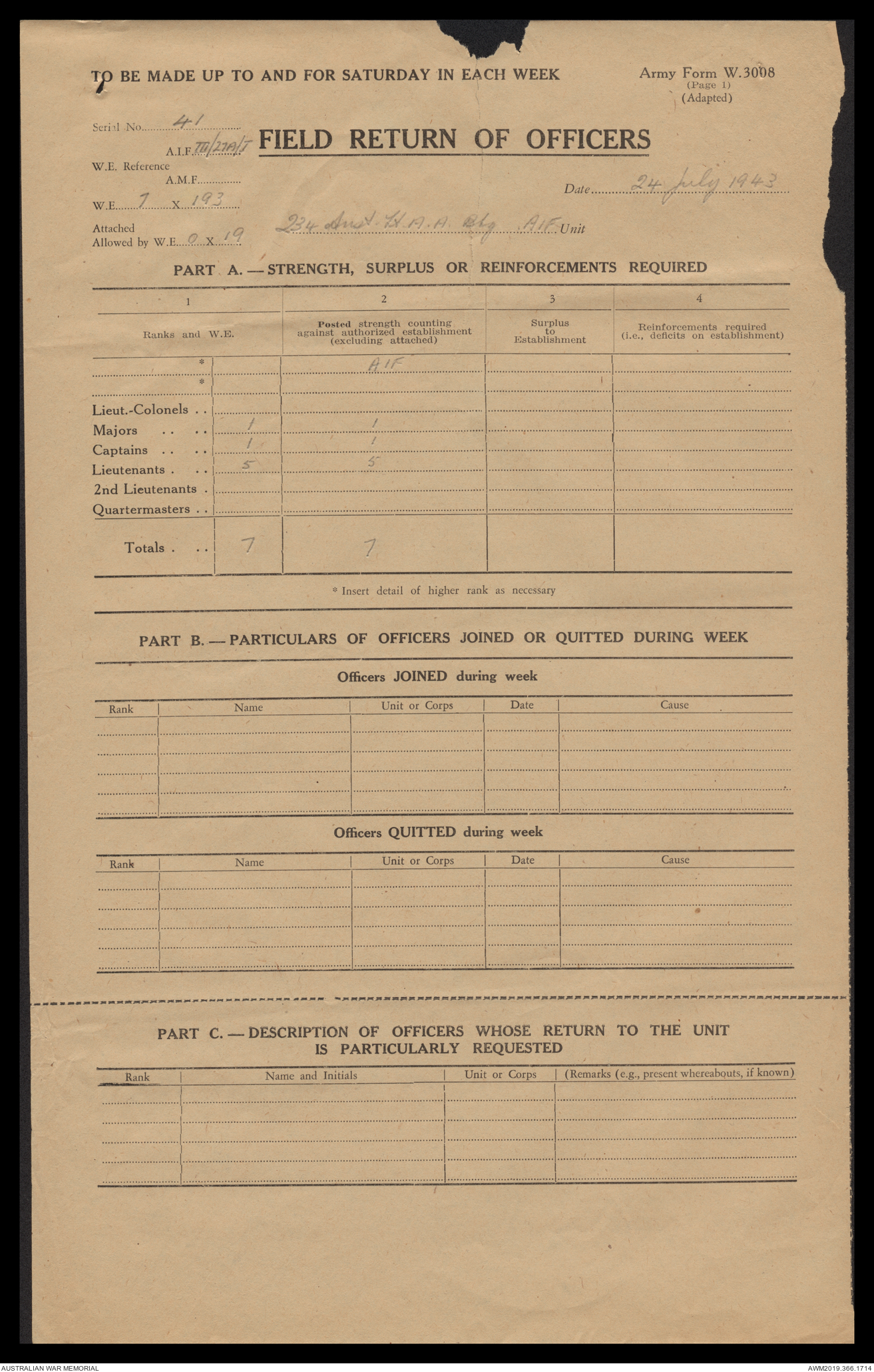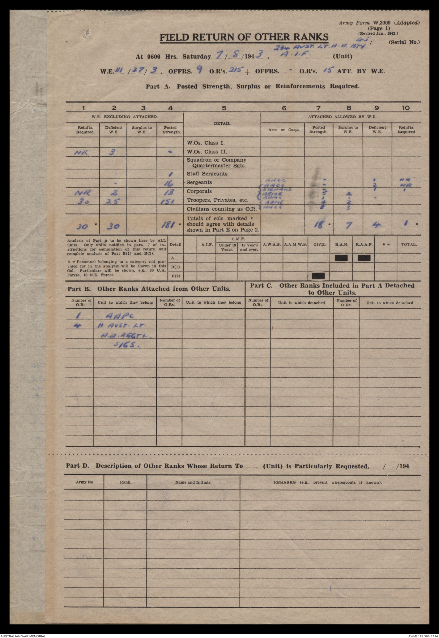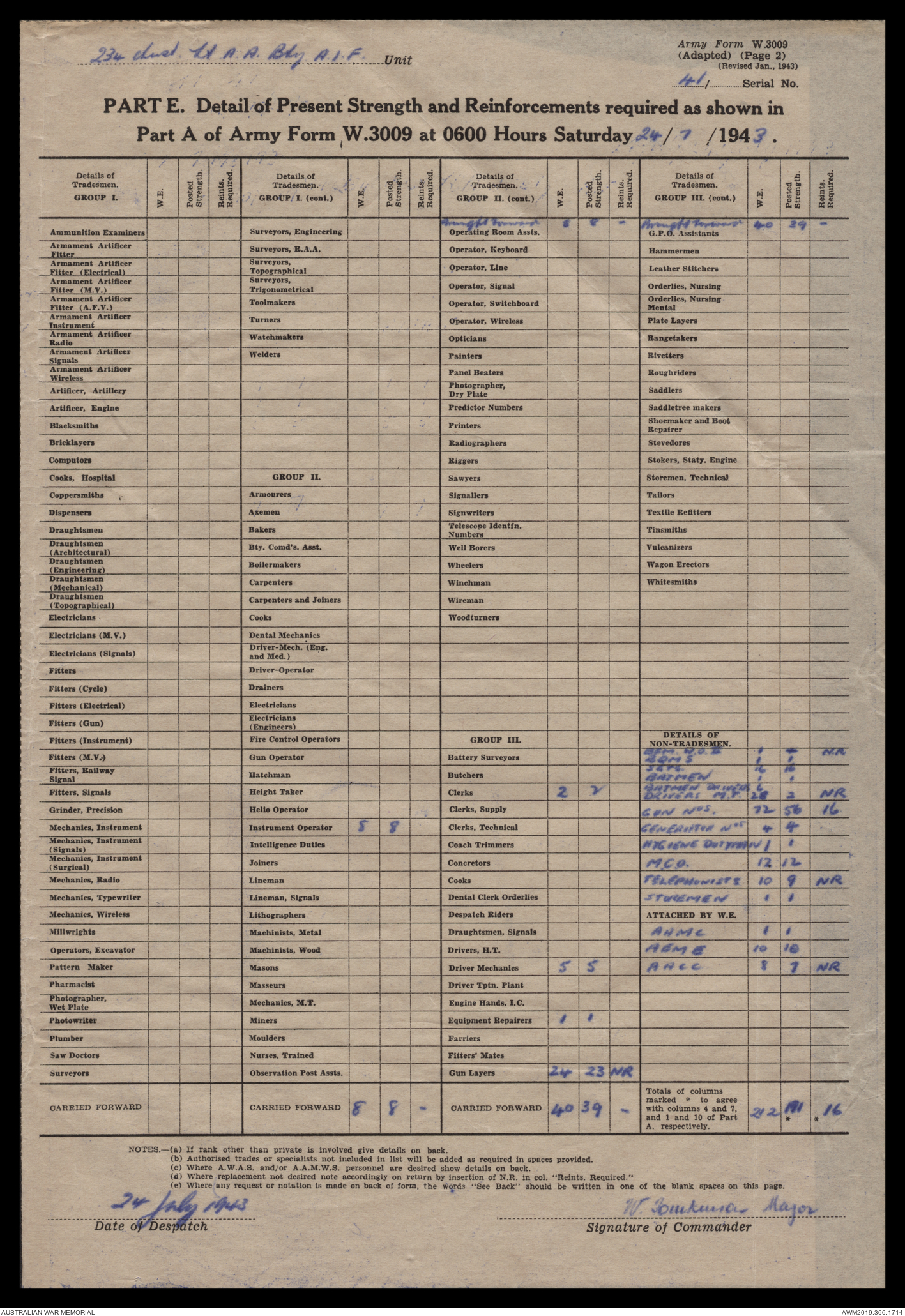 AWM52 4/12/38/2 - [Unit War Diaries, 1939-45 War] 234 Australian Light Anti-Aircraft Battery AIF, May - August 1943