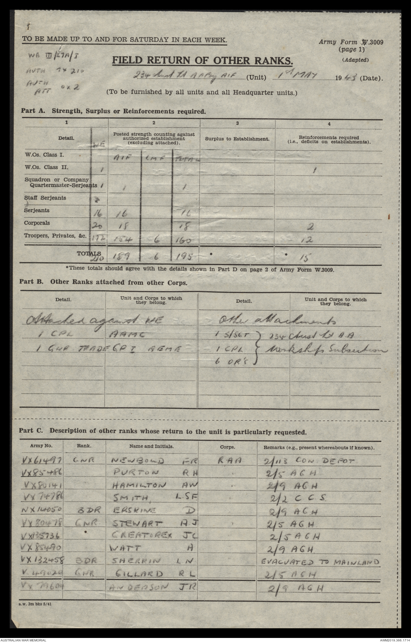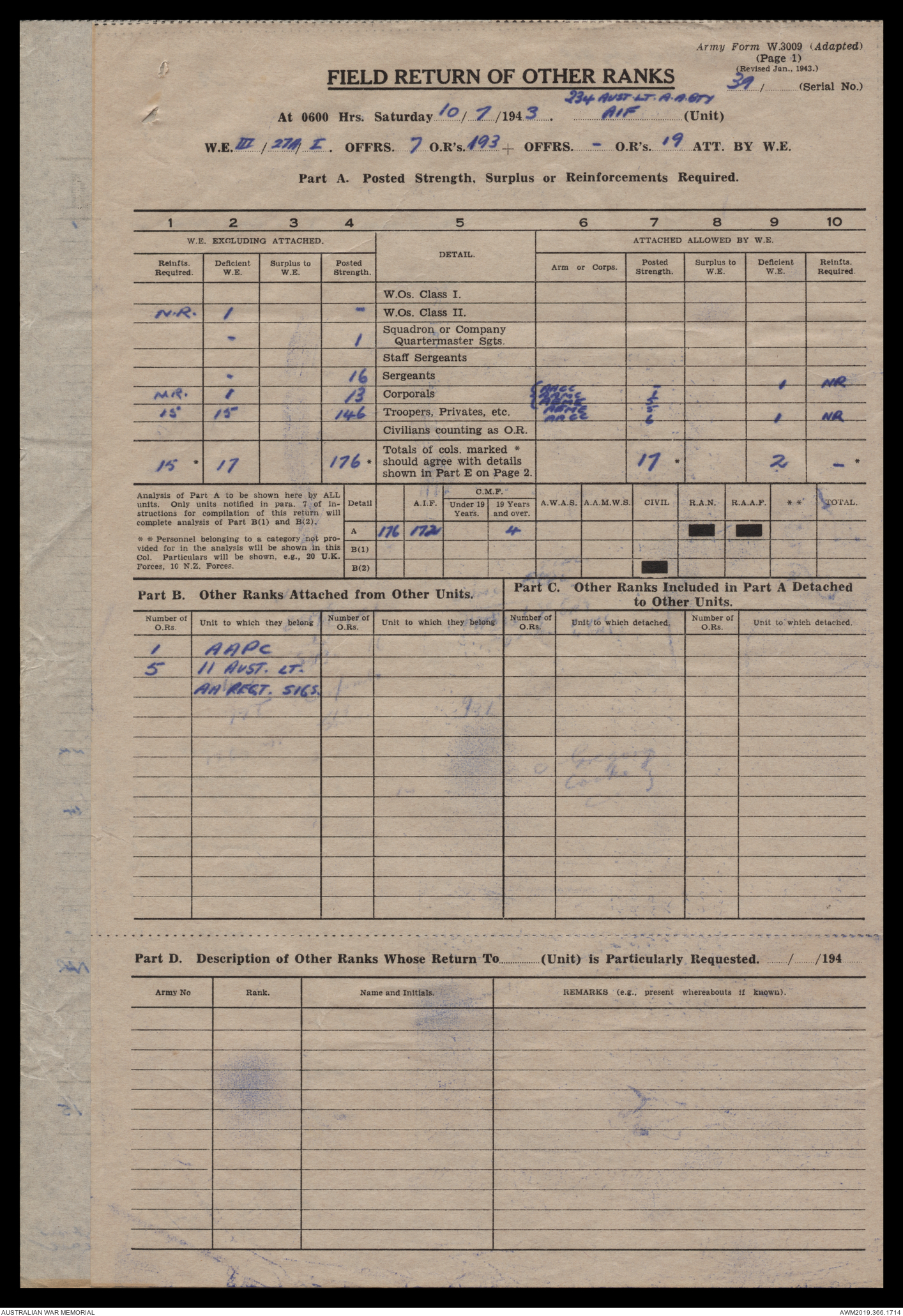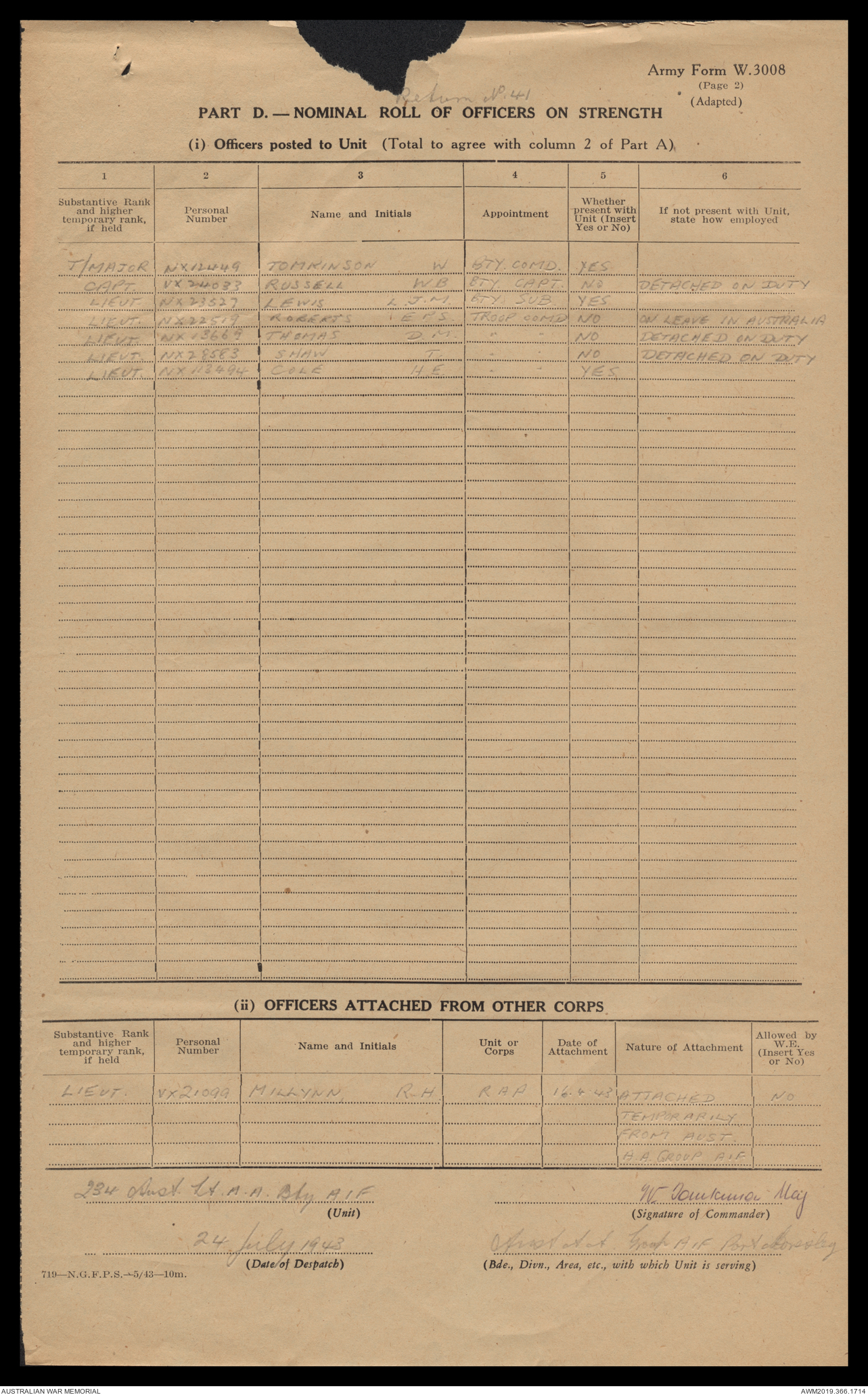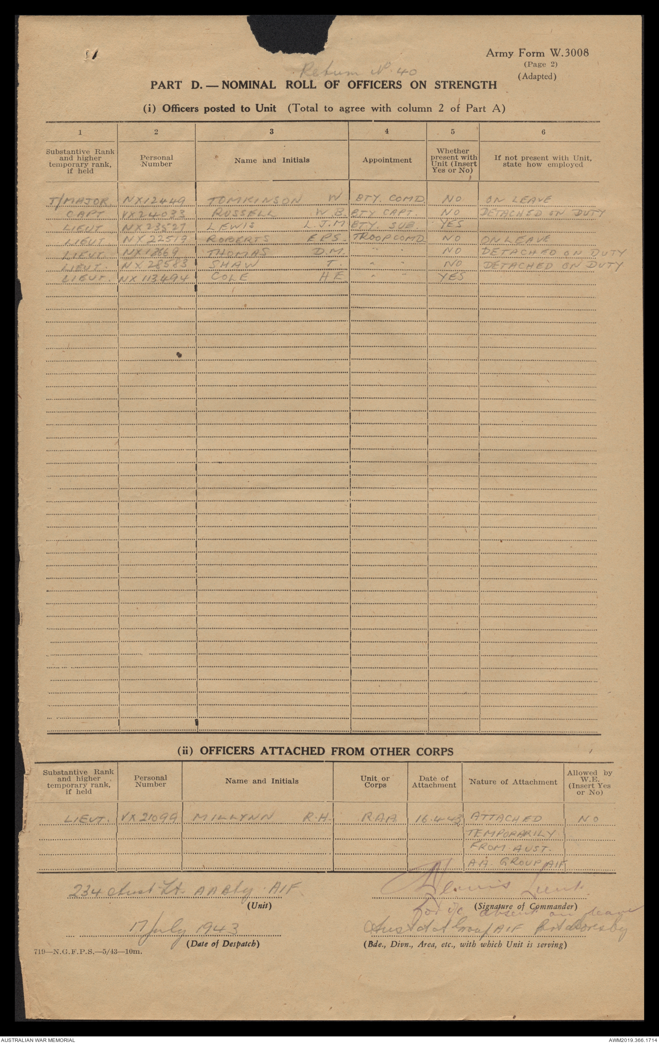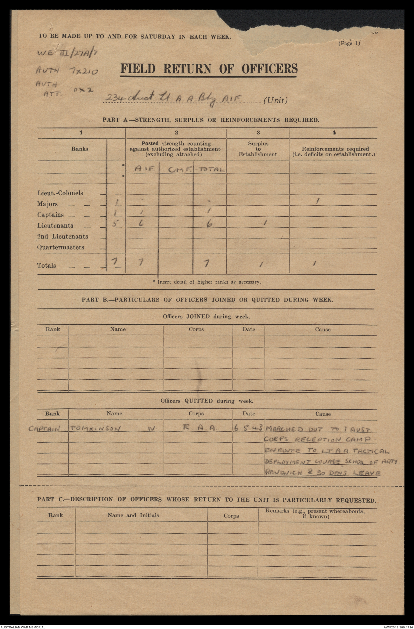 AWM52 4/12/38/2 - [Unit War Diaries, 1939-45 War] 234 Australian Light Anti-Aircraft Battery AIF, May - August 1943