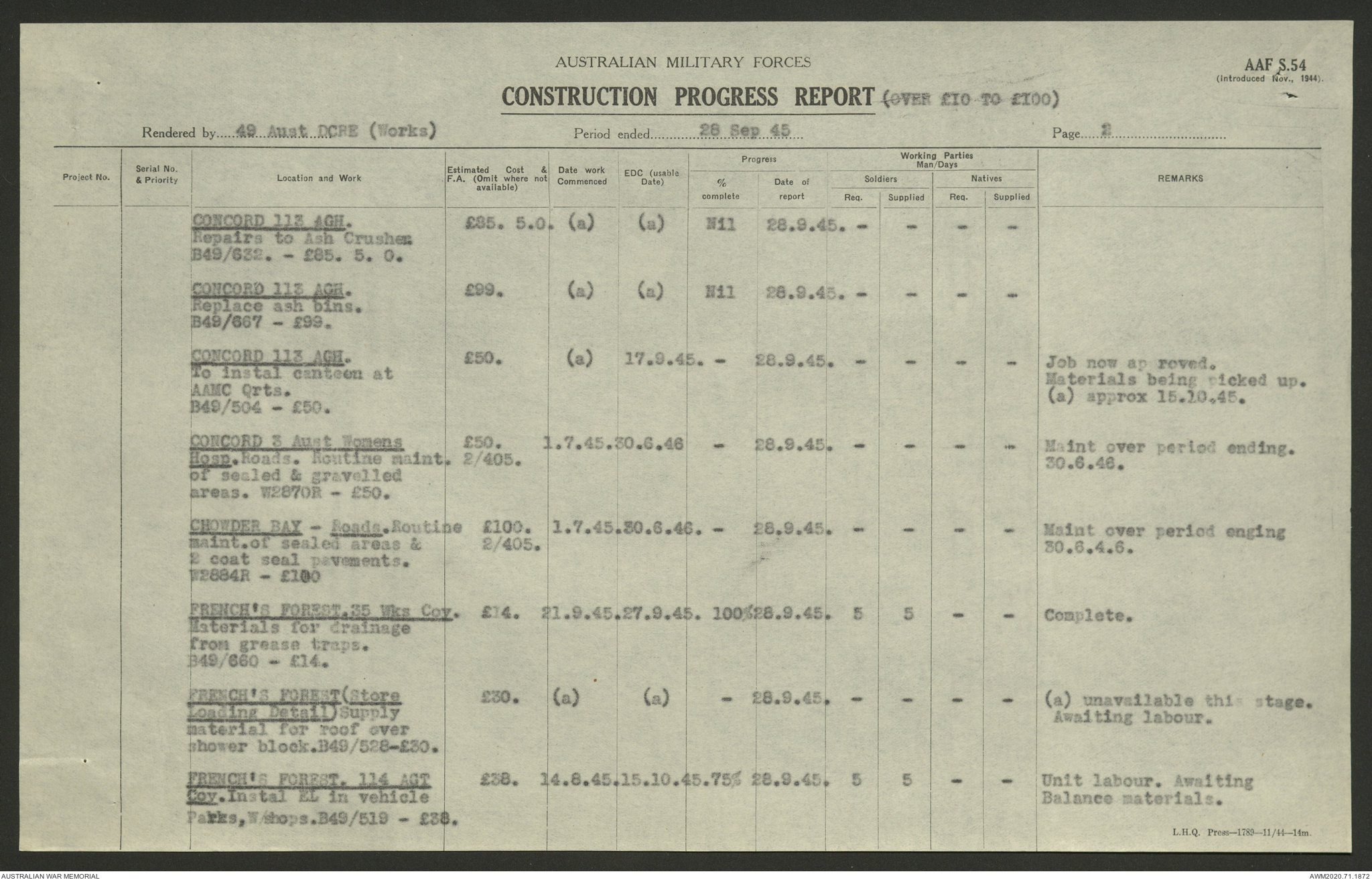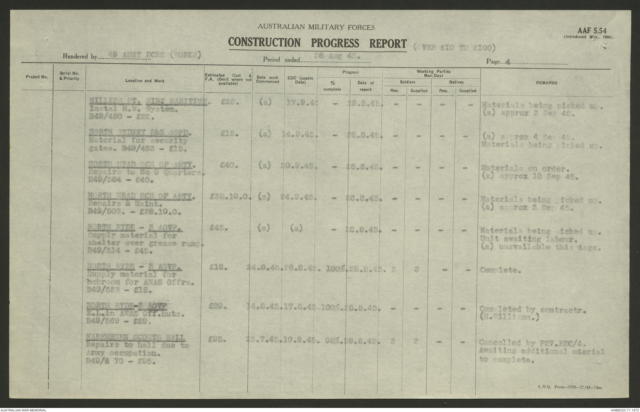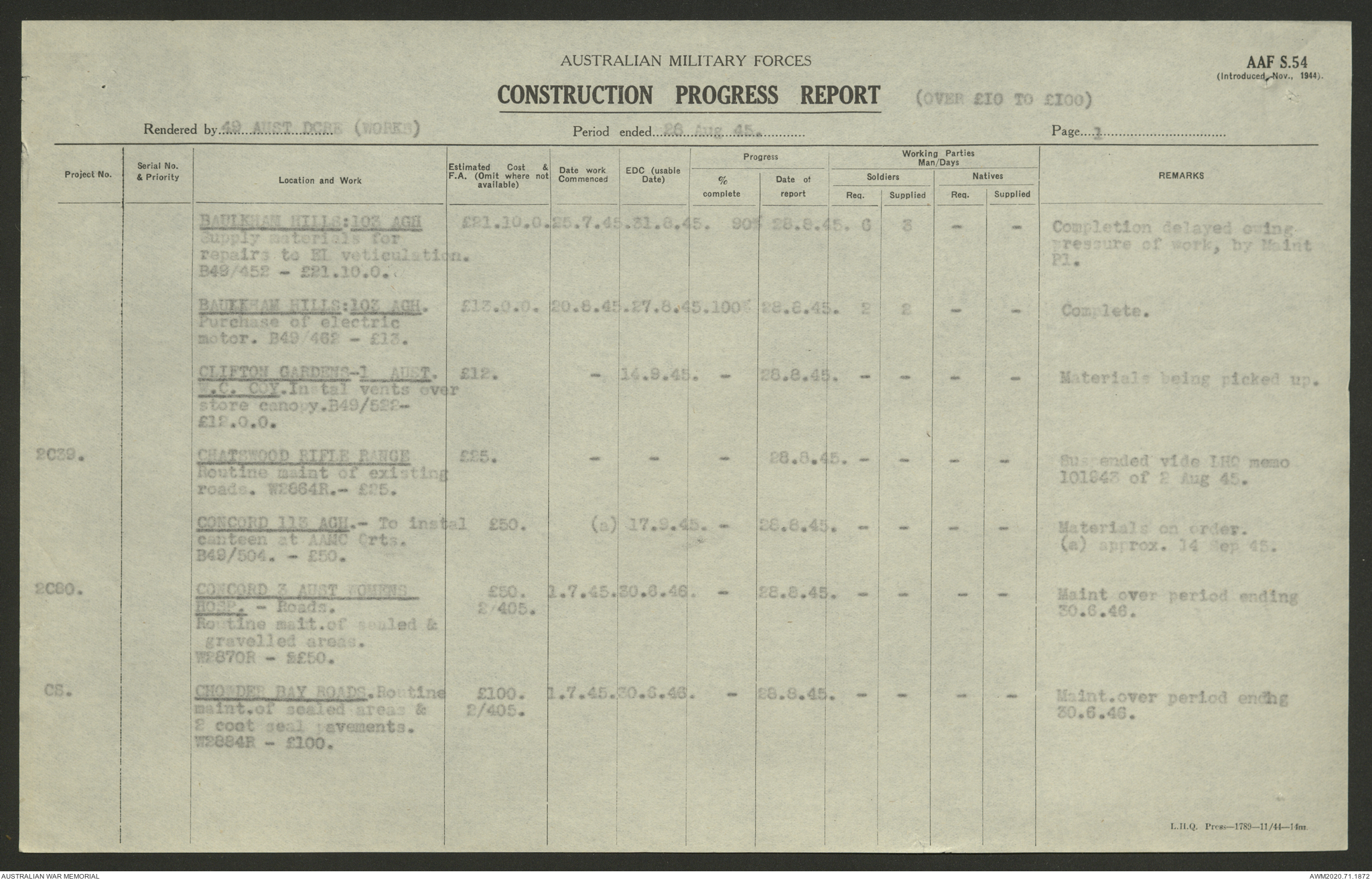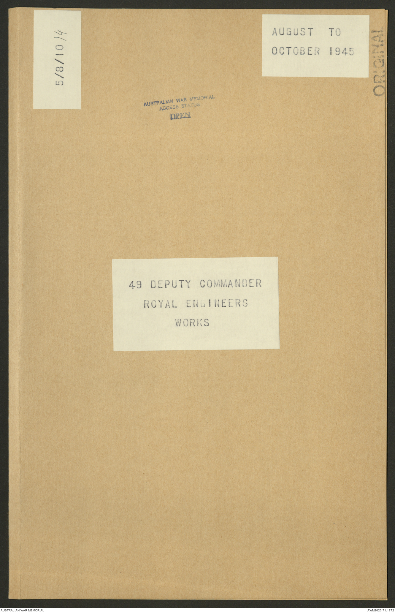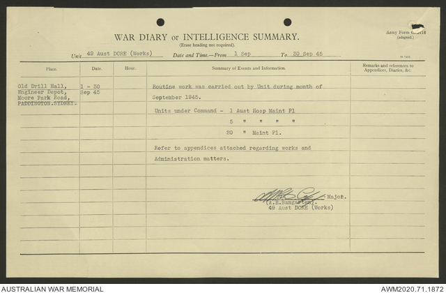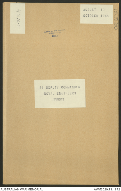 AWM52 5/8/10/4 - [Unit War Diaries, 1939-1945 War] 49 Australian DCRE [Deputy Commander Royal Engineers] Works, August - October 1945