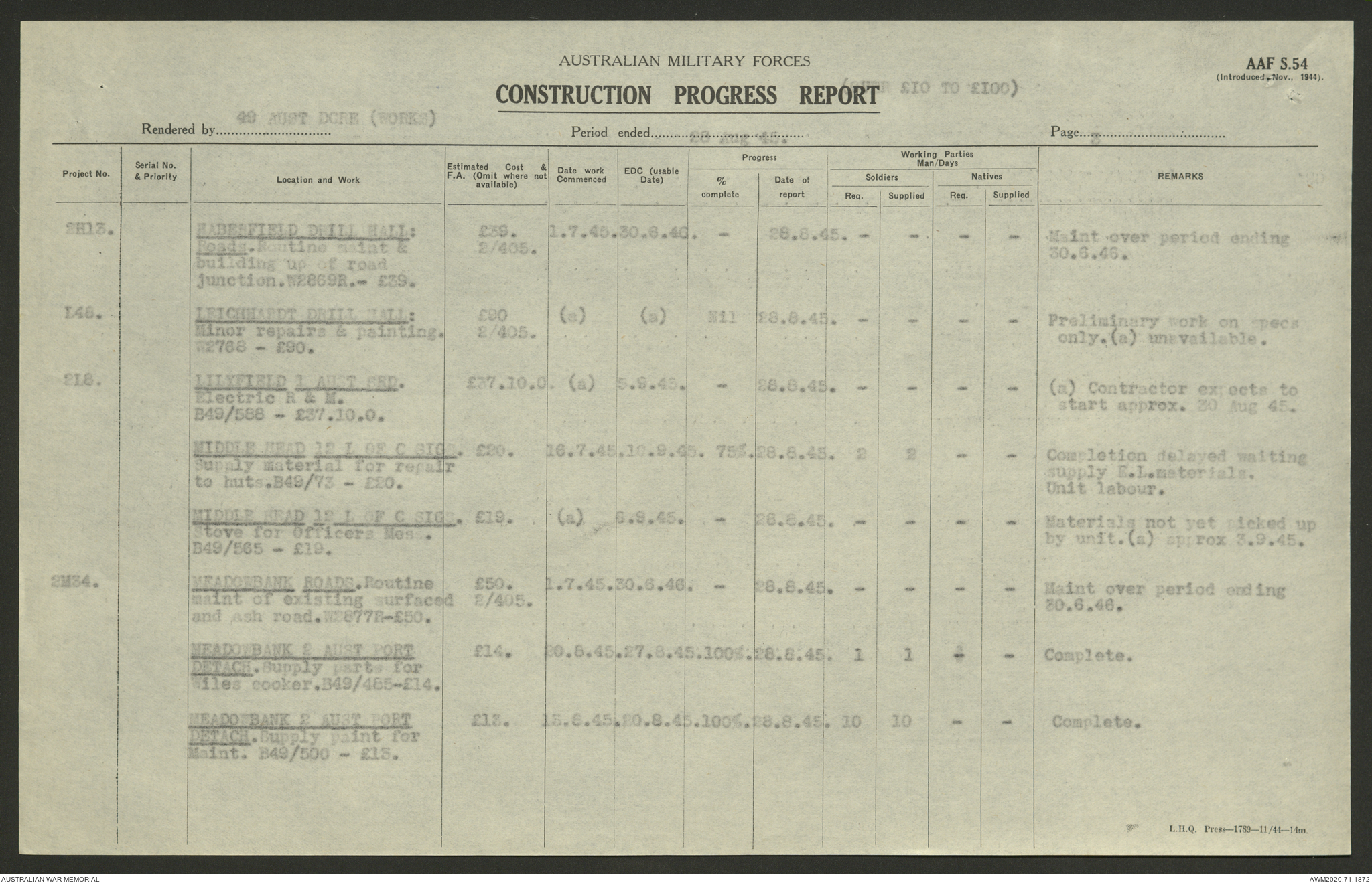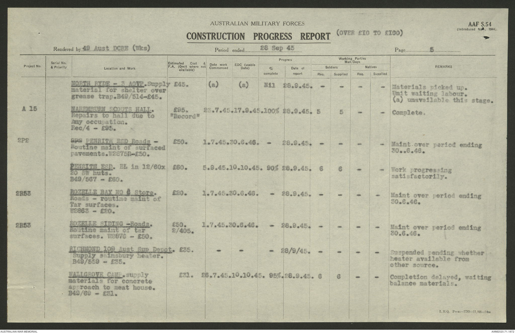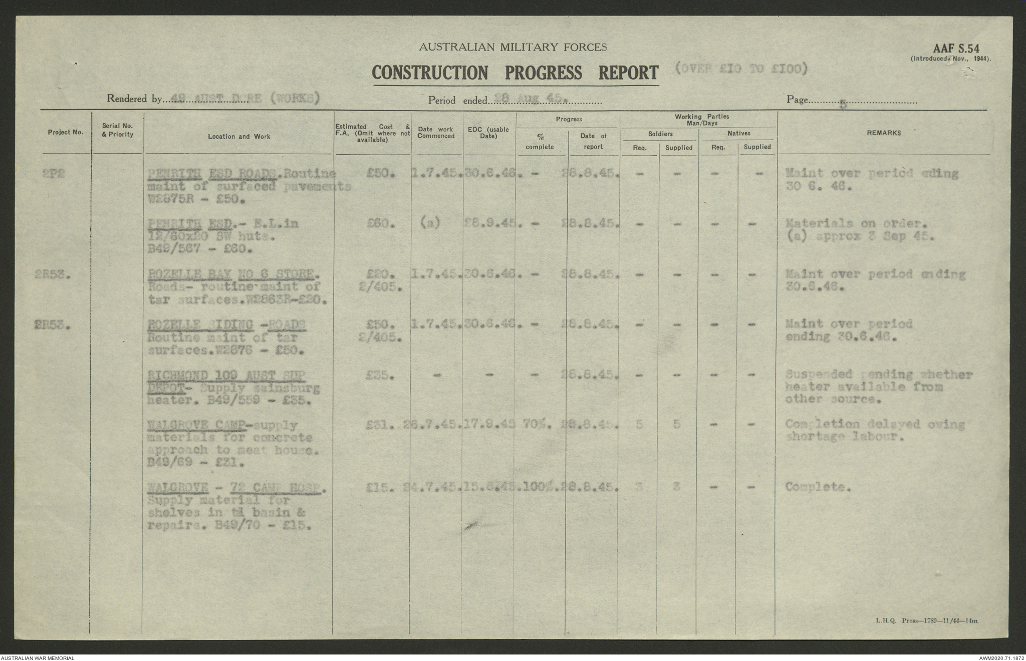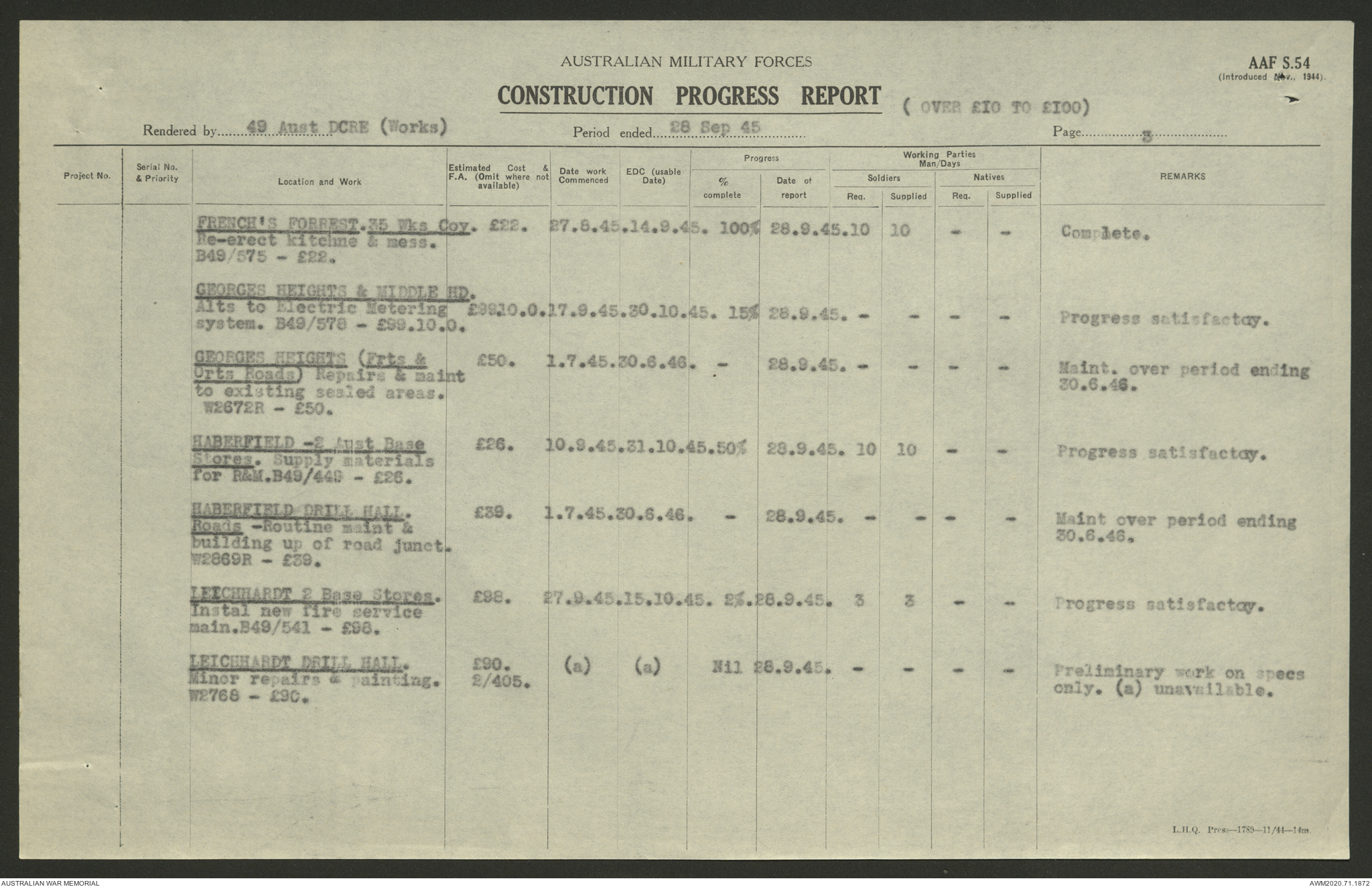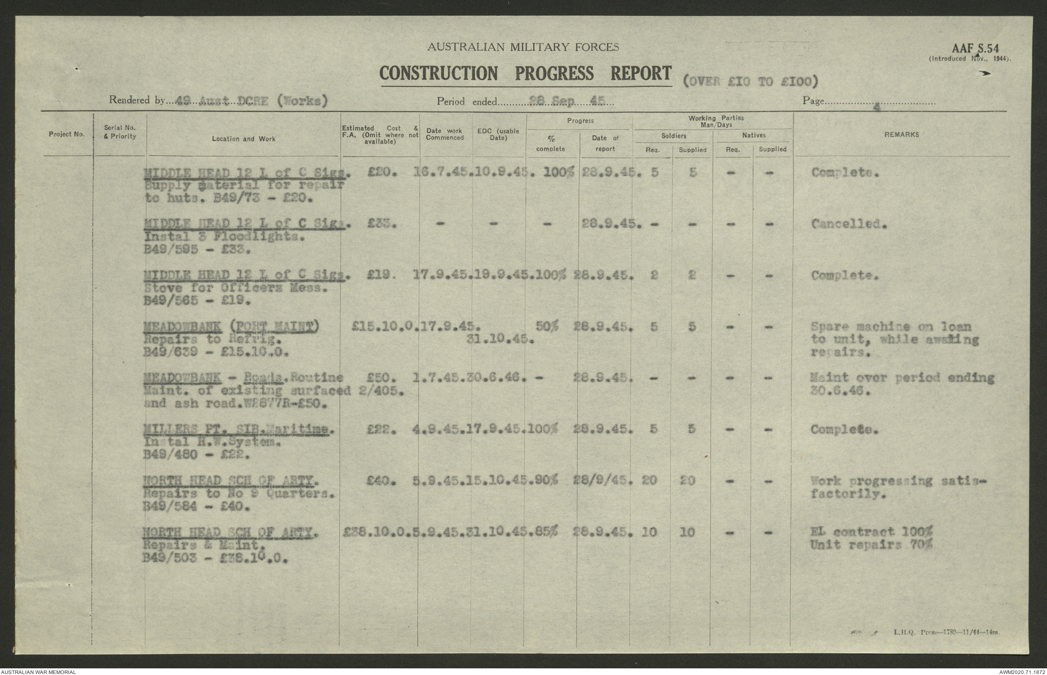 AWM52 5/8/10/4 - [Unit War Diaries, 1939-1945 War] 49 Australian DCRE [Deputy Commander Royal Engineers] Works, August - October 1945
