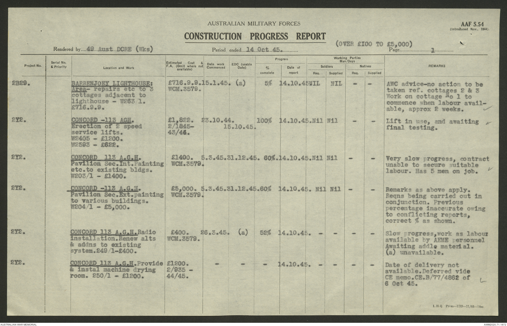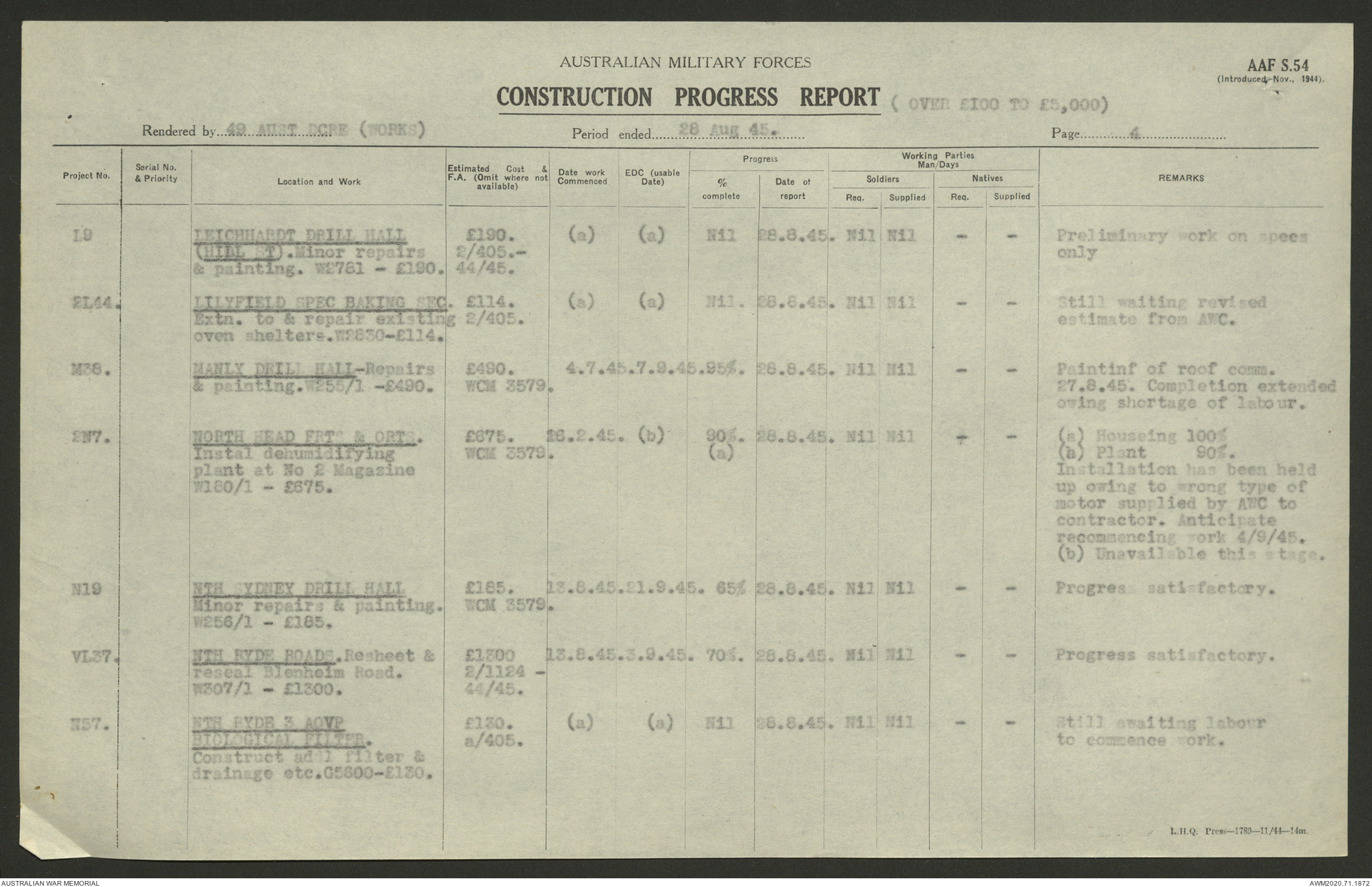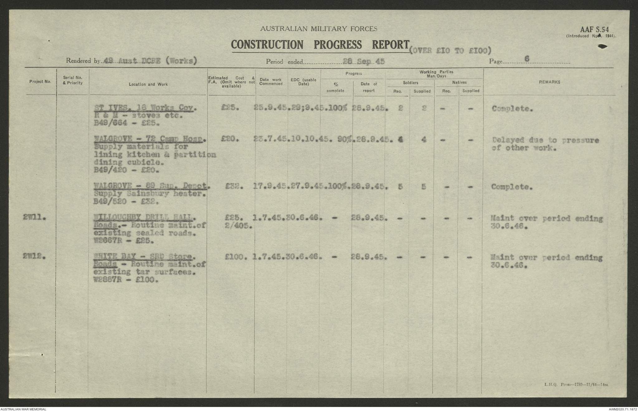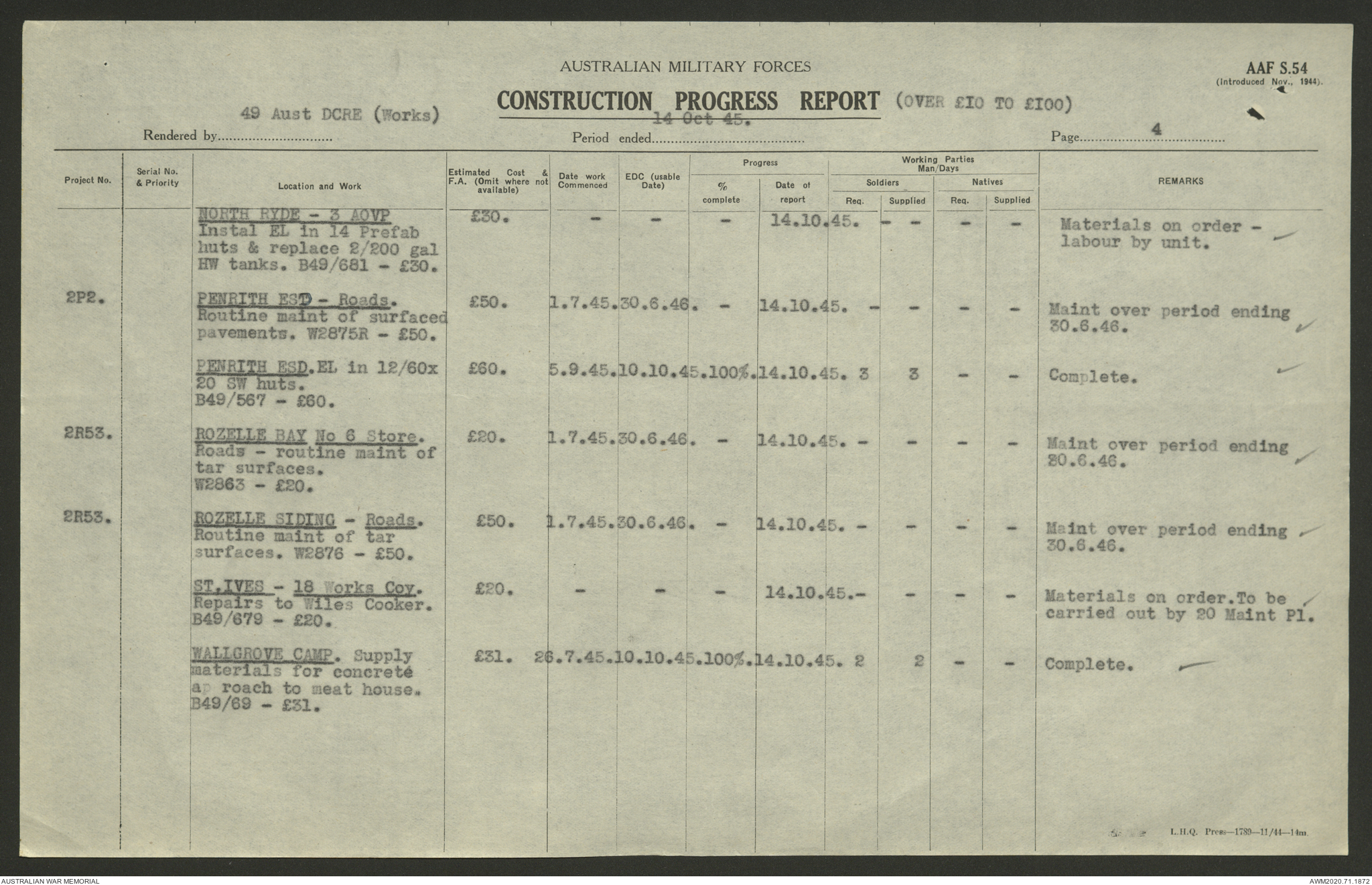 AWM52 5/8/10/4 - [Unit War Diaries, 1939-1945 War] 49 Australian DCRE [Deputy Commander Royal Engineers] Works, August - October 1945