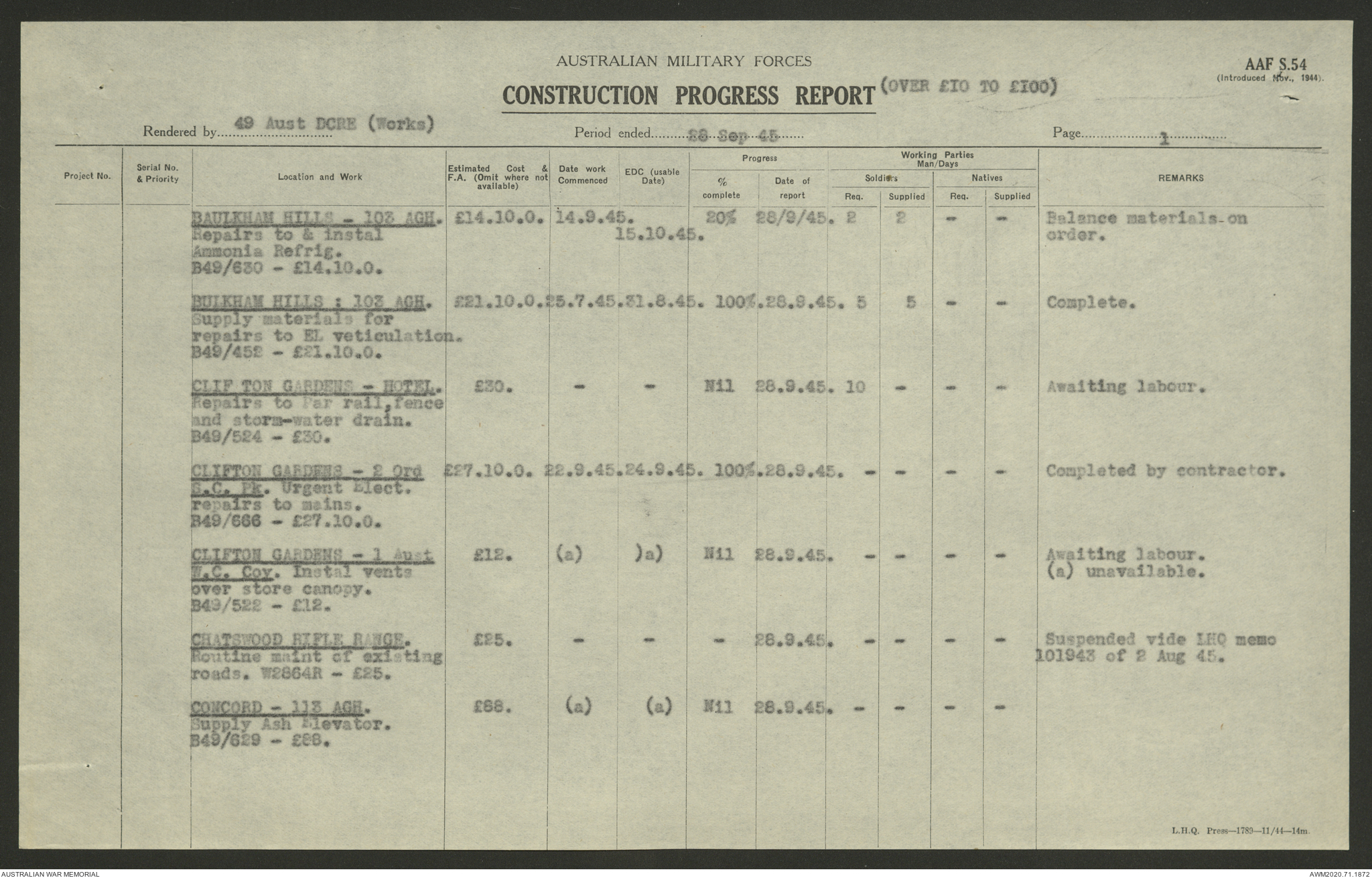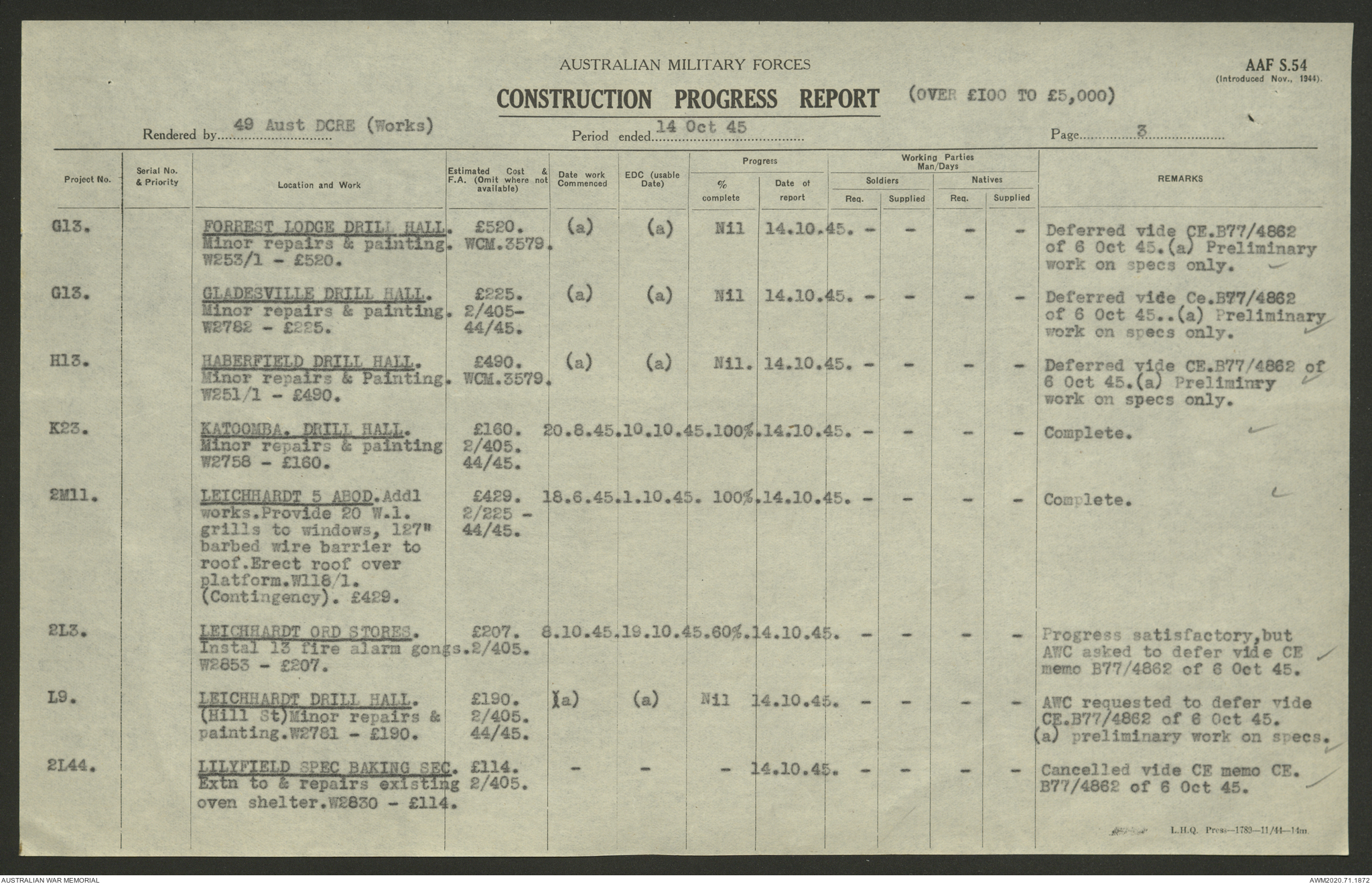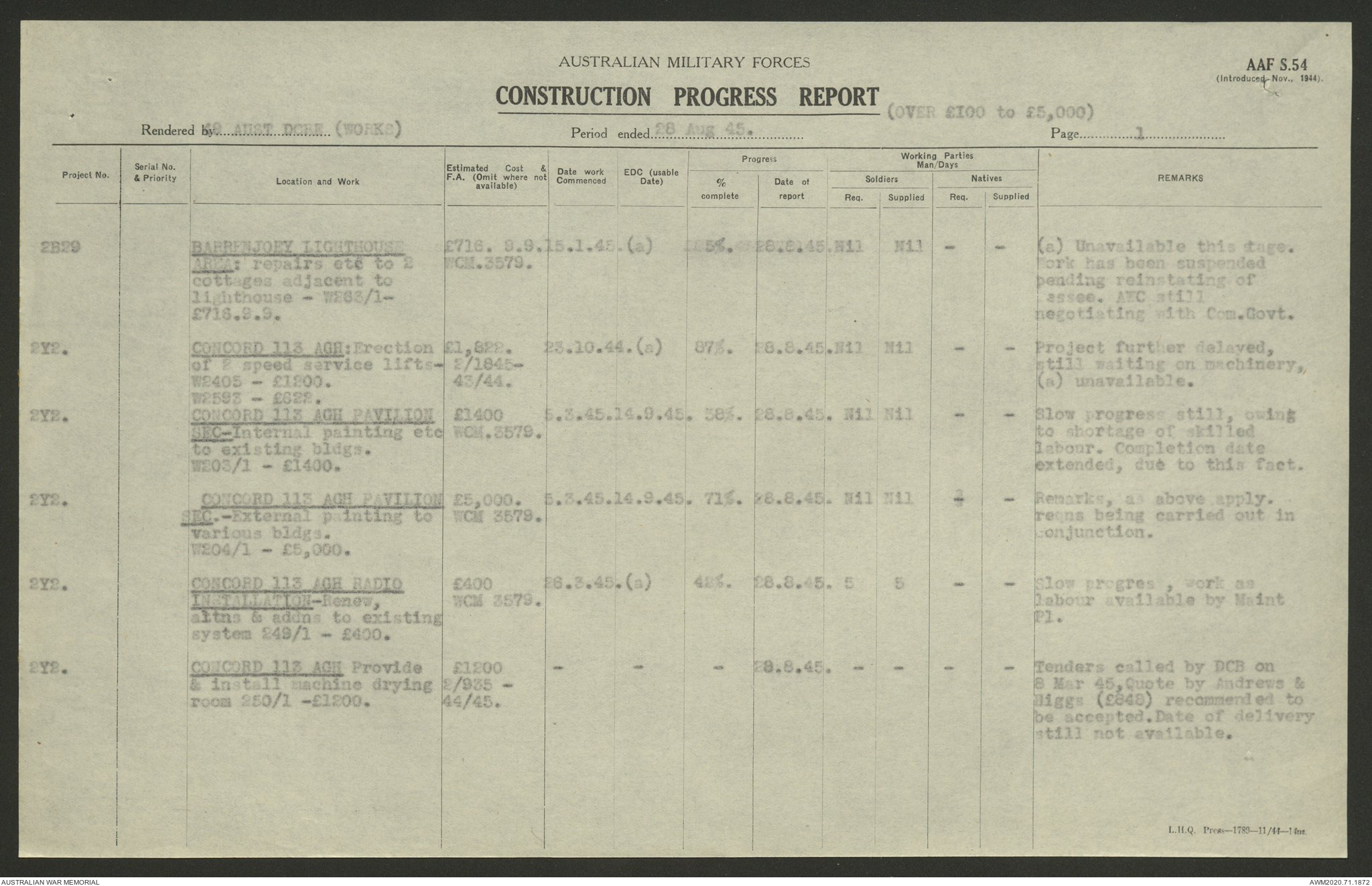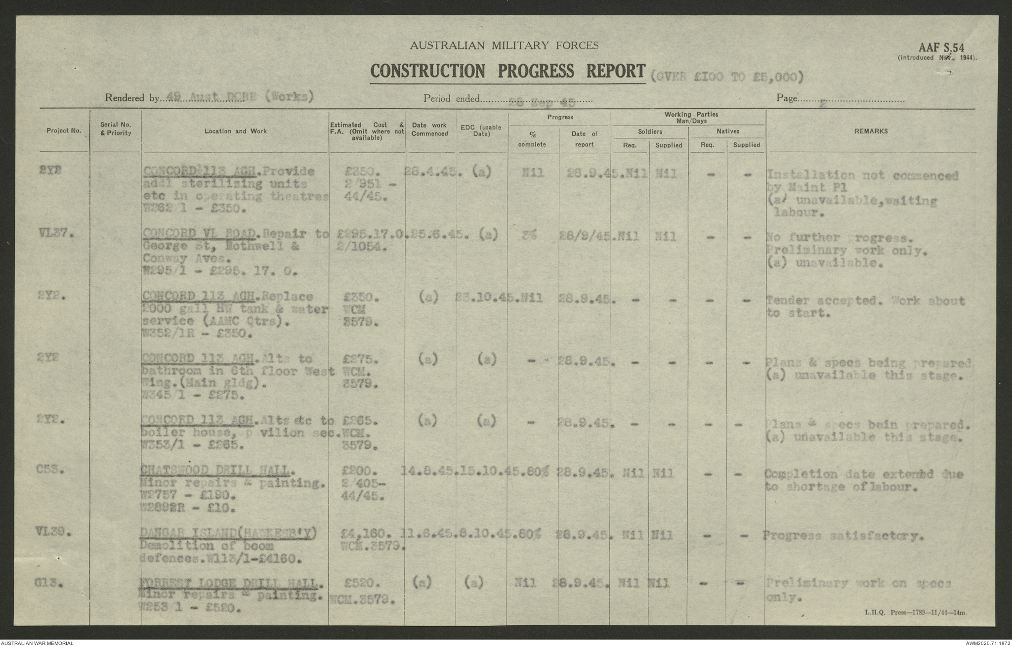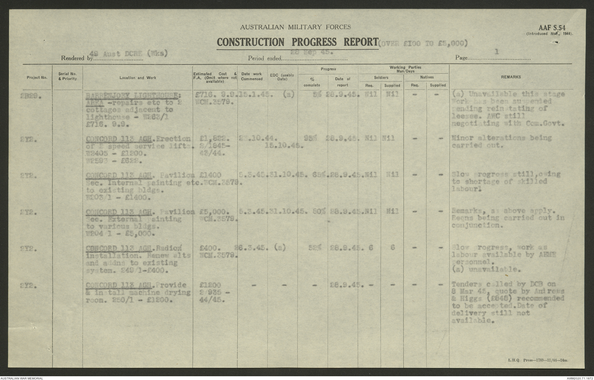 AWM52 5/8/10/4 - [Unit War Diaries, 1939-1945 War] 49 Australian DCRE [Deputy Commander Royal Engineers] Works, August - October 1945