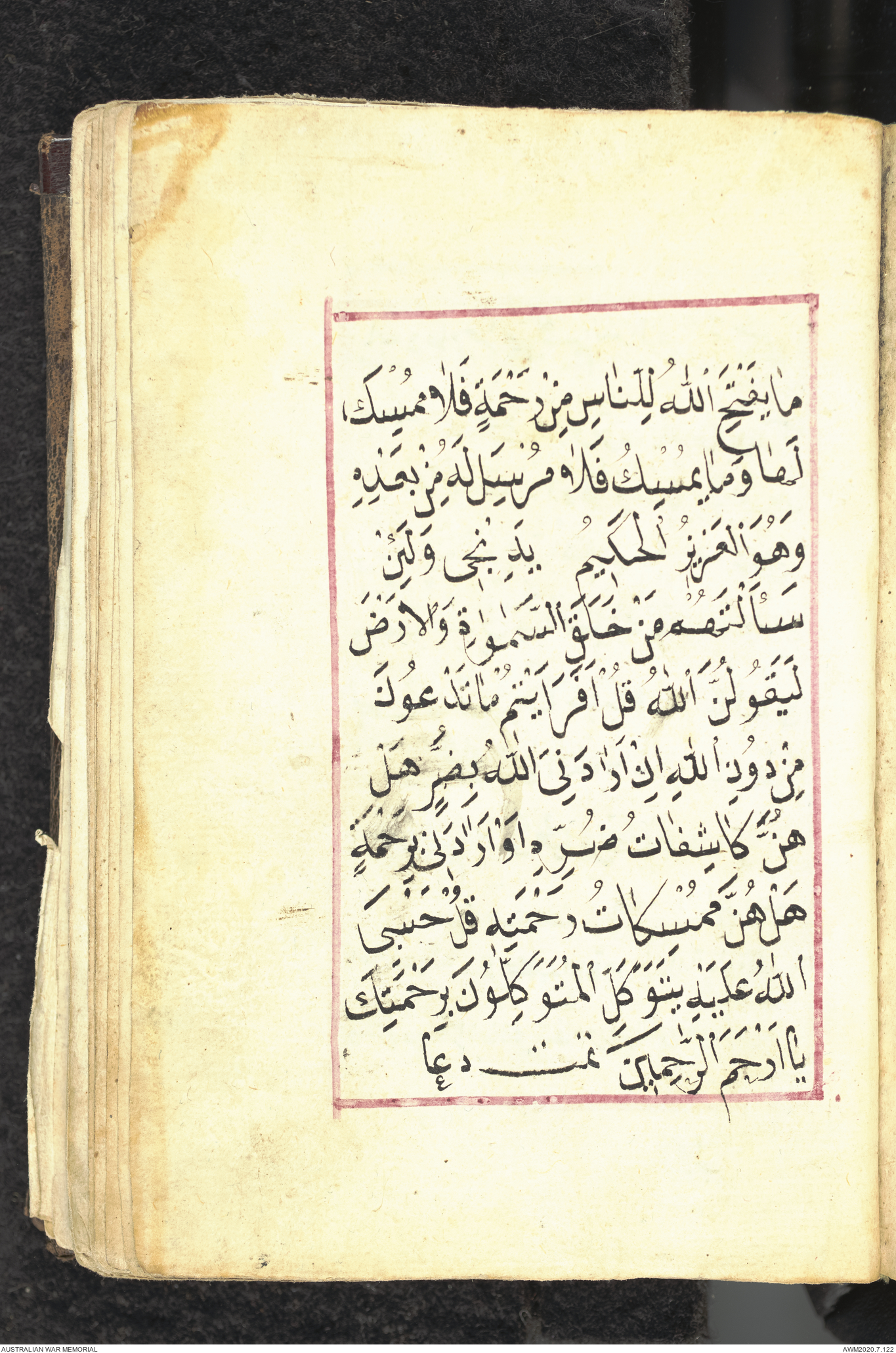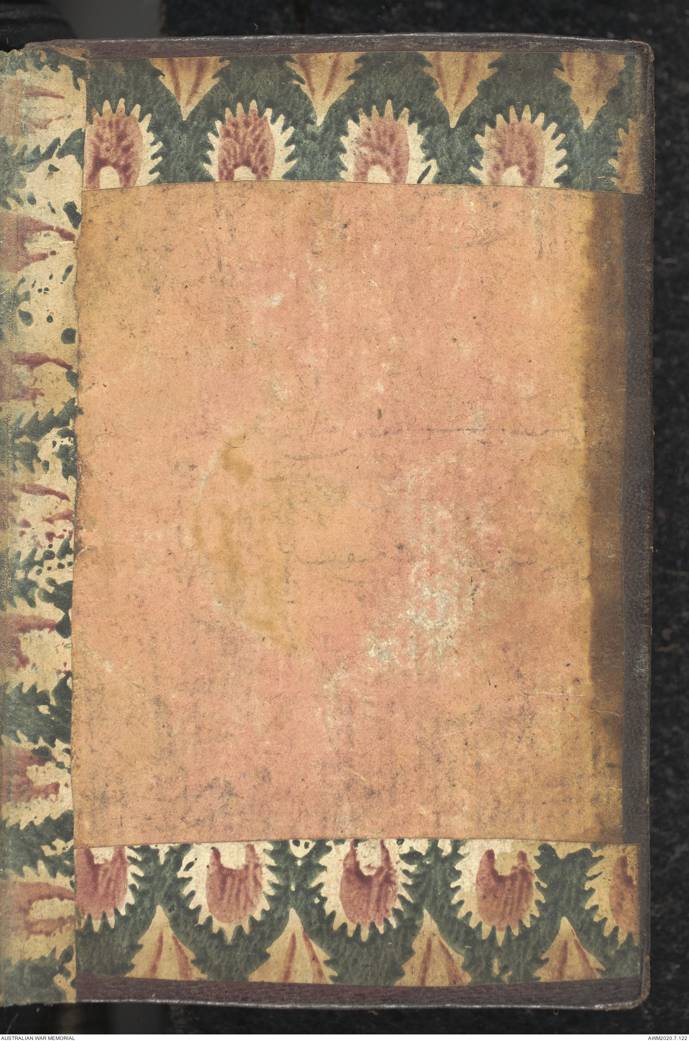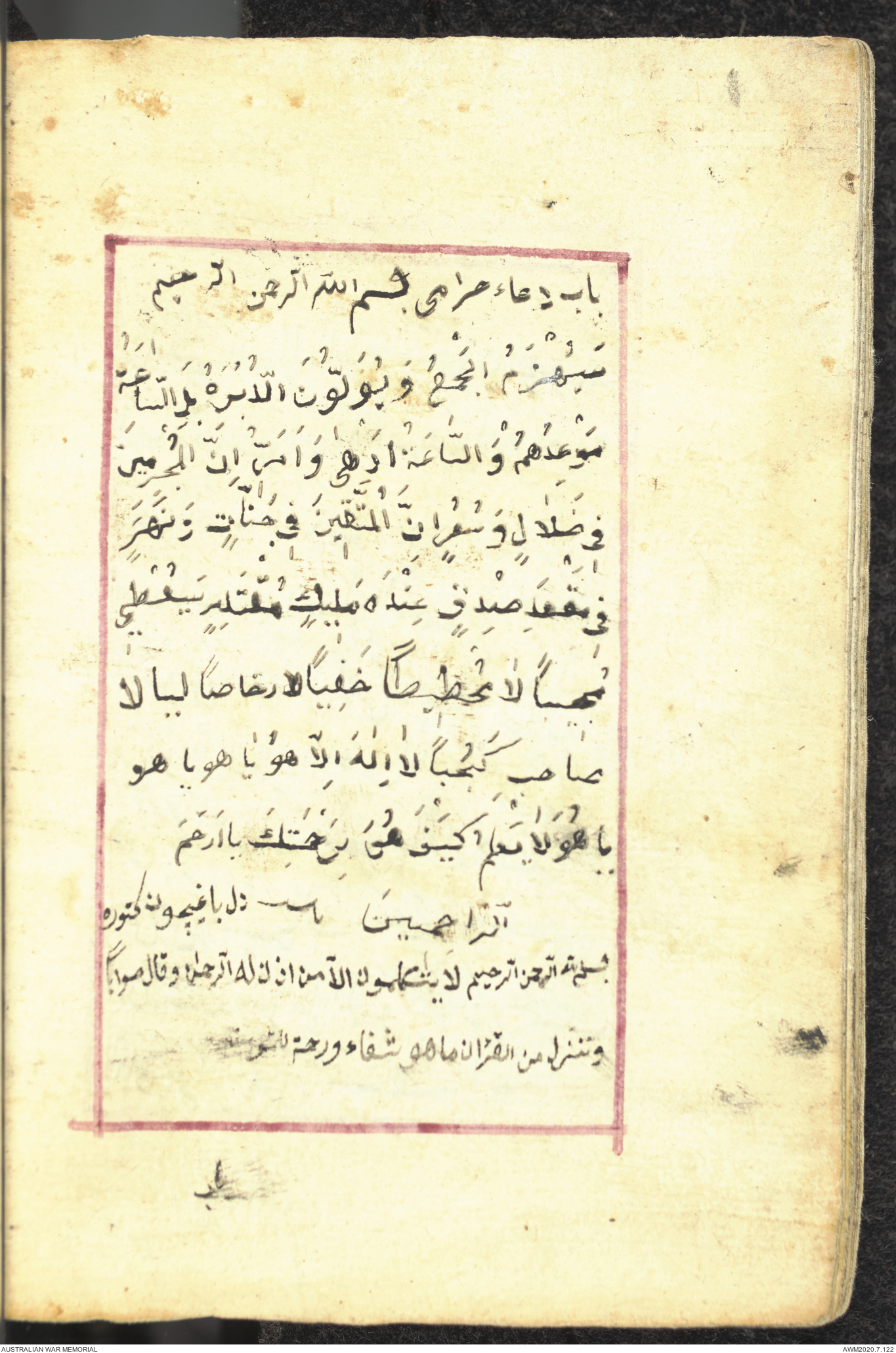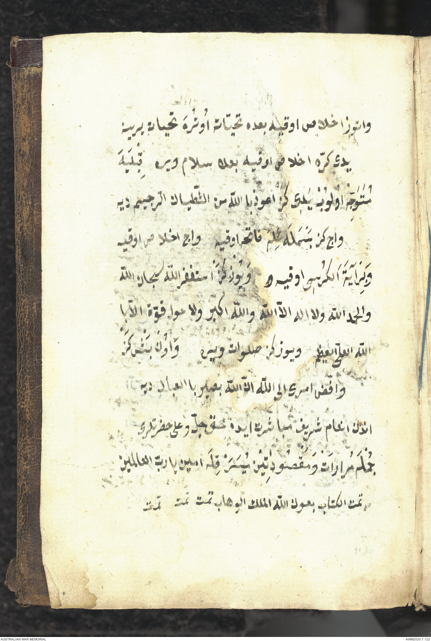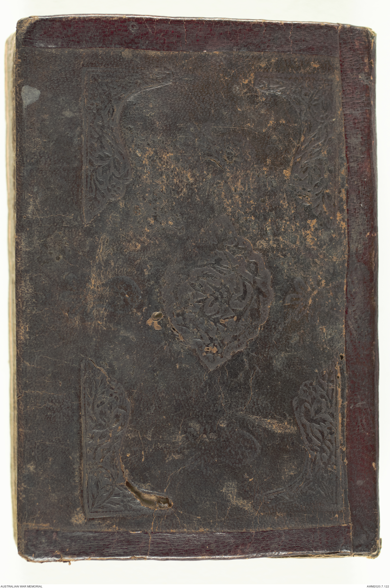 Wallet 1 of 1 - Collection consists of one brown and maroon leather covered Arabic prayer book. The book was collected by Lieutenant Colonel Stanley Holm Watson, who recovered it from the body of a dead Turkish soldier during the 8-hour ceasefire called between Allied and Ottoman Forces on 24 May 1915 in order to recover their dead and wounded from no man's land.