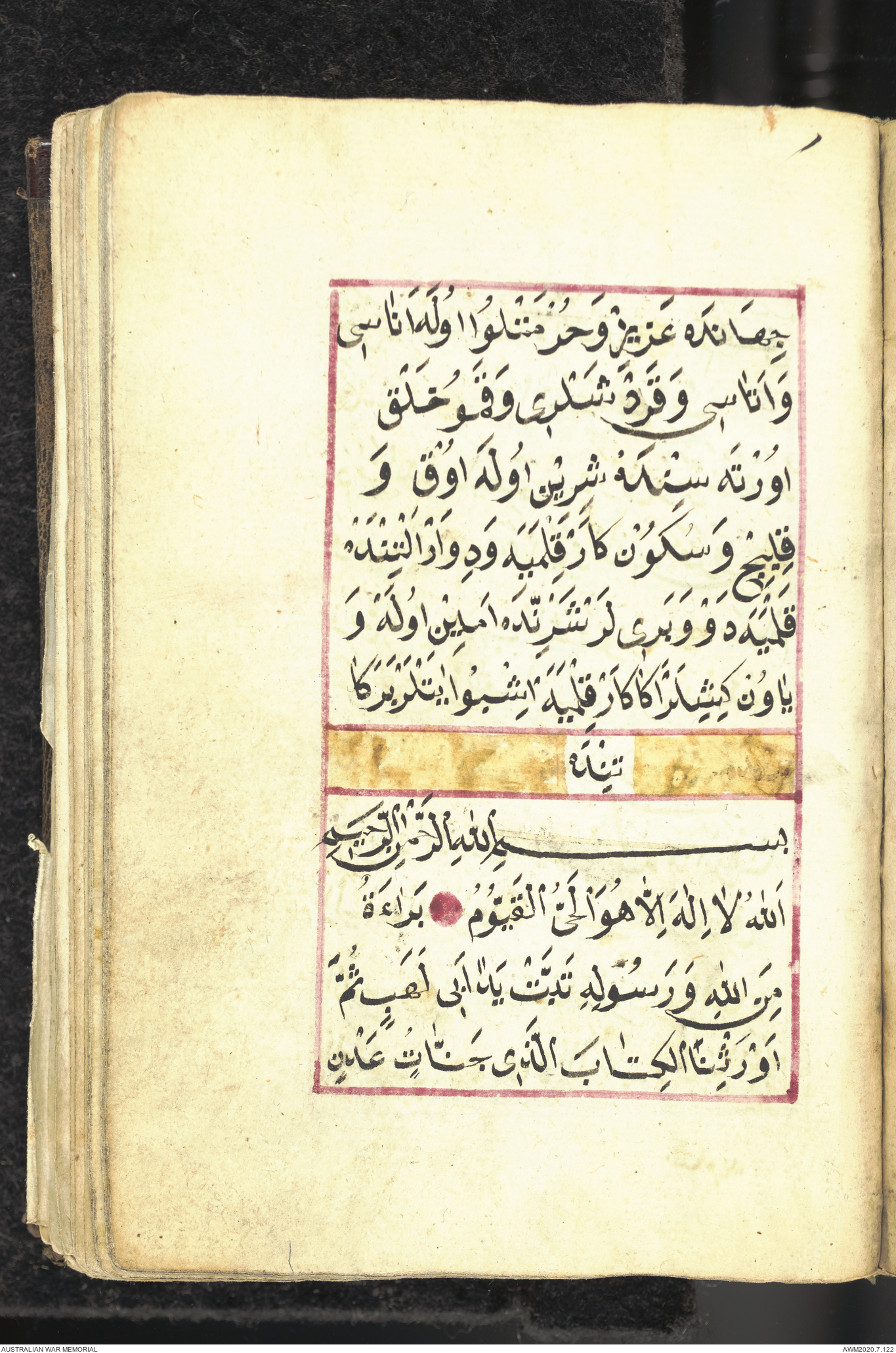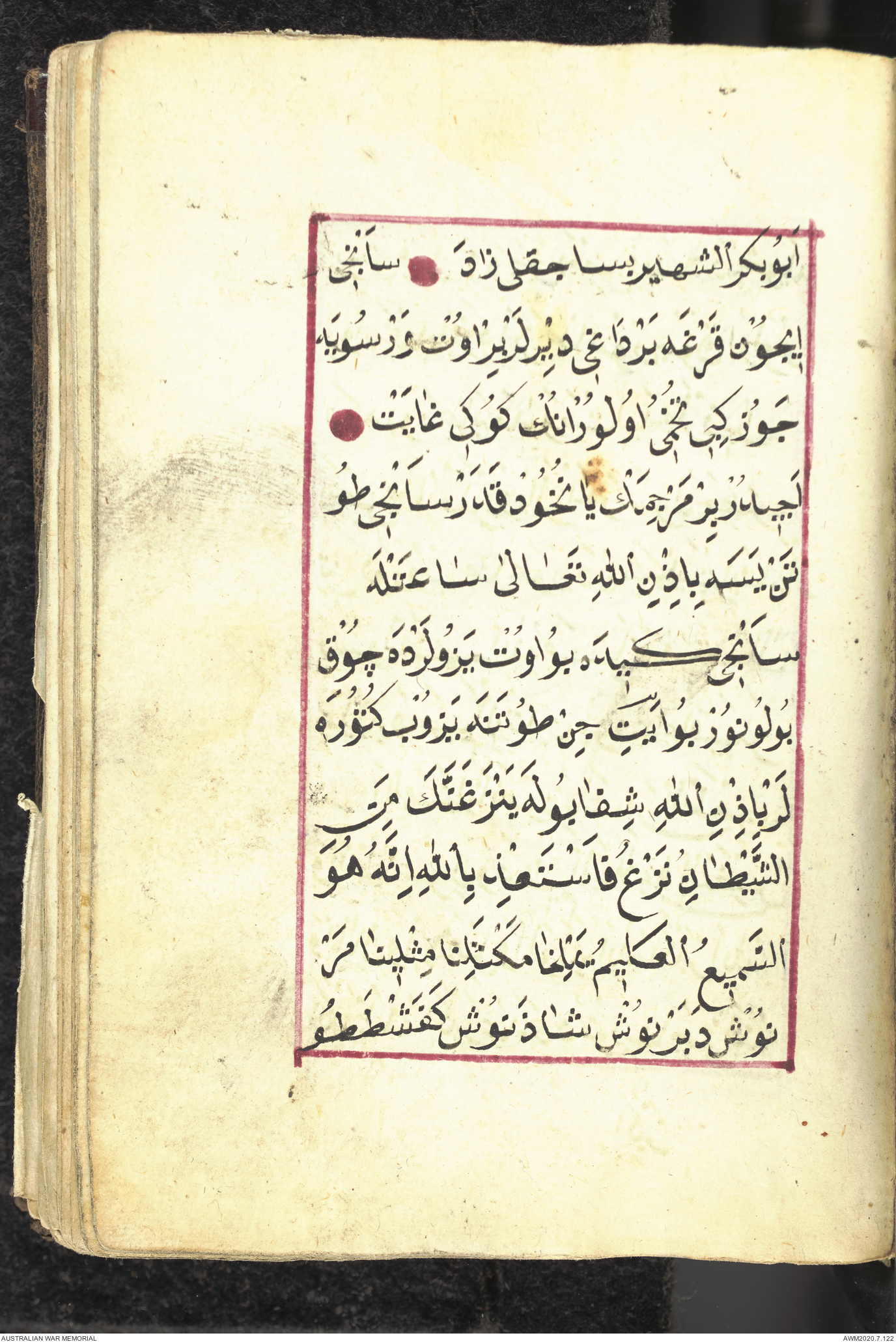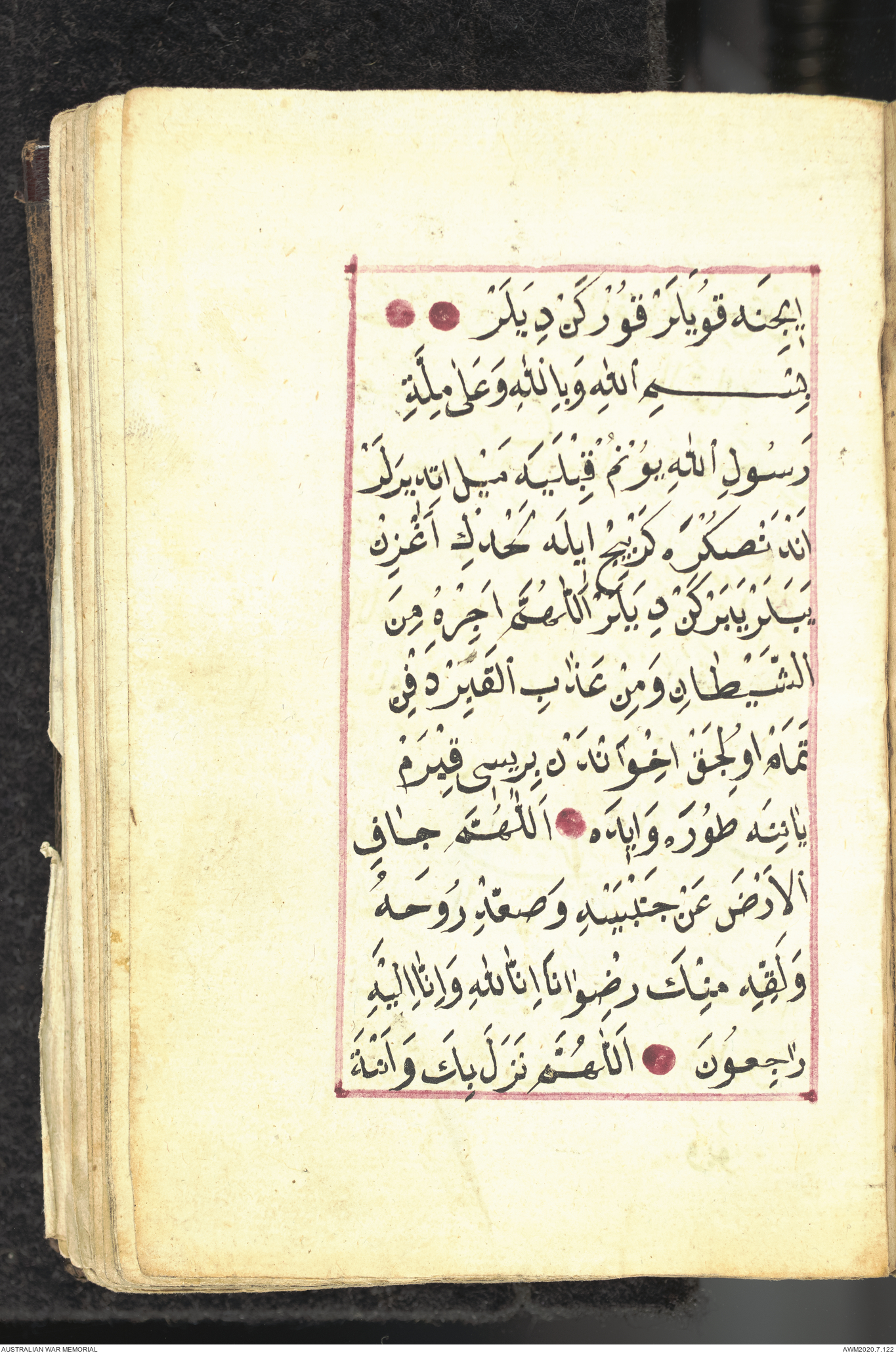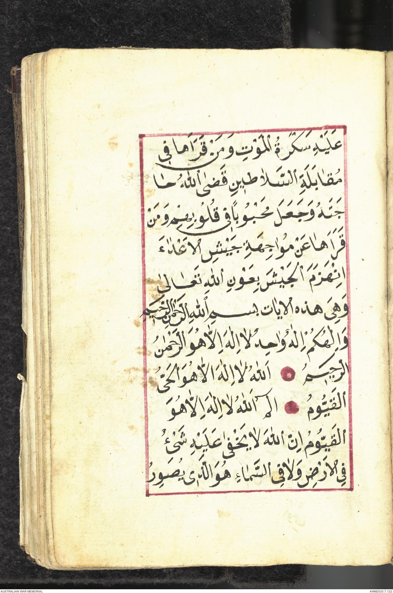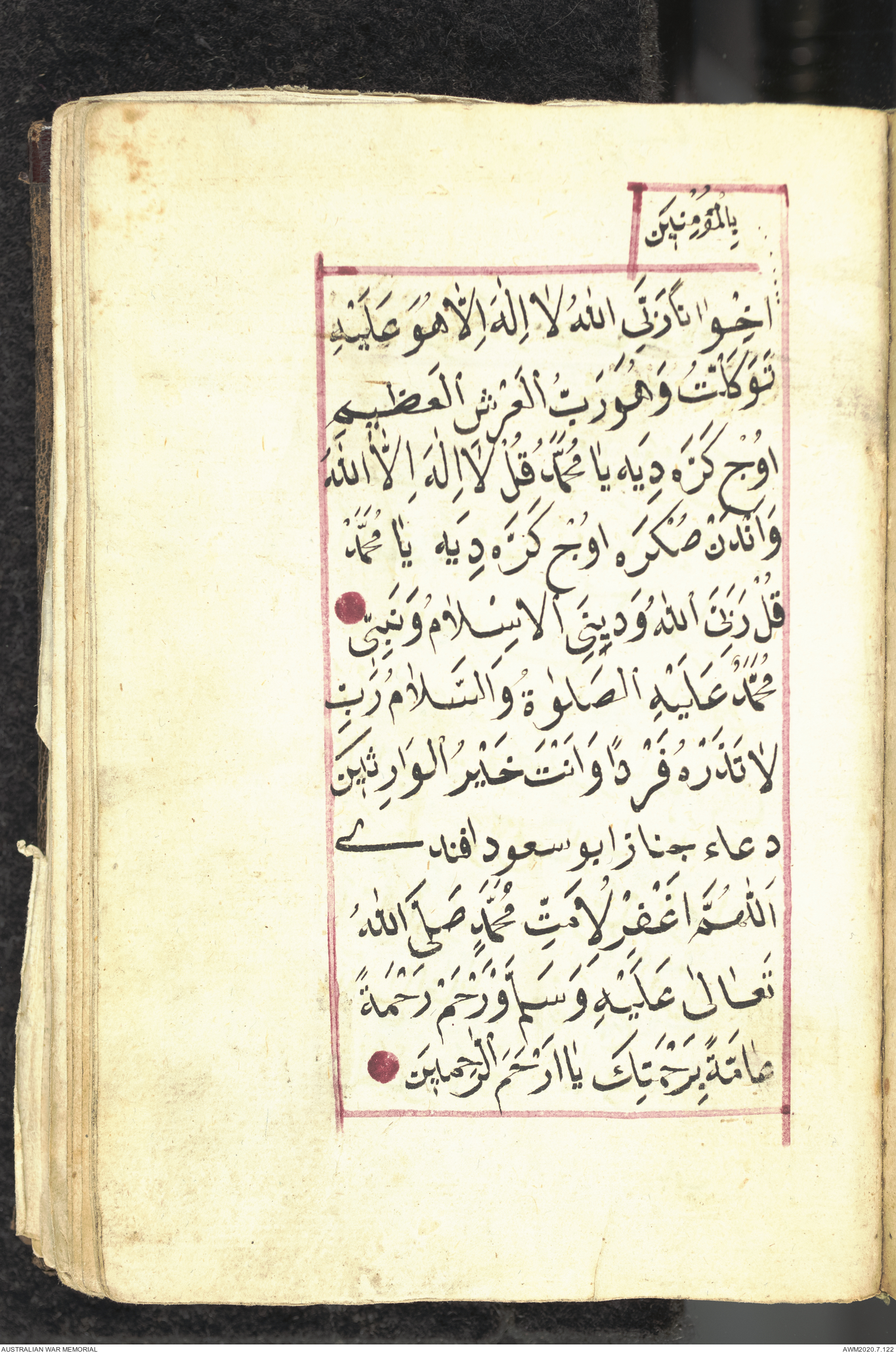 Wallet 1 of 1 - Collection consists of one brown and maroon leather covered Arabic prayer book. The book was collected by Lieutenant Colonel Stanley Holm Watson, who recovered it from the body of a dead Turkish soldier during the 8-hour ceasefire called between Allied and Ottoman Forces on 24 May 1915 in order to recover their dead and wounded from no man's land.