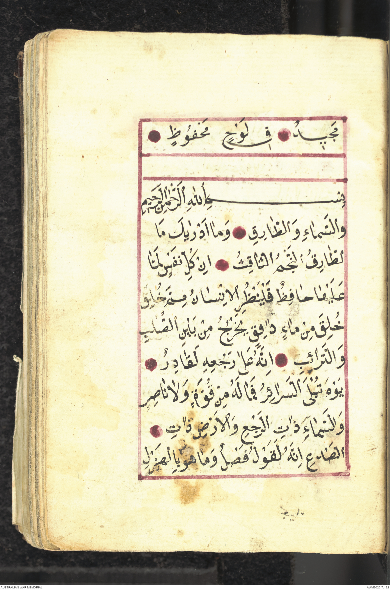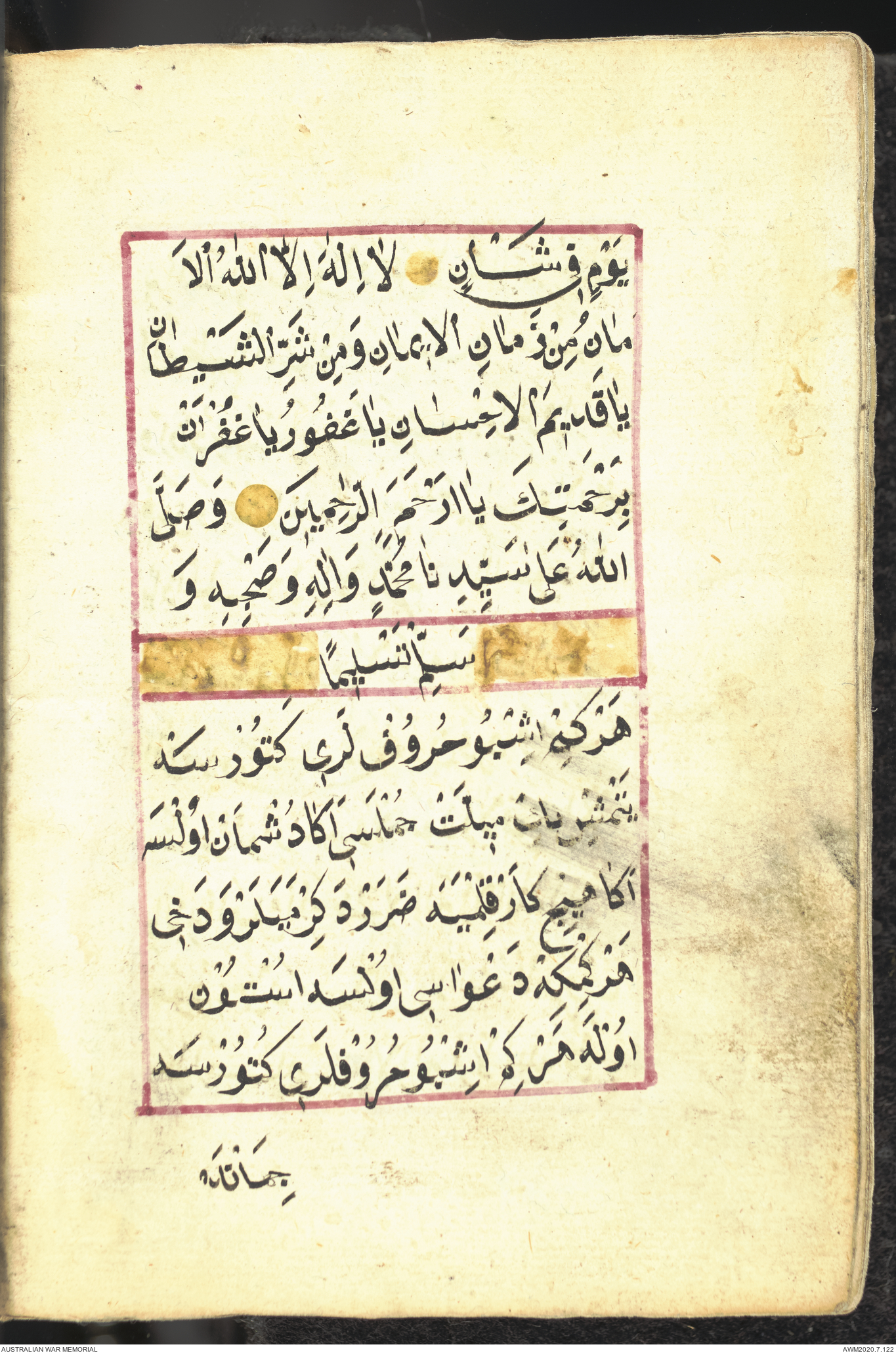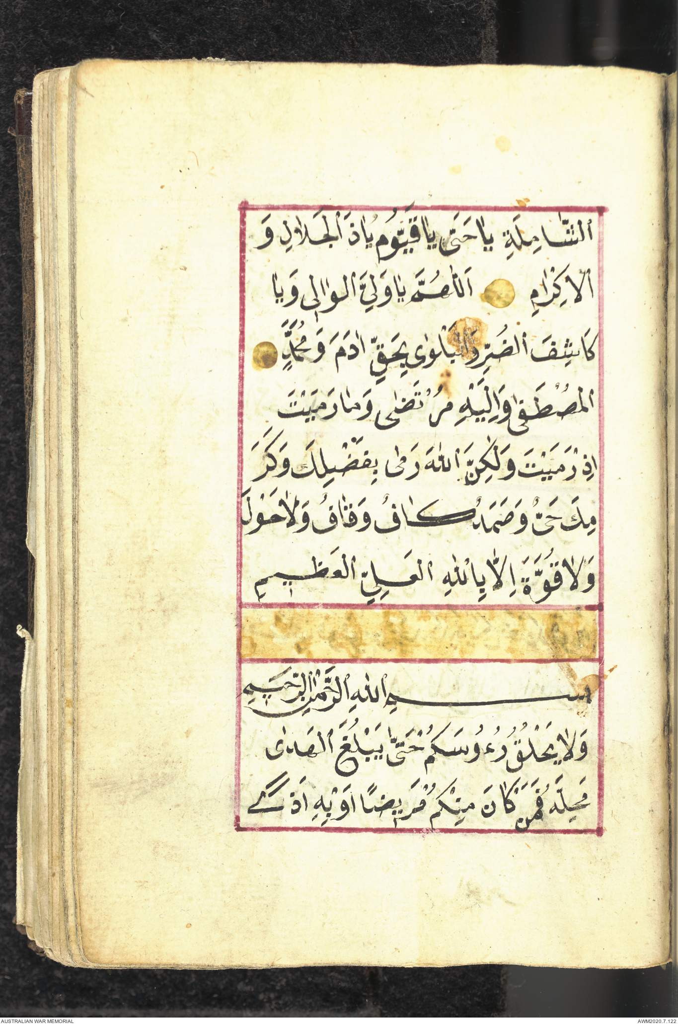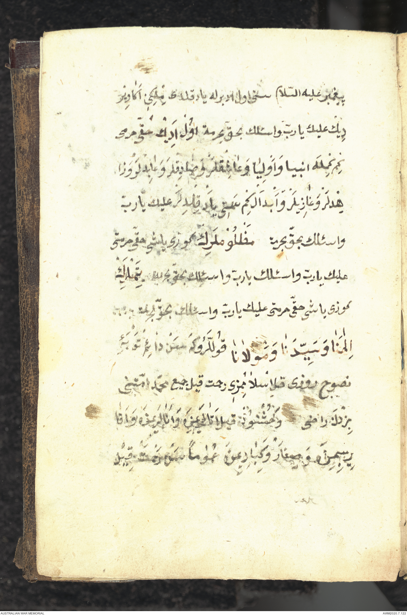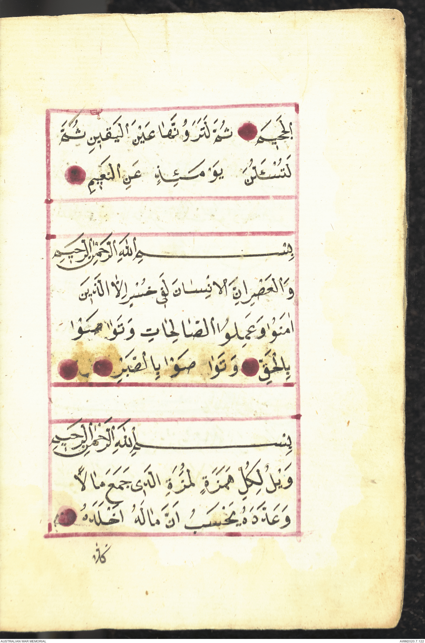 Wallet 1 of 1 - Collection consists of one brown and maroon leather covered Arabic prayer book. The book was collected by Lieutenant Colonel Stanley Holm Watson, who recovered it from the body of a dead Turkish soldier during the 8-hour ceasefire called between Allied and Ottoman Forces on 24 May 1915 in order to recover their dead and wounded from no man's land.