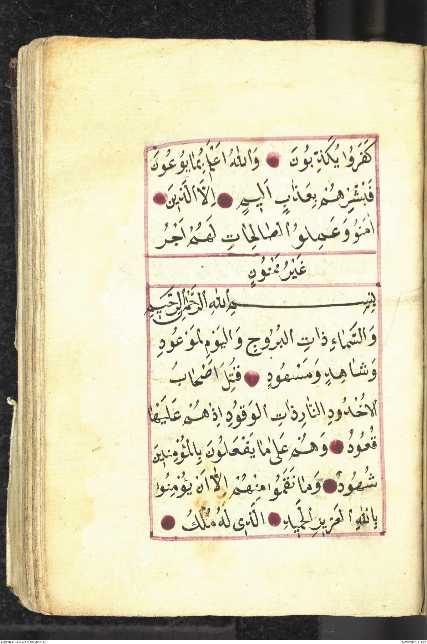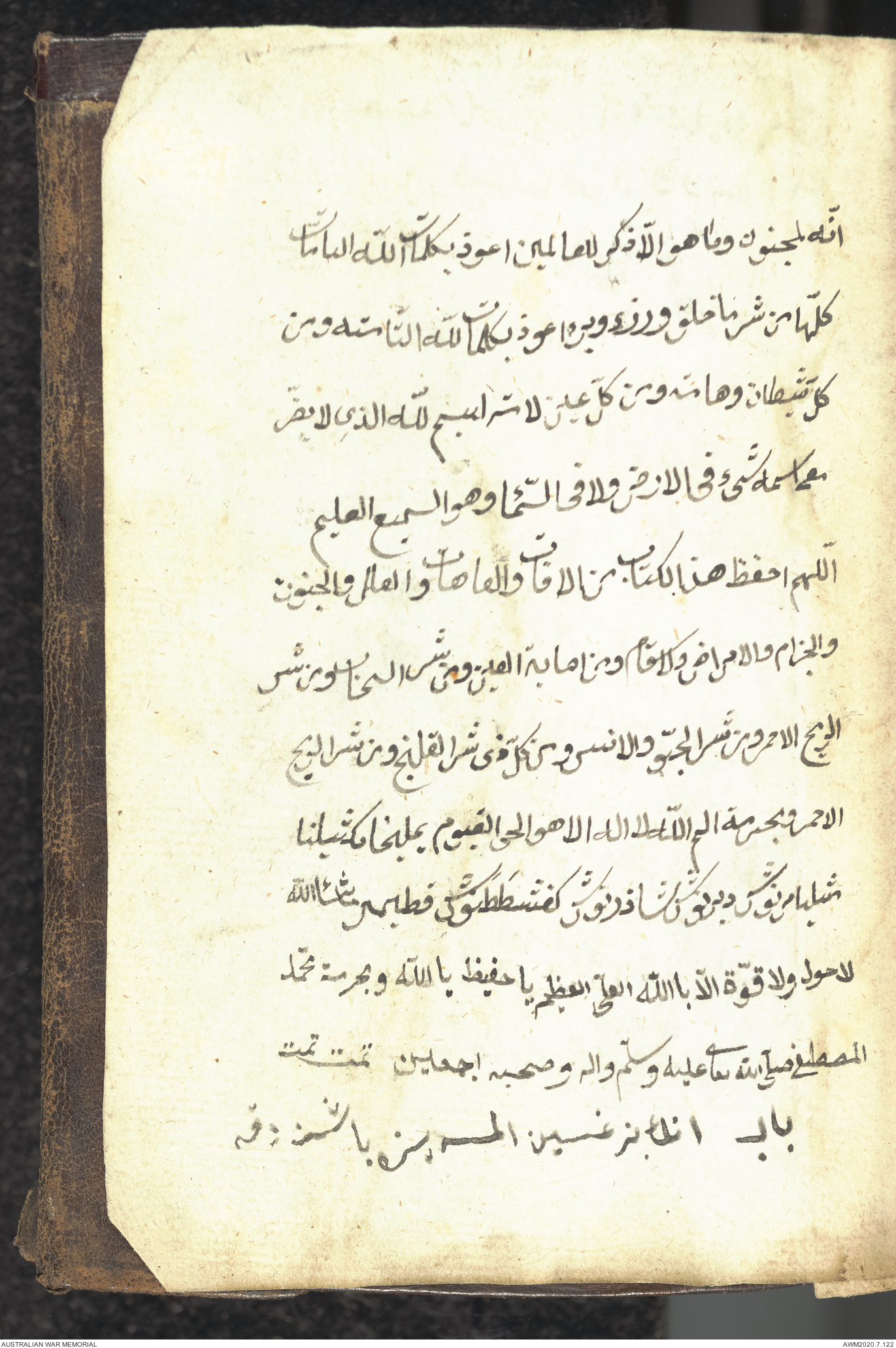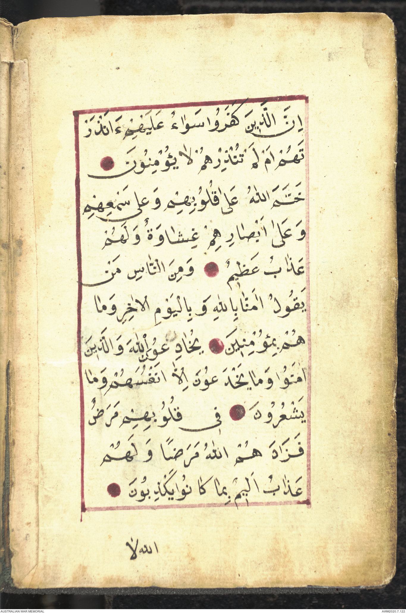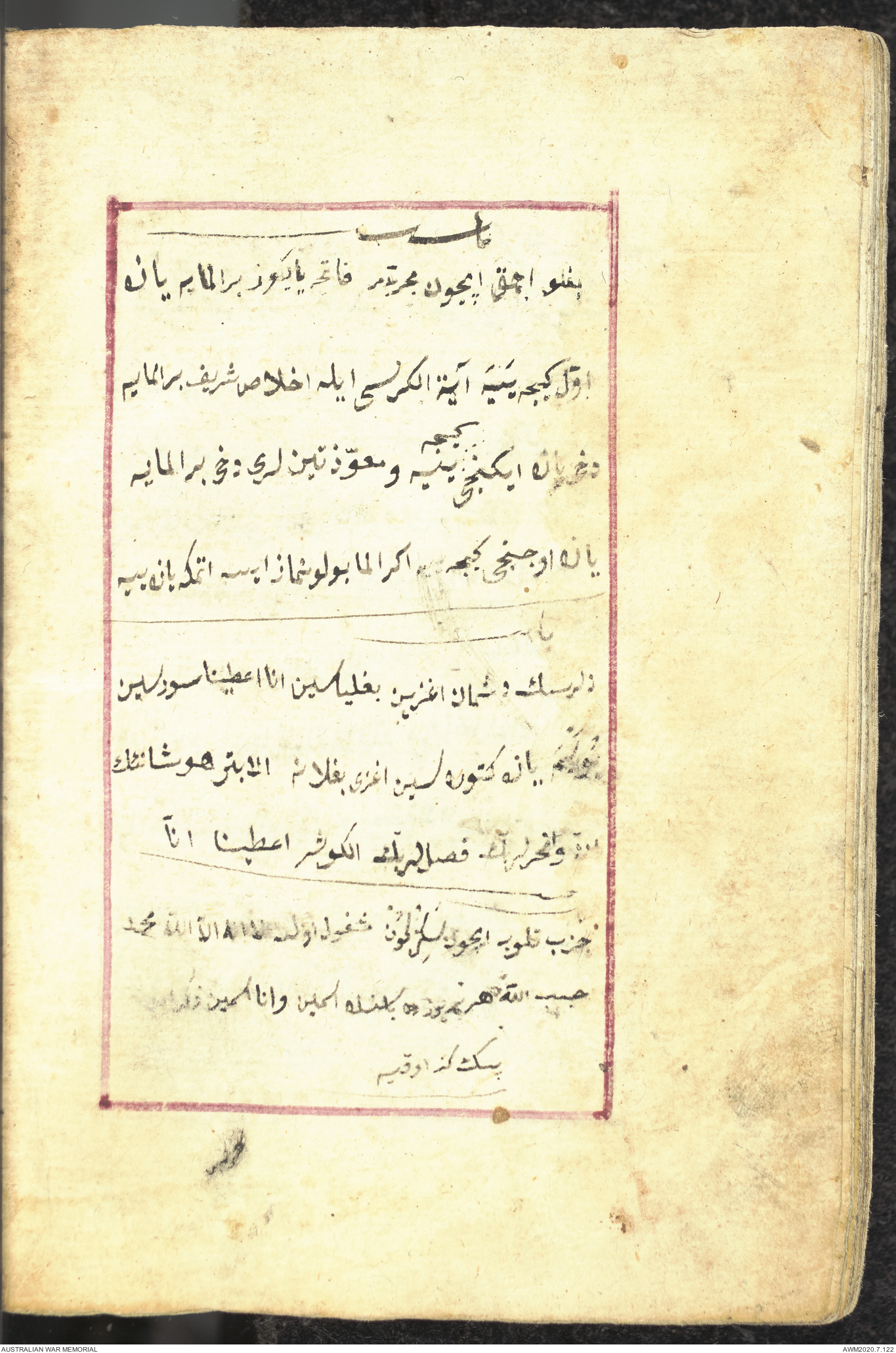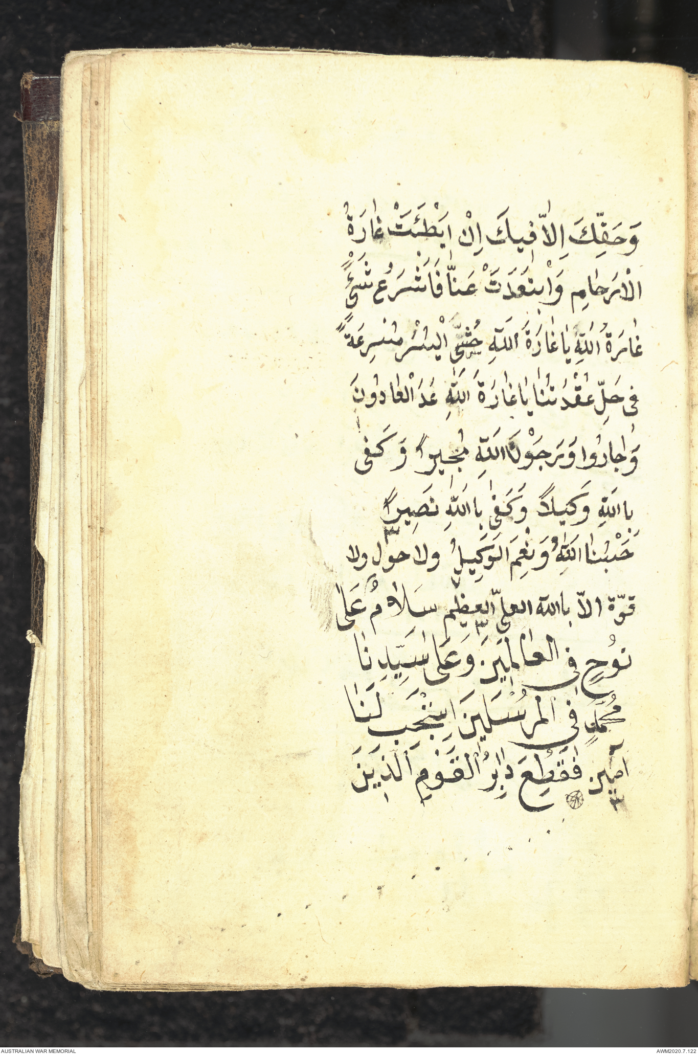 Wallet 1 of 1 - Collection consists of one brown and maroon leather covered Arabic prayer book. The book was collected by Lieutenant Colonel Stanley Holm Watson, who recovered it from the body of a dead Turkish soldier during the 8-hour ceasefire called between Allied and Ottoman Forces on 24 May 1915 in order to recover their dead and wounded from no man's land.