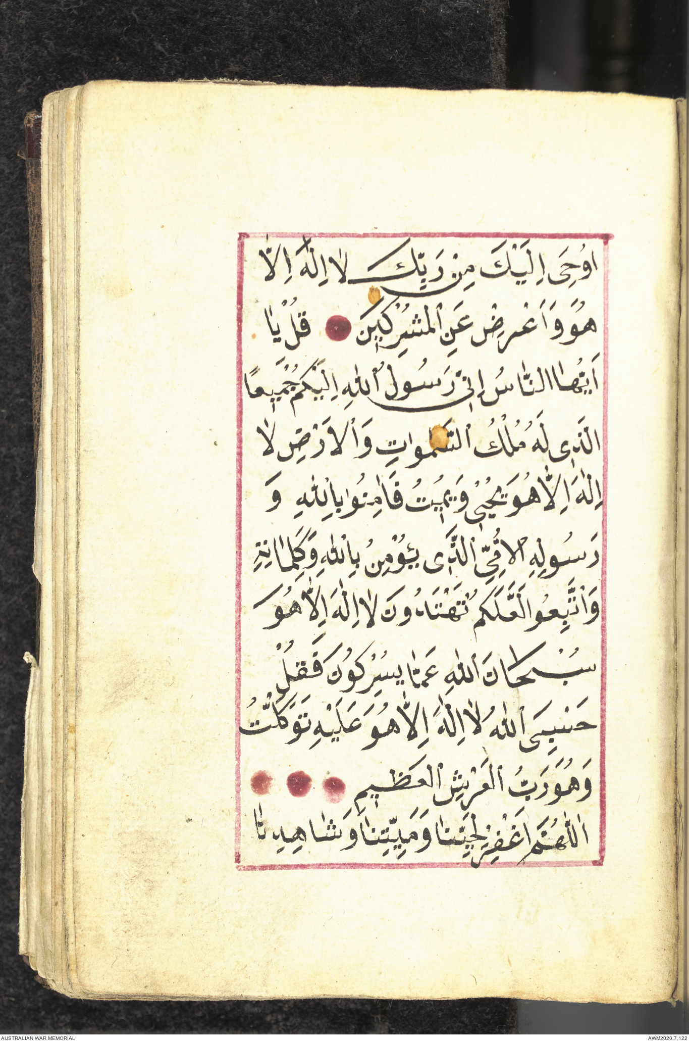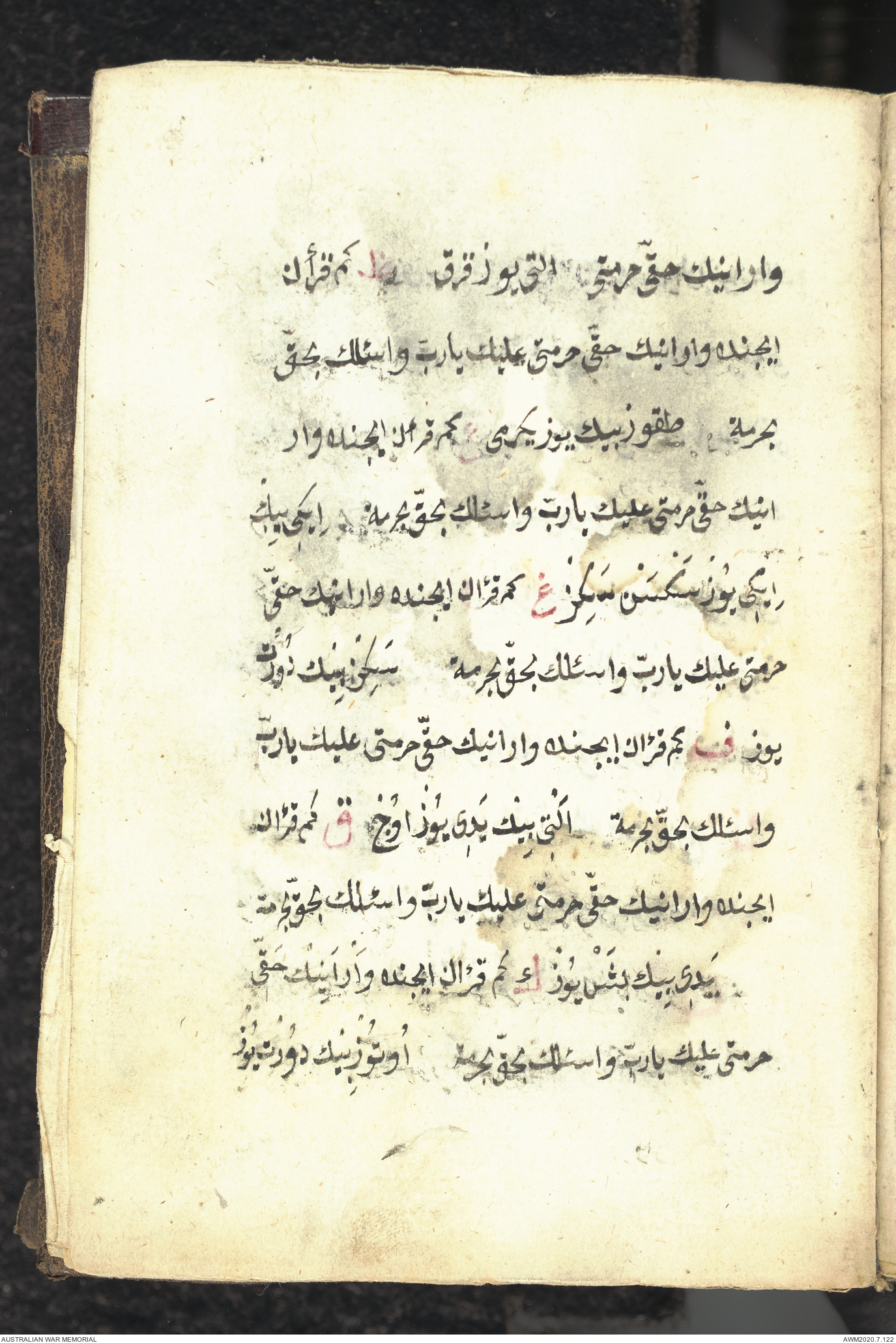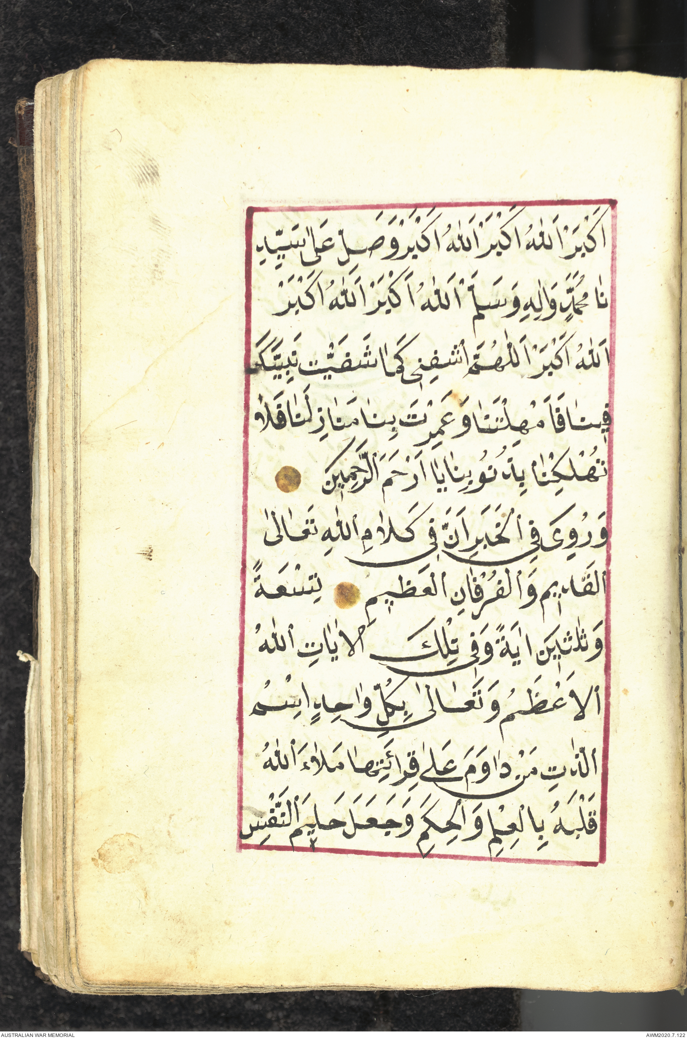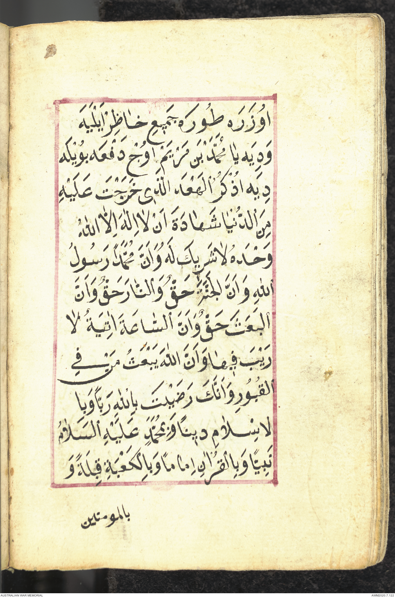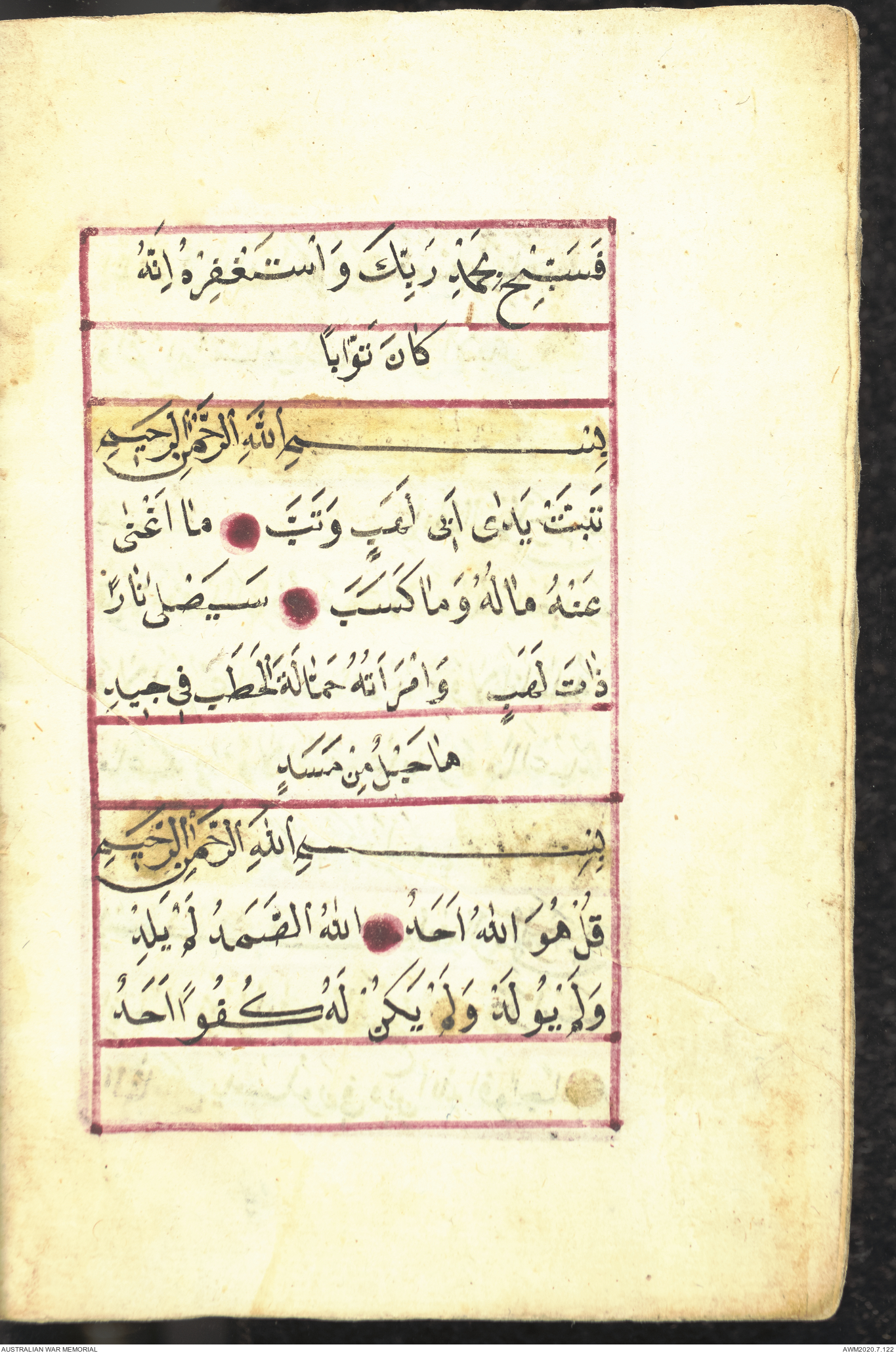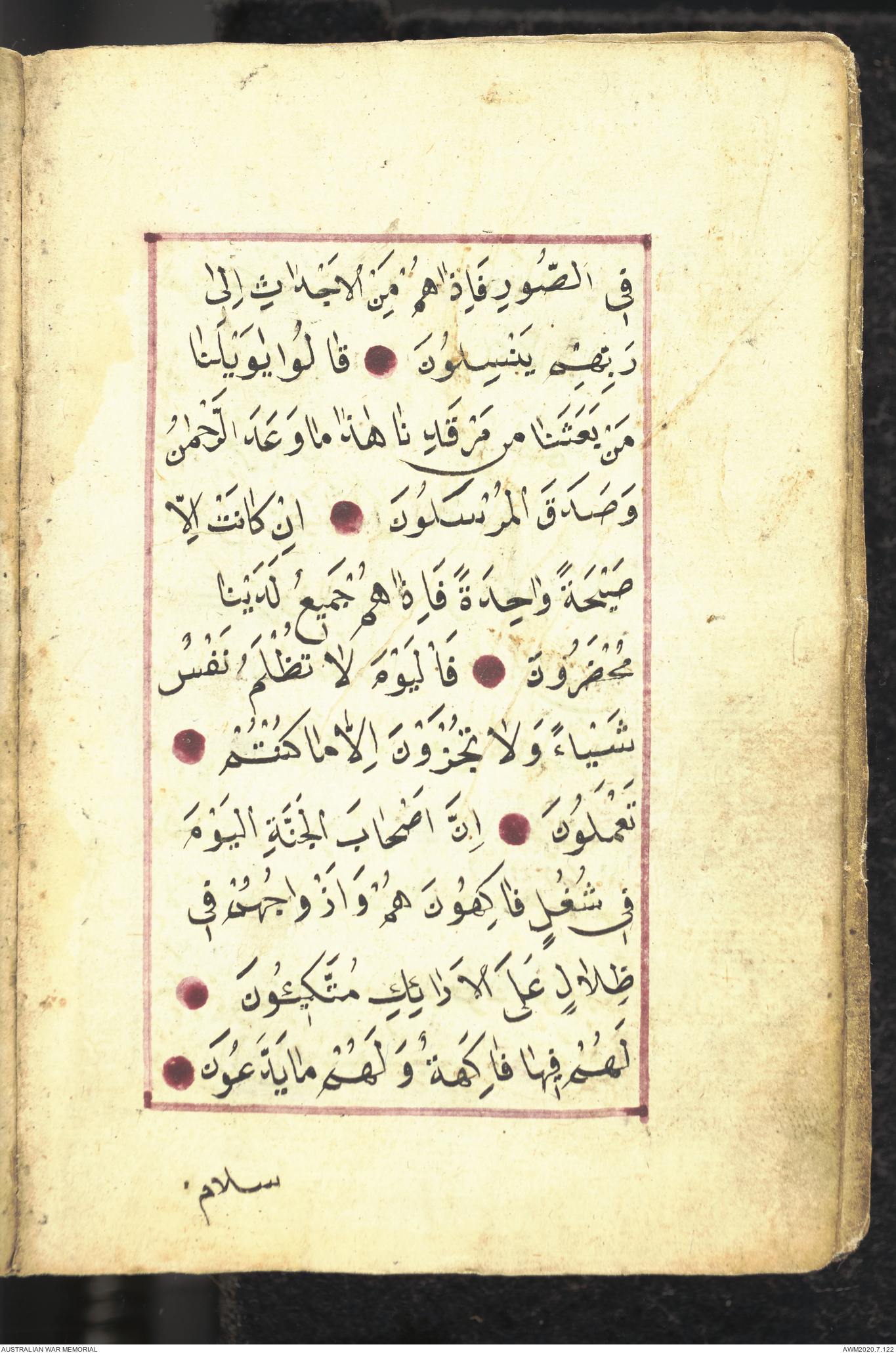 Wallet 1 of 1 - Collection consists of one brown and maroon leather covered Arabic prayer book. The book was collected by Lieutenant Colonel Stanley Holm Watson, who recovered it from the body of a dead Turkish soldier during the 8-hour ceasefire called between Allied and Ottoman Forces on 24 May 1915 in order to recover their dead and wounded from no man's land.