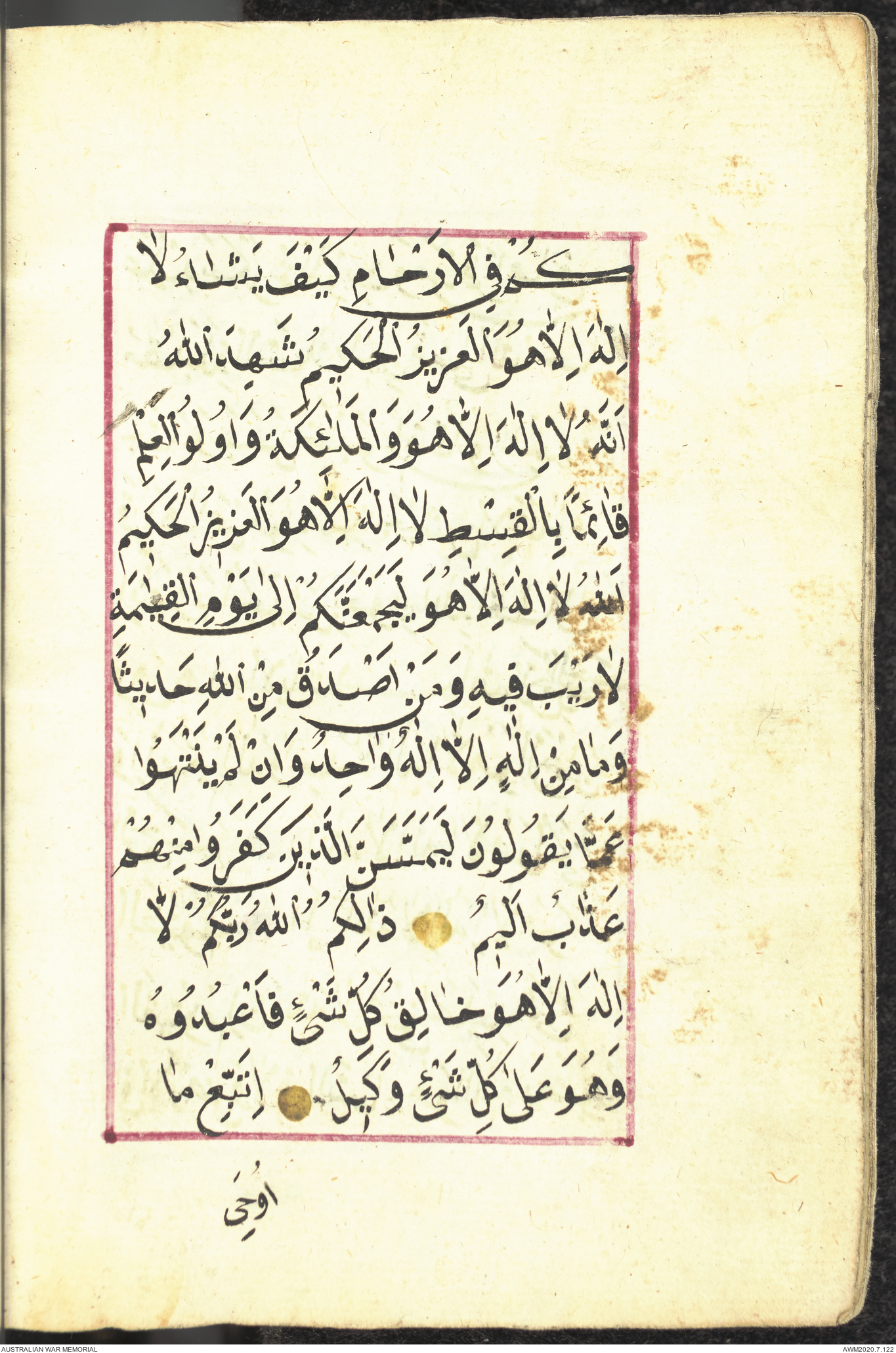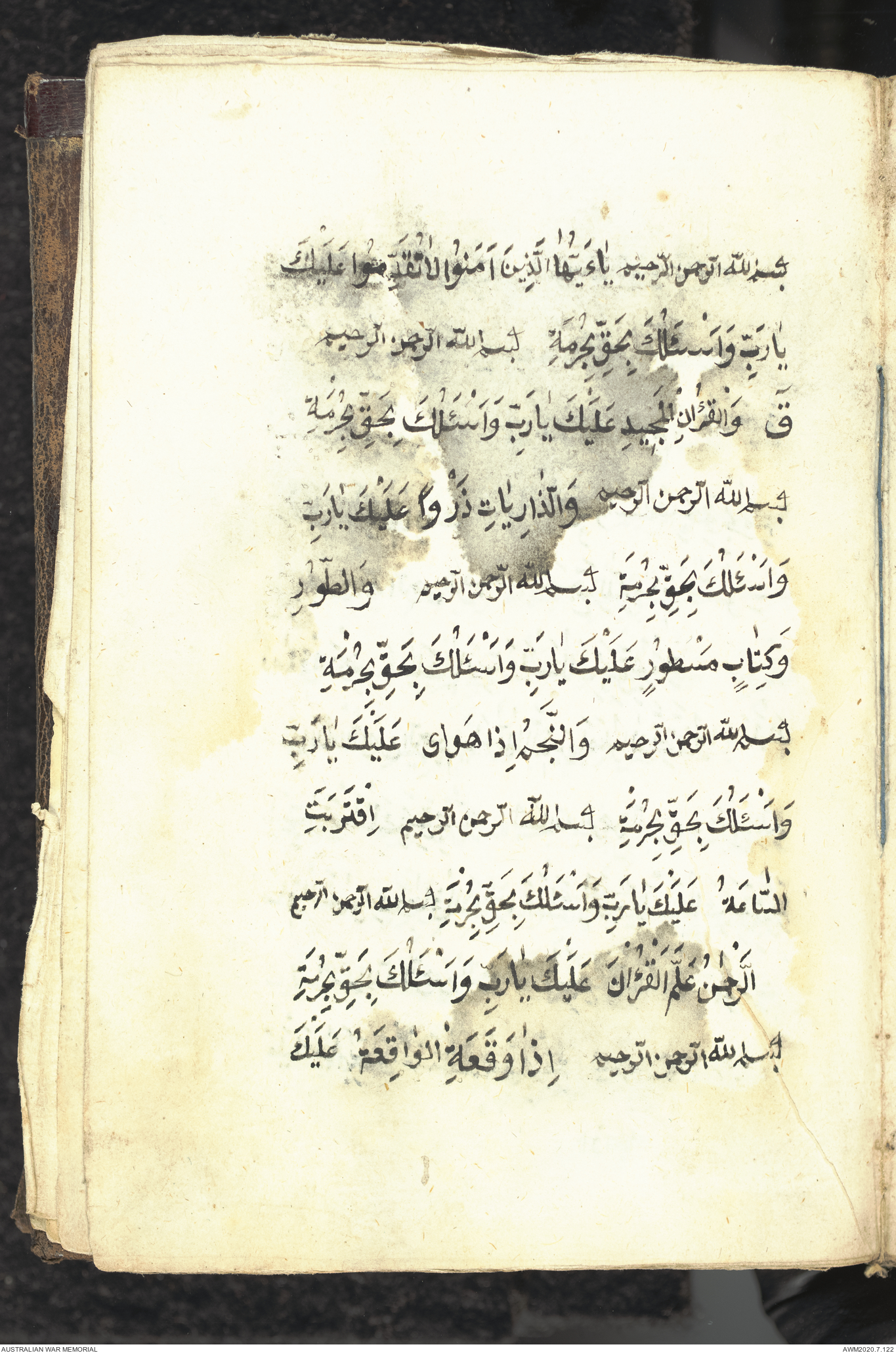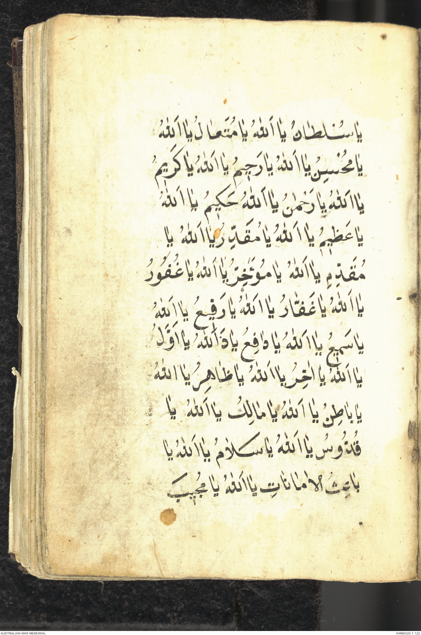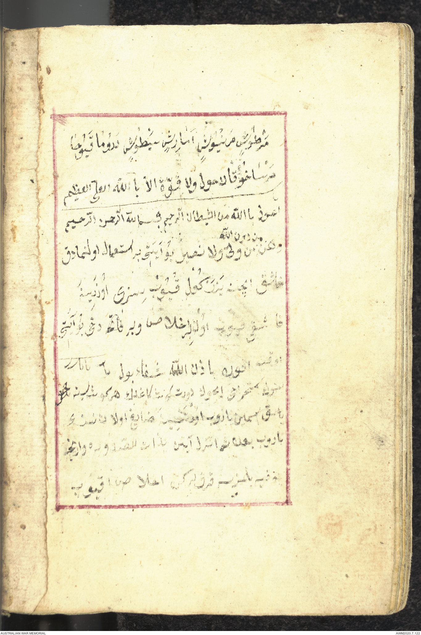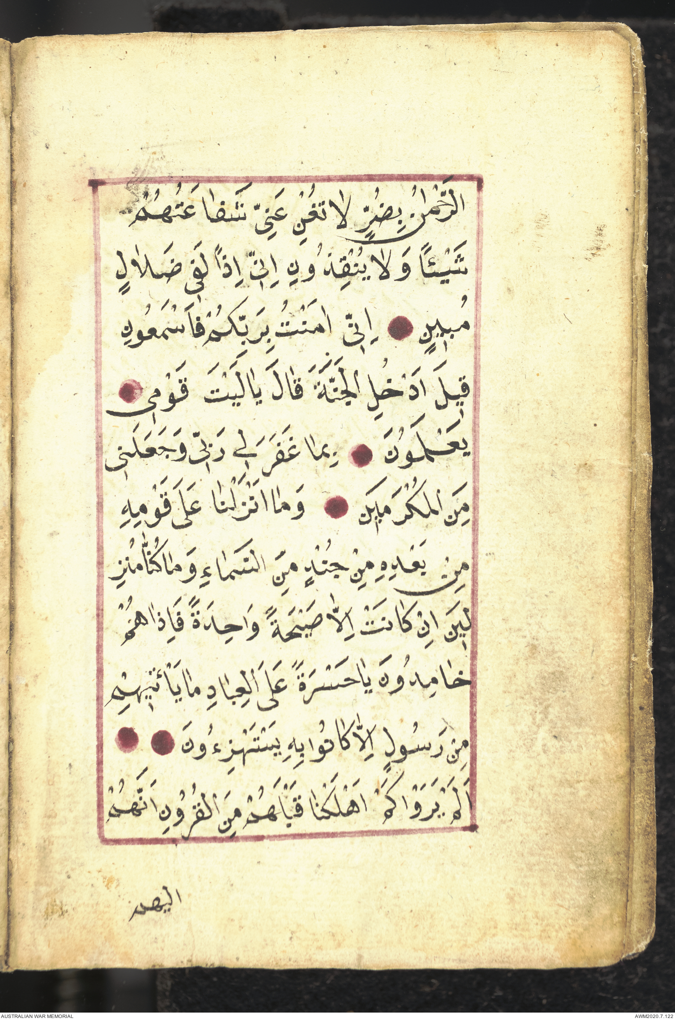 Wallet 1 of 1 - Collection consists of one brown and maroon leather covered Arabic prayer book. The book was collected by Lieutenant Colonel Stanley Holm Watson, who recovered it from the body of a dead Turkish soldier during the 8-hour ceasefire called between Allied and Ottoman Forces on 24 May 1915 in order to recover their dead and wounded from no man's land.