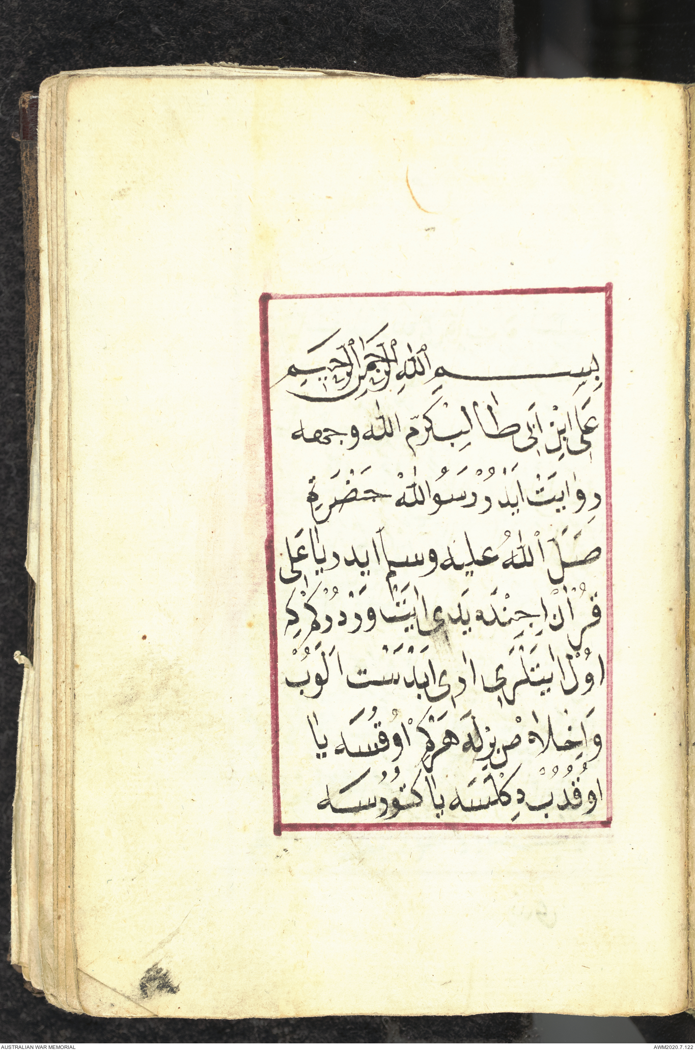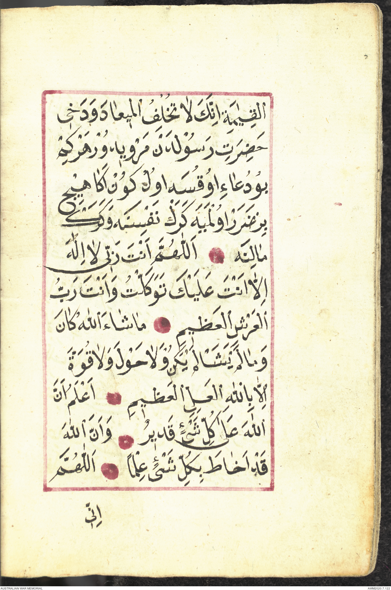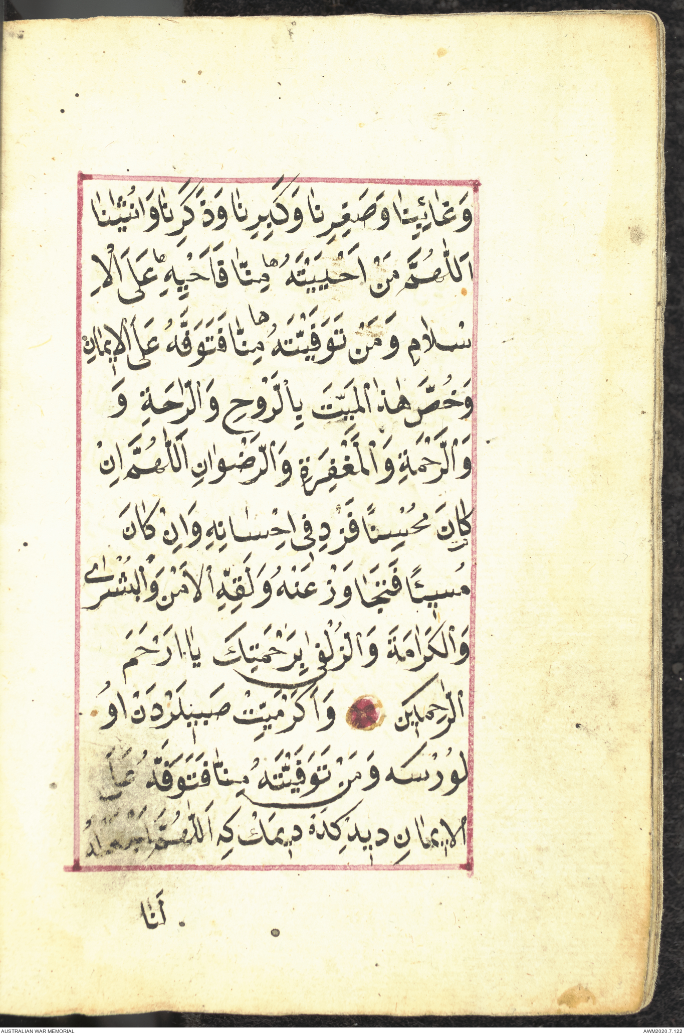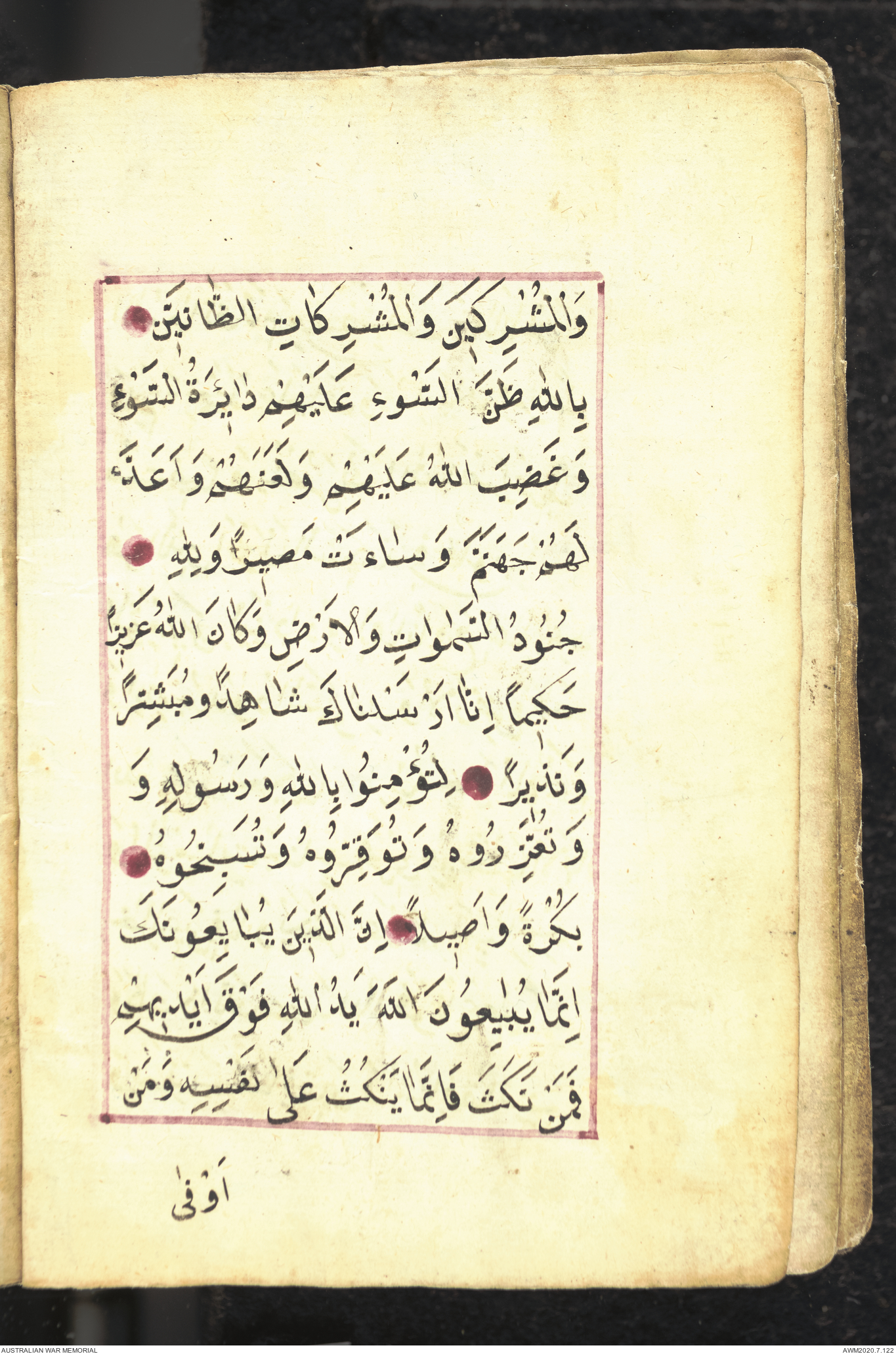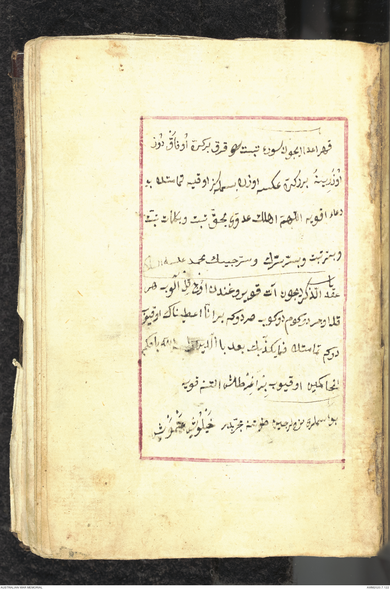 Wallet 1 of 1 - Collection consists of one brown and maroon leather covered Arabic prayer book. The book was collected by Lieutenant Colonel Stanley Holm Watson, who recovered it from the body of a dead Turkish soldier during the 8-hour ceasefire called between Allied and Ottoman Forces on 24 May 1915 in order to recover their dead and wounded from no man's land.