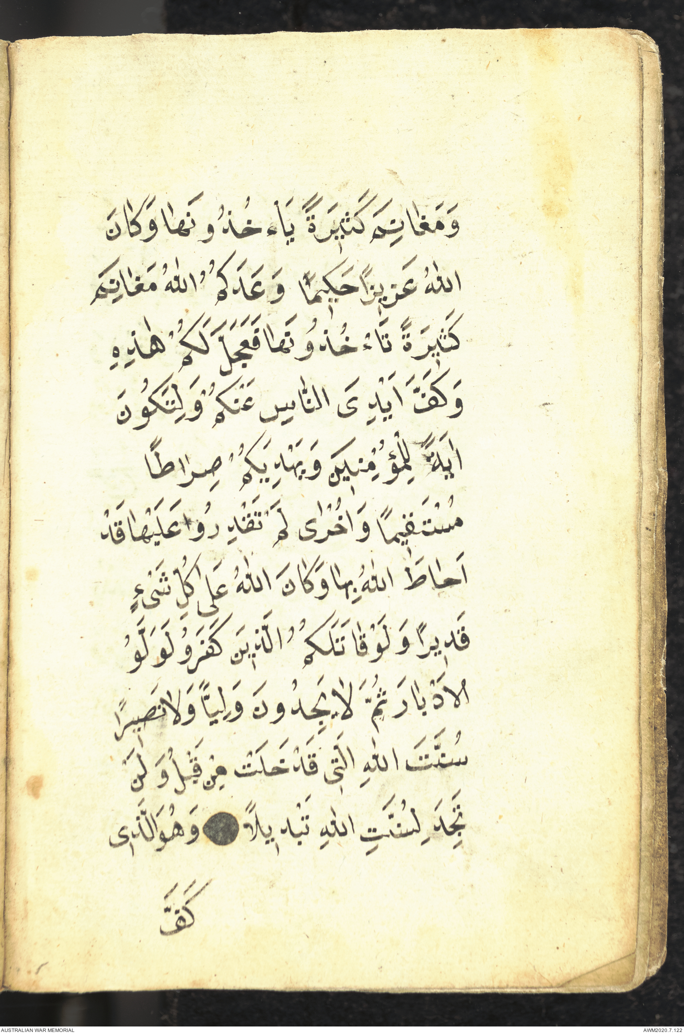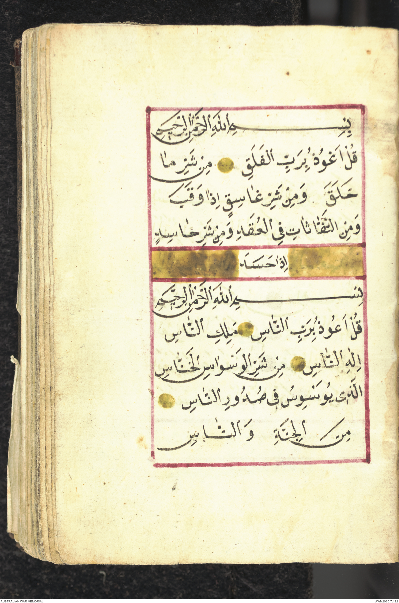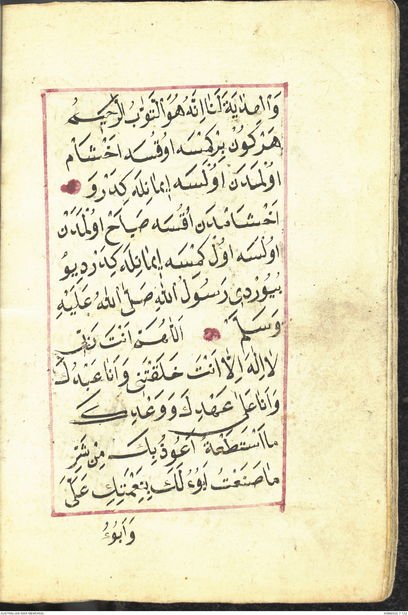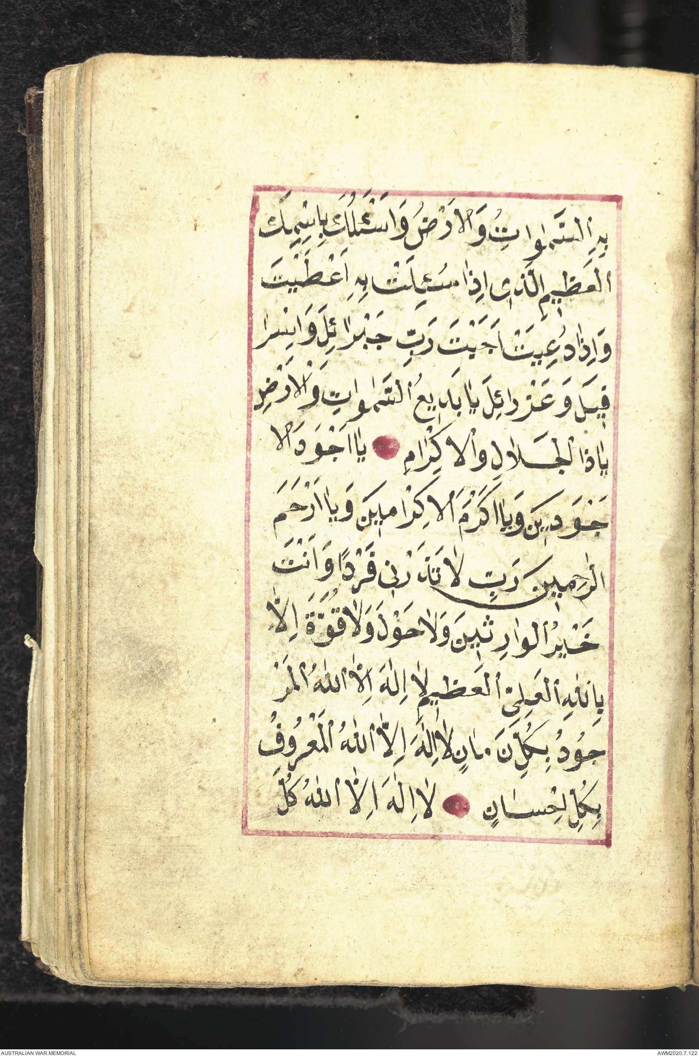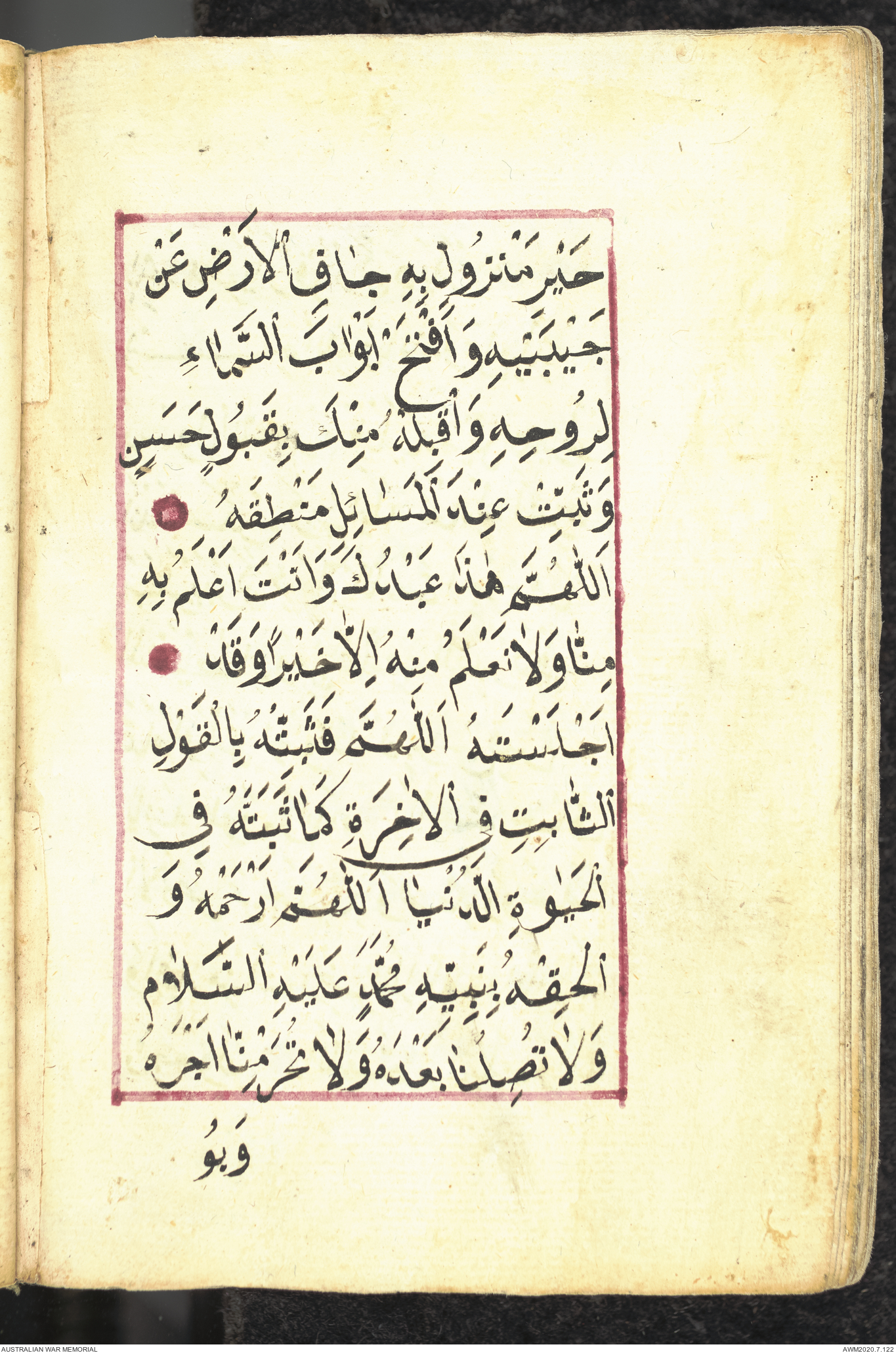 Wallet 1 of 1 - Collection consists of one brown and maroon leather covered Arabic prayer book. The book was collected by Lieutenant Colonel Stanley Holm Watson, who recovered it from the body of a dead Turkish soldier during the 8-hour ceasefire called between Allied and Ottoman Forces on 24 May 1915 in order to recover their dead and wounded from no man's land.