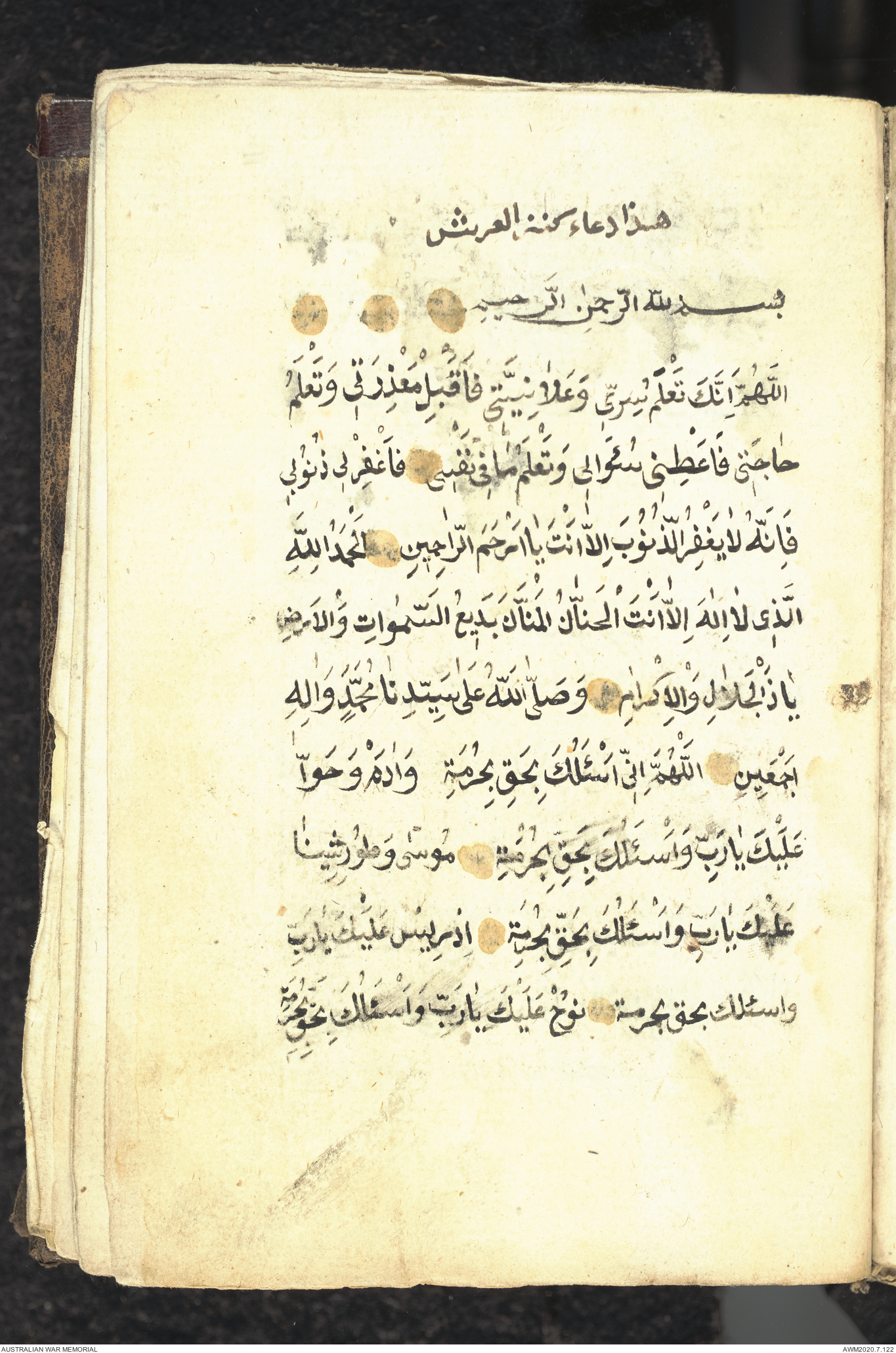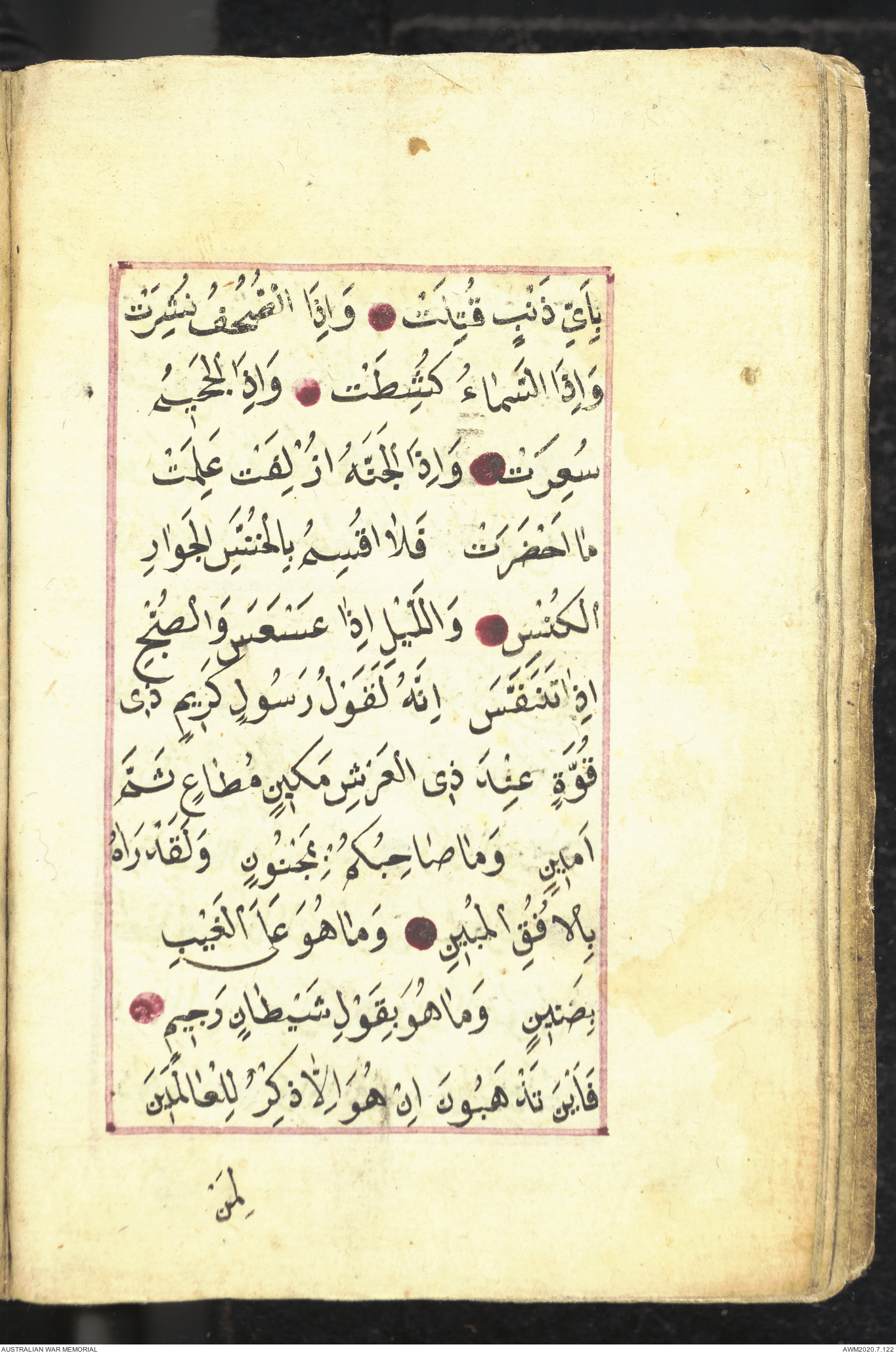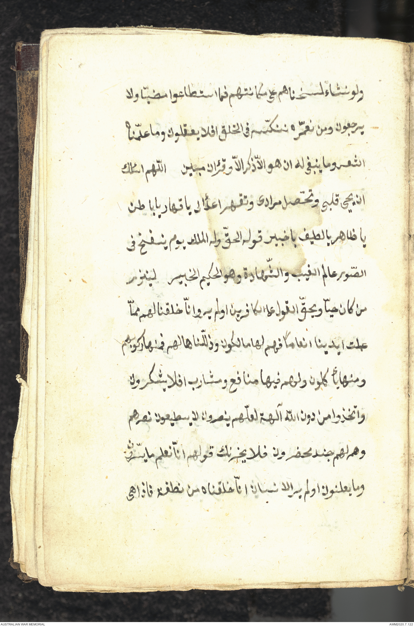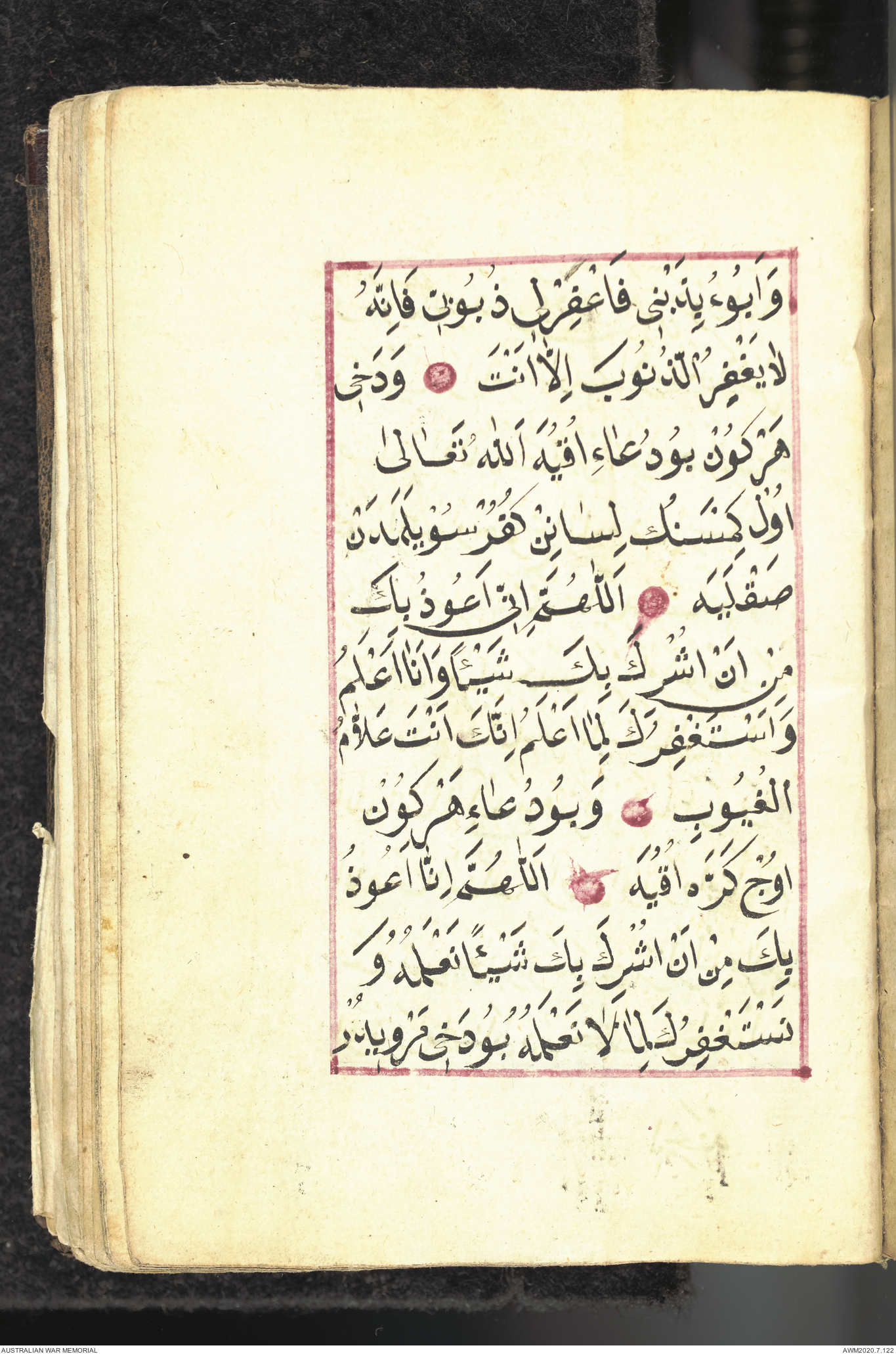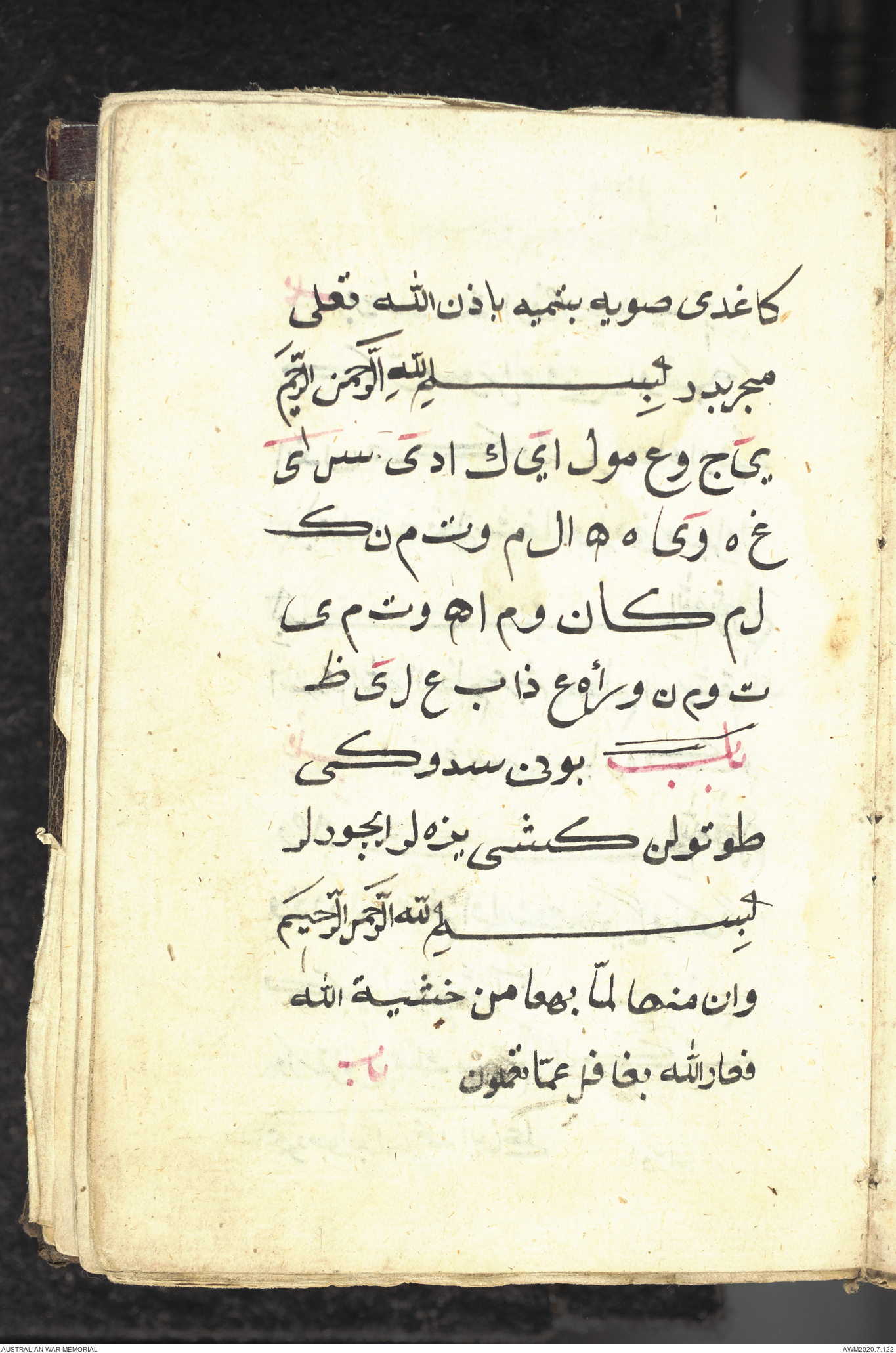 Wallet 1 of 1 - Collection consists of one brown and maroon leather covered Arabic prayer book. The book was collected by Lieutenant Colonel Stanley Holm Watson, who recovered it from the body of a dead Turkish soldier during the 8-hour ceasefire called between Allied and Ottoman Forces on 24 May 1915 in order to recover their dead and wounded from no man's land.