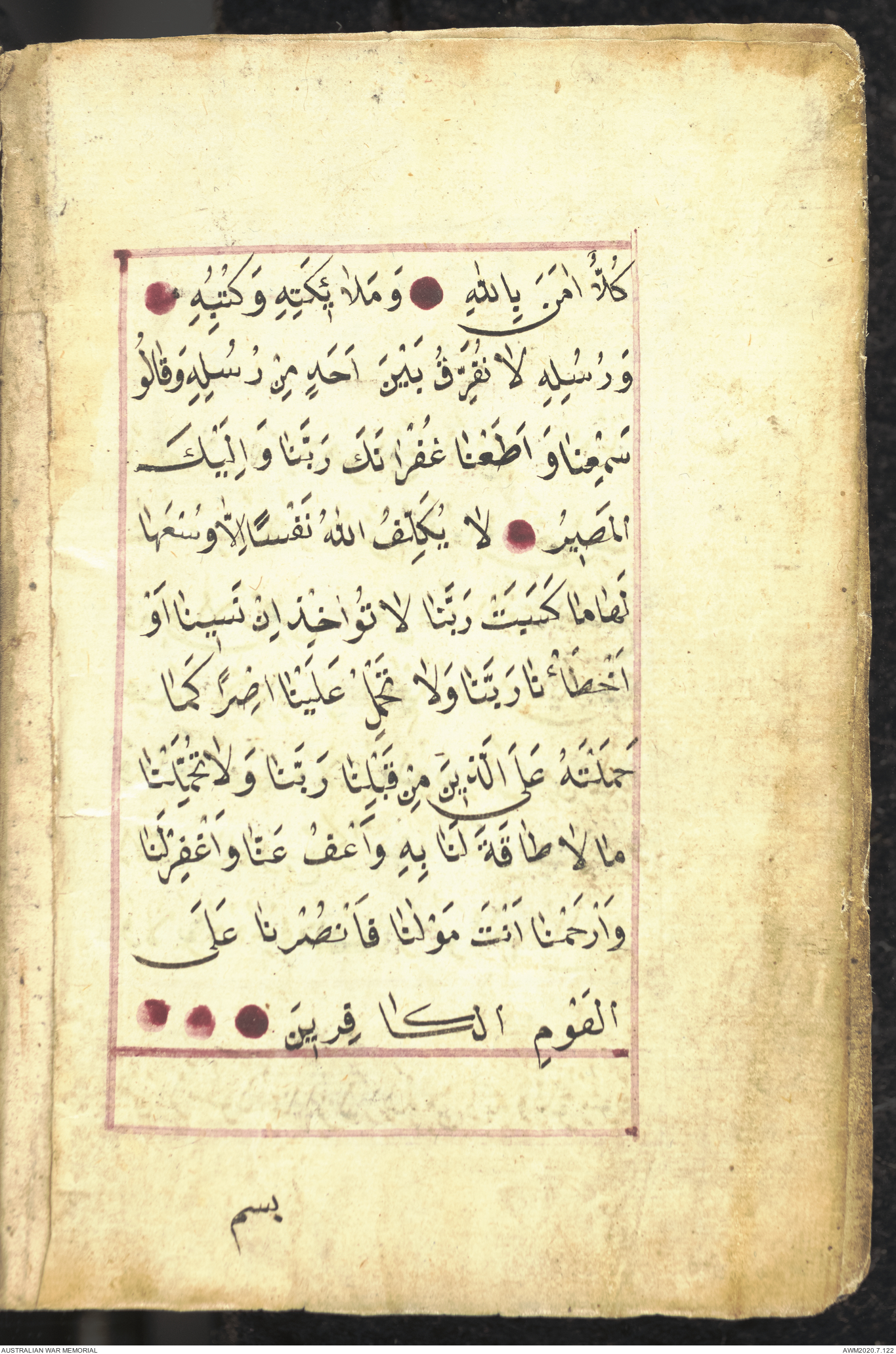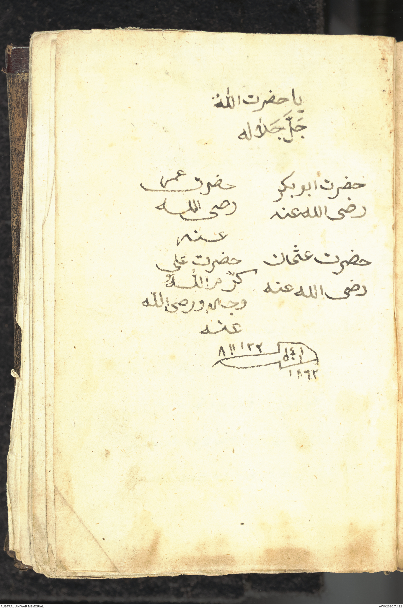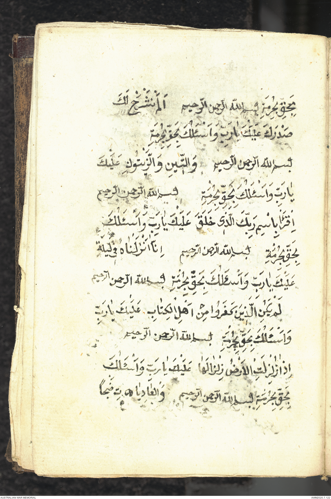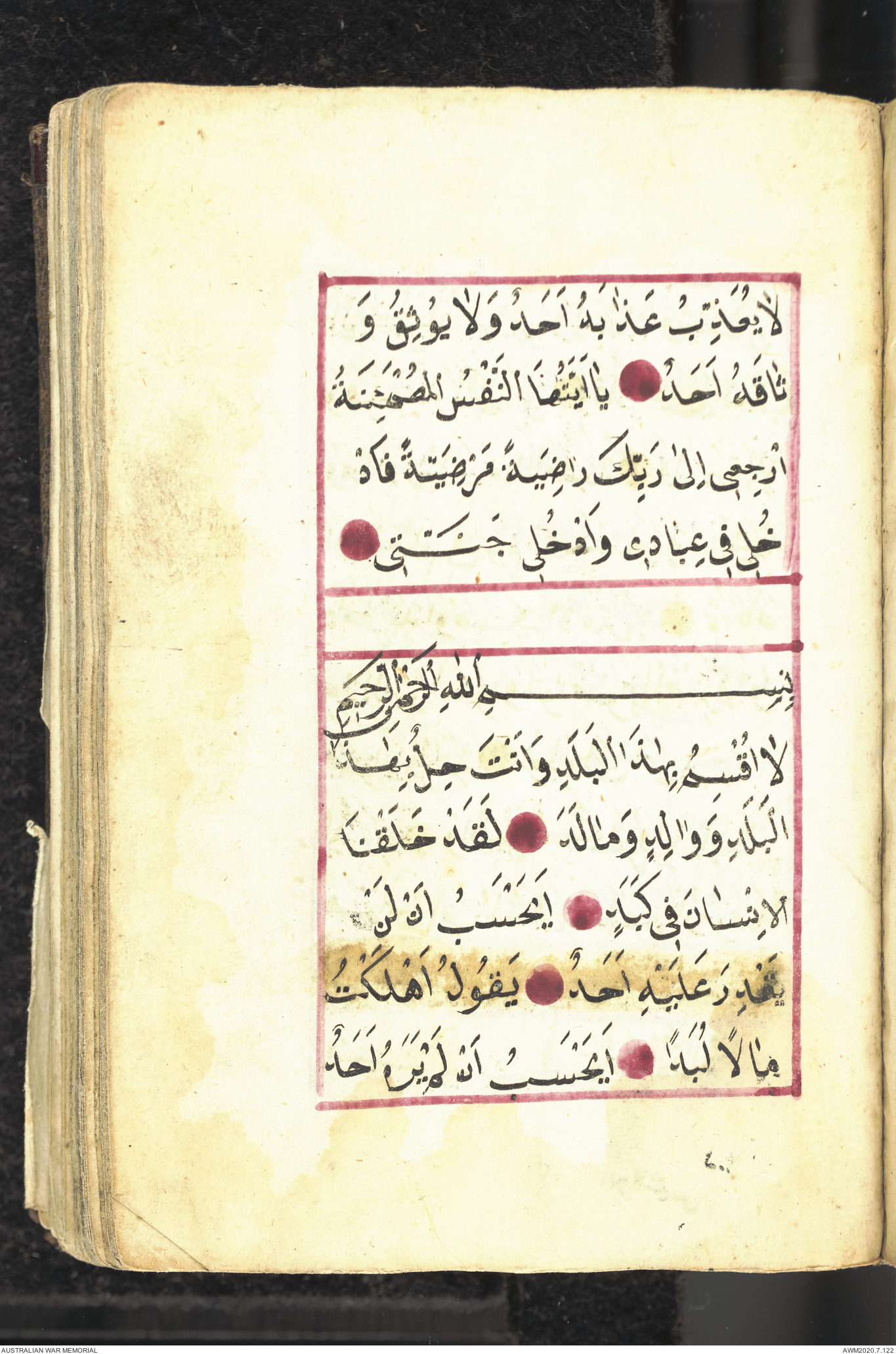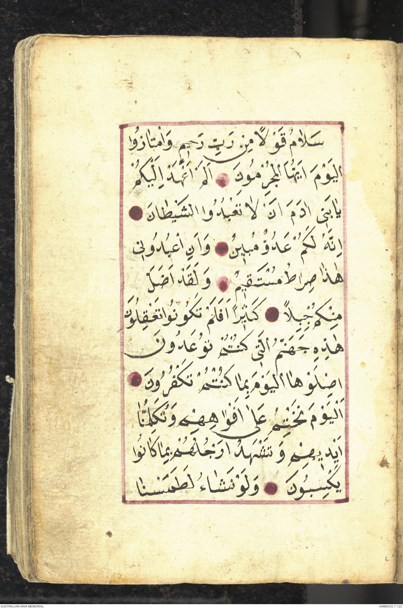 Wallet 1 of 1 - Collection consists of one brown and maroon leather covered Arabic prayer book. The book was collected by Lieutenant Colonel Stanley Holm Watson, who recovered it from the body of a dead Turkish soldier during the 8-hour ceasefire called between Allied and Ottoman Forces on 24 May 1915 in order to recover their dead and wounded from no man's land.