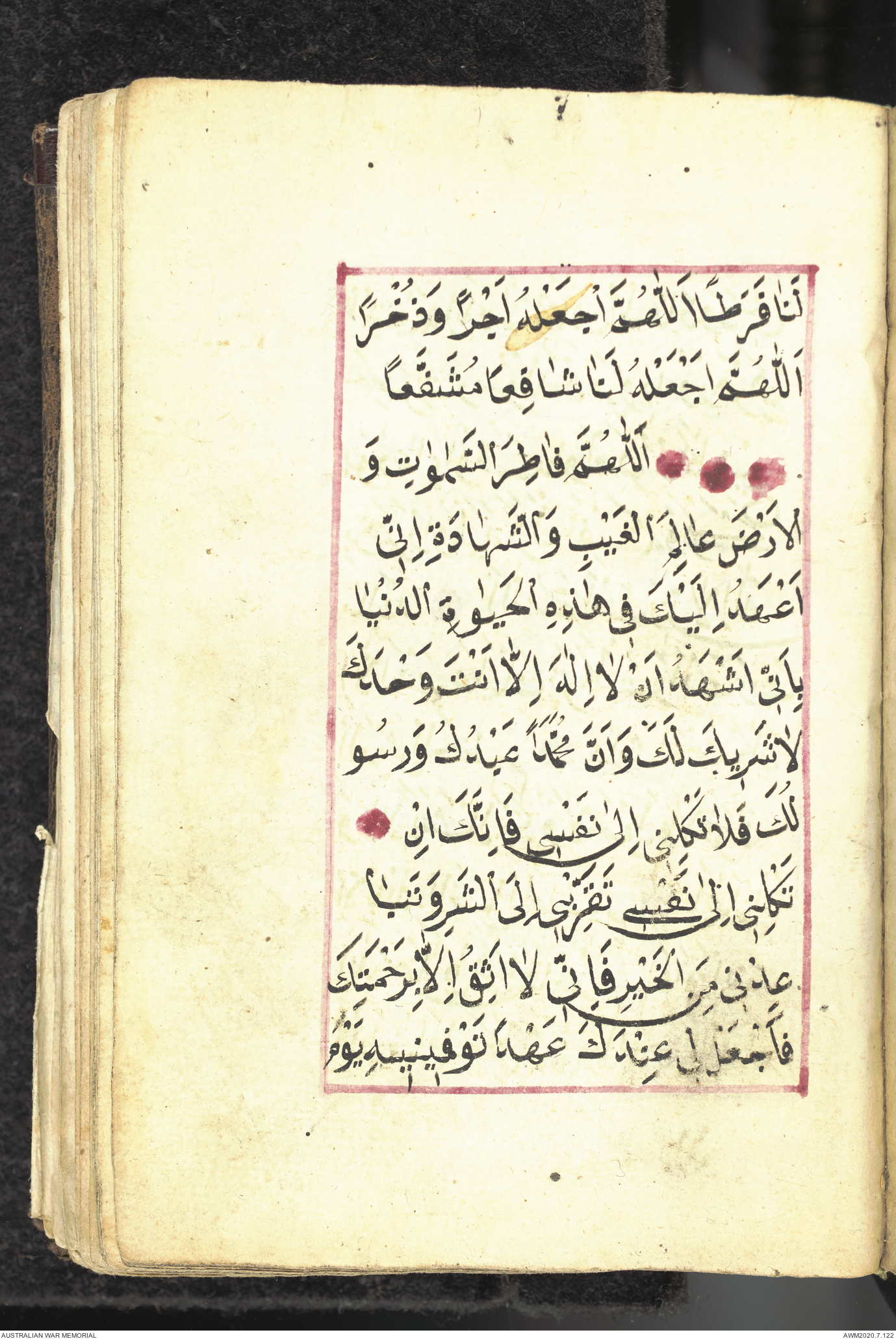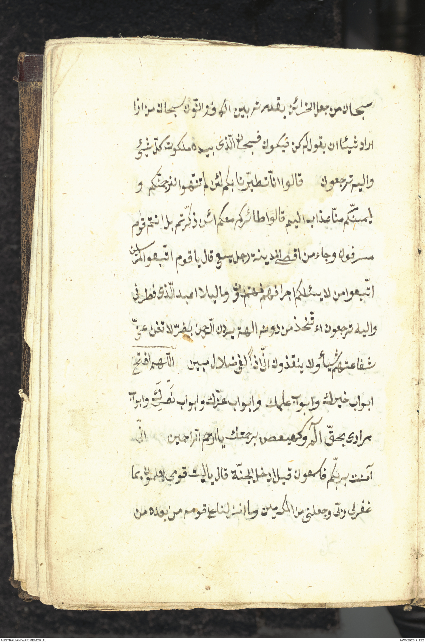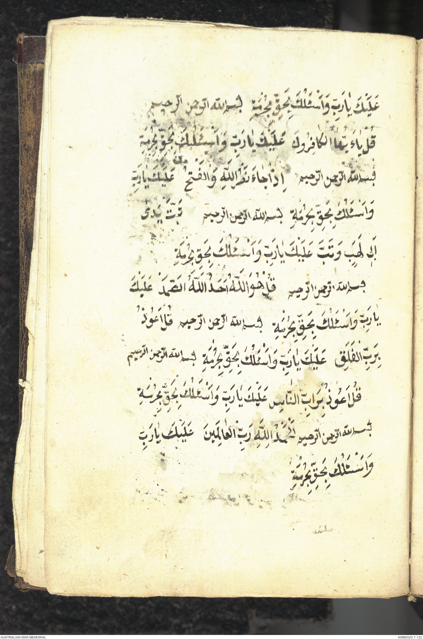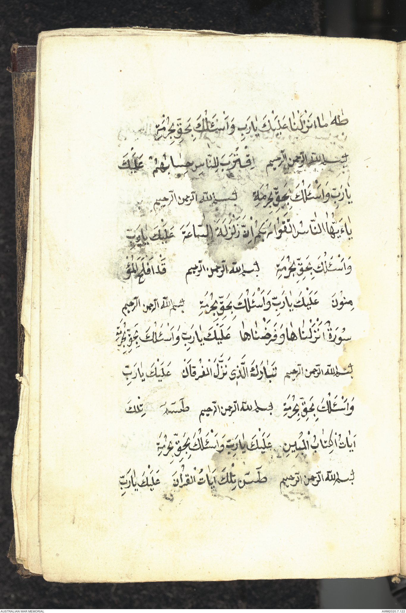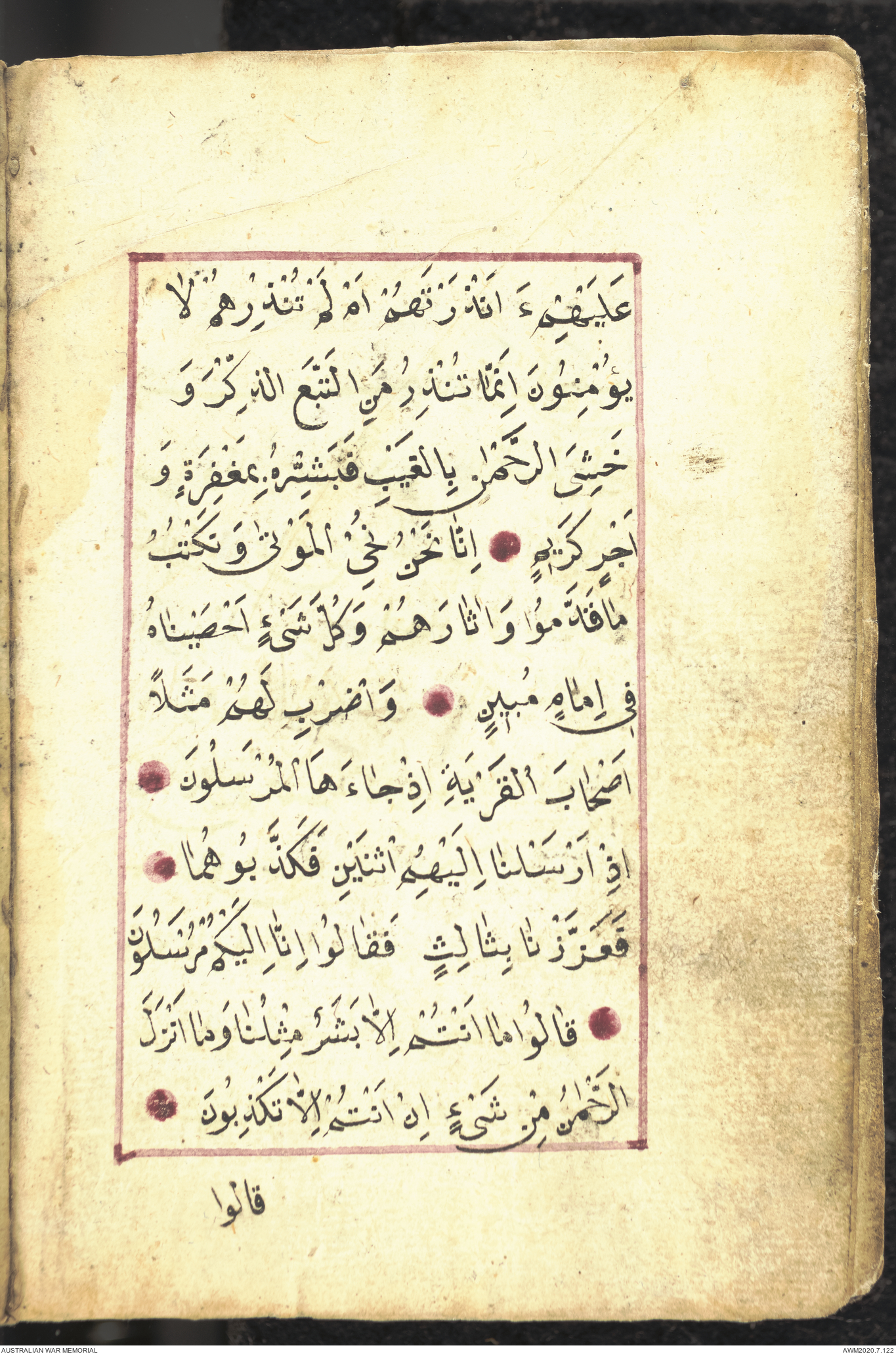 Wallet 1 of 1 - Collection consists of one brown and maroon leather covered Arabic prayer book. The book was collected by Lieutenant Colonel Stanley Holm Watson, who recovered it from the body of a dead Turkish soldier during the 8-hour ceasefire called between Allied and Ottoman Forces on 24 May 1915 in order to recover their dead and wounded from no man's land.