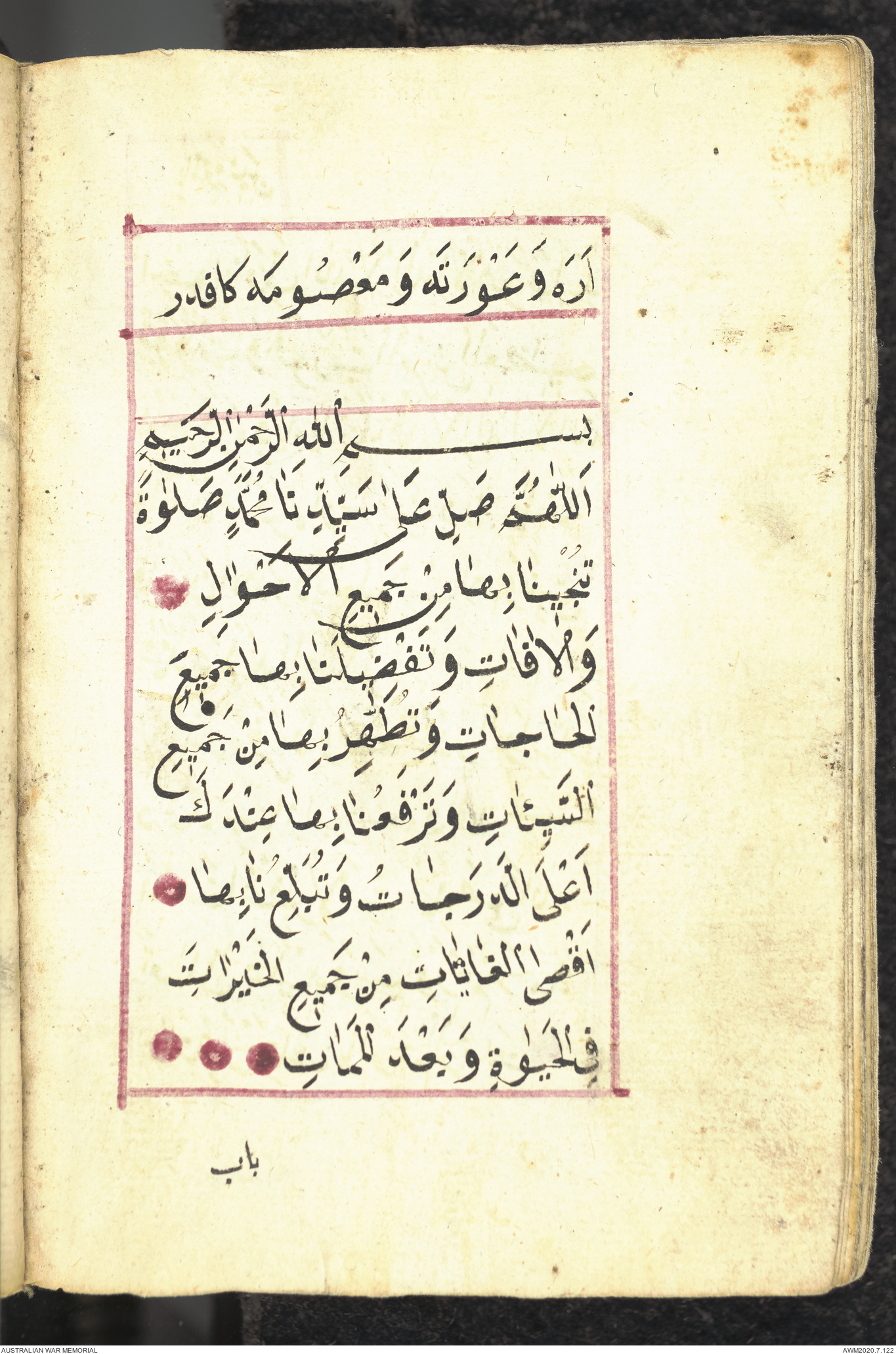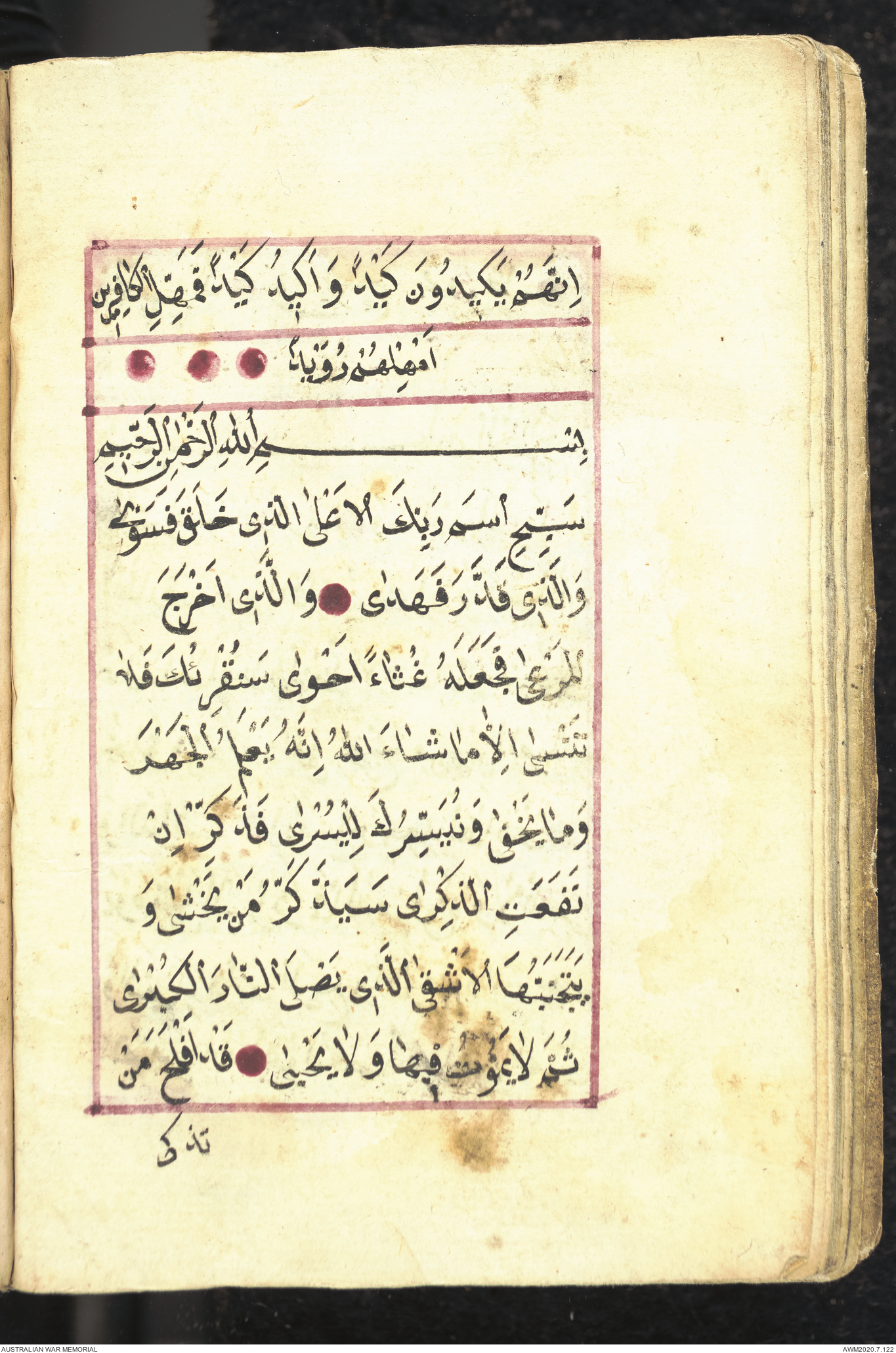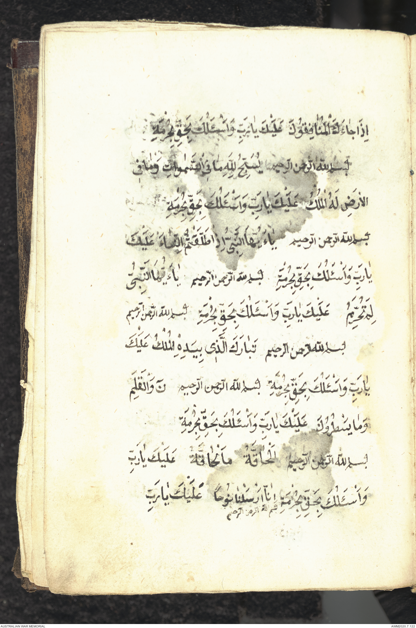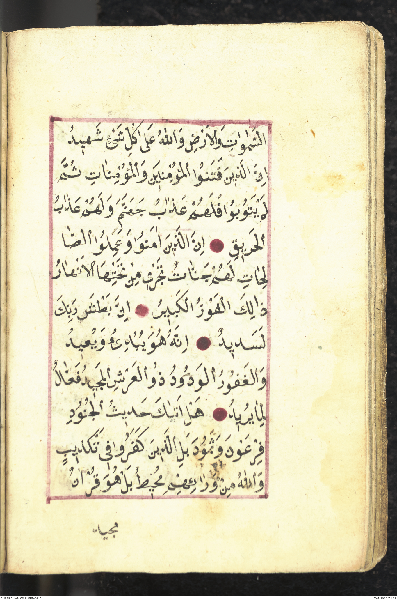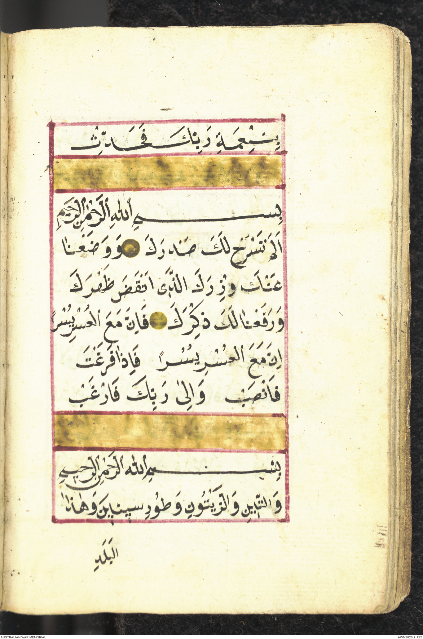 Wallet 1 of 1 - Collection consists of one brown and maroon leather covered Arabic prayer book. The book was collected by Lieutenant Colonel Stanley Holm Watson, who recovered it from the body of a dead Turkish soldier during the 8-hour ceasefire called between Allied and Ottoman Forces on 24 May 1915 in order to recover their dead and wounded from no man's land.