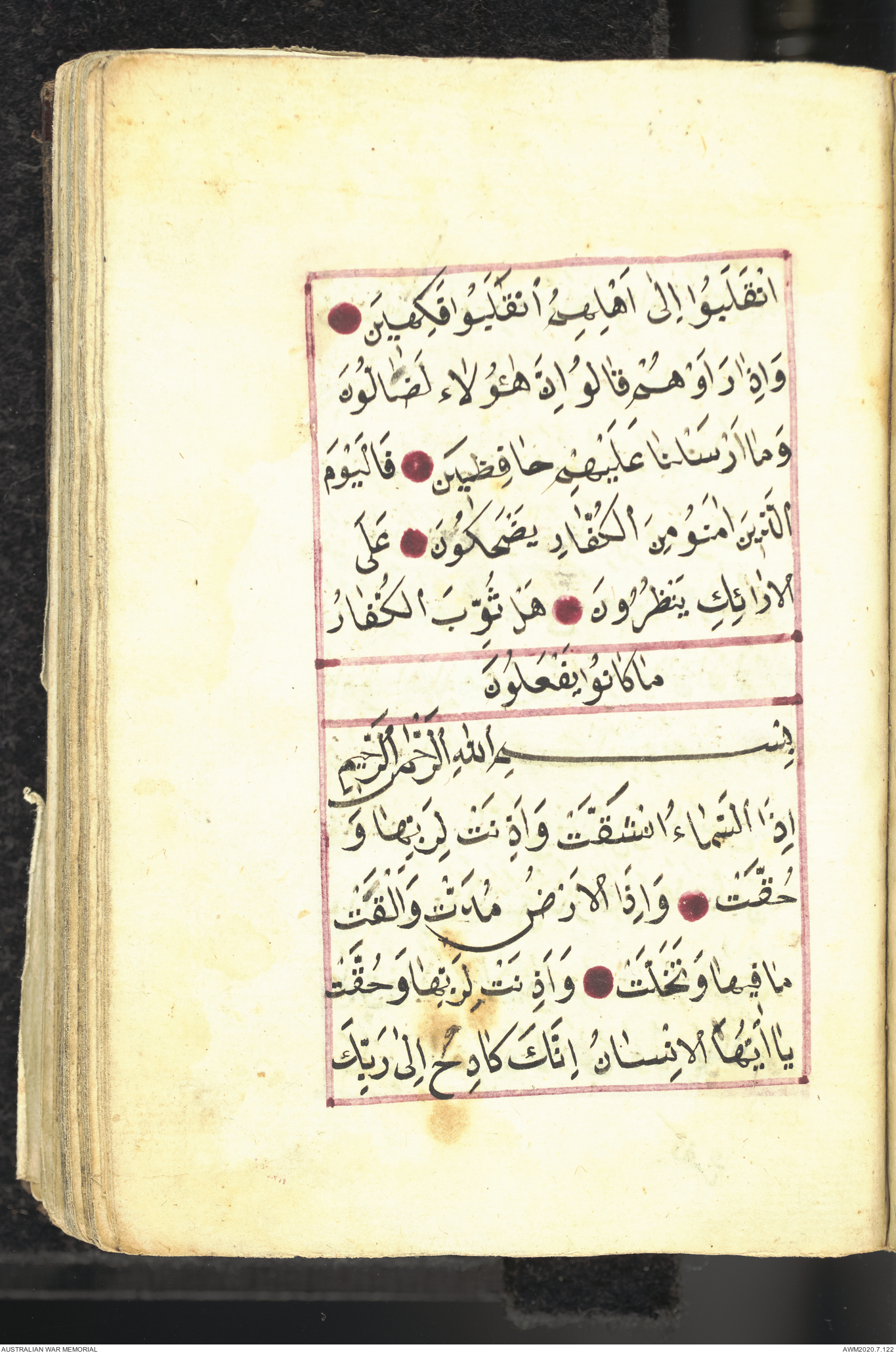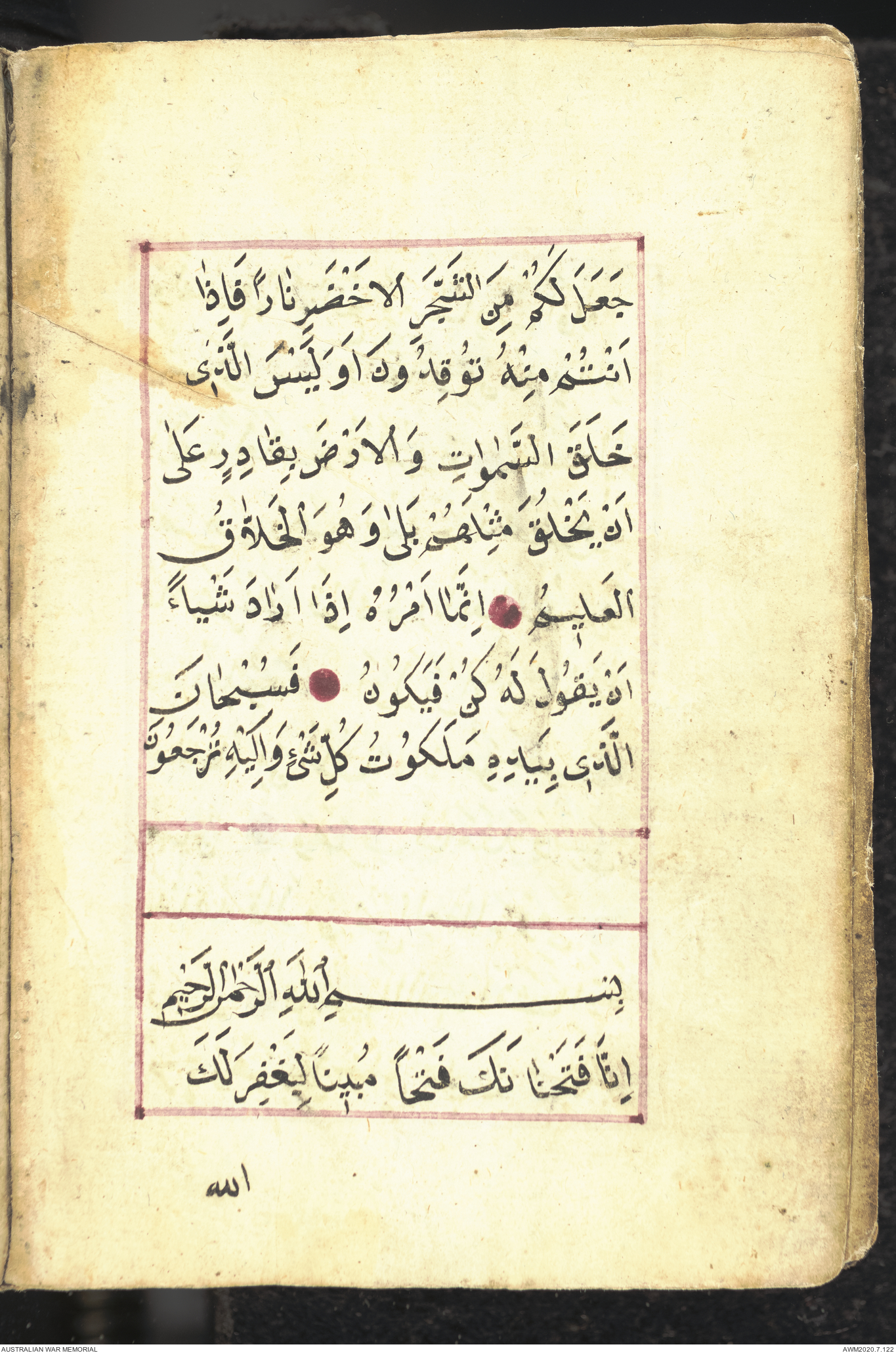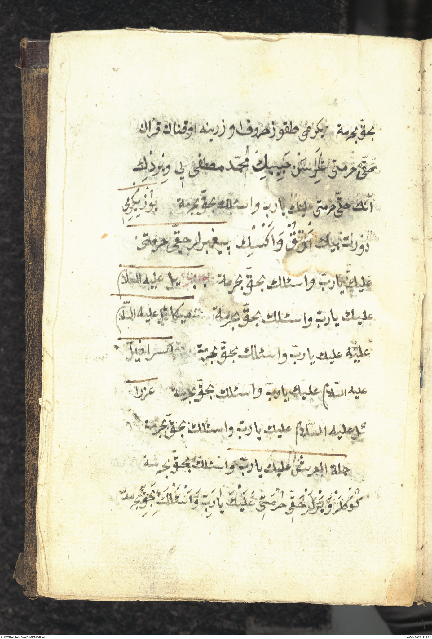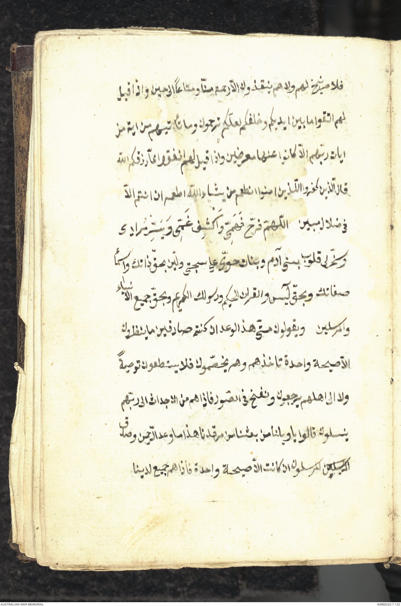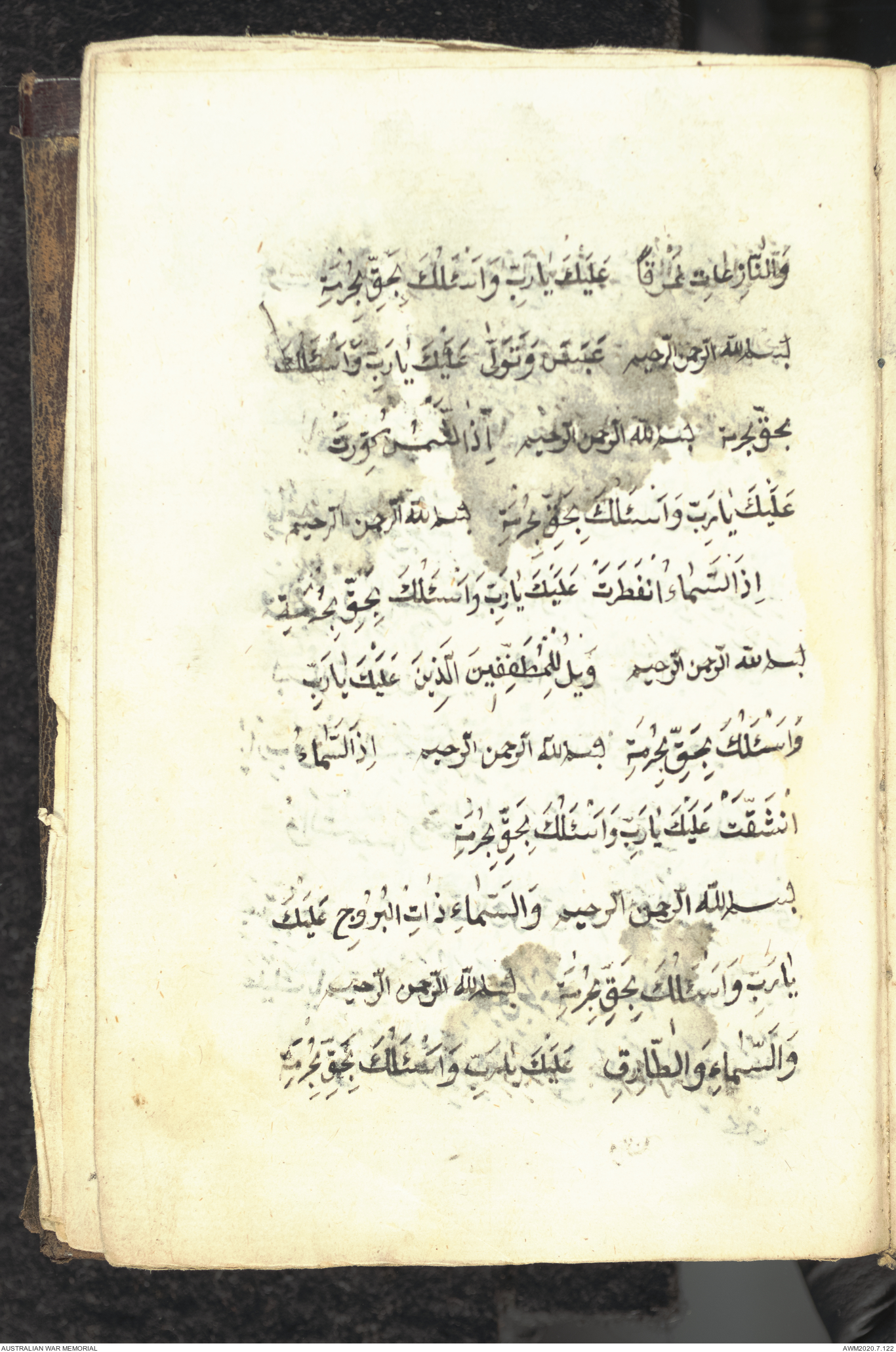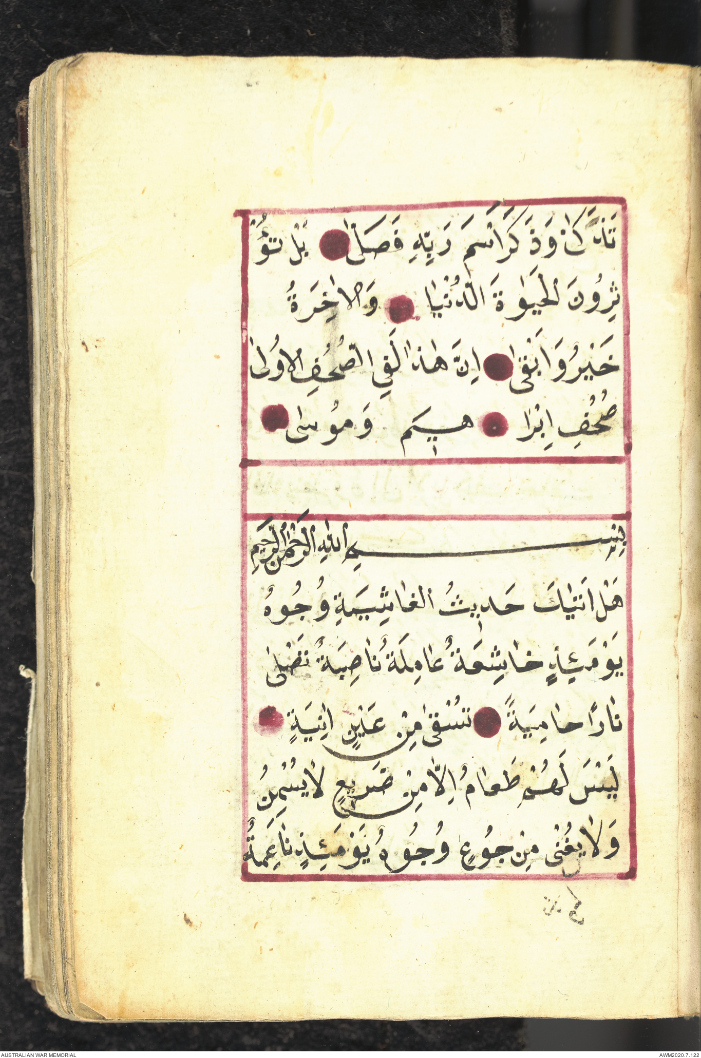Wallet 1 of 1 - Collection consists of one brown and maroon leather covered Arabic prayer book. The book was collected by Lieutenant Colonel Stanley Holm Watson, who recovered it from the body of a dead Turkish soldier during the 8-hour ceasefire called between Allied and Ottoman Forces on 24 May 1915 in order to recover their dead and wounded from no man's land.