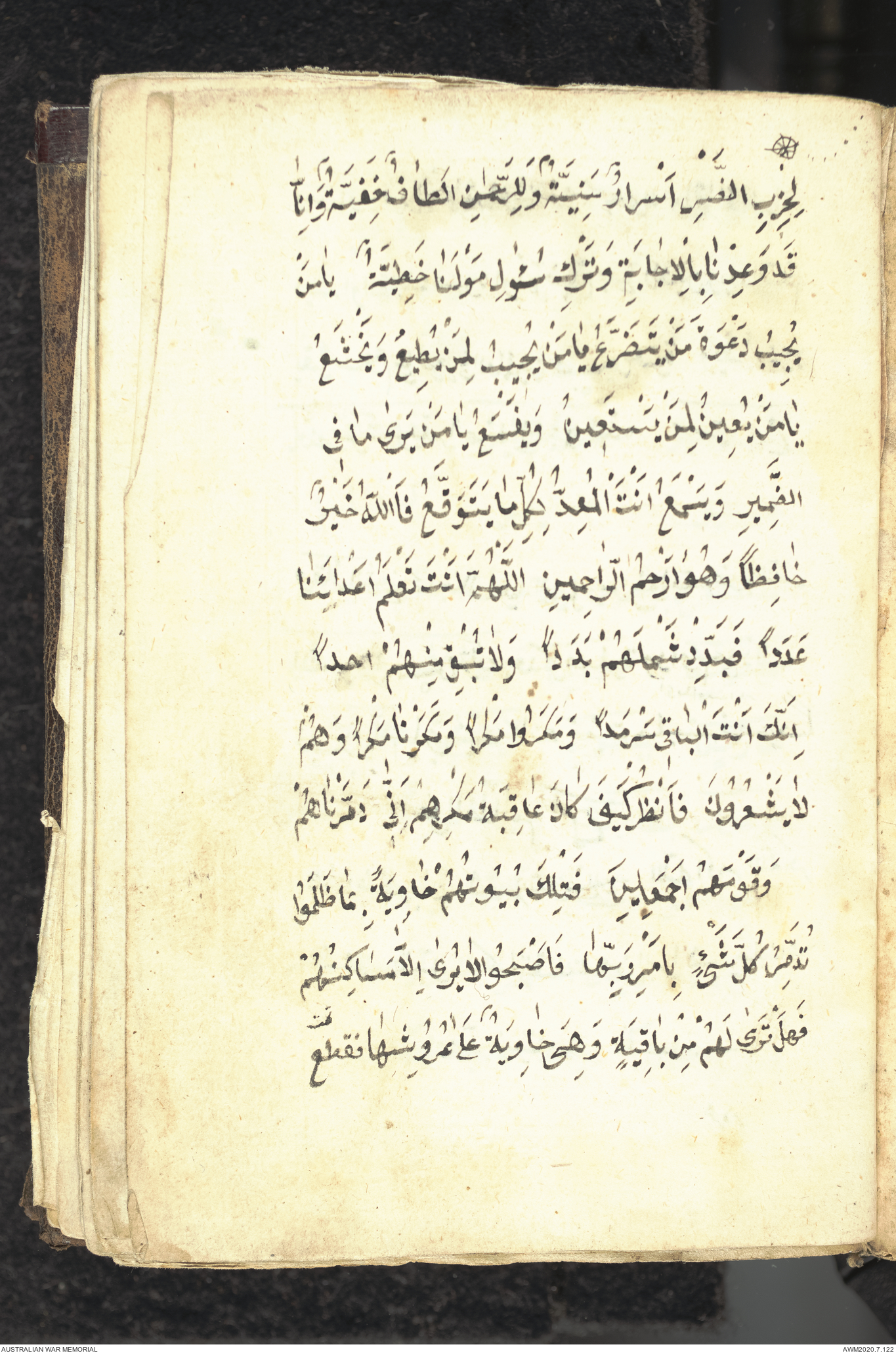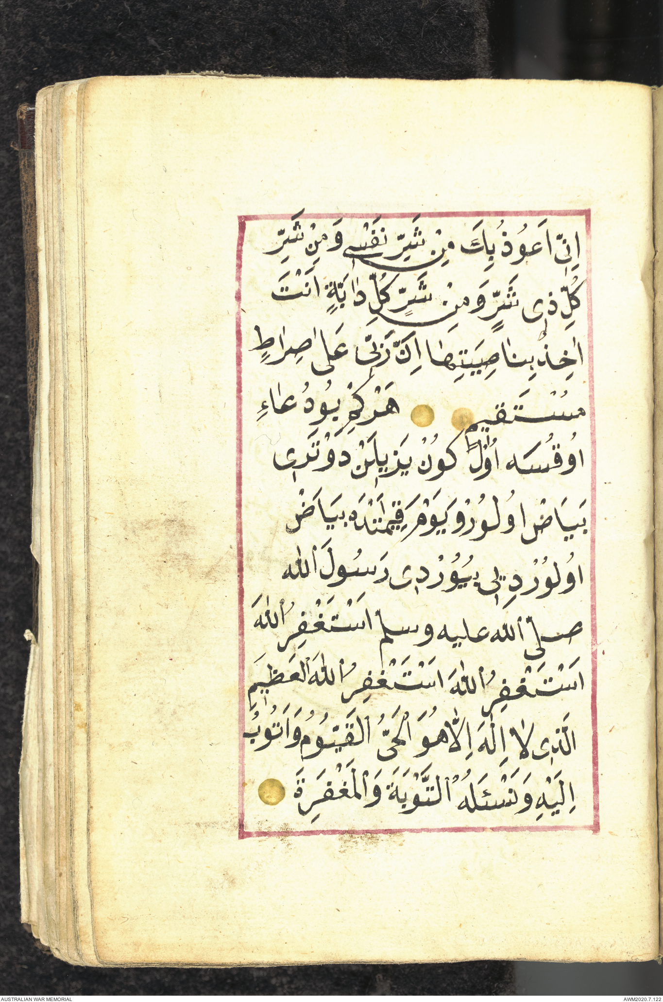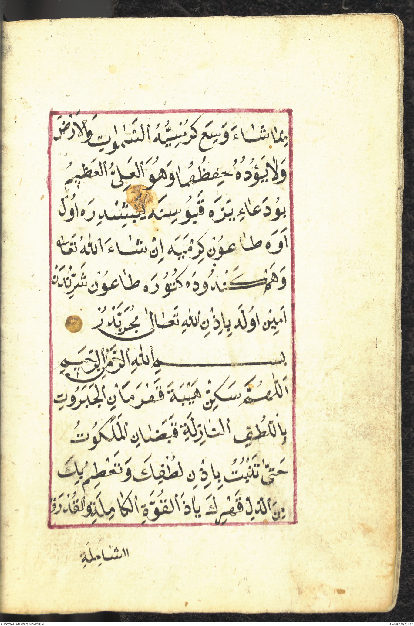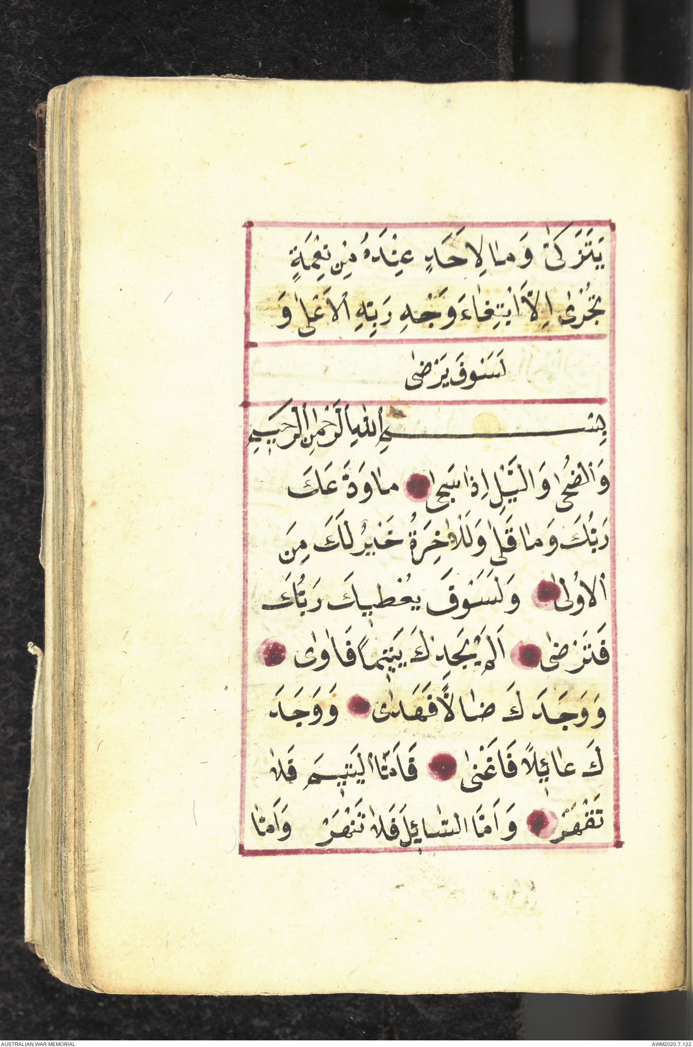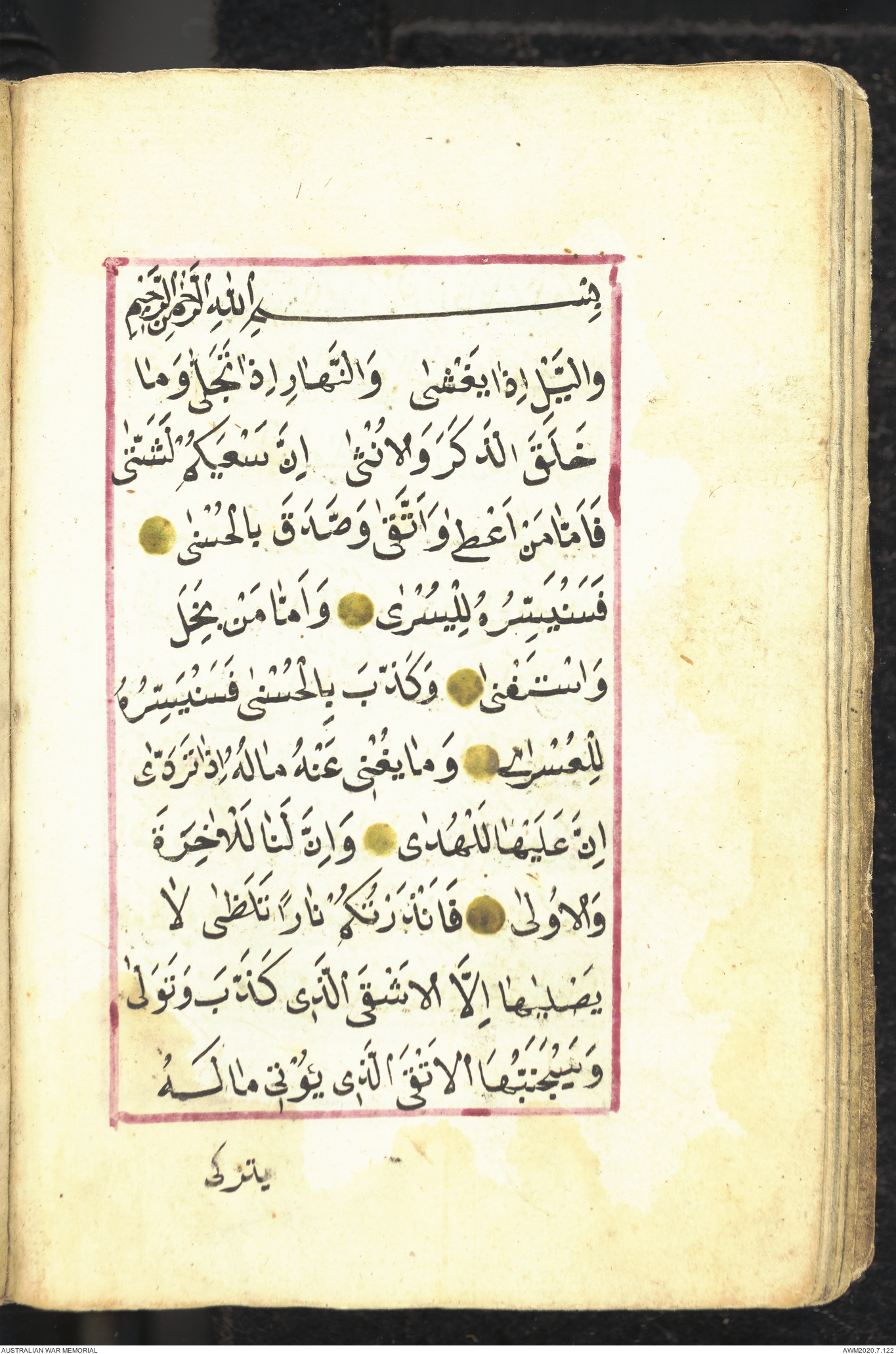 Wallet 1 of 1 - Collection consists of one brown and maroon leather covered Arabic prayer book. The book was collected by Lieutenant Colonel Stanley Holm Watson, who recovered it from the body of a dead Turkish soldier during the 8-hour ceasefire called between Allied and Ottoman Forces on 24 May 1915 in order to recover their dead and wounded from no man's land.