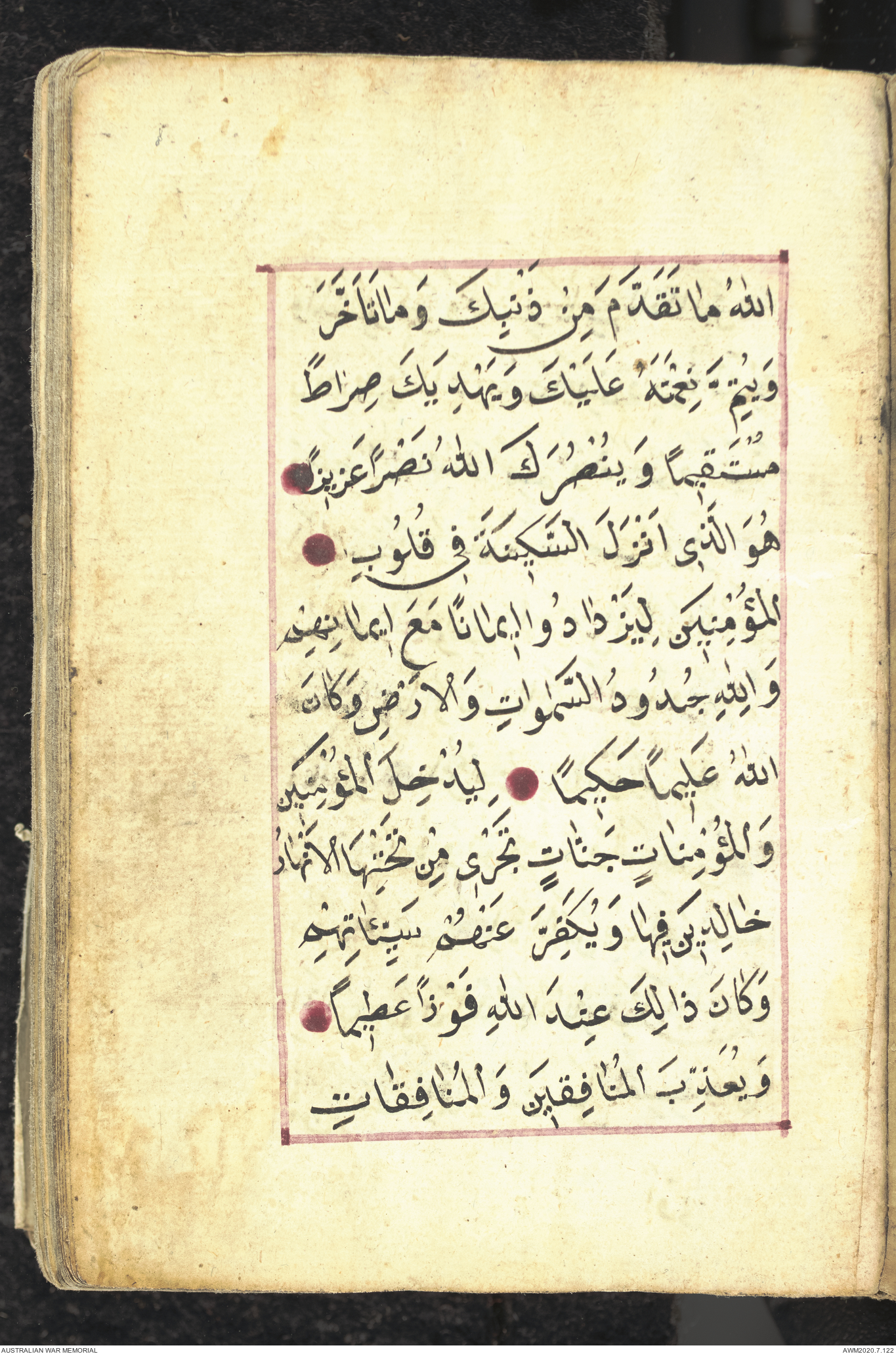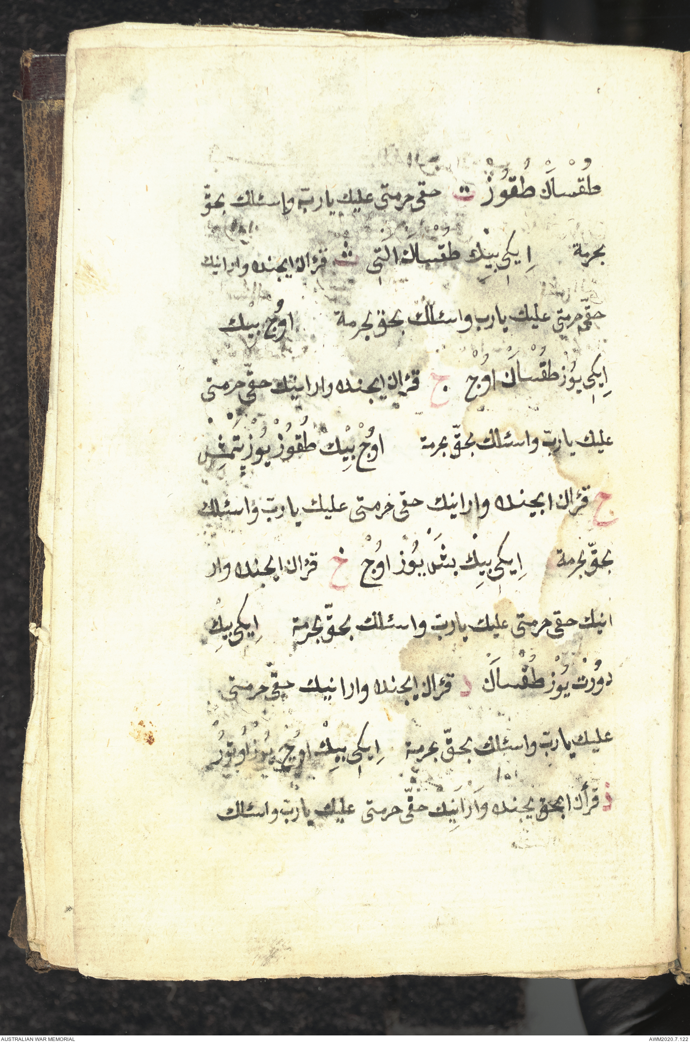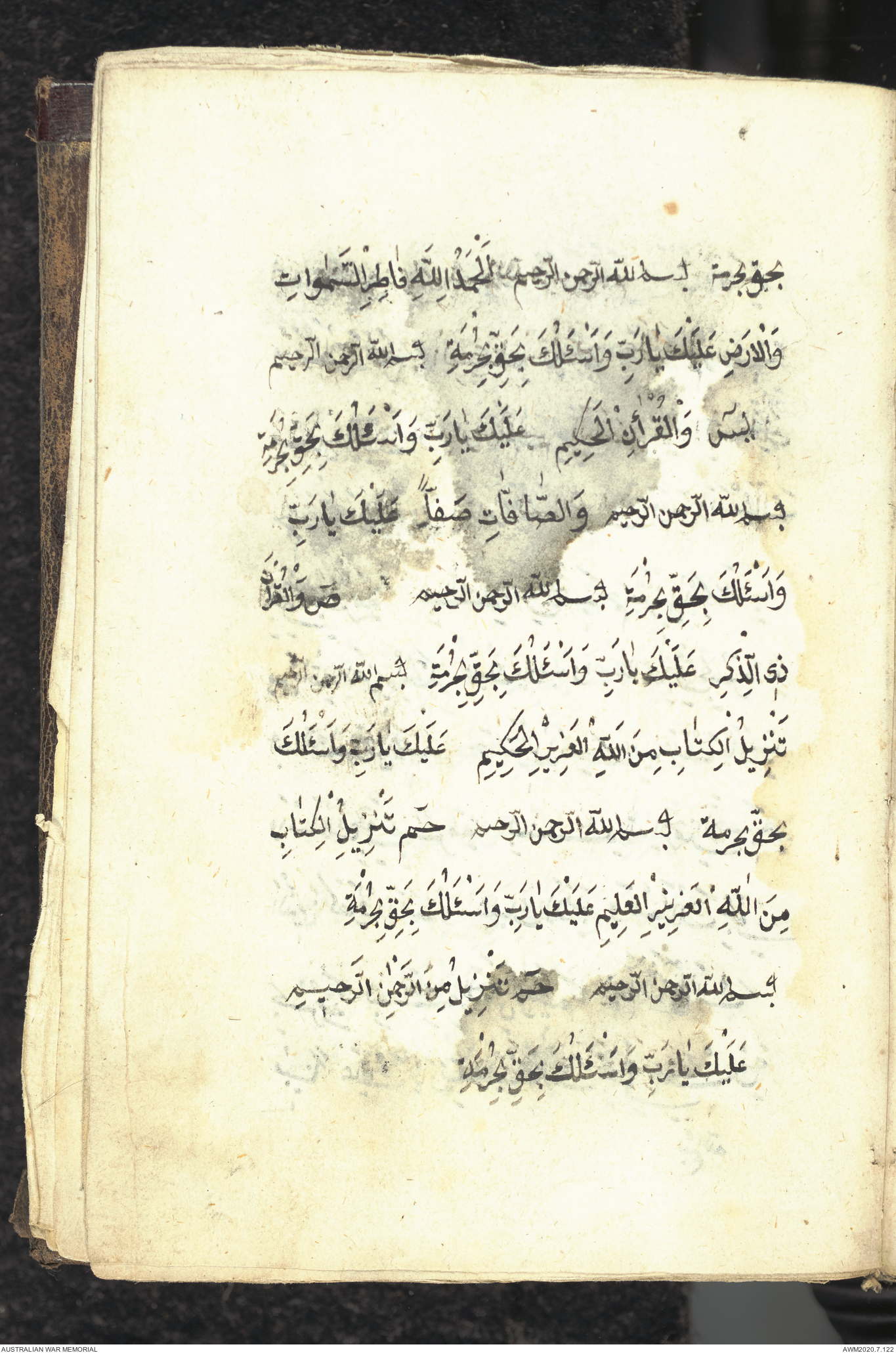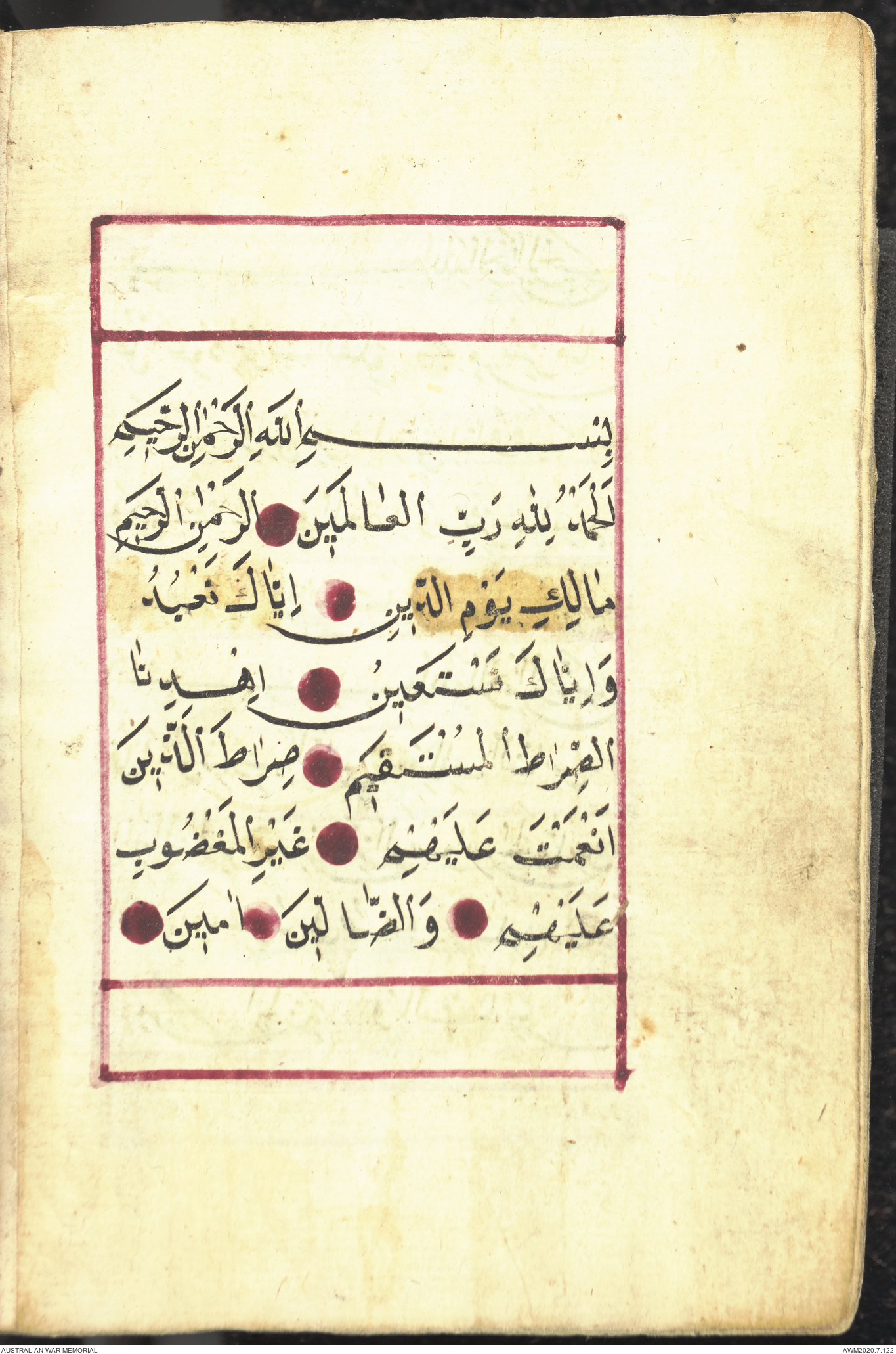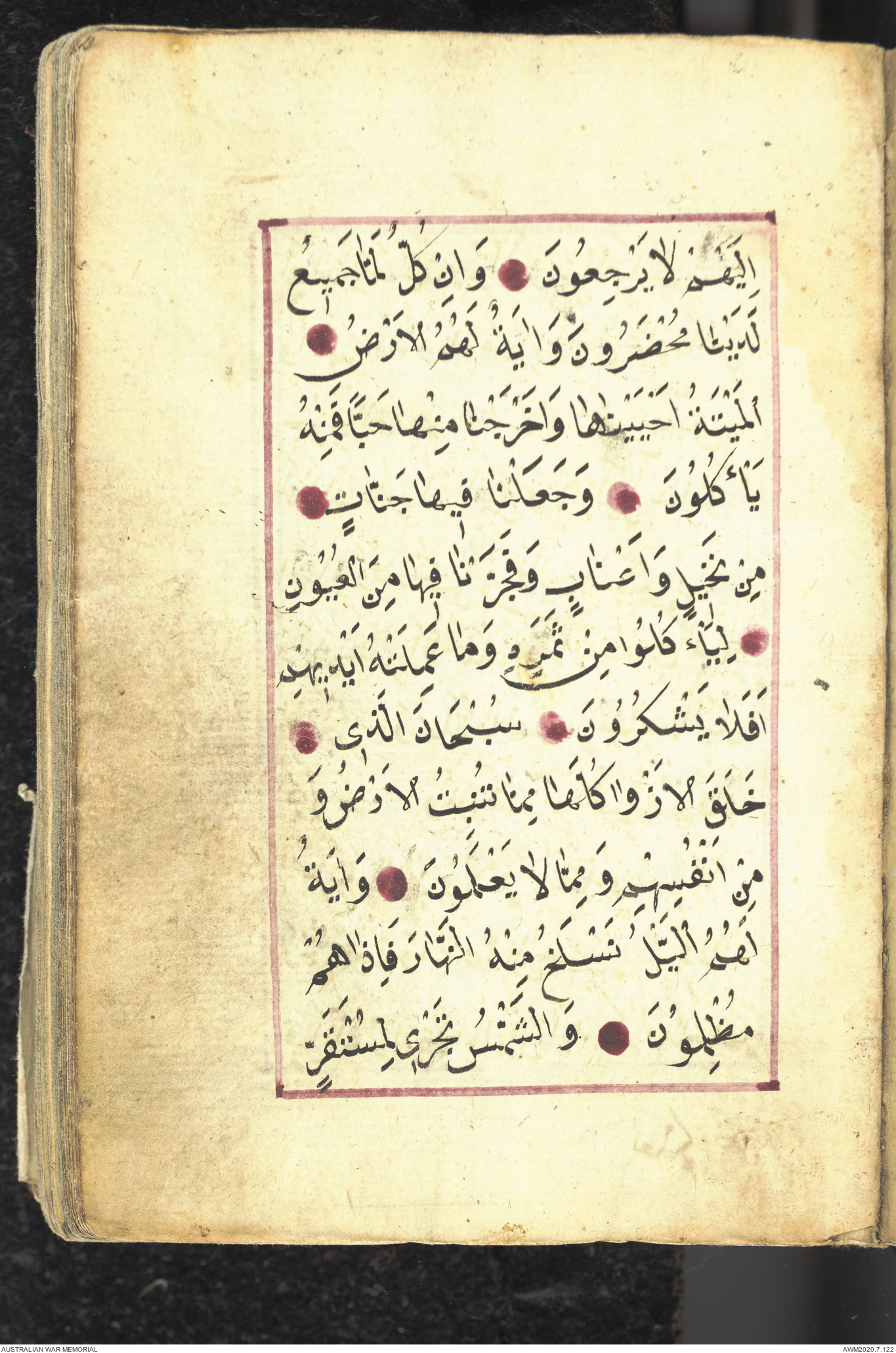 Wallet 1 of 1 - Collection consists of one brown and maroon leather covered Arabic prayer book. The book was collected by Lieutenant Colonel Stanley Holm Watson, who recovered it from the body of a dead Turkish soldier during the 8-hour ceasefire called between Allied and Ottoman Forces on 24 May 1915 in order to recover their dead and wounded from no man's land.
