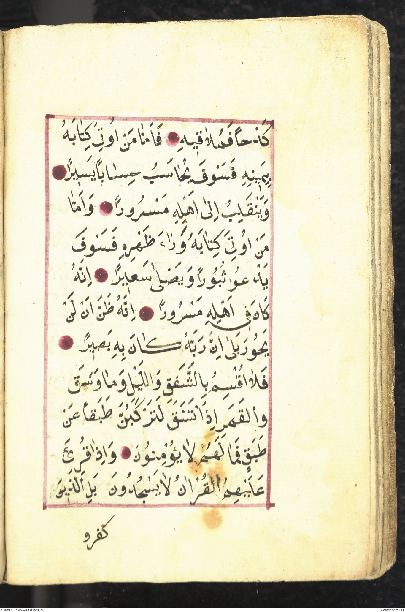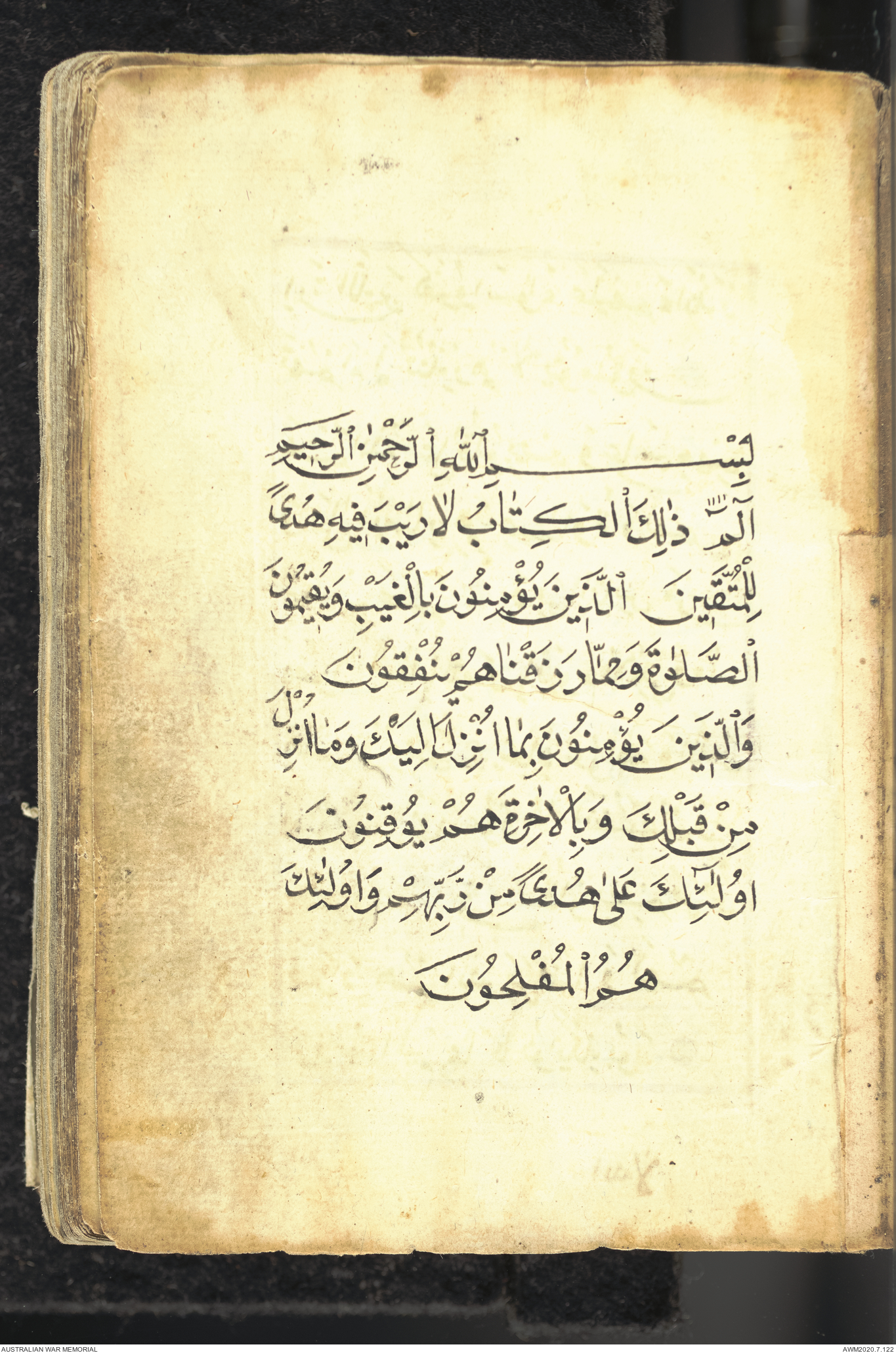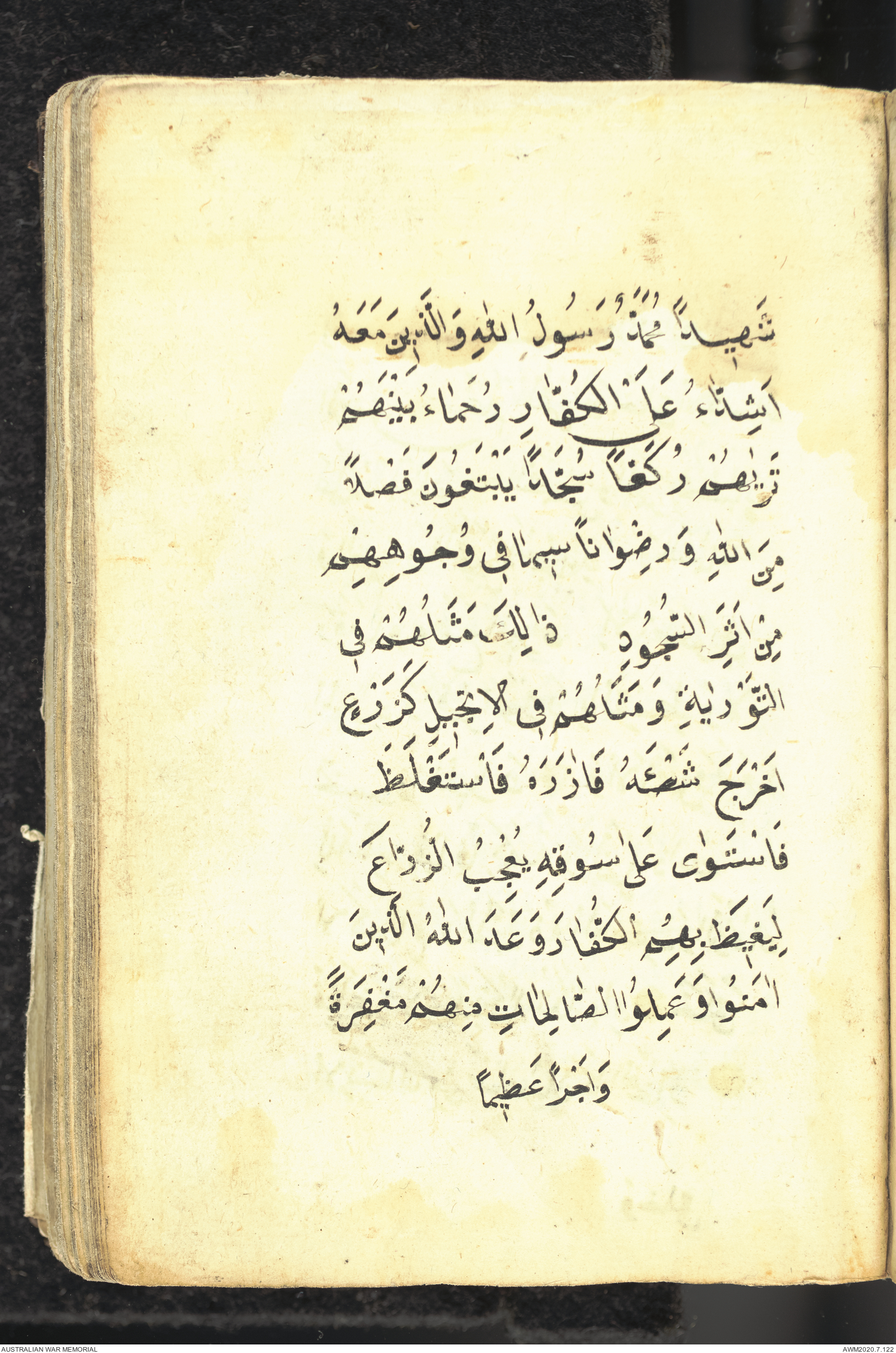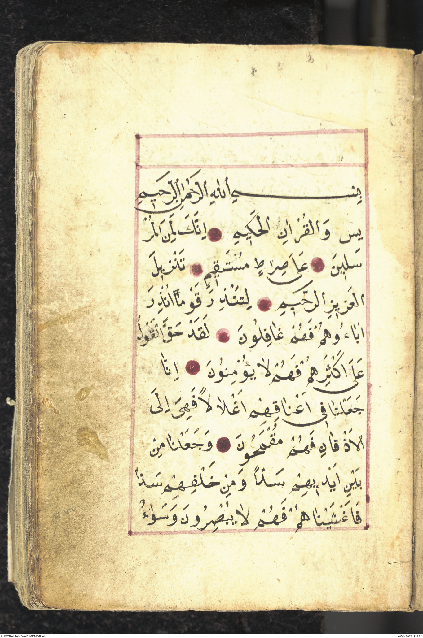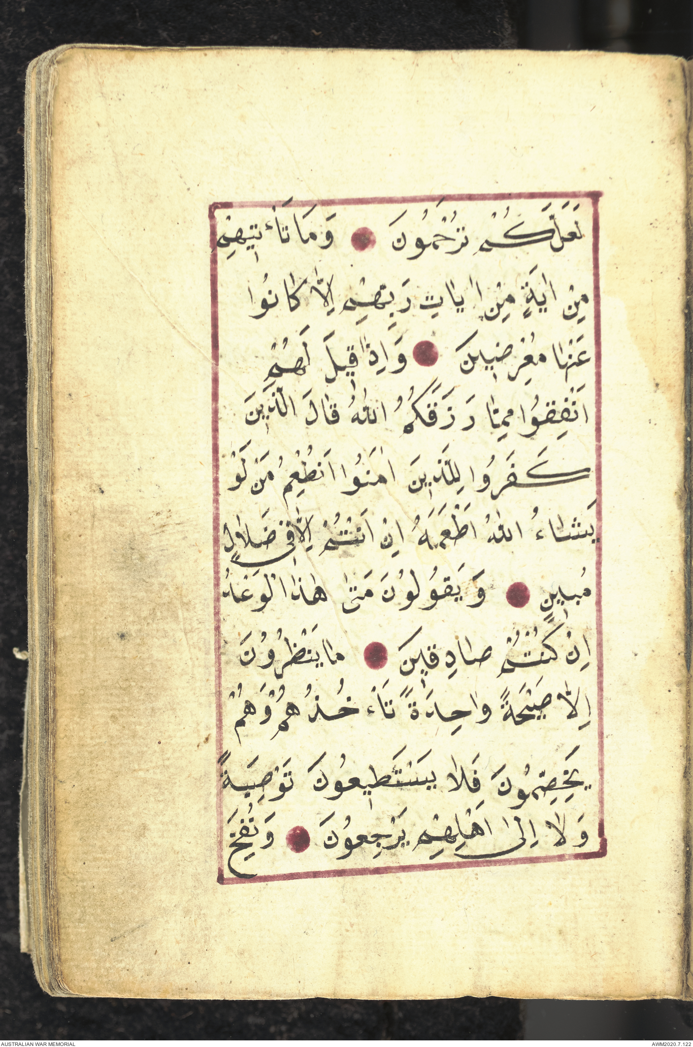 Wallet 1 of 1 - Collection consists of one brown and maroon leather covered Arabic prayer book. The book was collected by Lieutenant Colonel Stanley Holm Watson, who recovered it from the body of a dead Turkish soldier during the 8-hour ceasefire called between Allied and Ottoman Forces on 24 May 1915 in order to recover their dead and wounded from no man's land.