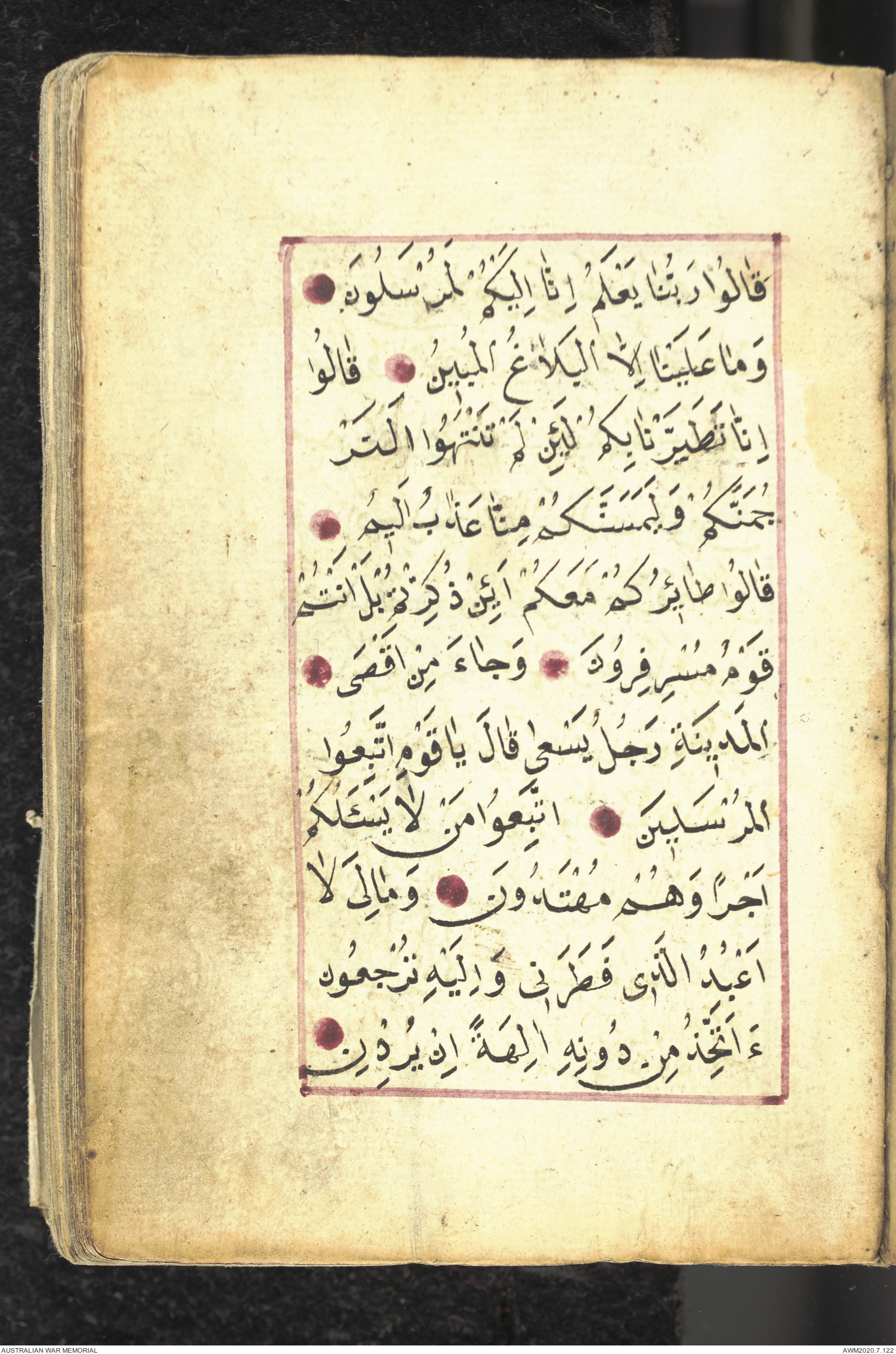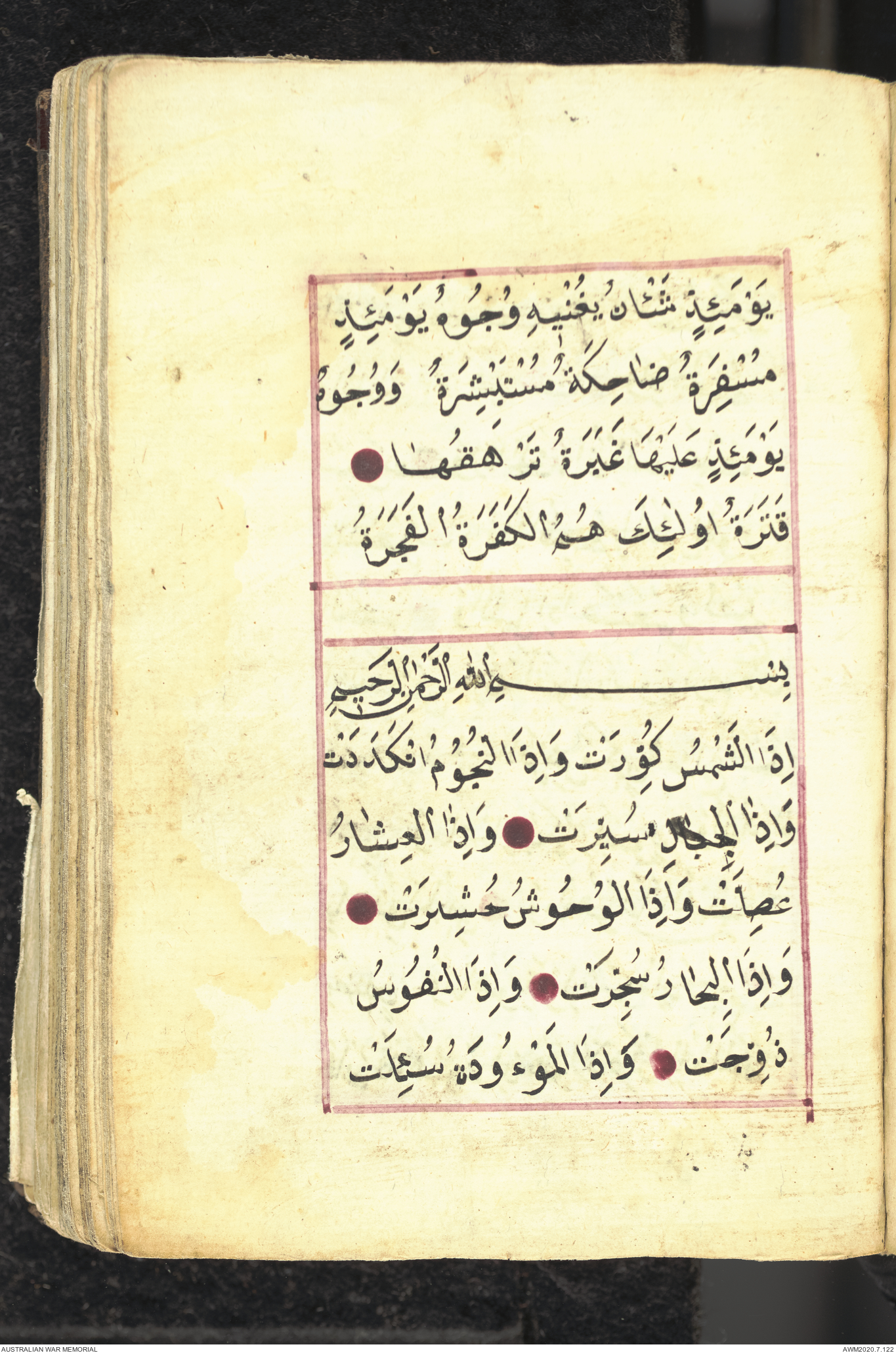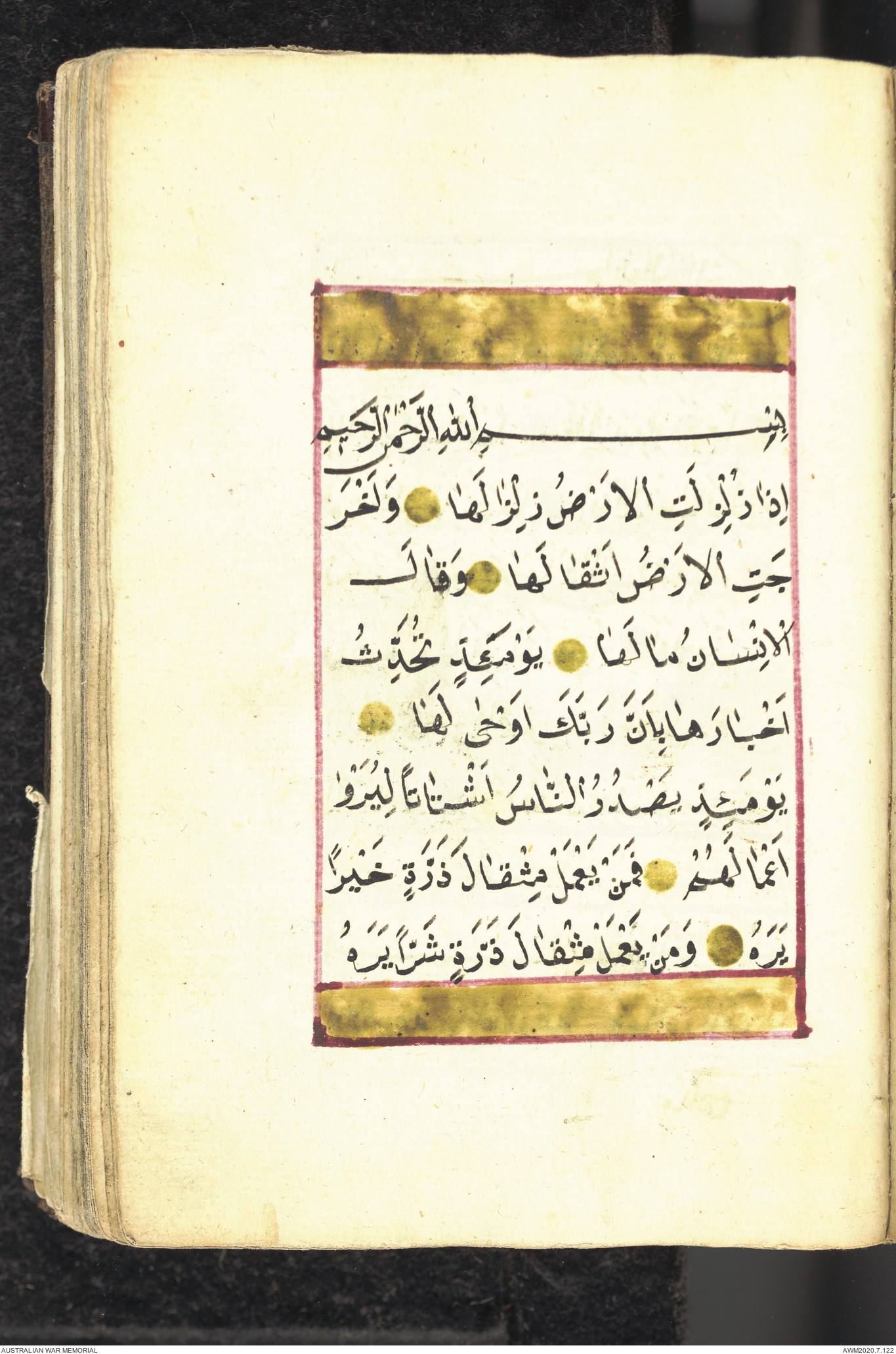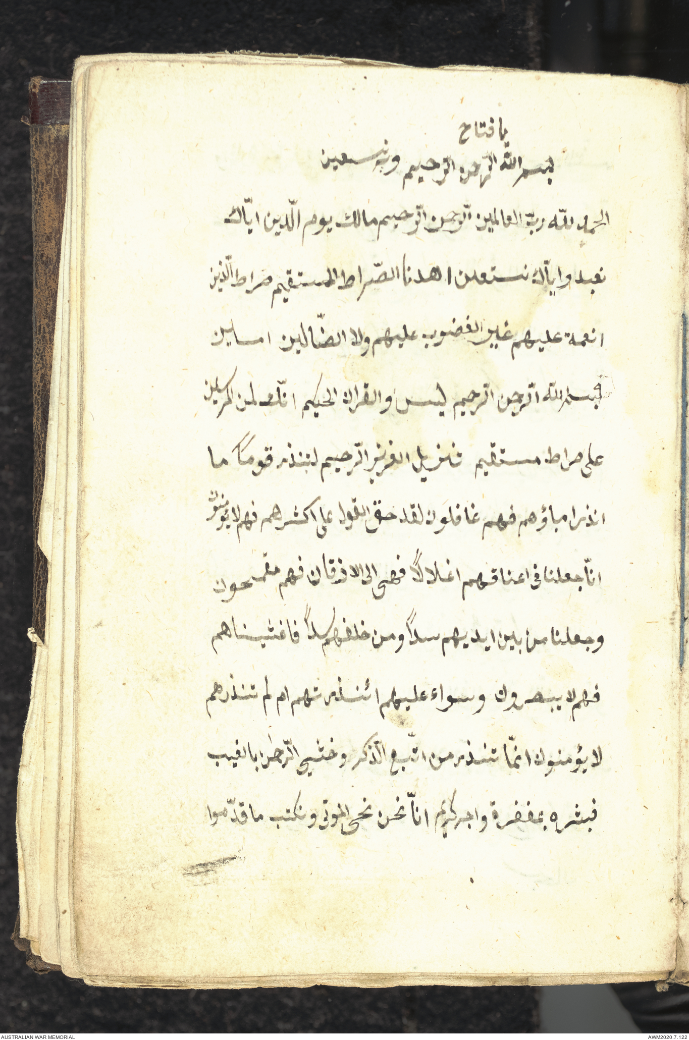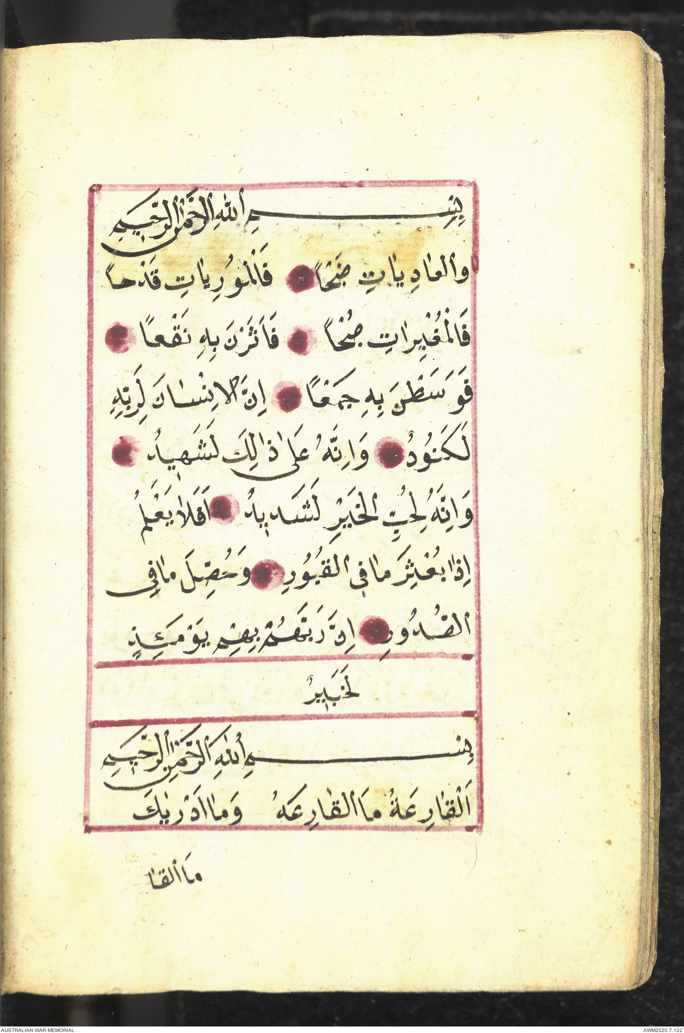 Wallet 1 of 1 - Collection consists of one brown and maroon leather covered Arabic prayer book. The book was collected by Lieutenant Colonel Stanley Holm Watson, who recovered it from the body of a dead Turkish soldier during the 8-hour ceasefire called between Allied and Ottoman Forces on 24 May 1915 in order to recover their dead and wounded from no man's land.
