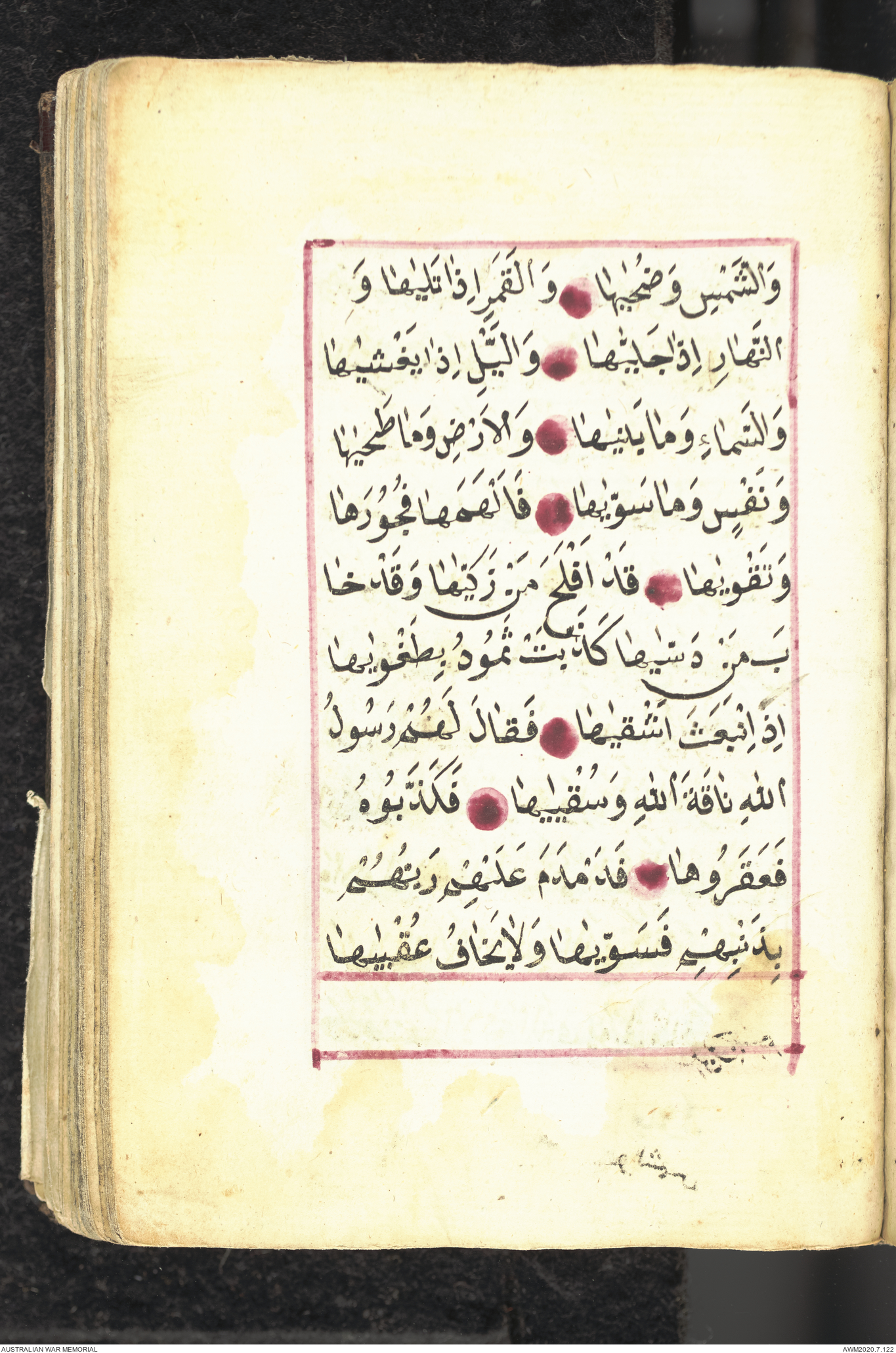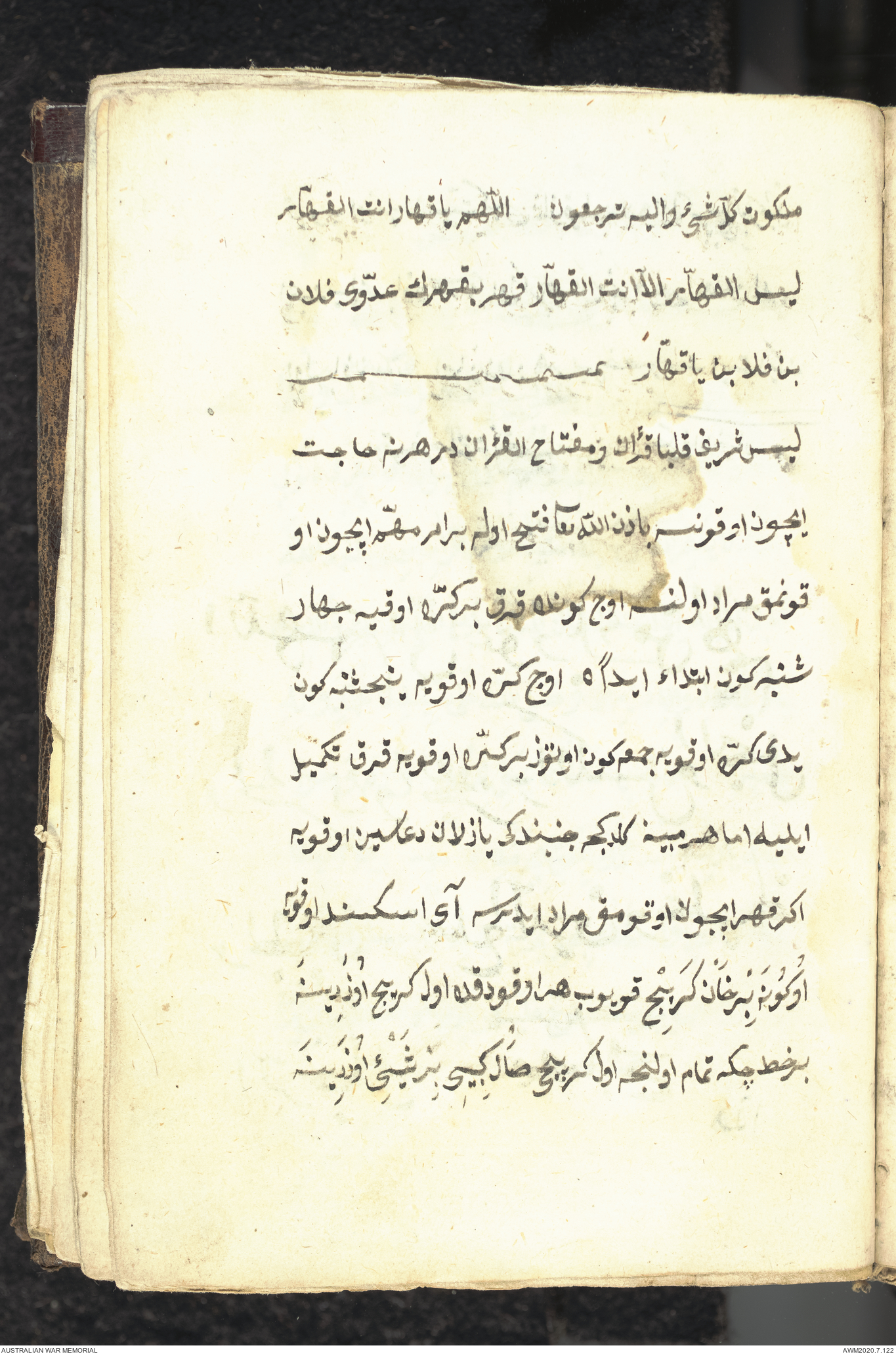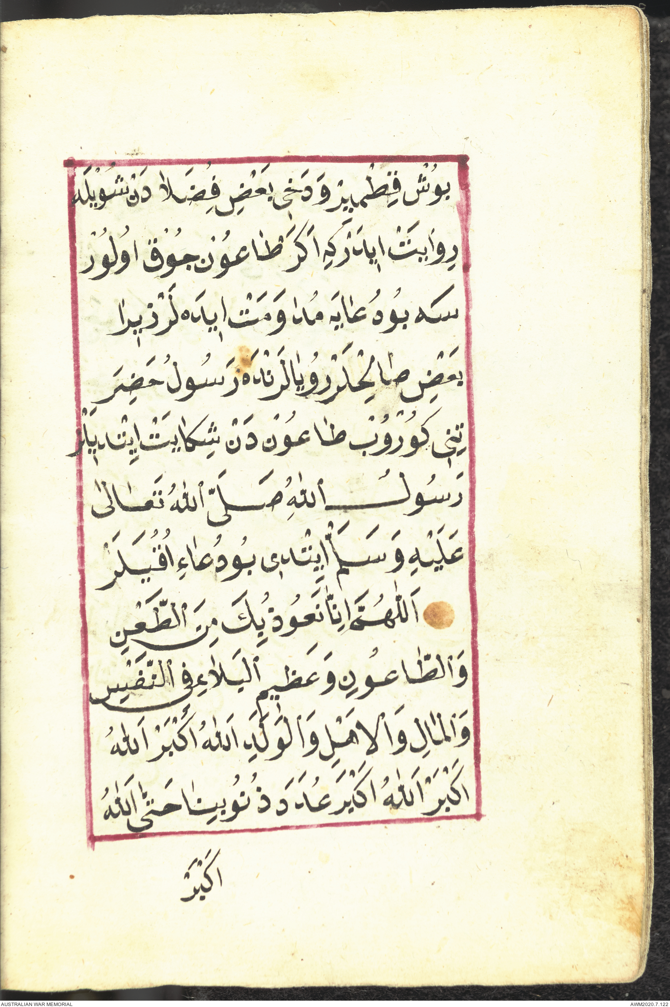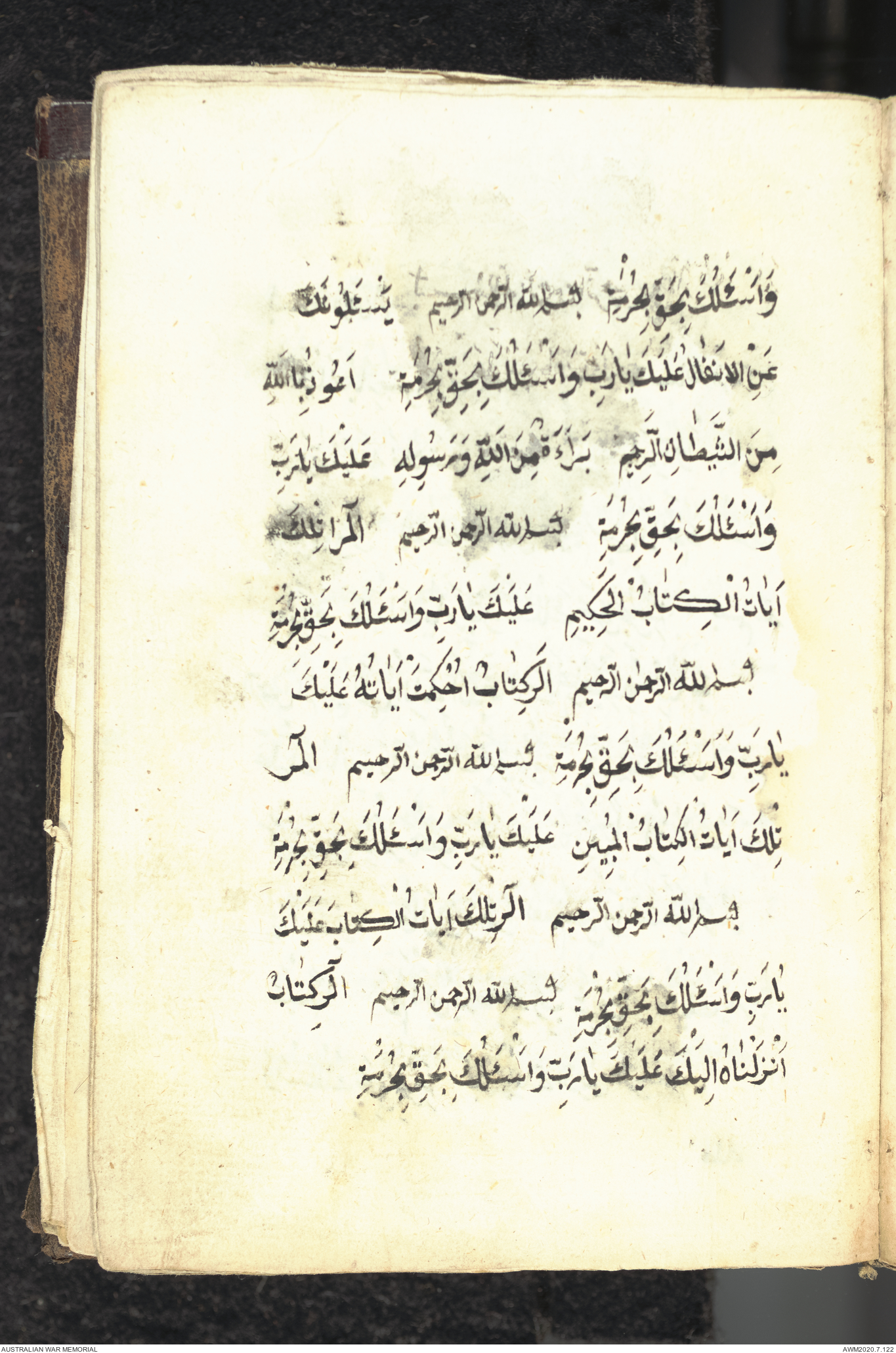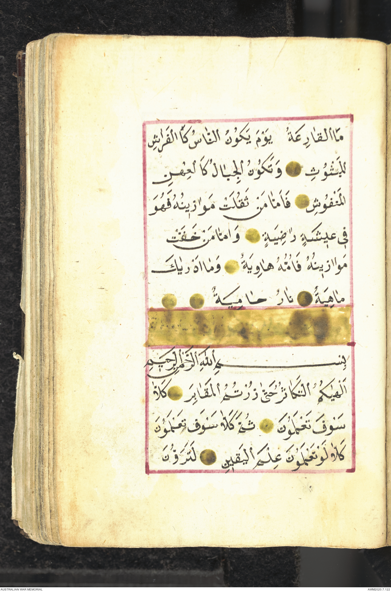 Wallet 1 of 1 - Collection consists of one brown and maroon leather covered Arabic prayer book. The book was collected by Lieutenant Colonel Stanley Holm Watson, who recovered it from the body of a dead Turkish soldier during the 8-hour ceasefire called between Allied and Ottoman Forces on 24 May 1915 in order to recover their dead and wounded from no man's land.