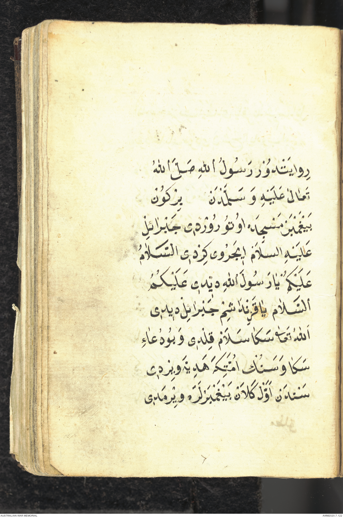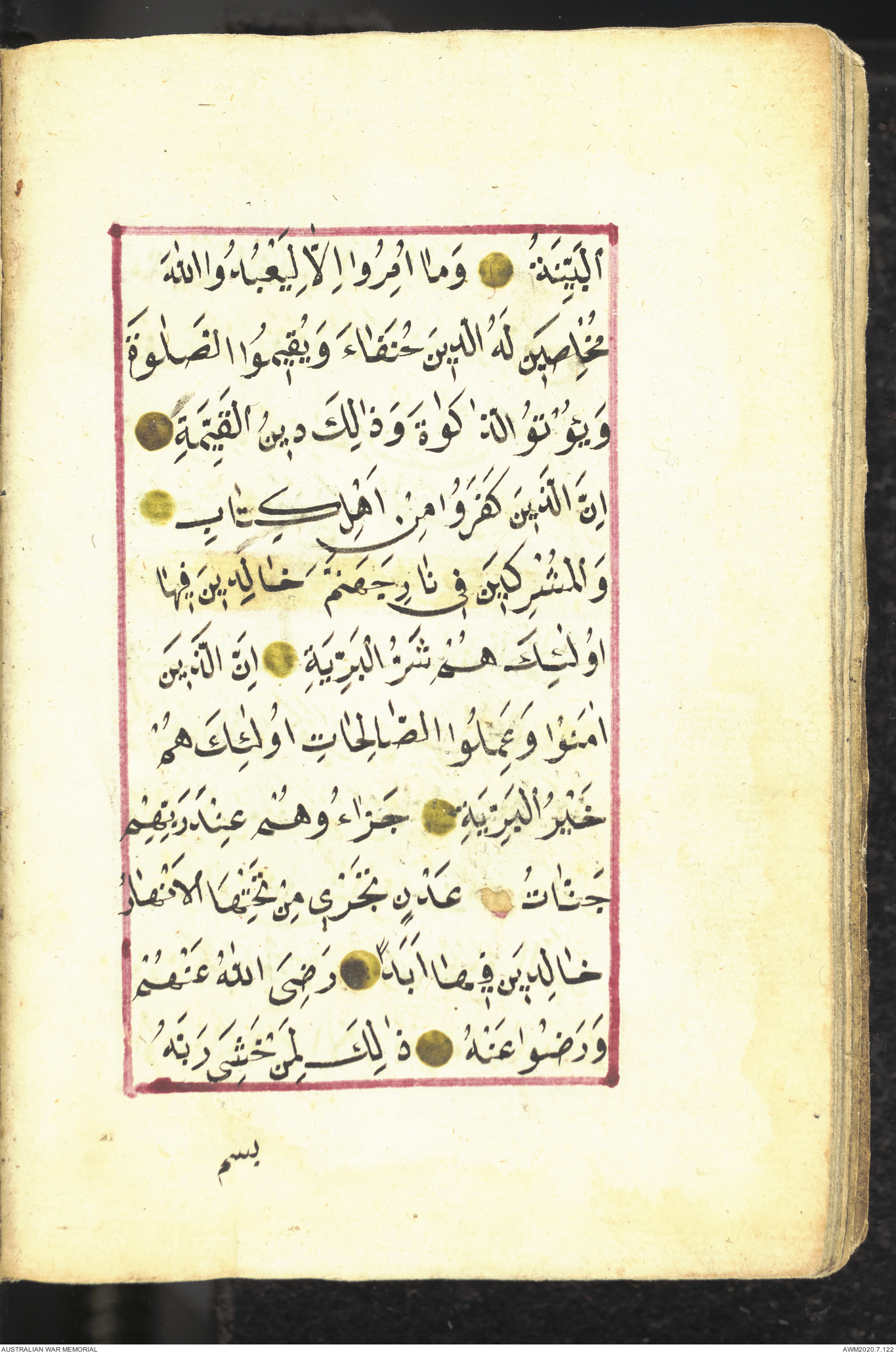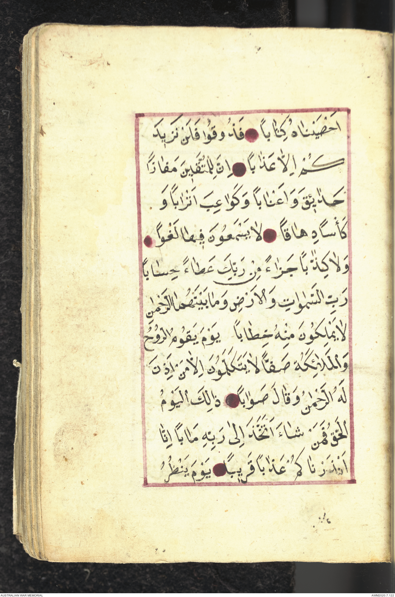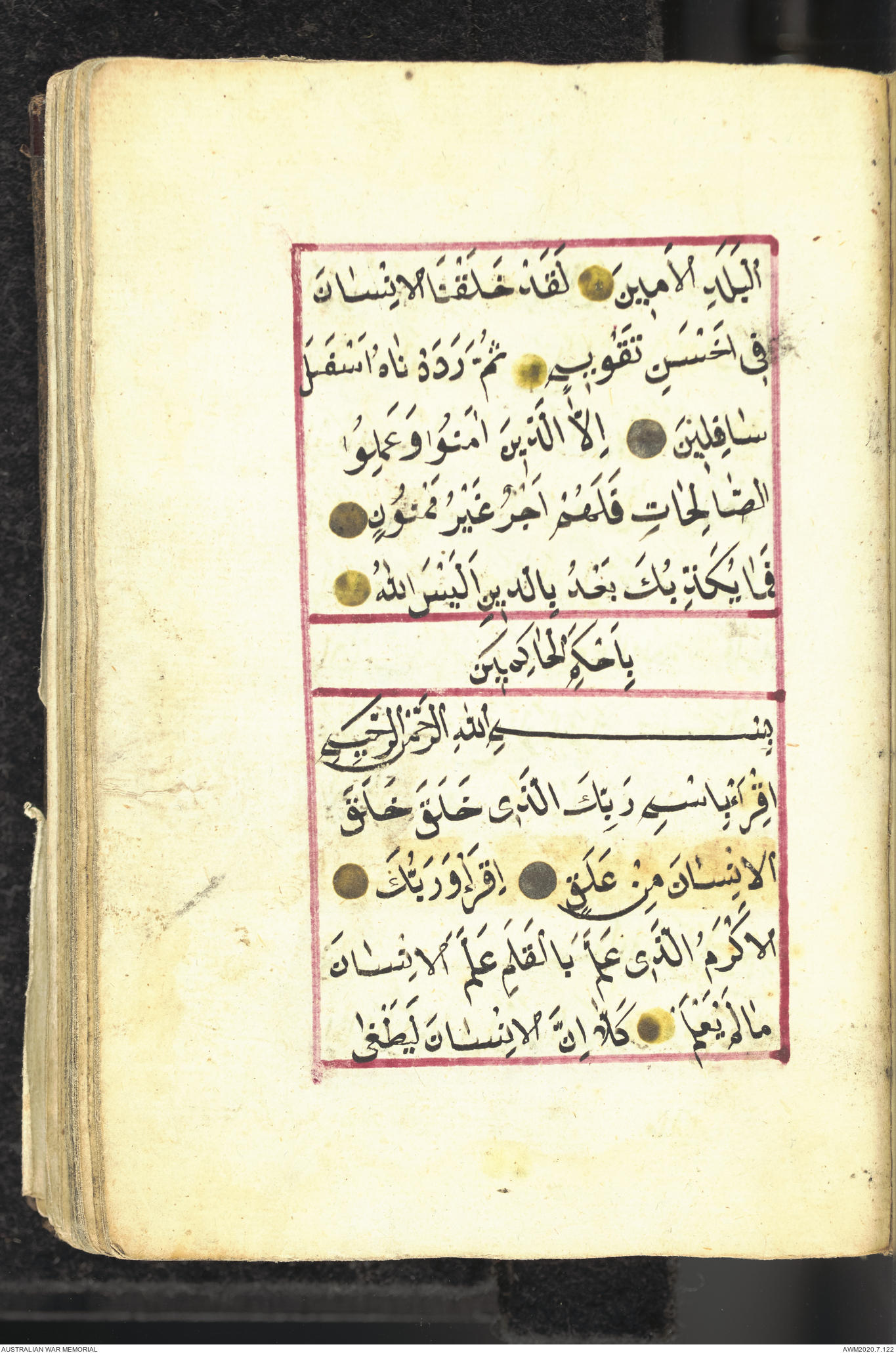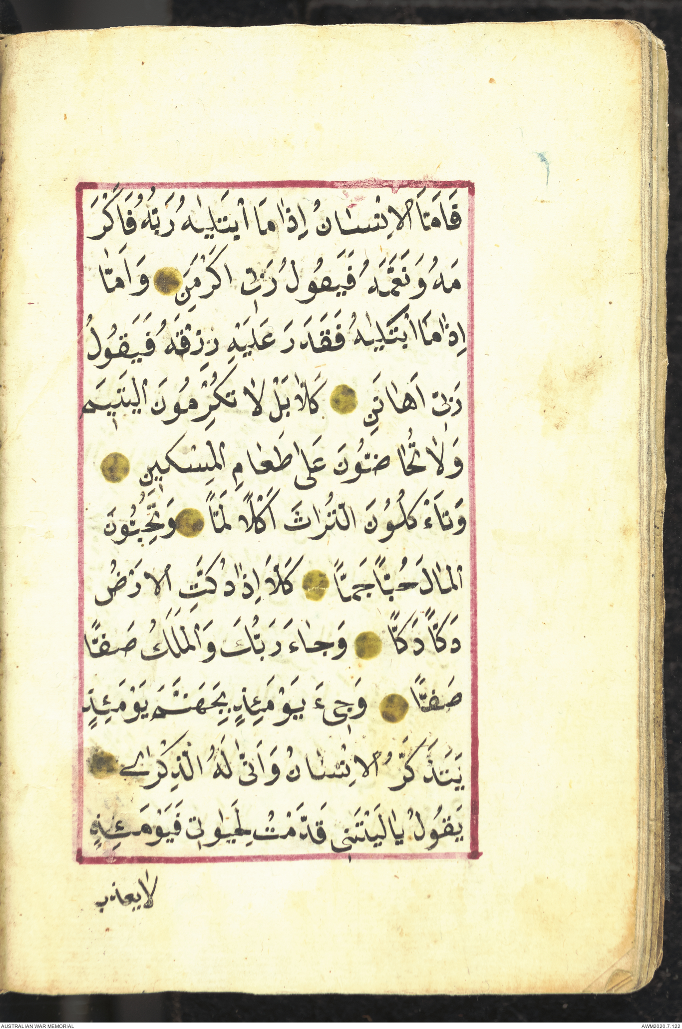 Wallet 1 of 1 - Collection consists of one brown and maroon leather covered Arabic prayer book. The book was collected by Lieutenant Colonel Stanley Holm Watson, who recovered it from the body of a dead Turkish soldier during the 8-hour ceasefire called between Allied and Ottoman Forces on 24 May 1915 in order to recover their dead and wounded from no man's land.