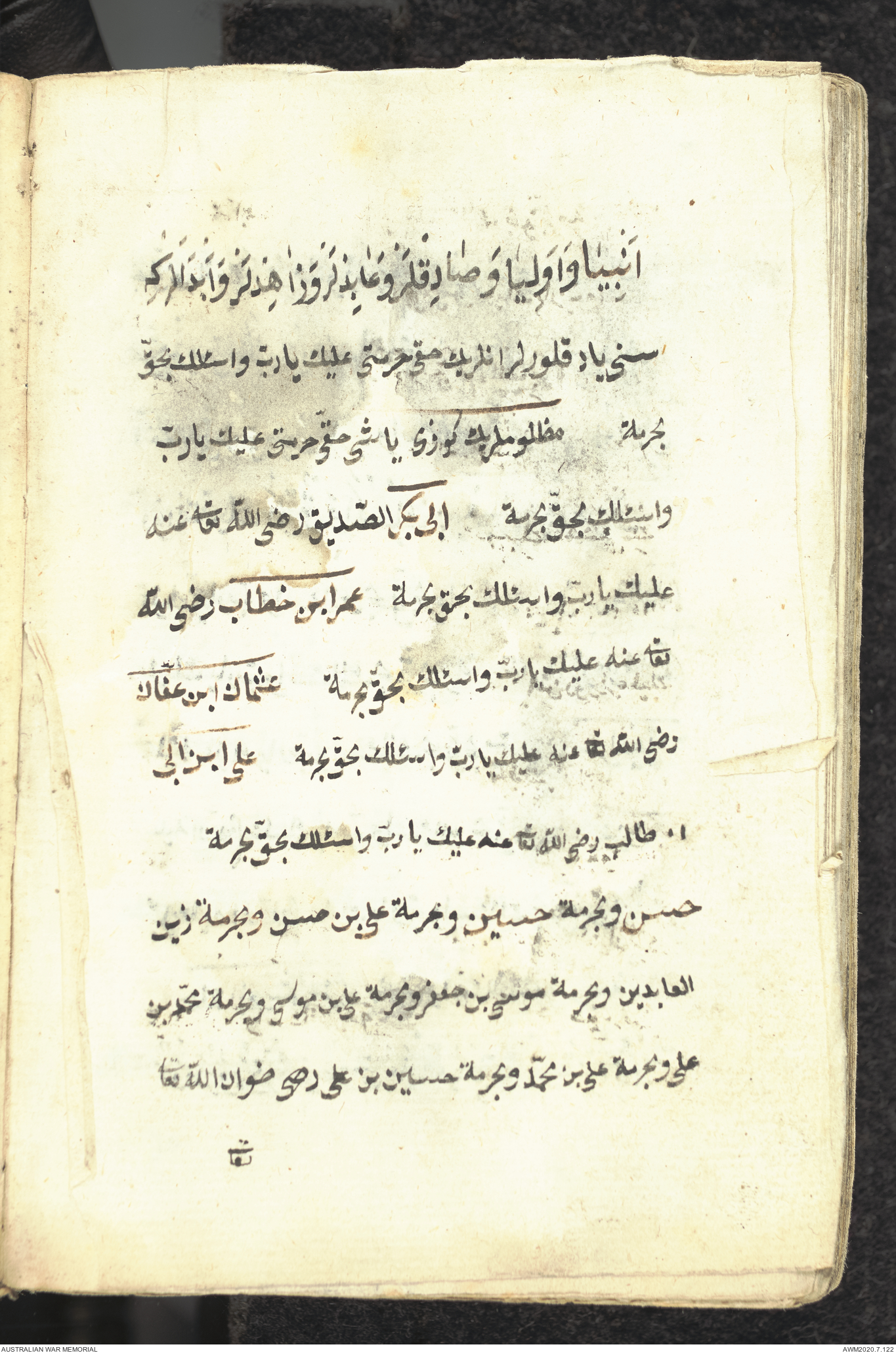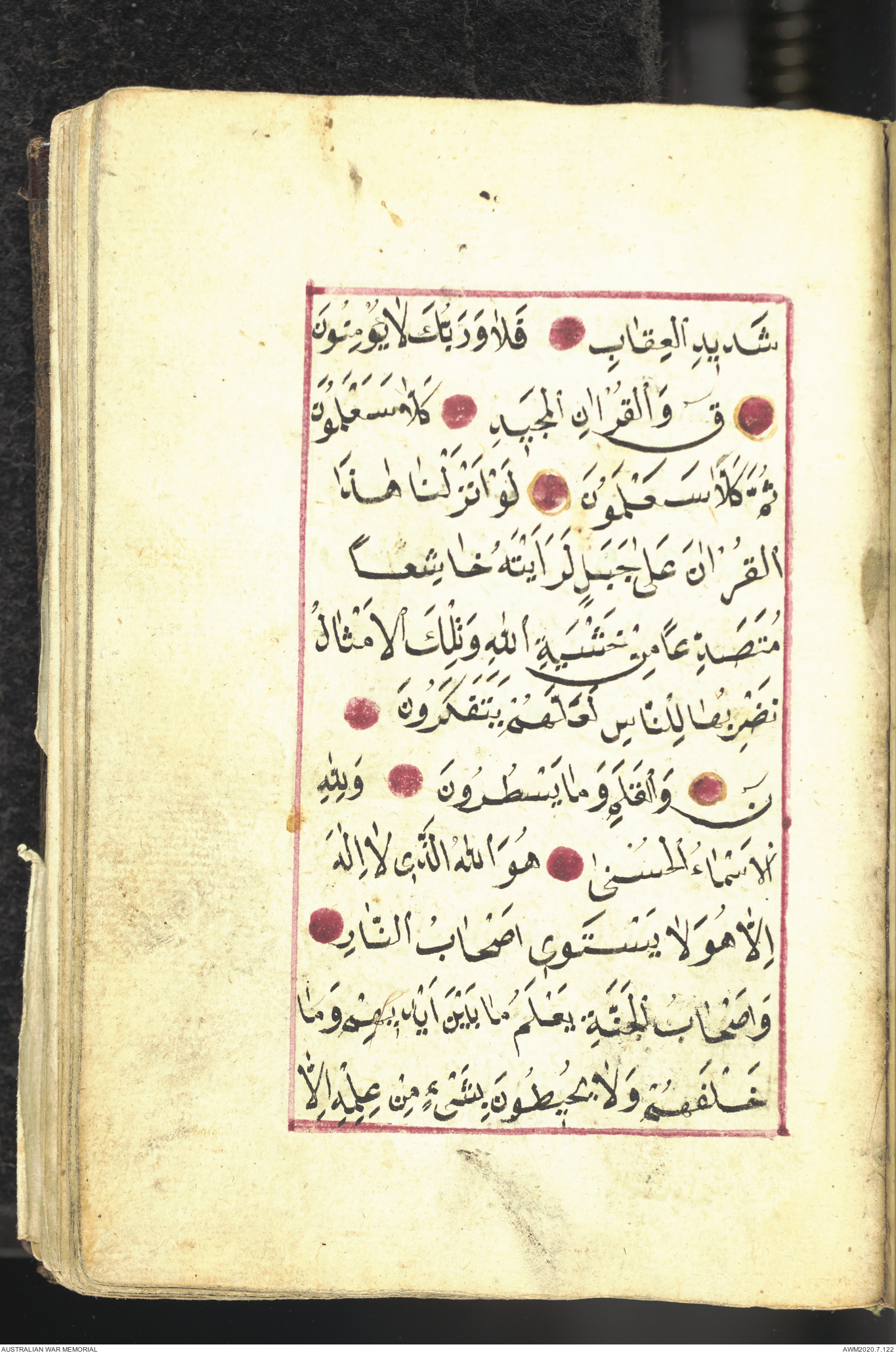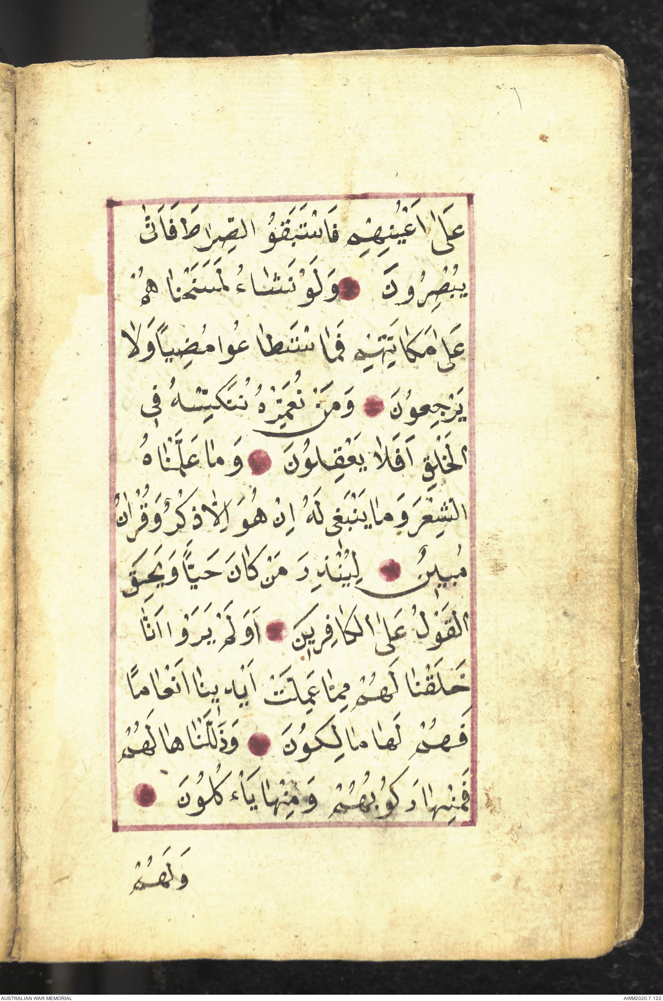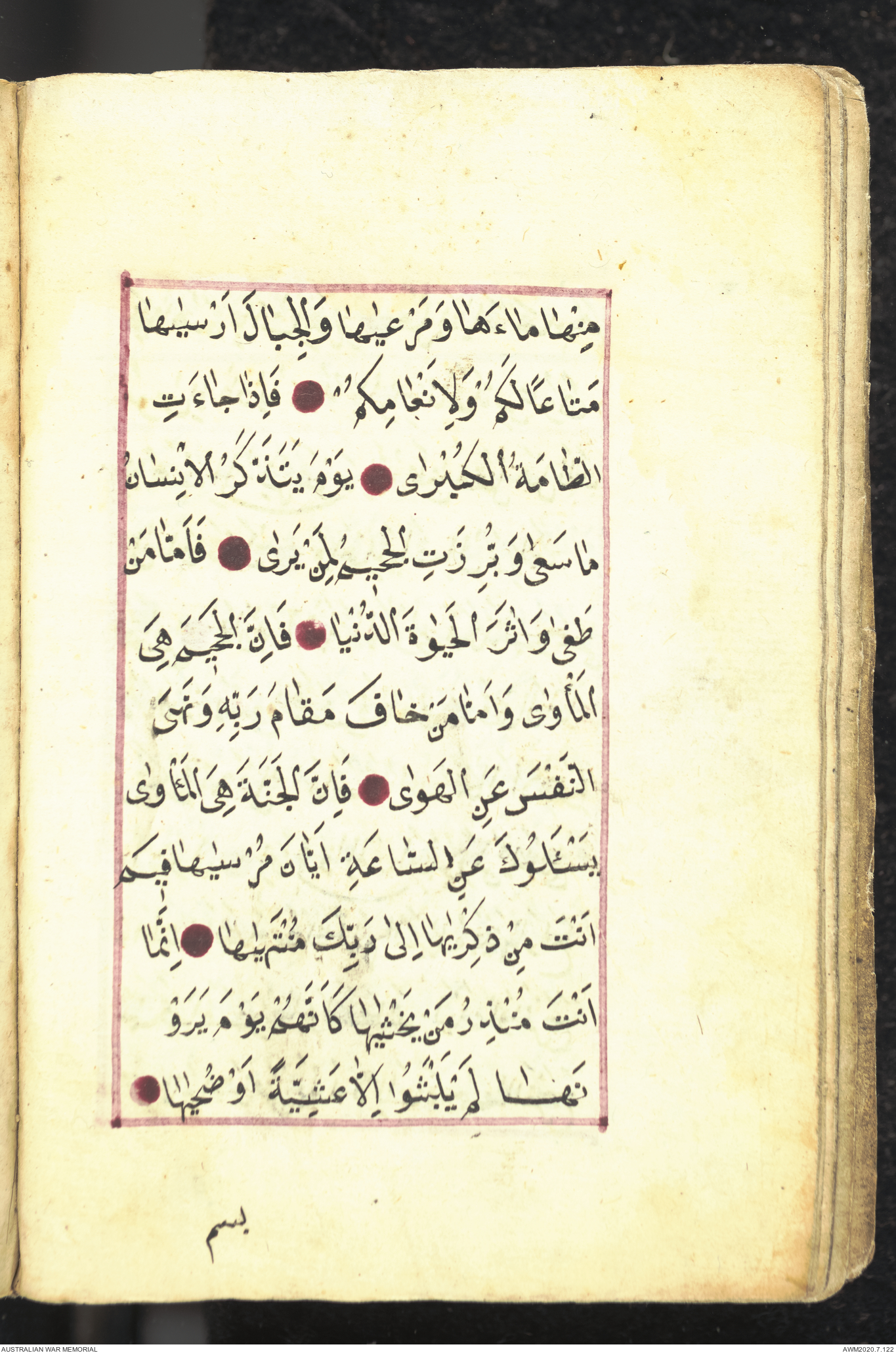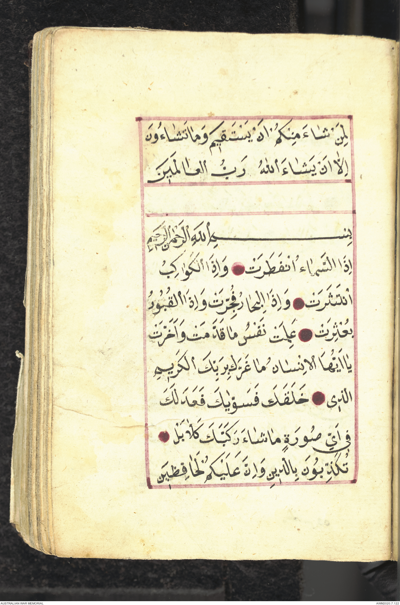 Wallet 1 of 1 - Collection consists of one brown and maroon leather covered Arabic prayer book. The book was collected by Lieutenant Colonel Stanley Holm Watson, who recovered it from the body of a dead Turkish soldier during the 8-hour ceasefire called between Allied and Ottoman Forces on 24 May 1915 in order to recover their dead and wounded from no man's land.