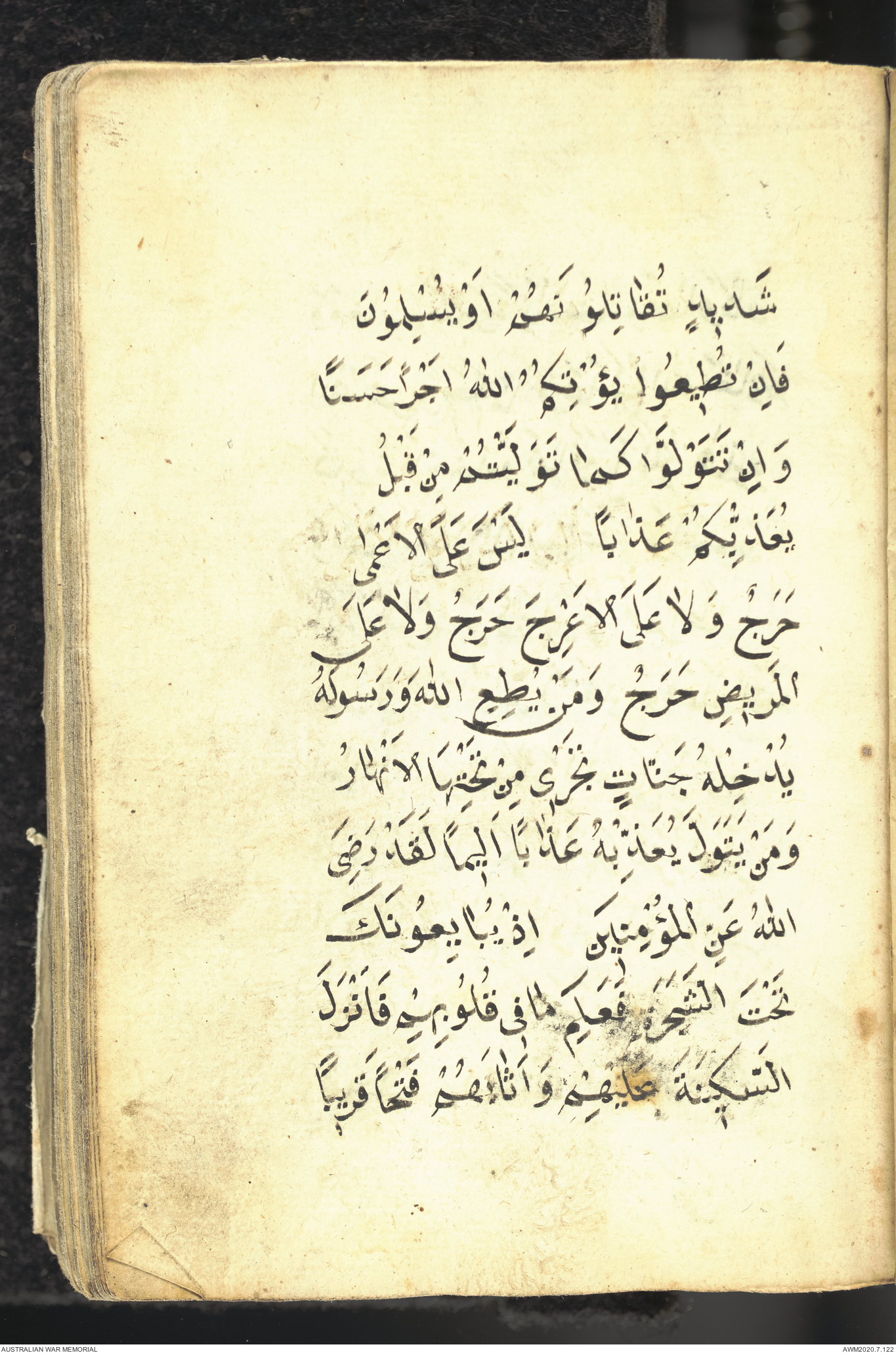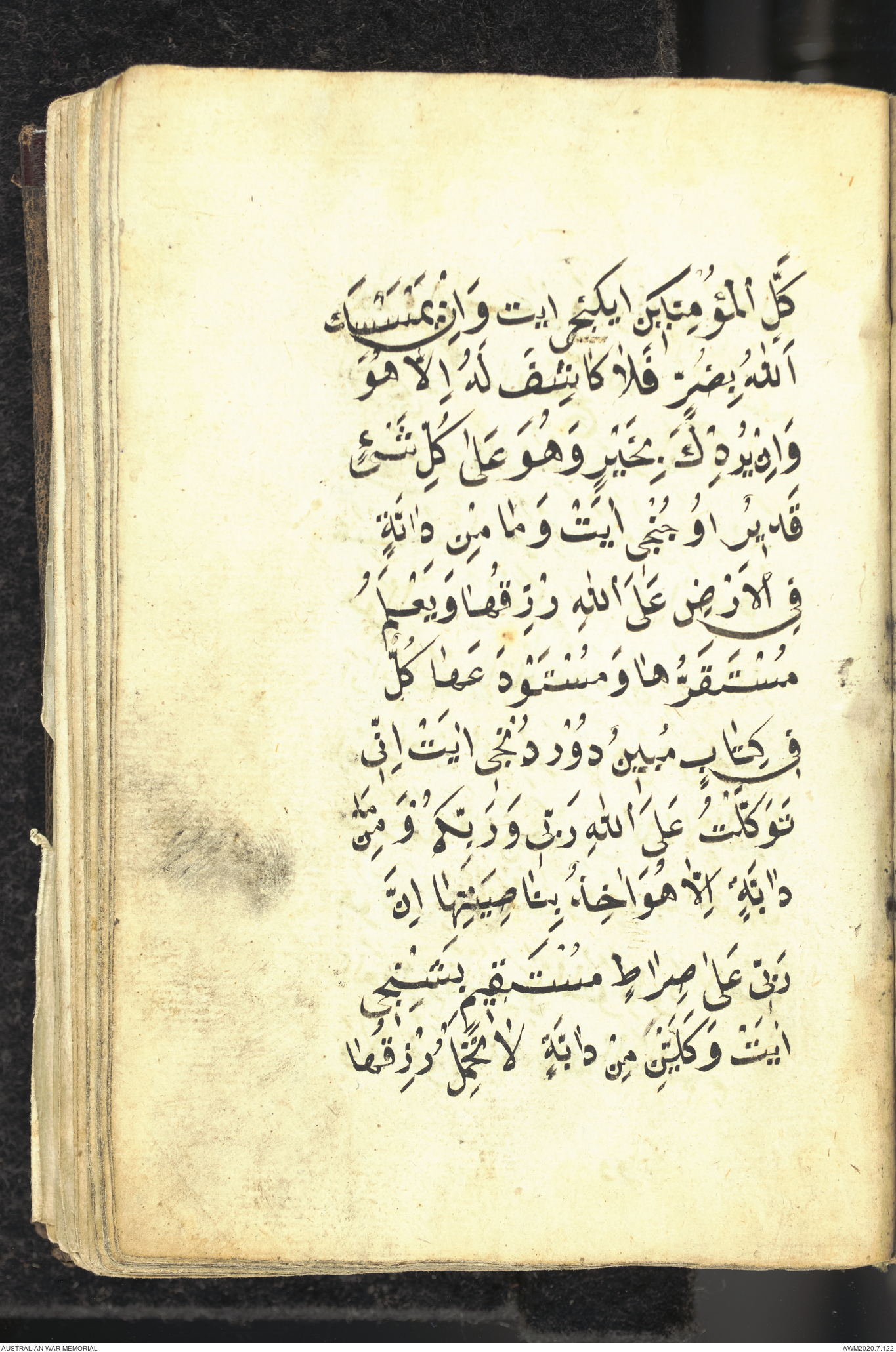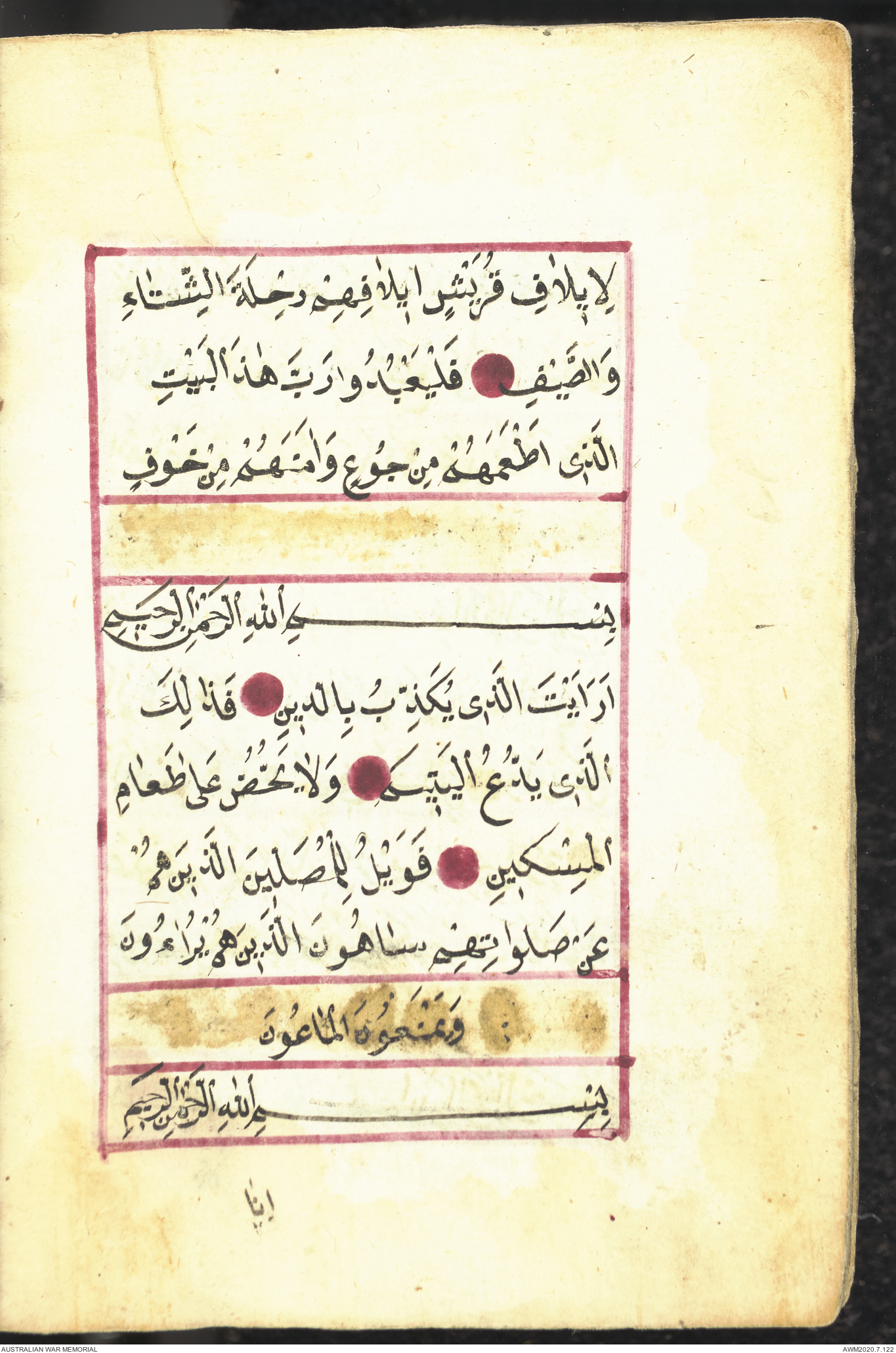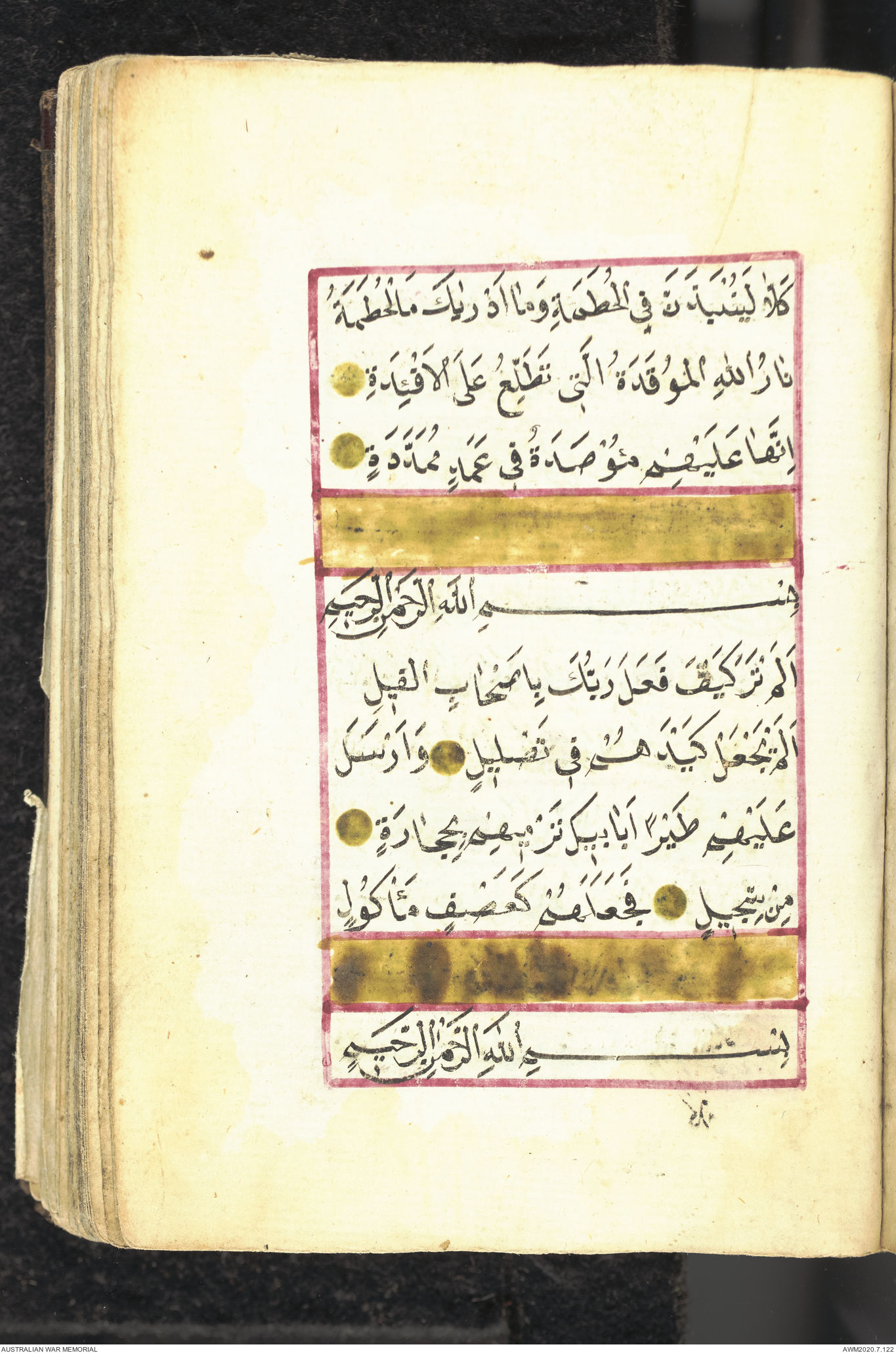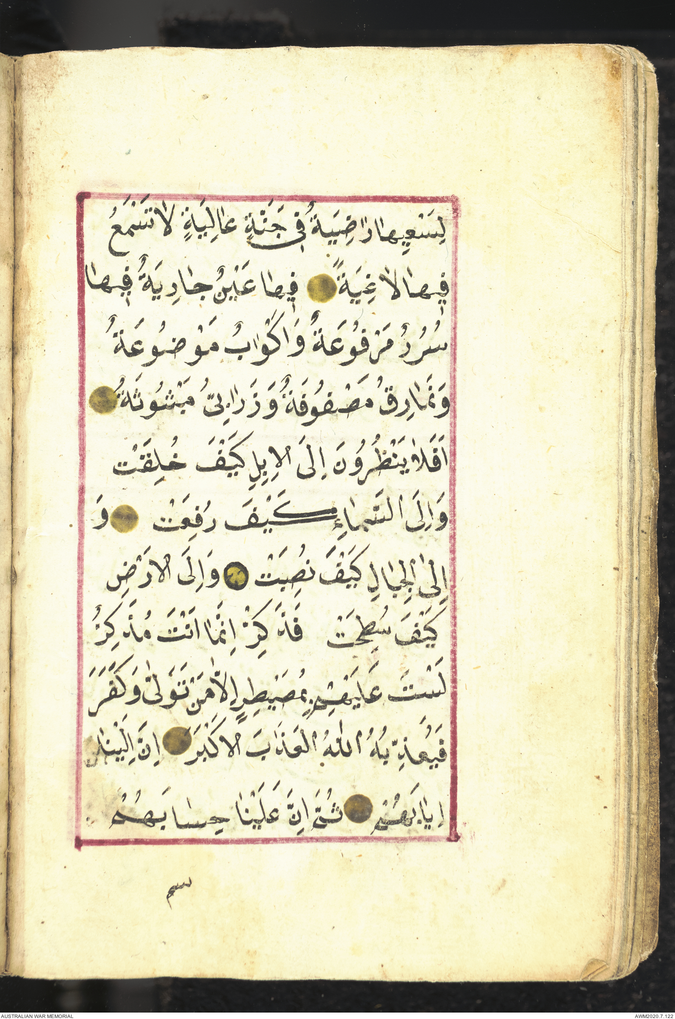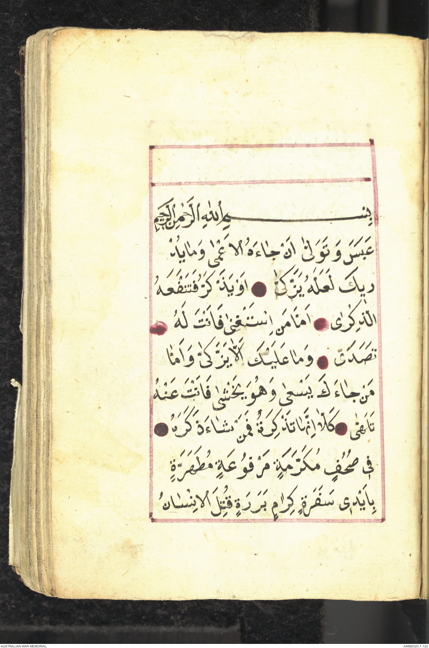 Wallet 1 of 1 - Collection consists of one brown and maroon leather covered Arabic prayer book. The book was collected by Lieutenant Colonel Stanley Holm Watson, who recovered it from the body of a dead Turkish soldier during the 8-hour ceasefire called between Allied and Ottoman Forces on 24 May 1915 in order to recover their dead and wounded from no man's land.