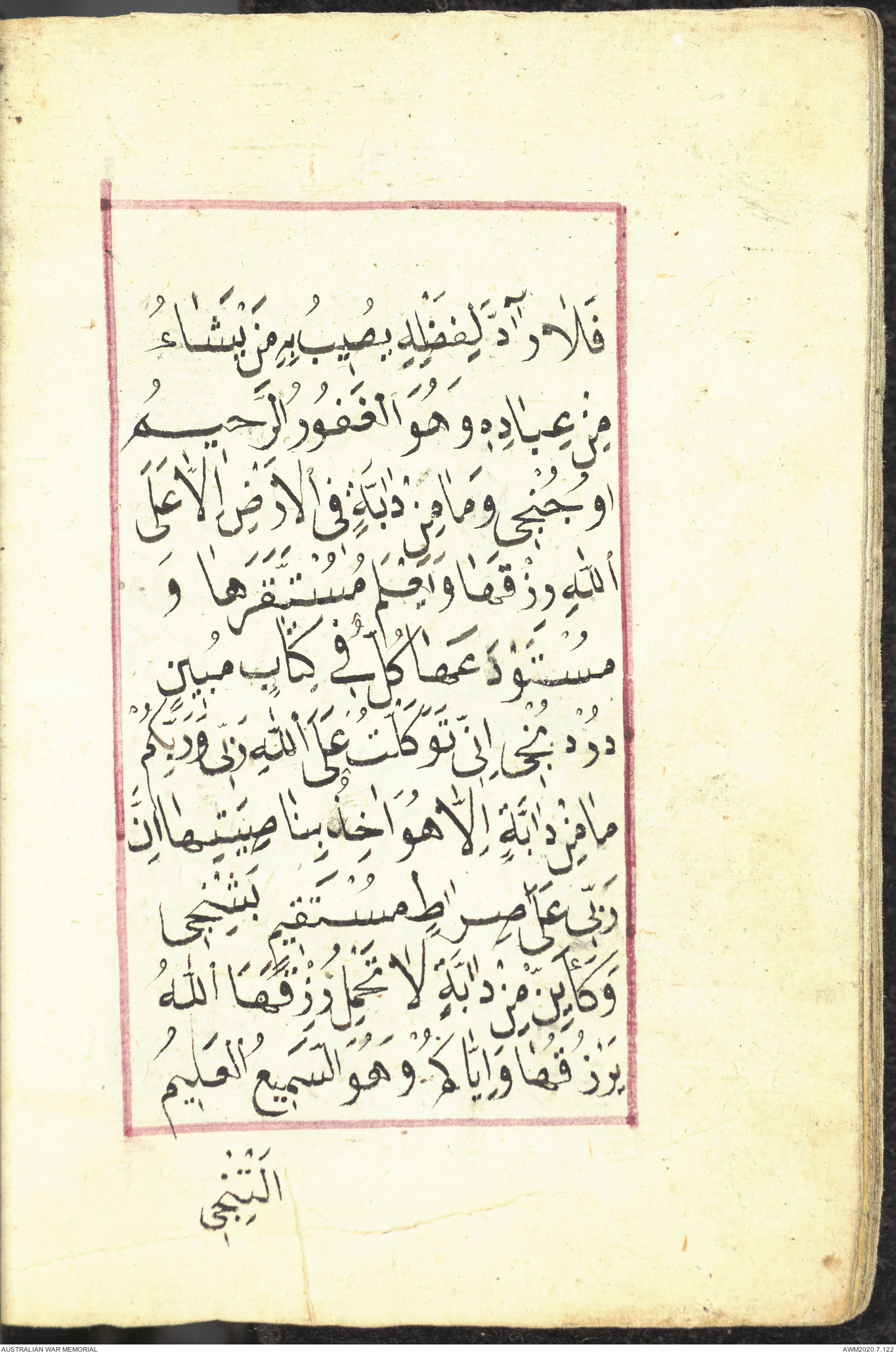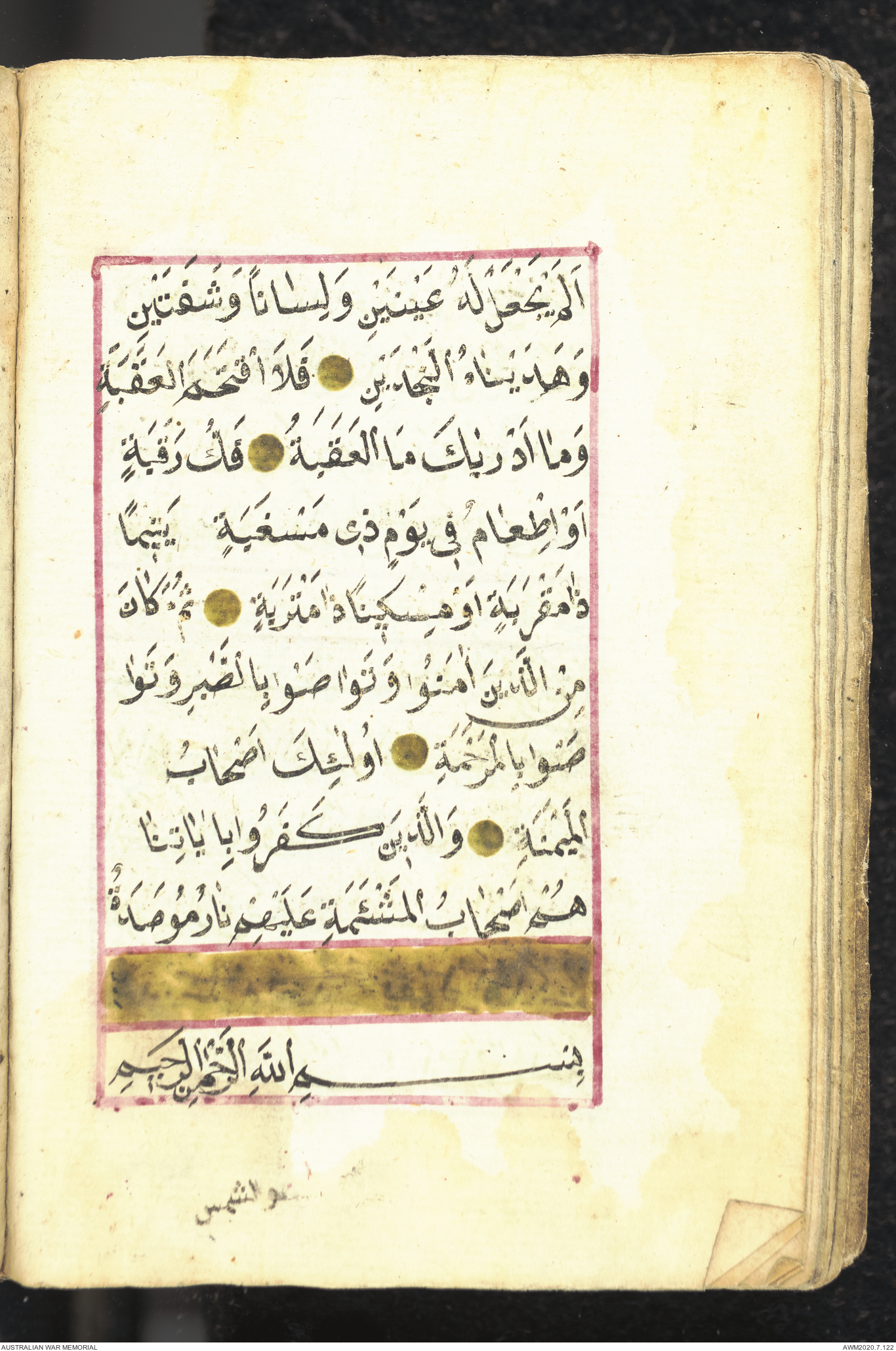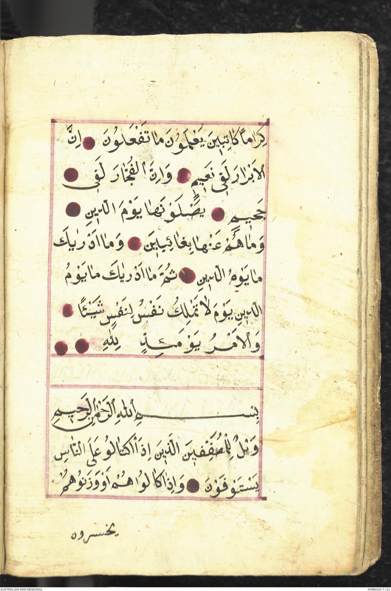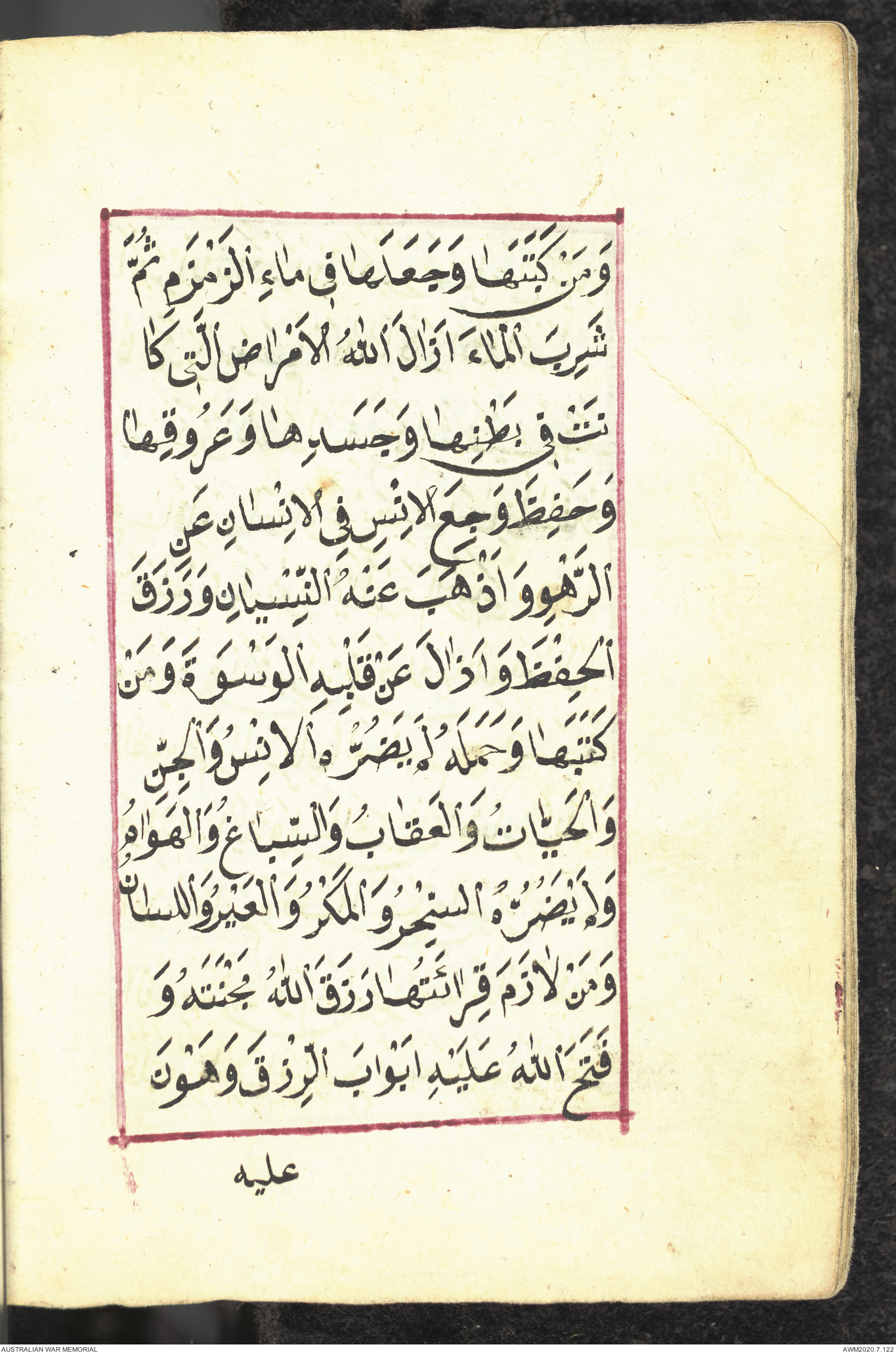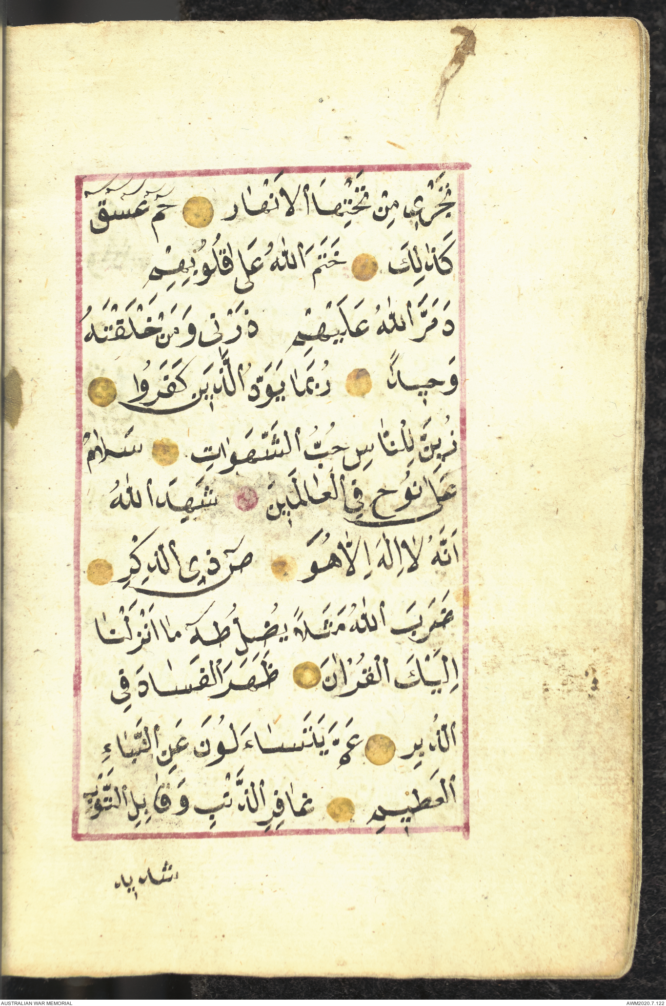 Wallet 1 of 1 - Collection consists of one brown and maroon leather covered Arabic prayer book. The book was collected by Lieutenant Colonel Stanley Holm Watson, who recovered it from the body of a dead Turkish soldier during the 8-hour ceasefire called between Allied and Ottoman Forces on 24 May 1915 in order to recover their dead and wounded from no man's land.