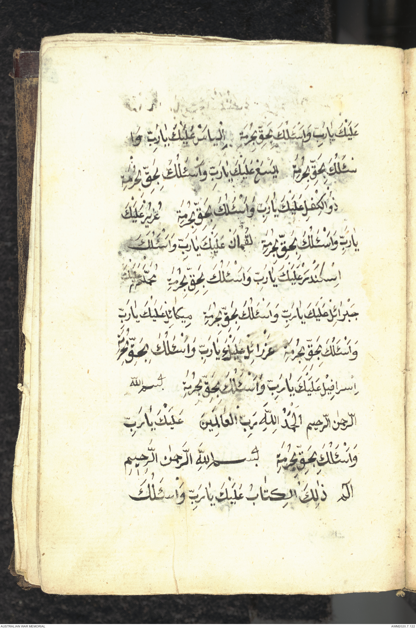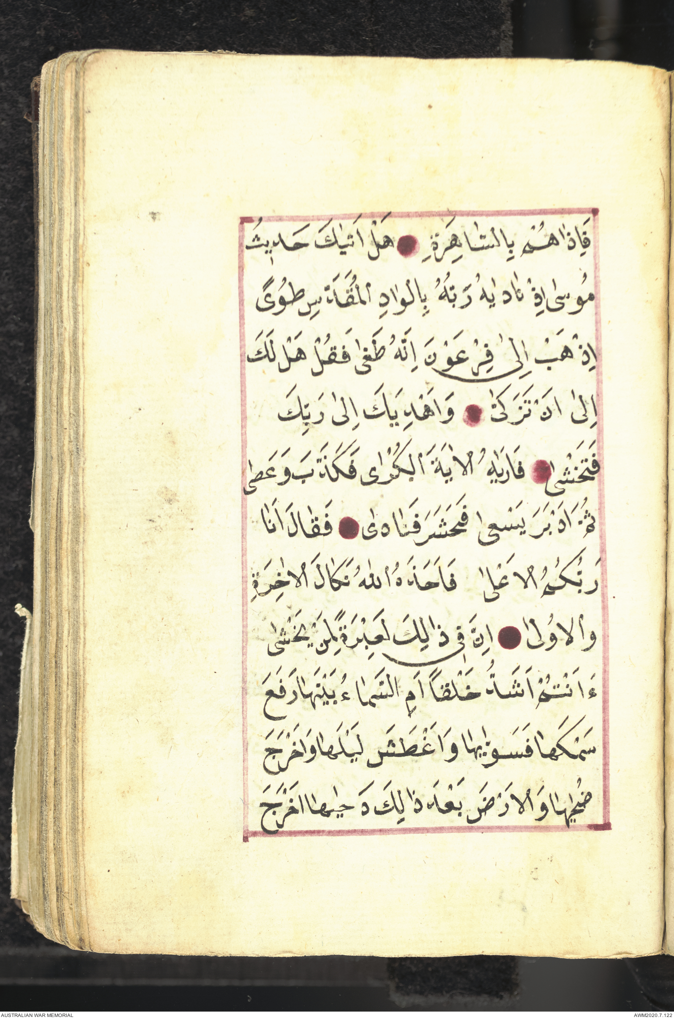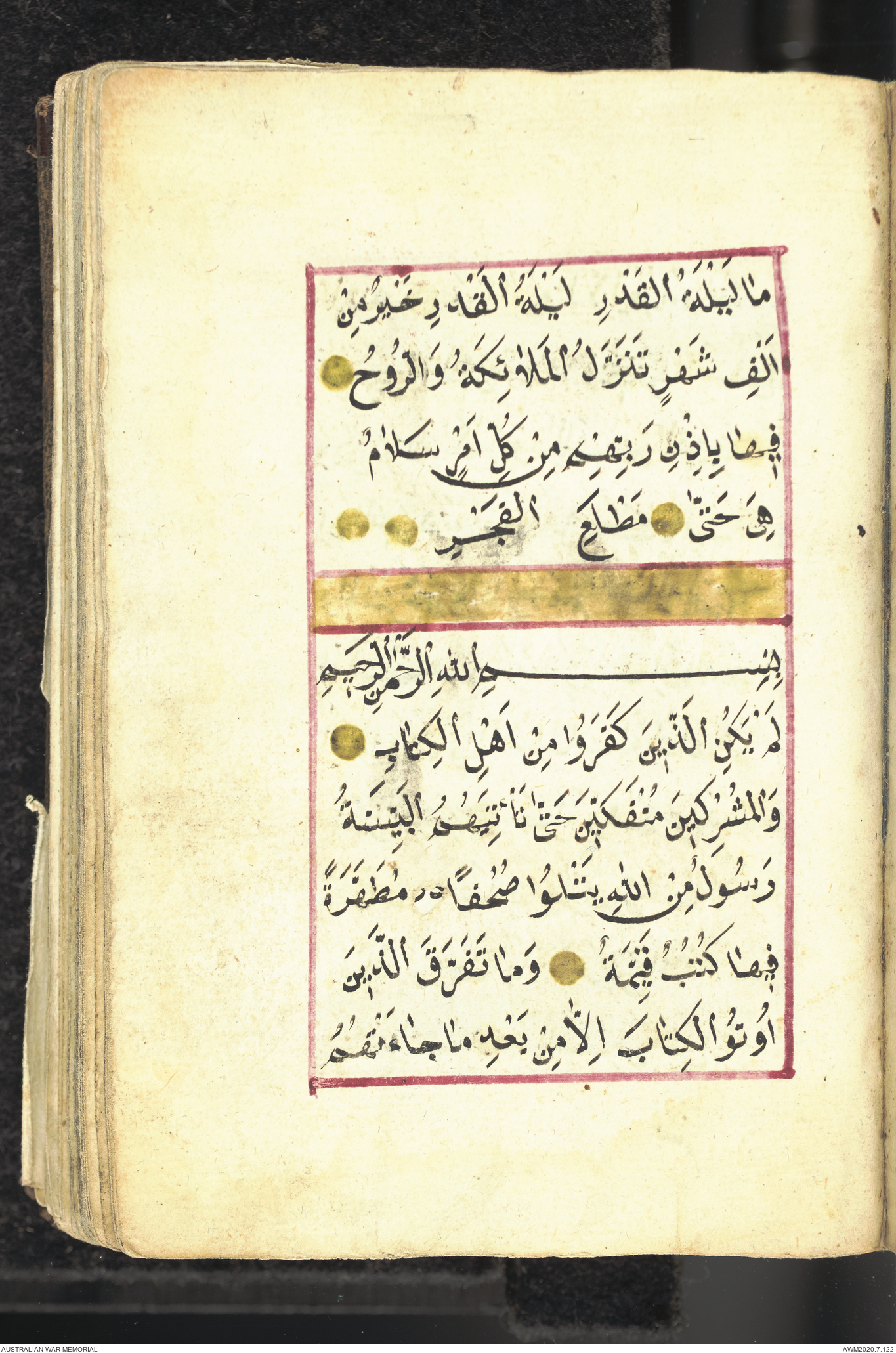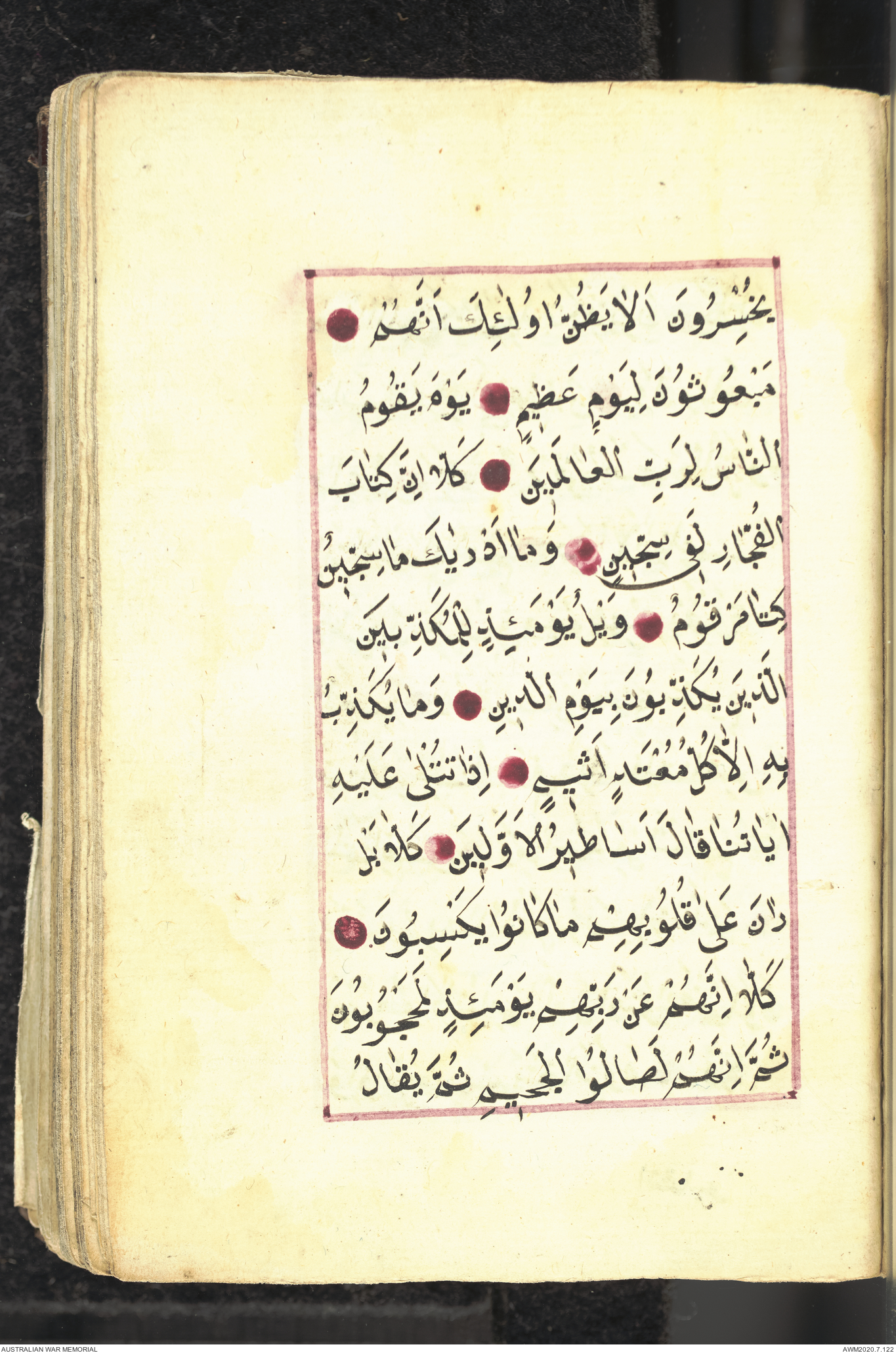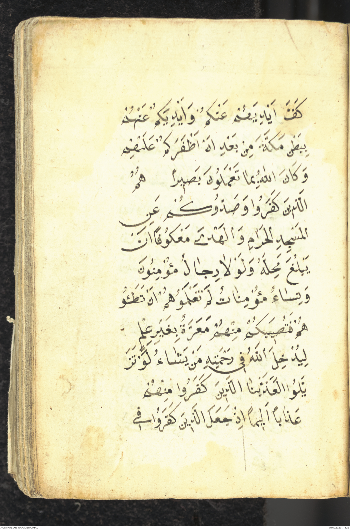 Wallet 1 of 1 - Collection consists of one brown and maroon leather covered Arabic prayer book. The book was collected by Lieutenant Colonel Stanley Holm Watson, who recovered it from the body of a dead Turkish soldier during the 8-hour ceasefire called between Allied and Ottoman Forces on 24 May 1915 in order to recover their dead and wounded from no man's land.