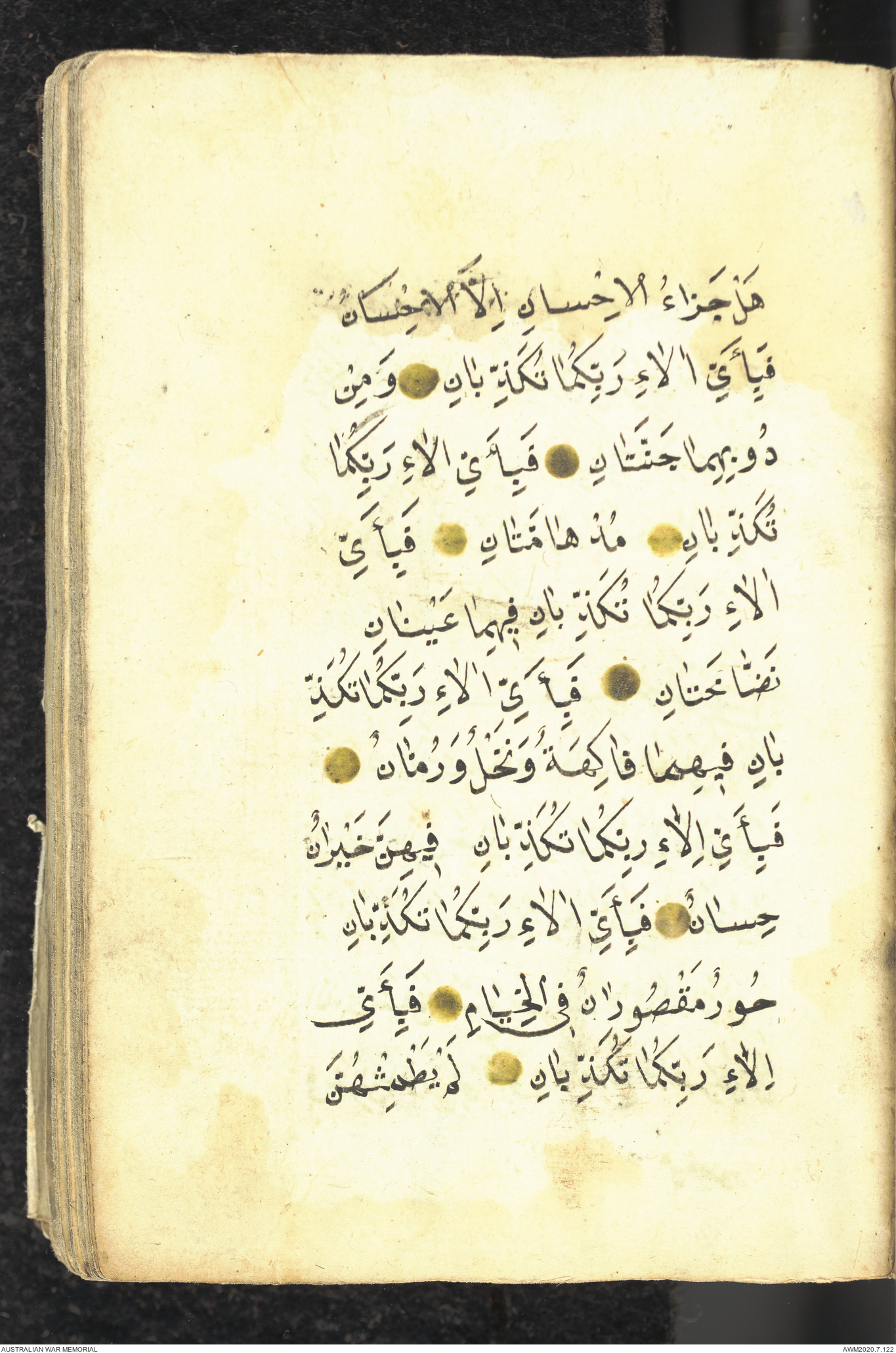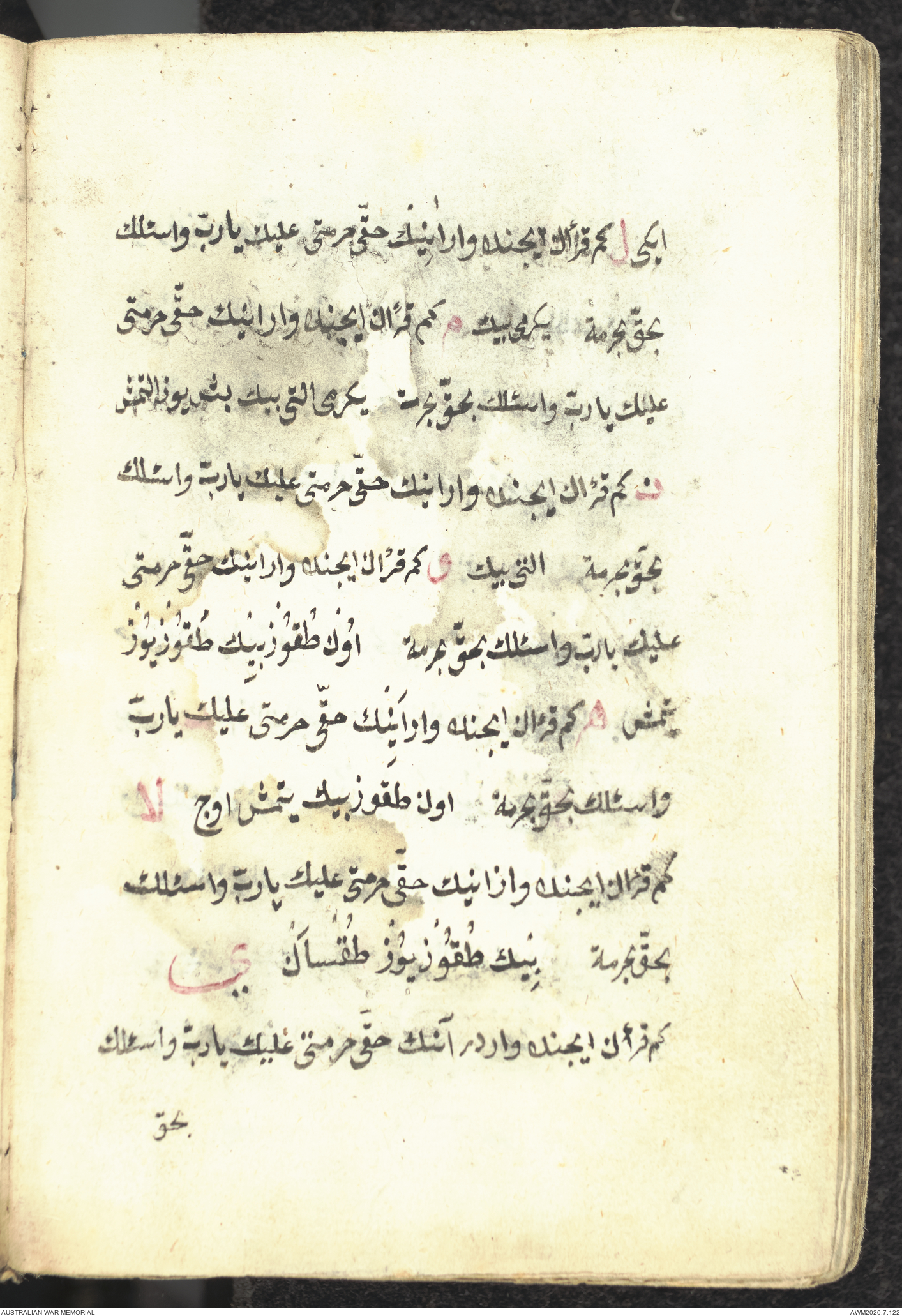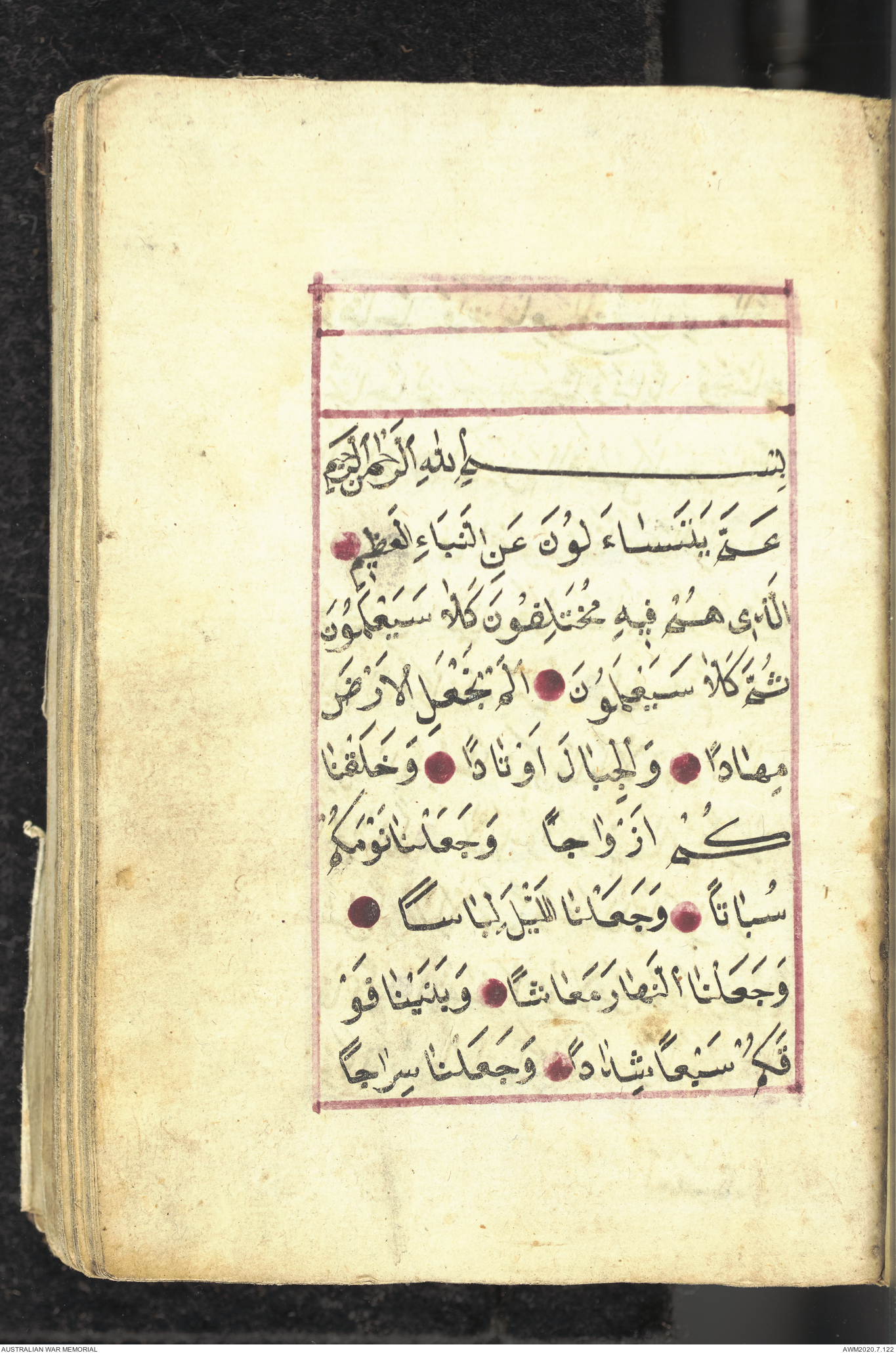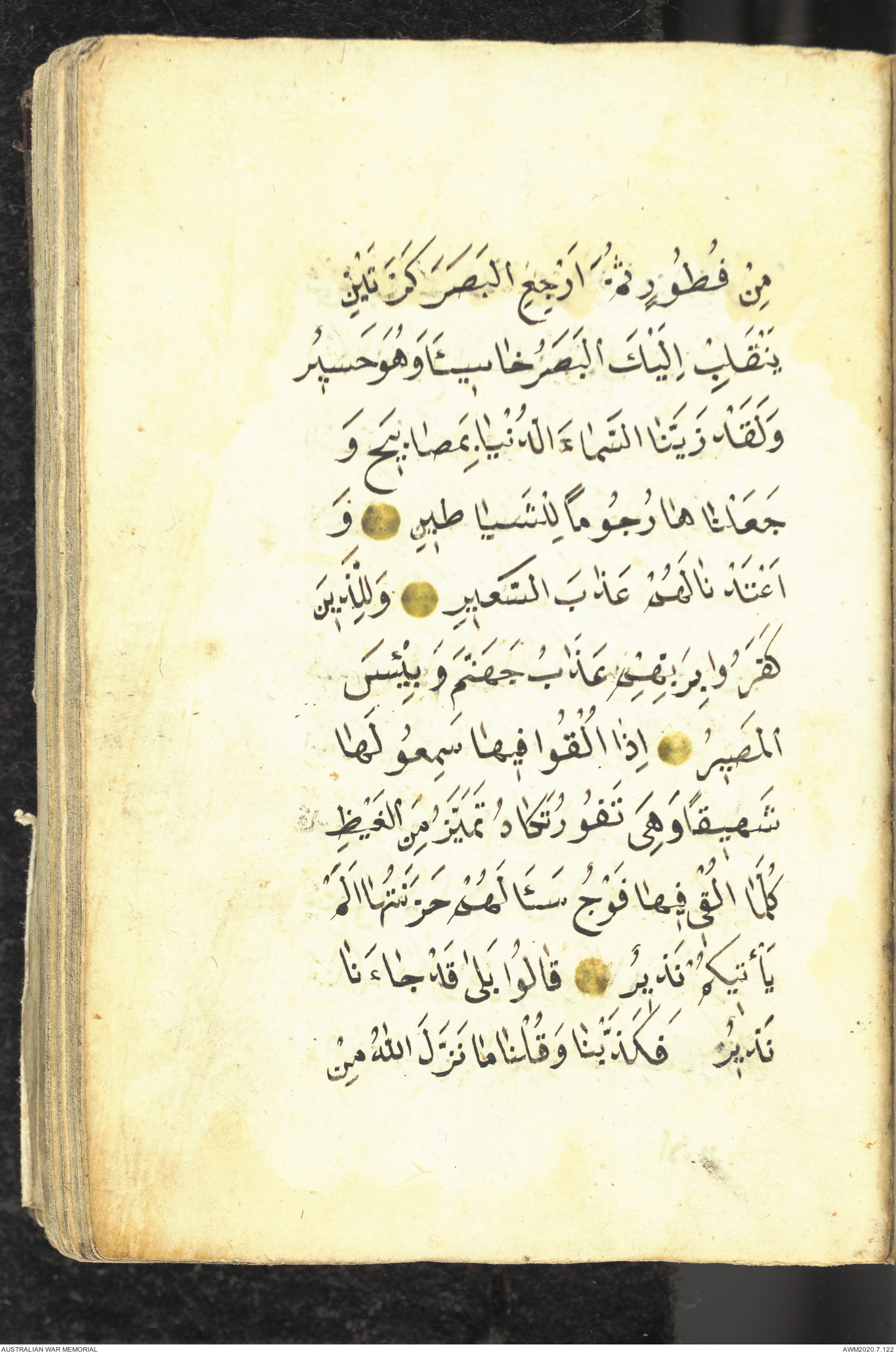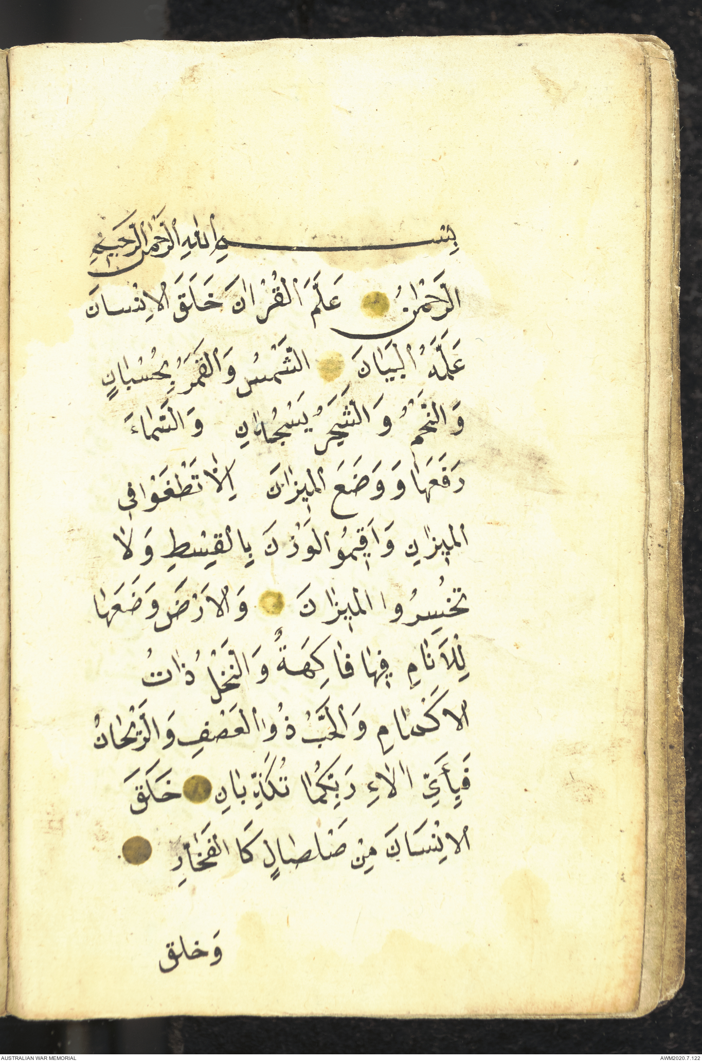 Wallet 1 of 1 - Collection consists of one brown and maroon leather covered Arabic prayer book. The book was collected by Lieutenant Colonel Stanley Holm Watson, who recovered it from the body of a dead Turkish soldier during the 8-hour ceasefire called between Allied and Ottoman Forces on 24 May 1915 in order to recover their dead and wounded from no man's land.