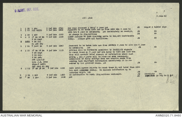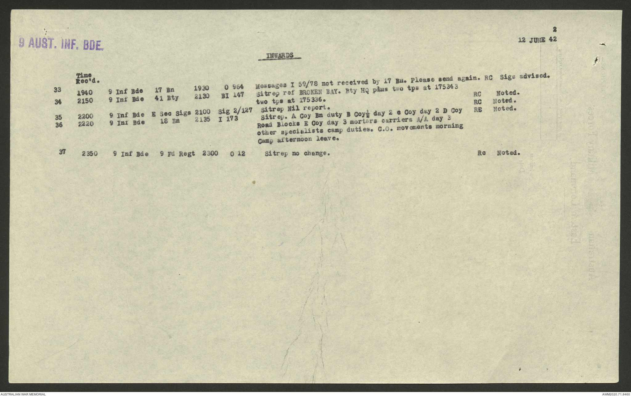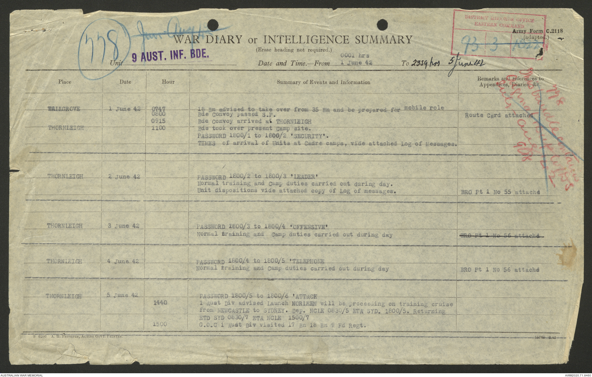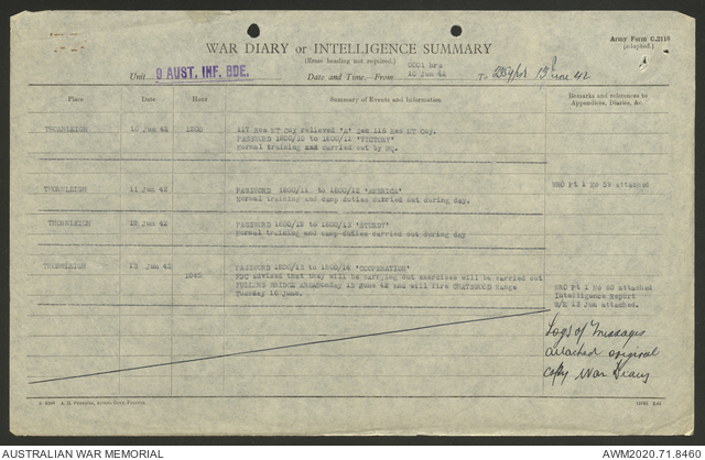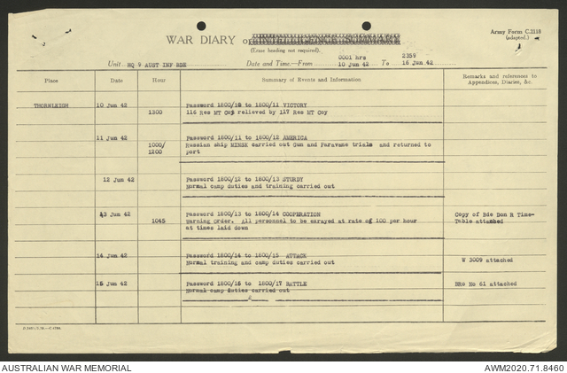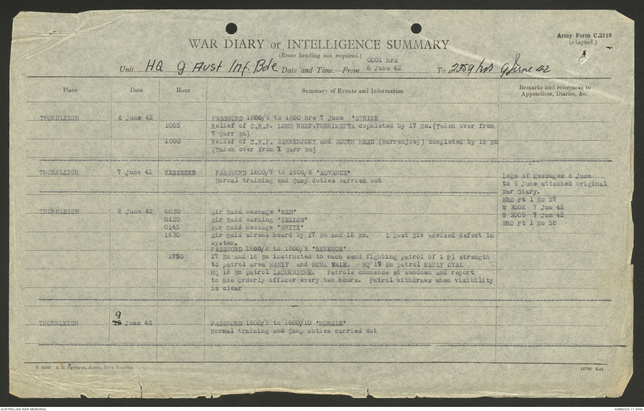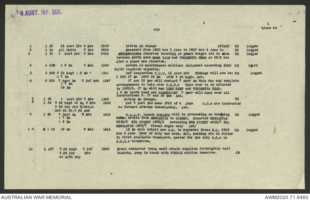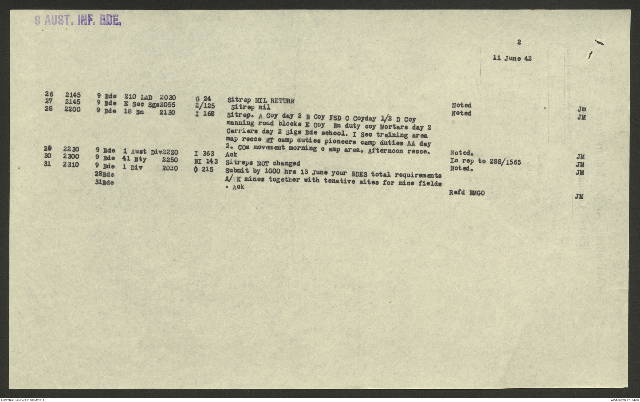 AWM52 8/2/9/6 - [Unit War Diaries, 1939-45 War] HQ 9 Australian Infantry Brigade, June 1942